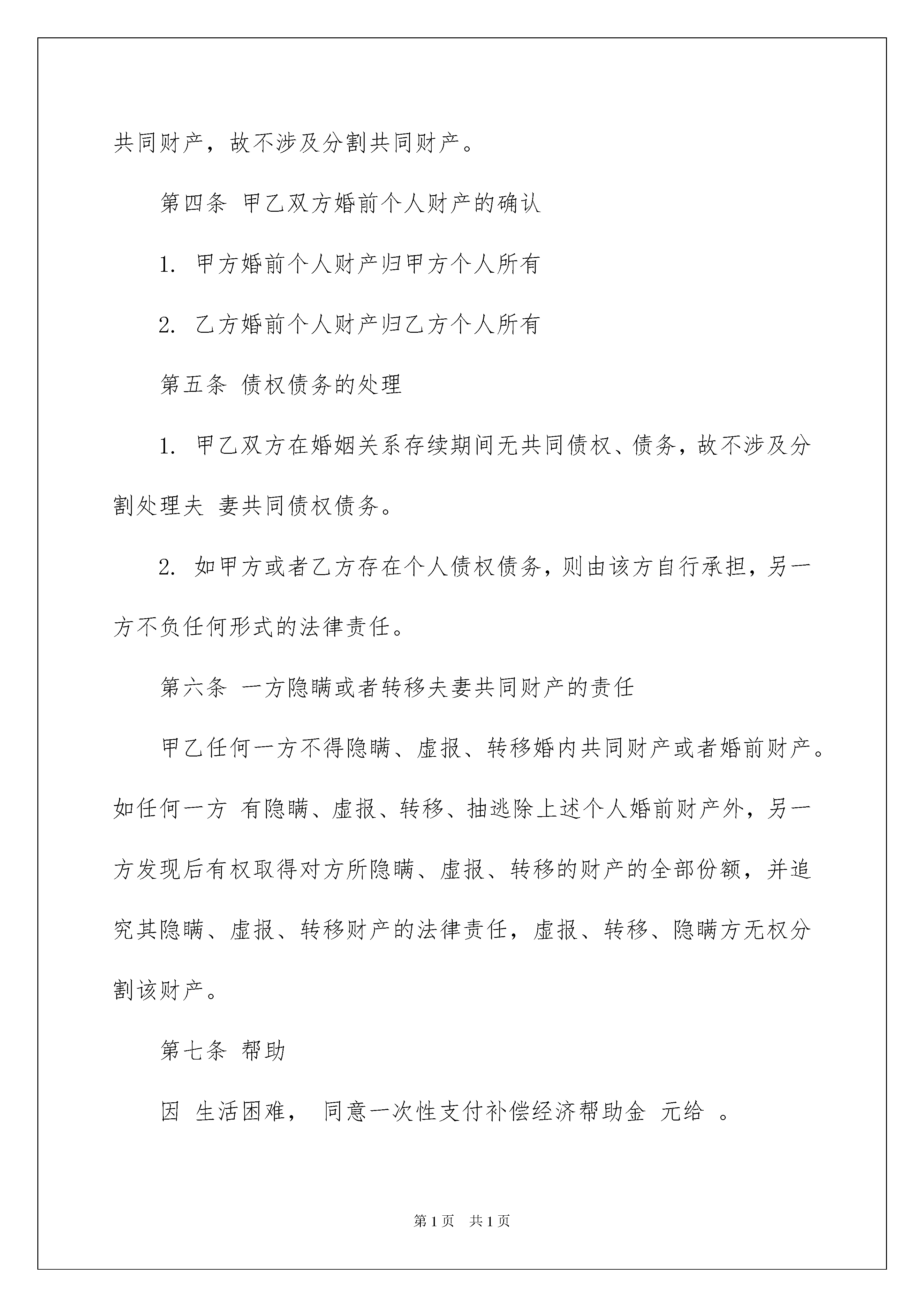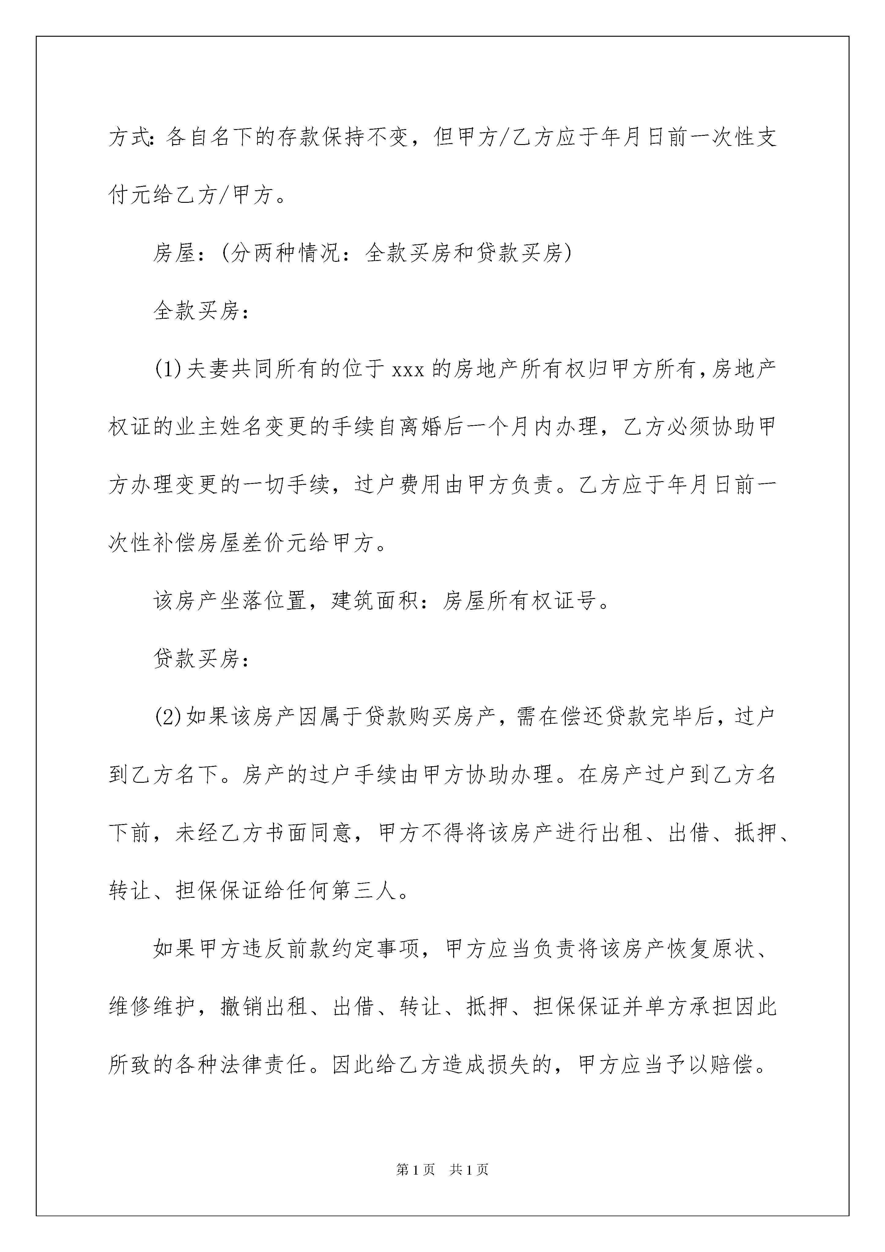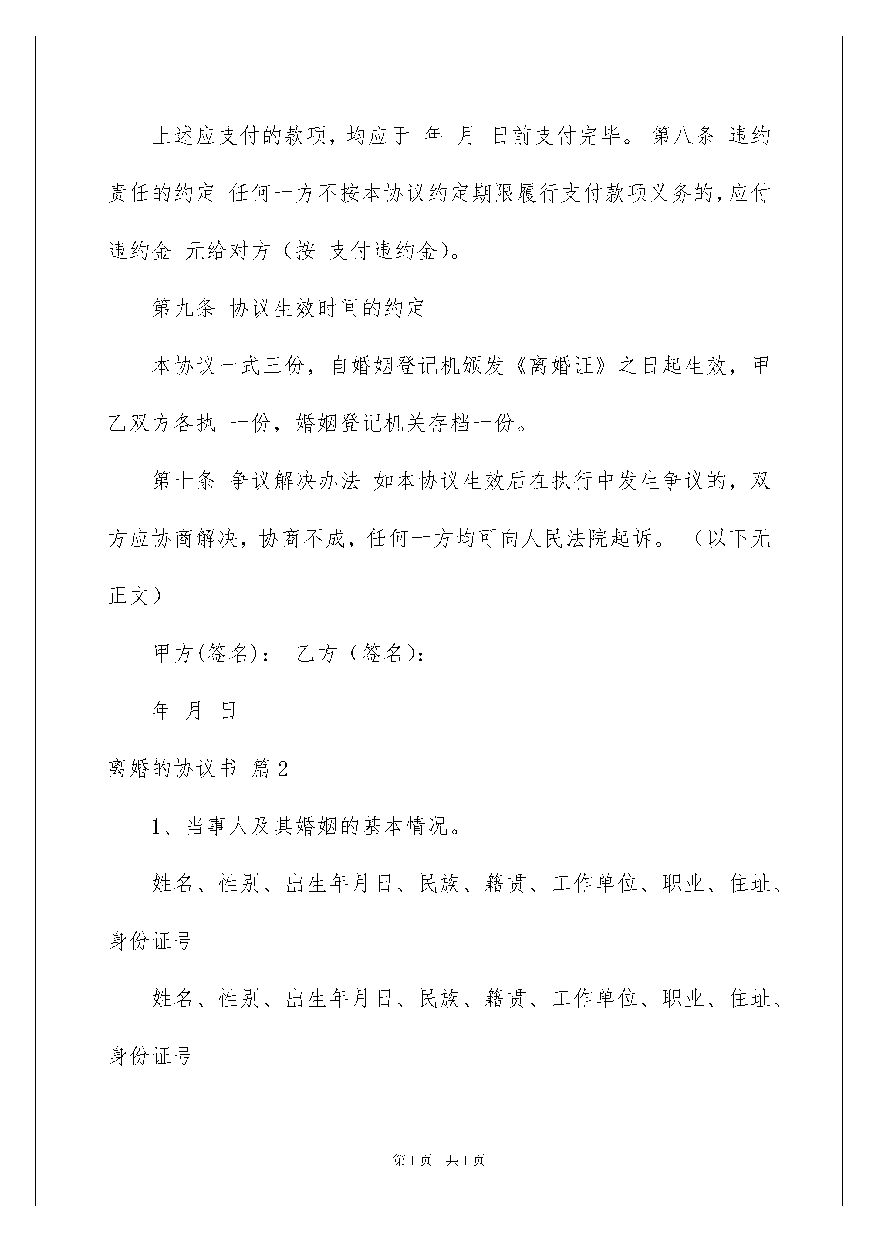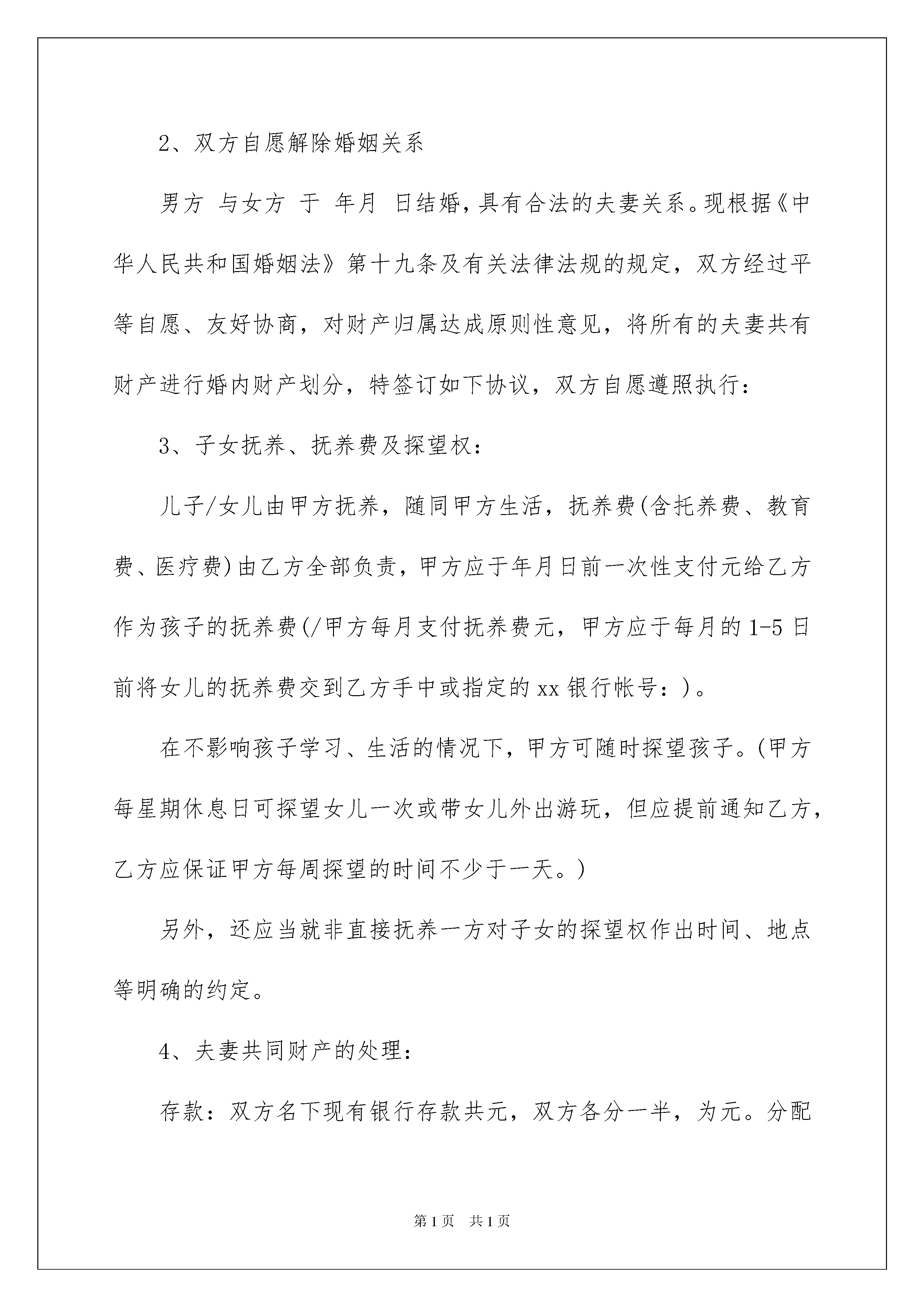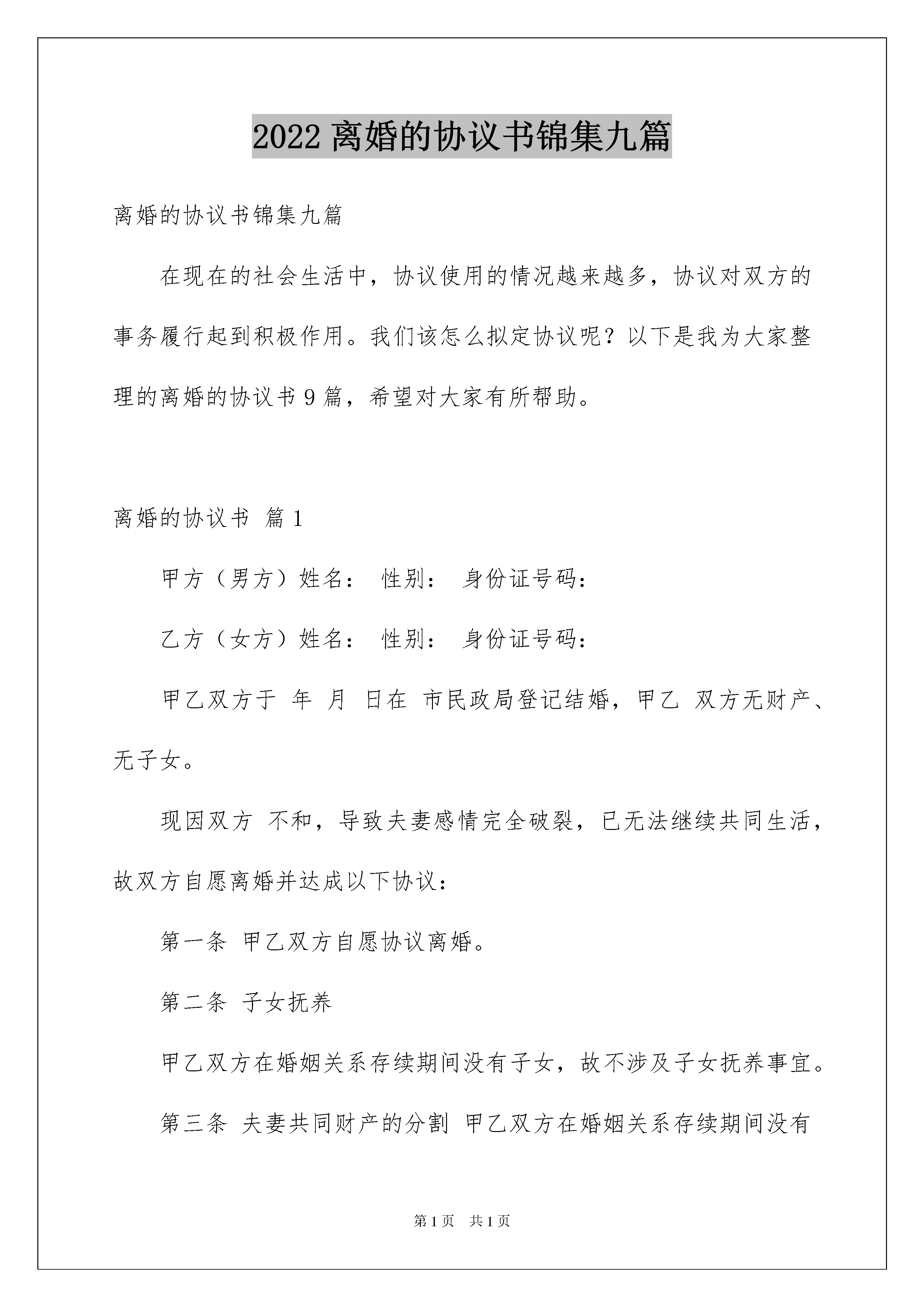 2022离婚的协议书锦集九篇离婚的协议书锦集九篇在现在的社会生活中,协议使用的情况越来越多,协议对双方的事务履行起到积极作用。我们该怎么拟定协议呢?以下是我为大家整理的离婚的协议书9篇,希望对大家有所帮助。离婚的协议书篇1甲方(男方)姓名:性别:身份证号码:乙方(女方)姓名:性别:身份证号码:甲乙双方于年月日在市民政局登记结婚,甲乙双方无财产、无子女。现因双方不和,导致夫妻感情完全破裂,已无法继续共同生活,故双方自愿离婚并达成以下协议:第一条甲乙双方自愿协议离婚。第二条子女抚养甲乙双方在婚姻关系存续期间没有子女,故不涉及子女抚养事宜。第三条夫妻共同财产的分割甲乙双方在婚姻关系存续期间没有共同财产,故不涉及分割共同财产。第四条甲乙双方婚前个人财产的确认1.甲方婚前个人财产归甲方个人所有2.乙方婚前个人财产归乙方个人所有第五条债权债务的处理1.甲乙双方在婚姻关系存续期间无共同债权、债务,故不涉及分割处理夫妻共同债权债务。2.如甲方或者乙方存在个人债权债务,则由该方自行承担,另一方不负任何形式的法律责任。第六条一方隐瞒或者转移夫妻共同财产的责任甲乙任何一方不得隐瞒、虚报、转移婚内共同财产或者婚前财产。如任何一方有隐瞒、虚报、转移、抽逃除上述个人婚前财产外,另一方发现后有权取得对方所隐瞒、虚报、转移的财产的全部份额,并追究其隐瞒、虚报、转移财产的法律责任,虚报、转移、隐瞒方无权分割该财产。第七条帮助因生活困难,同意一次性支付补偿经济帮助金元给。上述应支付的款项,均应于年月日前支付完毕。第八条违约责任的约定任何一方不按本协议约定期限履行支付款项义务的,应付违约金元给对方(按支付违约金)。第九条协议生效时间的约定本协议一式三份,自婚姻登记机颁发《离婚证》之日起生效,甲乙双方各执一份,婚姻登记机关存档一份。第十条争议解决办法如本协议生效后在执行中发生争议的,双方应协商解决,协商不成,任何一方均可向人民法院起诉。(以下无正文)甲方(签名):乙方(签名):年月日离婚的协议书篇21、当事人及其婚姻的基本情况。姓名、性别、出生年月日、民族、籍贯、工作单位、职业、住址、身份证号姓名、性别、出生年月日、民族、籍贯、工作单位、职业、住址、身份证号2、双方自愿解除婚姻关系男方与女方于年月日结婚,具有合法的夫妻关系。现根据《中华人民共和国婚姻法》第十九条及有关法律法规的规定,双方经过平等自愿、友好协商,对财产归属达成原则性意见,将所有的夫妻共有财产进行婚内财产划分,特签订如下协议,双方自愿遵照执行:3、子女抚养、抚养费及探望权:儿子/女儿由甲方抚养,随同甲方生活,抚养费(含托养费、教育费、医疗费)由乙方全部负责,甲方应于年月日前一次性支付元给乙方作为孩子的抚养费(/甲方每月支付抚养费元,甲方应于每月的1-5日前将女儿的抚养费交到乙方手中或指定的xx银行帐号:)。在不影响孩子学习、生活的情况下,甲方可随时探望孩子。(甲方每星期休息日可探望女儿一次或带女儿外出游玩,但应提前通知乙方,乙方应保证甲方每周探望的时间不少于一天。)另外,还应当就非直接抚养一方对子女的探望权作出时间、地点等明确的约定。4、夫妻共同财产的处理:存款:双方名下现有银行存款共元,双方各分一半,为元。分配方式:各自名下的存款保持不变,但甲方/乙方应于年月日前一次性支付元给乙方/甲方。房屋:(分两种情况:全款买房和贷款买房)全款买房:(1)夫妻共同所有的位于xxx的房地产所有权归甲方所有,房地产权证的业主姓名变更的手续自离婚后一个月内办理,乙方必须协助甲方办理变更的一切手续,过户费用由甲方负责。乙方应于年月日前一次性补偿房屋差价元给甲方。该房产坐落位置,建筑面积:房屋所有权证号。贷款买房:(2)如果该房产因属于贷款购买房产,需在偿还贷款完毕后,过户到乙方名下。房产的过户手续由甲方协助办理。在房产过户到乙方名下前,未经乙方书面同意,甲方不得将该房产进行出租、出借、抵押、转让、担保保证给任何第三人。如果甲方违反前款约定事项,甲方应当负责将该房产恢复原状、维修维护,撤销出租、出借、转让、抵押、担保保证并单方承担因此所致的各种法律责任。因此给乙方造成损失的,甲方应当予以赔偿。其他财产:婚前双方各自的财产归各自所有,男女双方各自的私人生活用品及首饰归各自所有(附清单)。(物业、电器、家具、通讯设备、交通工具、现金存款、有价证券、股权等共同财产的分割)5、一方隐瞒或转移夫妻共同财产的责任:双方确认夫妻共同财产在上述第三条已作出明确列明。除上述房屋、家具、家电及银行存款外,并无其他财产,任何一方应保证以上所列婚内全部共同财产的真实性。本协议书财产分割基于上