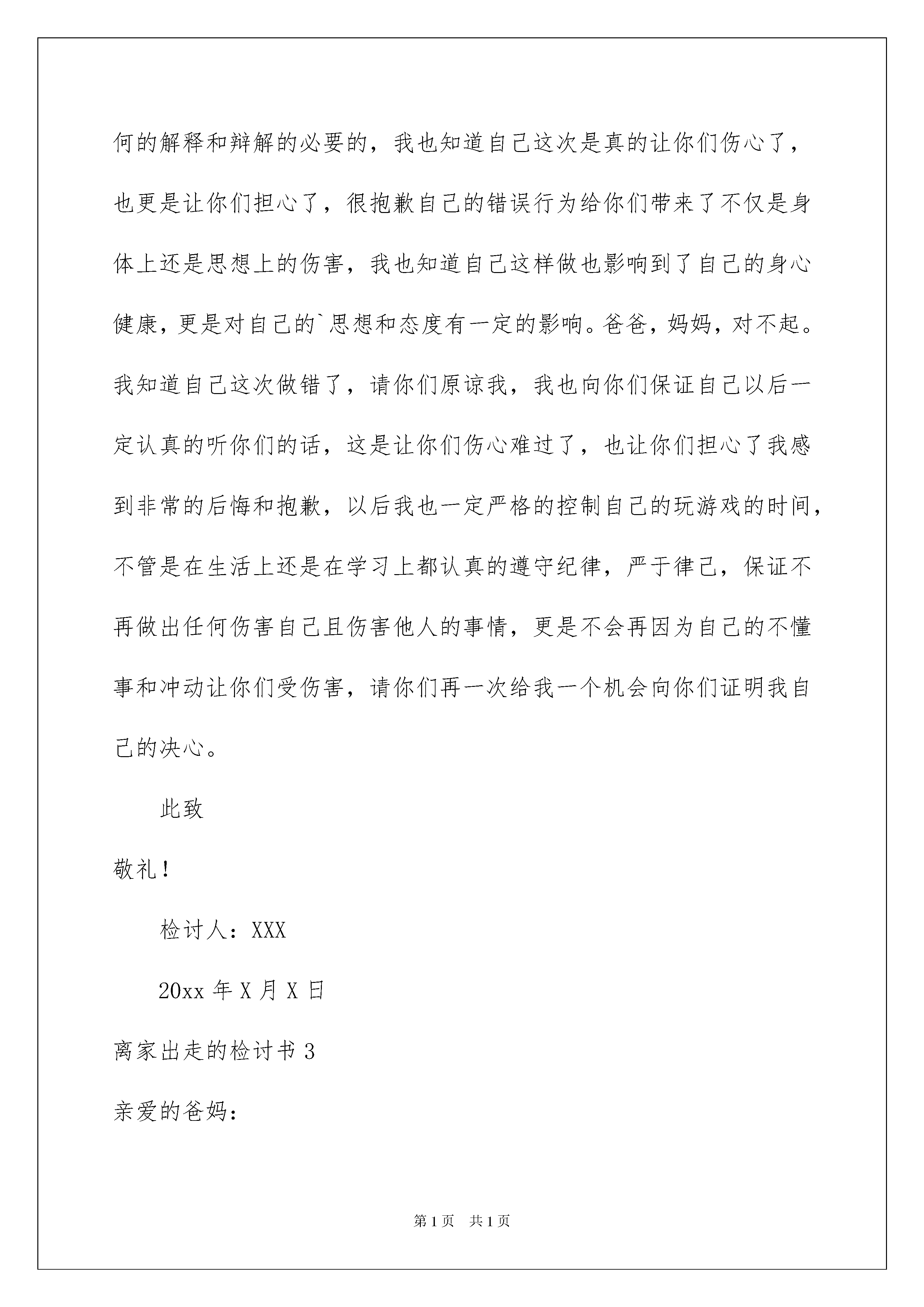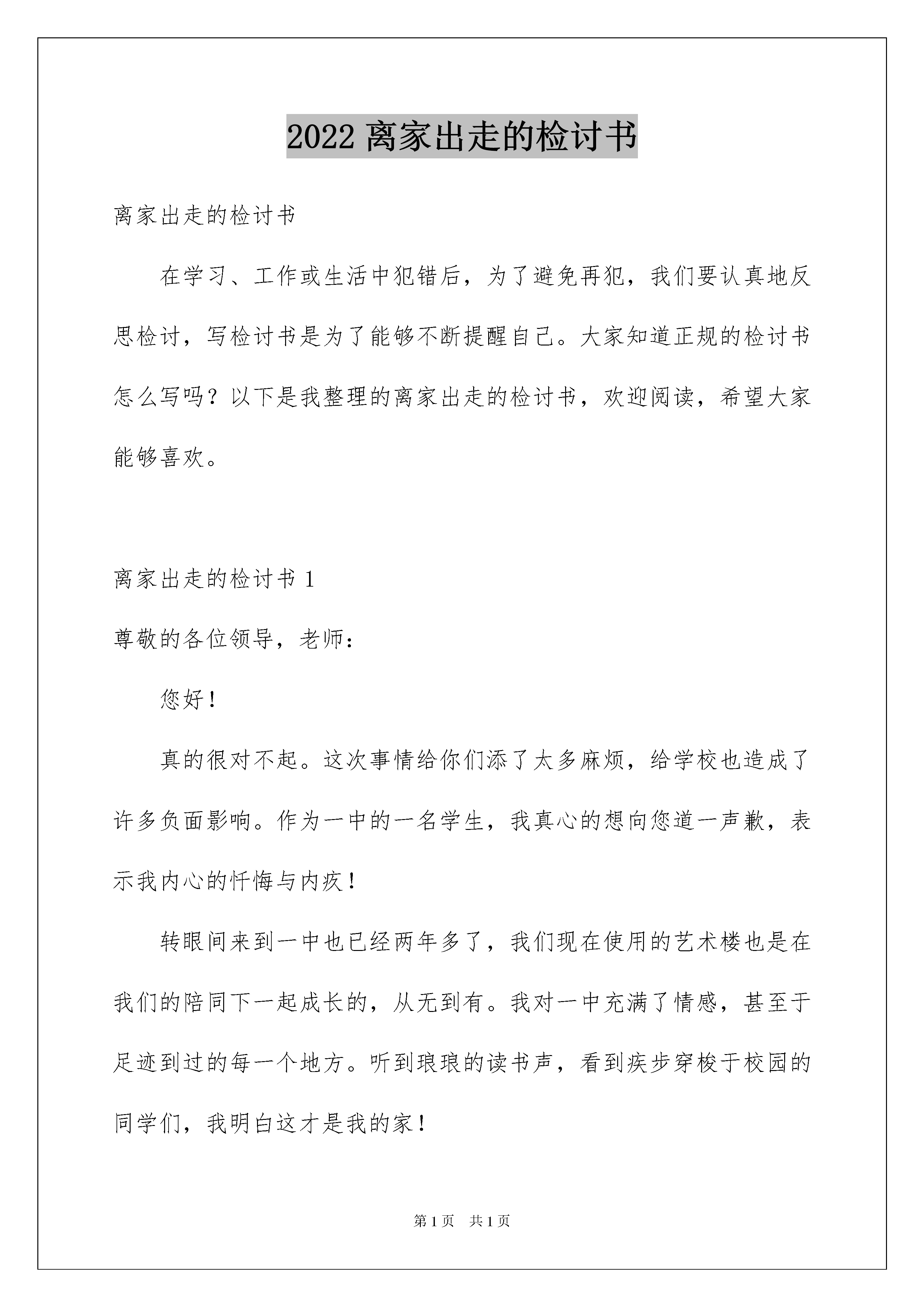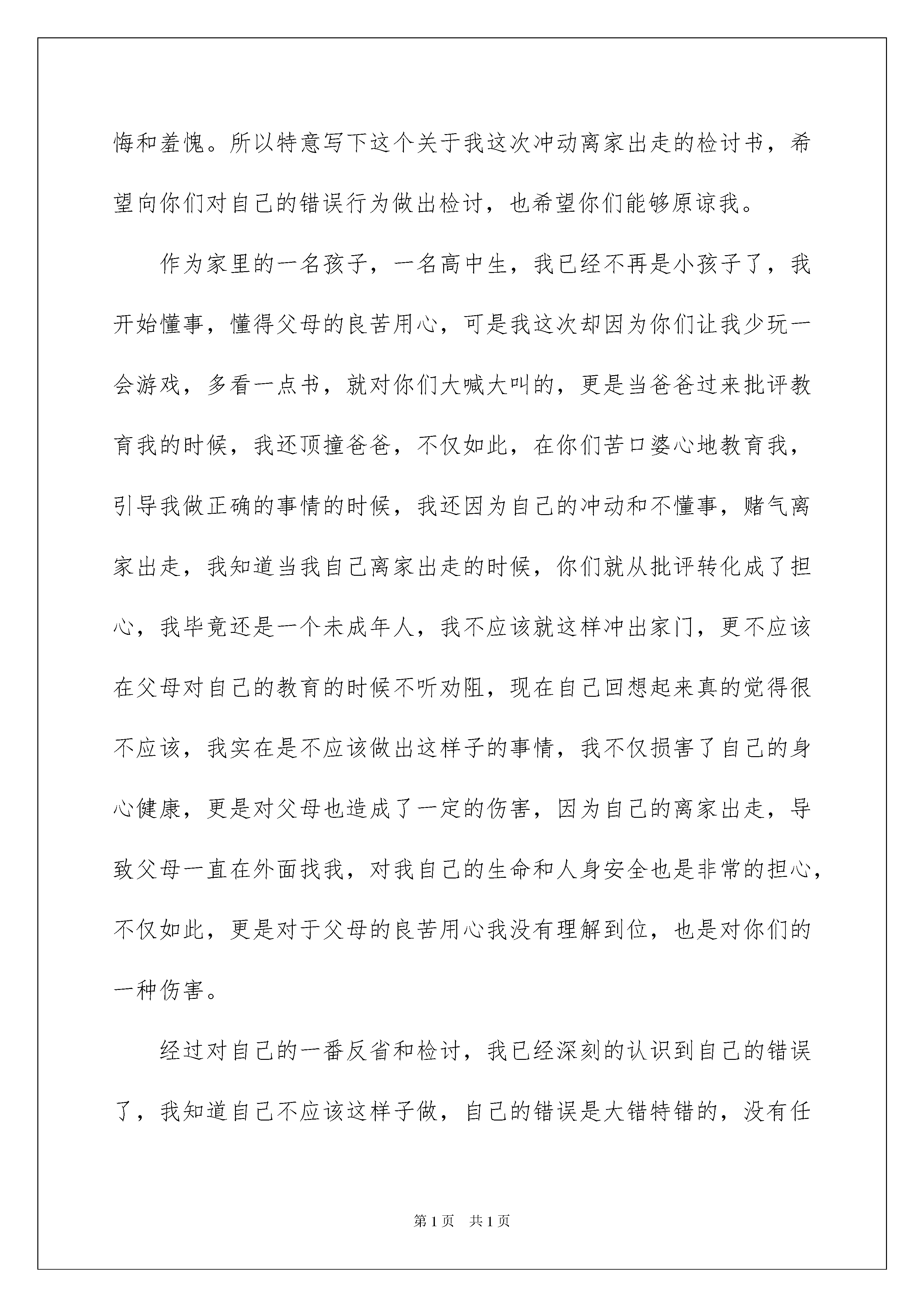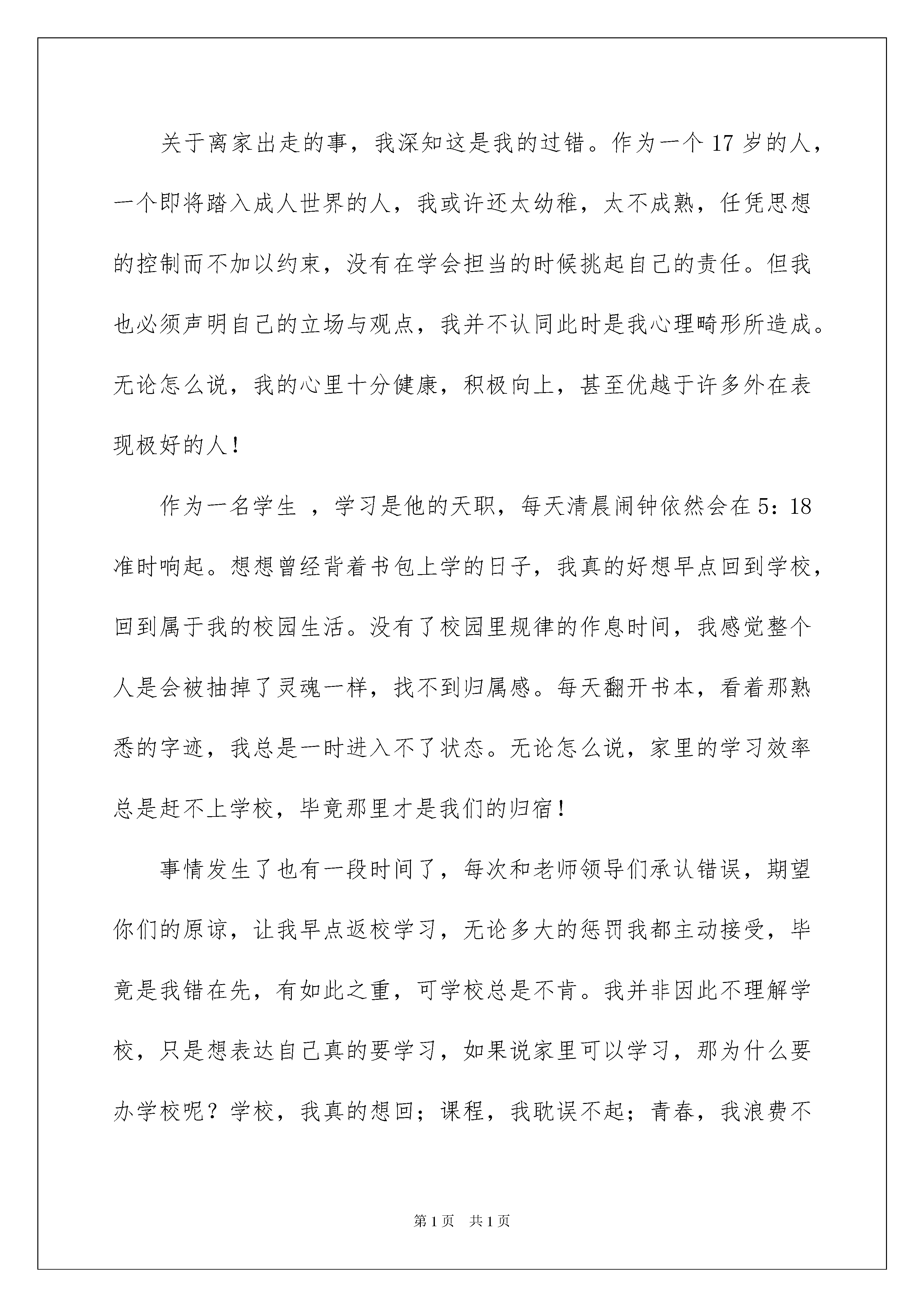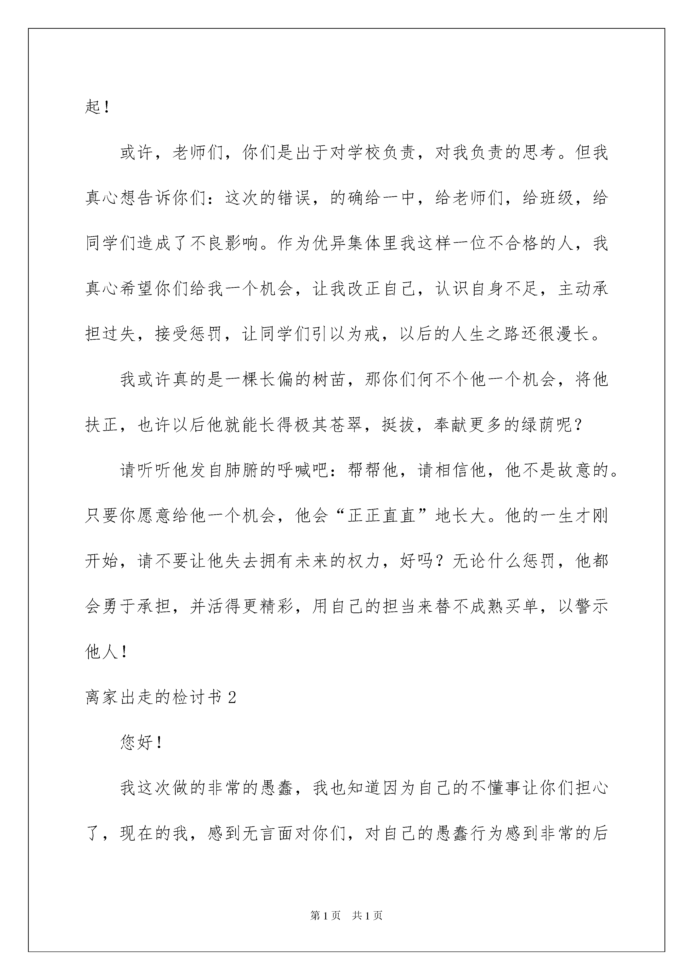 2022离家出走的检讨书离家出走的检讨书在学习、工作或生活中犯错后,为了避免再犯,我们要认真地反思检讨,写检讨书是为了能够不断提醒自己。大家知道正规的检讨书怎么写吗?以下是我整理的离家出走的检讨书,欢迎阅读,希望大家能够喜欢。离家出走的检讨书1尊敬的各位领导,老师:您好!真的很对不起。这次事情给你们添了太多麻烦,给学校也造成了许多负面影响。作为一中的一名学生,我真心的想向您道一声歉,表示我内心的忏悔与内疚!转眼间来到一中也已经两年多了,我们现在使用的艺术楼也是在我们的陪同下一起成长的,从无到有。我对一中充满了情感,甚至于足迹到过的每一个地方。听到琅琅的读书声,看到疾步穿梭于校园的同学们,我明白这才是我的家!关于离家出走的事,我深知这是我的过错。作为一个17岁的人,一个即将踏入成人世界的人,我或许还太幼稚,太不成熟,任凭思想的控制而不加以约束,没有在学会担当的时候挑起自己的责任。但我也必须声明自己的立场与观点,我并不认同此时是我心理畸形所造成。无论怎么说,我的心里十分健康,积极向上,甚至优越于许多外在表现极好的人!作为一名学生,学习是他的天职,每天清晨闹钟依然会在5:18准时响起。想想曾经背着书包上学的日子,我真的好想早点回到学校,回到属于我的校园生活。没有了校园里规律的作息时间,我感觉整个人是会被抽掉了灵魂一样,找不到归属感。每天翻开书本,看着那熟悉的字迹,我总是一时进入不了状态。无论怎么说,家里的学习效率总是赶不上学校,毕竟那里才是我们的归宿!事情发生了也有一段时间了,每次和老师领导们承认错误,期望你们的原谅,让我早点返校学习,无论多大的惩罚我都主动接受,毕竟是我错在先,有如此之重,可学校总是不肯。我并非因此不理解学校,只是想表达自己真的要学习,如果说家里可以学习,那为什么要办学校呢?学校,我真的想回;课程,我耽误不起;青春,我浪费不起!或许,老师们,你们是出于对学校负责,对我负责的思考。但我真心想告诉你们:这次的错误,的确给一中,给老师们,给班级,给同学们造成了不良影响。作为优异集体里我这样一位不合格的人,我真心希望你们给我一个机会,让我改正自己,认识自身不足,主动承担过失,接受惩罚,让同学们引以为戒,以后的人生之路还很漫长。我或许真的是一棵长偏的树苗,那你们何不个他一个机会,将他扶正,也许以后他就能长得极其苍翠,挺拔,奉献更多的绿荫呢?请听听他发自肺腑的呼喊吧:帮帮他,请相信他,他不是故意的。只要你愿意给他一个机会,他会“正正直直”地长大。他的一生才刚开始,请不要让他失去拥有未来的权力,好吗?无论什么惩罚,他都会勇于承担,并活得更精彩,用自己的担当来替不成熟买单,以警示他人!离家出走的检讨书2您好!我这次做的非常的愚蠢,我也知道因为自己的不懂事让你们担心了,现在的我,感到无言面对你们,对自己的愚蠢行为感到非常的后悔和羞愧。所以特意写下这个关于我这次冲动离家出走的检讨书,希望向你们对自己的错误行为做出检讨,也希望你们能够原谅我。作为家里的一名孩子,一名高中生,我已经不再是小孩子了,我开始懂事,懂得父母的良苦用心,可是我这次却因为你们让我少玩一会游戏,多看一点书,就对你们大喊大叫的,更是当爸爸过来批评教育我的时候,我还顶撞爸爸,不仅如此,在你们苦口婆心地教育我,引导我做正确的事情的时候,我还因为自己的冲动和不懂事,赌气离家出走,我知道当我自己离家出走的时候,你们就从批评转化成了担心,我毕竟还是一个未成年人,我不应该就这样冲出家门,更不应该在父母对自己的教育的时候不听劝阻,现在自己回想起来真的觉得很不应该,我实在是不应该做出这样子的事情,我不仅损害了自己的身心健康,更是对父母也造成了一定的伤害,因为自己的离家出走,导致父母一直在外面找我,对我自己的生命和人身安全也是非常的担心,不仅如此,更是对于父母的良苦用心我没有理解到位,也是对你们的一种伤害。经过对自己的一番反省和检讨,我已经深刻的认识到自己的错误了,我知道自己不应该这样子做,自己的错误是大错特错的,没有任何的解释和辩解的必要的,我也知道自己这次是真的让你们伤心了,也更是让你们担心了,很抱歉自己的错误行为给你们带来了不仅是身体上还是思想上的伤害,我也知道自己这样做也影响到了自己的身心健康,更是对自己的`思想和态度有一定的影响。爸爸,妈妈,对不起。我知道自己这次做错了,请你们原谅我,我也向你们保证自己以后一定认真的听你们的话,这是让你们伤心难过了,也让你们担心了我感到非常的后悔和抱歉,以后我也一定严格的控制自己的玩游戏的时间,不管是在生活上还是在学习上都认真的遵守纪律,严于律己,保证不再做出任何伤害自己且伤害他人的事情,