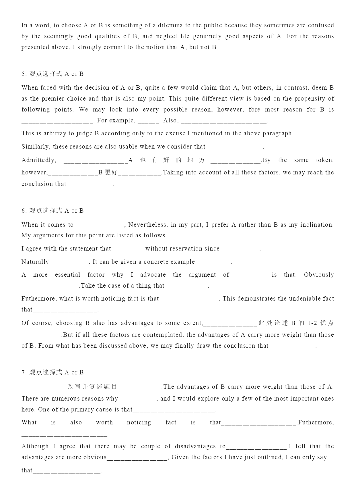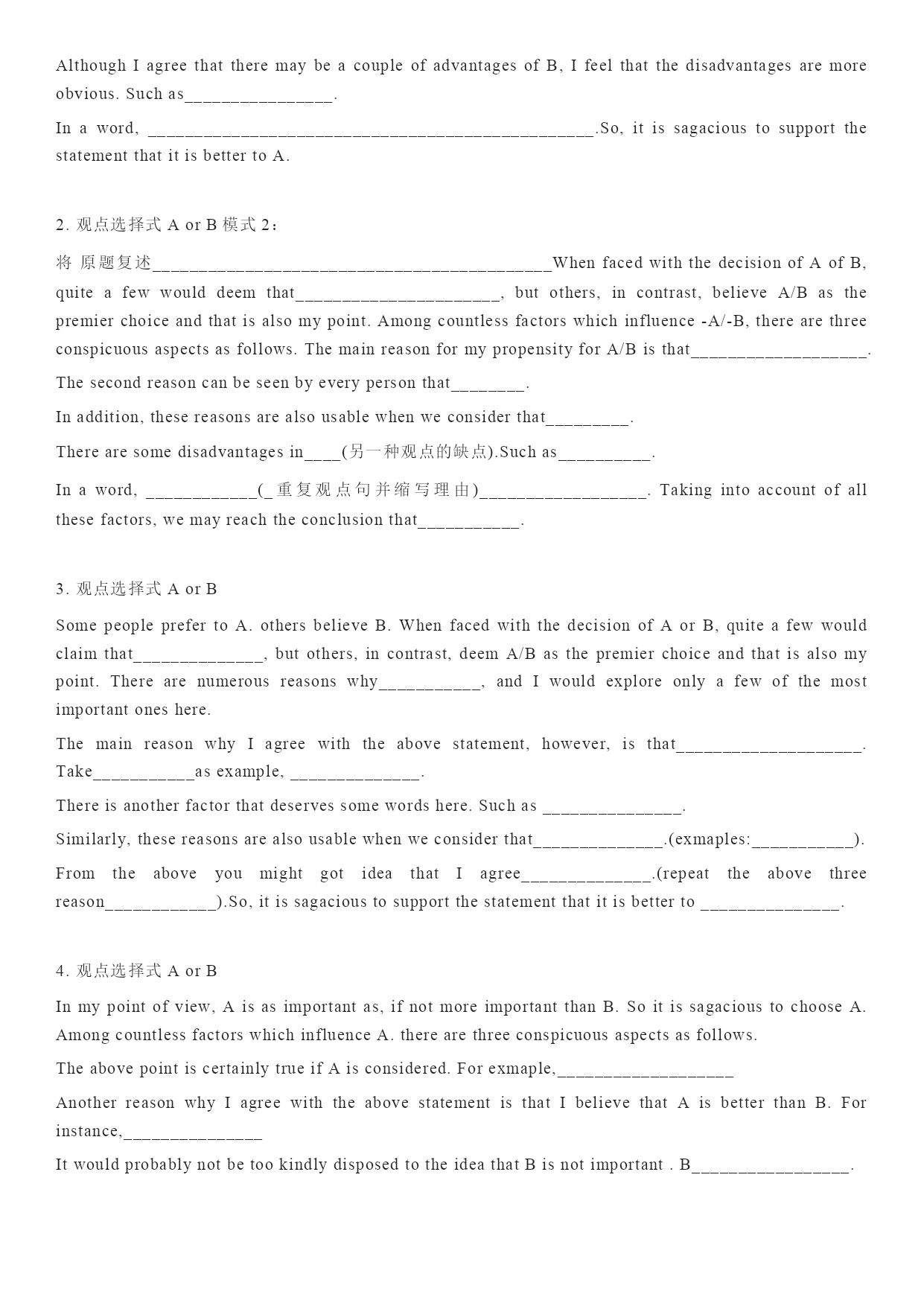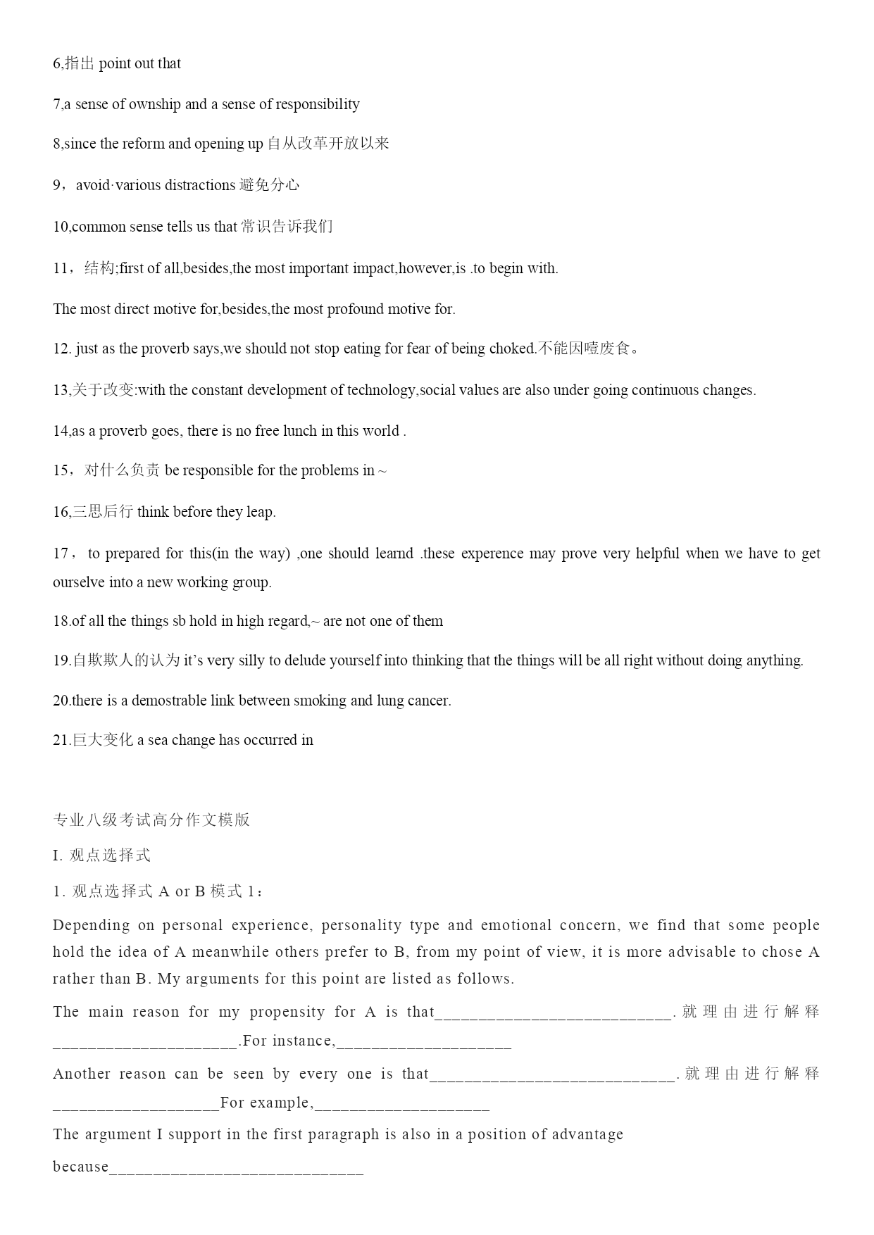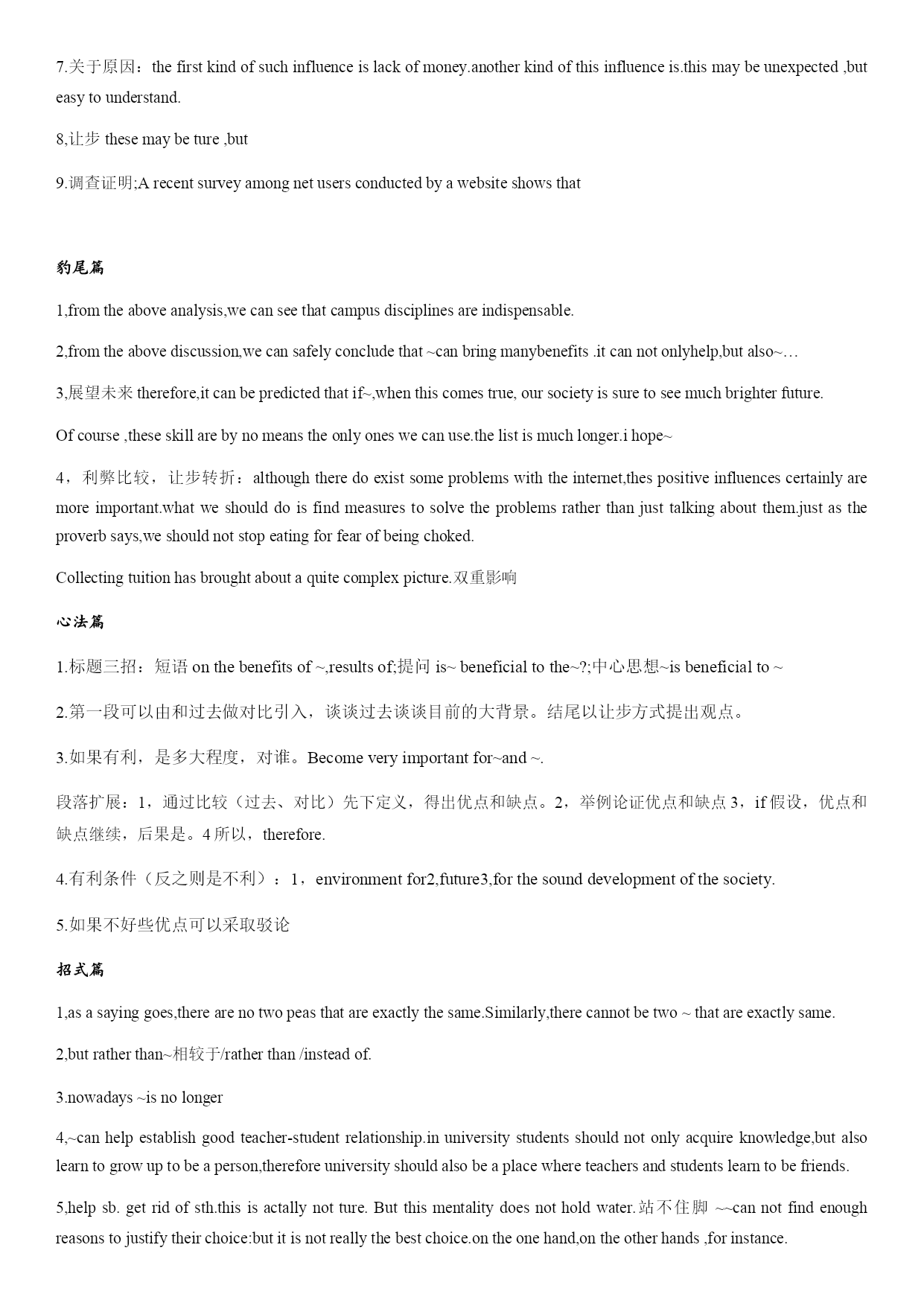 凤头篇 一是否同意某观点 1.Thoughmanystudentsareagainstthem,Ibelievethesedisciplinesarenecessaryandhelpful. Inthepast,~usedtoberegardedasaplaceof~butnow. 承认问题:thisisundeniablytrue,althoughmanystudentsdonotstronglyobjecttois,Idon’tthinkitisadvisablefor~ 疑问的方式:先陈述,butdoyouthink~,thissseemsatrickyquestion. 2.热点问题:recentlytheinflenceofinternethasattactedmuuchpublicattention.(从长远看)butifwetakeabroaderperspective,wemayfindthattheinternethashadmanypositiveimpactsonthemodernsociety. As~hascometobeviewedasoneofthebasesforanation’spower,ithasattractedmoreandmoreattentioninthenewcentury.inmyopinion,therearemainlythreemajorresultsworthdiscussing. Hassky-rocketed.暴涨,temporary 3.直接用鲜活的例子开场。Everysummerhundredsofthousandsofyoungstudentsattendthecollegeentranceexamination,fightinghardtobeamongtheluckyonestoenteruniversities.buthavethislargecrowdaskedthemselvessuchaquestion:whydoyouwanttogotouniversity?itwillbedangerousifsomanypeopletrysohardtodosomethingwithoutclearpurpose.forme,goingtouniversitycanfulfilthreeimportantpurposes. 4.作比较:readingnovelsusedtobeamajorentertainmentforpeopleinth19thcenturyandbefor.butsincetheinventionoffilmattheendofthe19thcentry,peoplehavegraduallyabandonednovelsformoviestoenjoynewstories.nowadaysnovelreadersareonadecline.however,ifIweretomakeachoicebetweenreadinganovelandseeingamovieforastoryIhaveneverheardof,Iwouldstillprefertheformer. 猪肚篇 1,first,these~arenecessarytoestablishaproperenvironmentfor~and~. Thesceondfunctionof~is,thefirstbenefitfrom~is. 2,没注意notawarethat 3,举例:1,itcanbeseenfromthisexamplethatif~donotcultivate2,Ilearndfromafriendthatb 4.讲道理:thosewhoareagainst~onthebasisof(personalfreedom)haveaseriousmisconceptionabout().beinganadultdoesnotmeanyoucandoanythingyoulikewithoutcaringaboutothers’interests. 5.威胁:wheneverybodyispleasedwithwhattheyhave,theworldwillstopmovingforward,whichvirtuallymeanstheendofhumankind. 6.积极影响:internethasmadetheaccesstoinformationmoreconvenient.inthepast,peoplecouldgetinformationtheywantedthroughonlylimitedchannerls,suchasnewspaper,