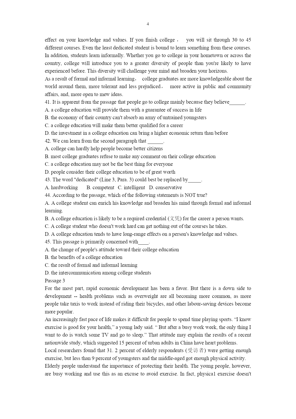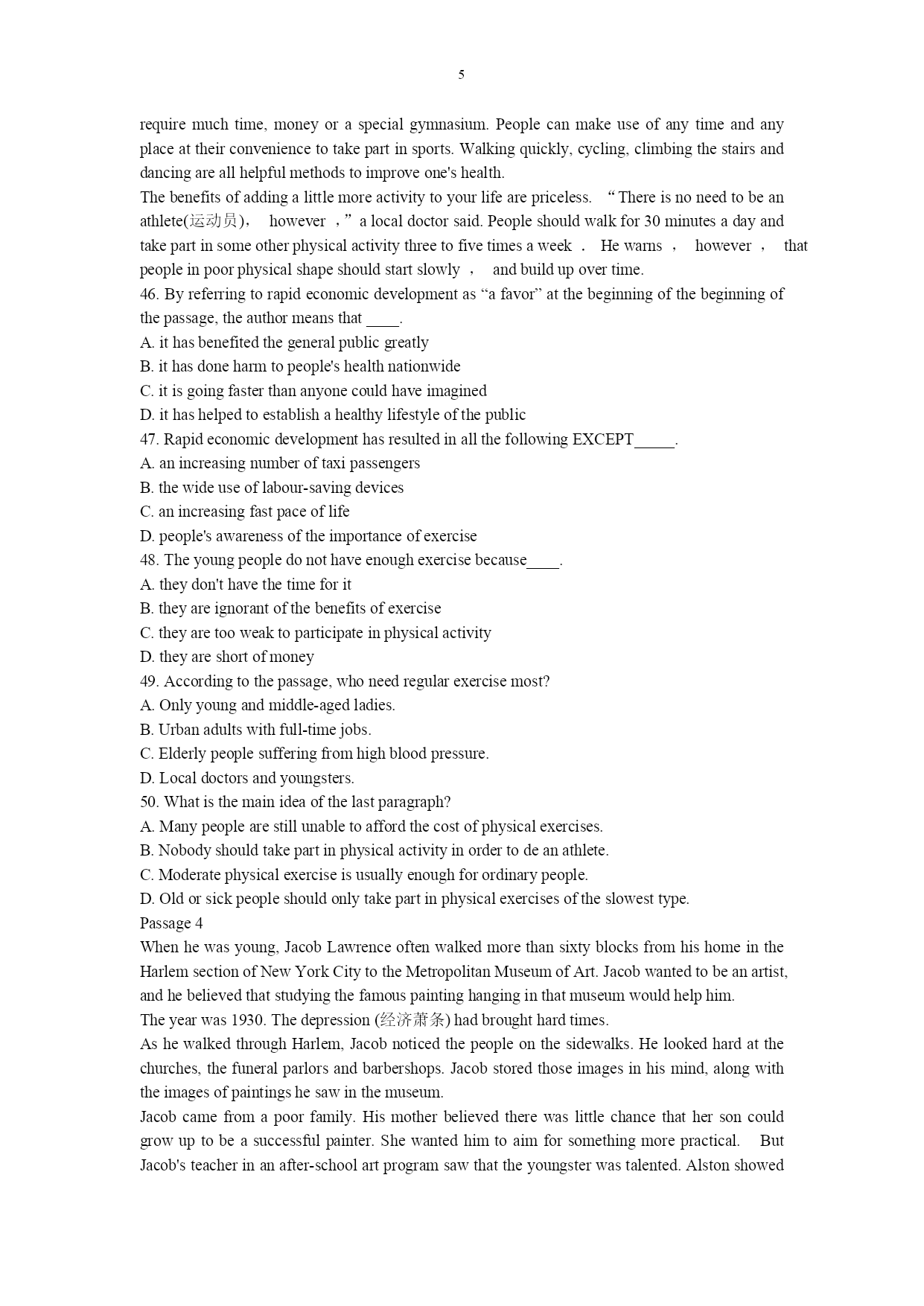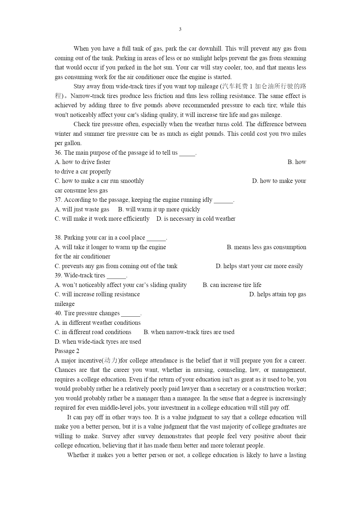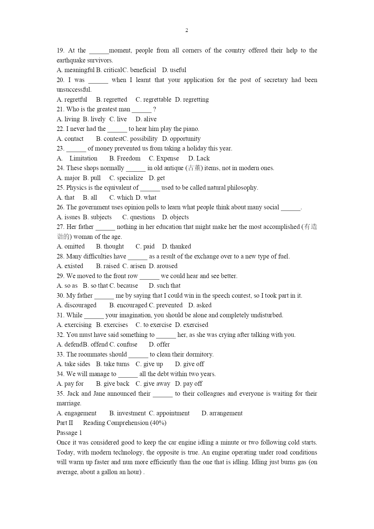 PAGE\*MERGEFORMAT1 广东省2009年普通高等学校本科插班生招生考试 《英语》(公共课)试题 PartIVocabularyandStructure(35%) 1.Nearlytwothousandyearshavepassed______theChinesefirstinventedthecompass. A.when B.before C.since D.after 2.Theylosttheirwayintheforest,and_____mademattersworsewasnightbegantofall. A.that B.it C.what D.which 3.______leisurewasgenerallyconsideredawasteoftime. A.Notuntilrecently B.Notrecently C.Untilrecently D.Recentlyuntil 4.______thatthisregionwassorichinnaturalresources. A.Littleheknew B.Littlehedidknow C.Littledidheknow D.Littlehehadknown 5.Afteramealinarestaurant,oneasksthewaiterforthe______. A.pay B.bill C.charge D.note 6.Ifyouarewalkingawayfromaclocktower,youwillhearthetickingoftheclockfadetoapoint______itcannotbeheard. A.which B.what C.where D.how 7.Toourdisappointment,Bill______towintheveryimportantgame. A.served B.failed C.managed D.enjoyed 8.Forthewholeperiodoftwomonths,there______noraininthisarea.Nowthecropsaredead. A.is B.was C.hasbeen D.havebeen 9.Youmusttryto______lookingafteryourself. A.getaccustomedto B.getalongwith C.getby D.getoff 10.Iknowthisjobofmineisn’twellpaid;______,Idon’thavetoworklonghours. A.ontheonehand B.onthecontrary C.however D.otherwise 11.The______andmoreeducatedpeopleintheEasthave,toagreatextent,takenupthetablemannersandcustomsoftheWest. A.rich B.richer C.poor D.poorer 12.______suggestionsyoumake,hewillturnadeafeartothem. A.What B.Which C.Whatever D.However 13.Mr.Johnson,togetherwithhiswifeandtwodaughters,____toarriveontheeveningflight. A.aregoing B.are C.will D.is 14.Themeetingisforthe______purposeofdiscussinghowtopreventcrime. A.detailed B.specific C.limited D.sophisticated 15.The______ofCollegeEnglishTestsistohelpstudentslearnEnglishbetter,isn’tit? A.objective B.subject C.objecting D.aiming 16.Thenewspaper______severepunishmentforallwhohadbeeninvolvedinthisincident. A.appliedfor B.calledfor C.lookedfor D.paidfor 17.Bytrading,bothcountriesgetgoodproductsfromabroadfor______theywouldcostifmadeathome. A.lessthan B.morethan C.littlethan D.fewer