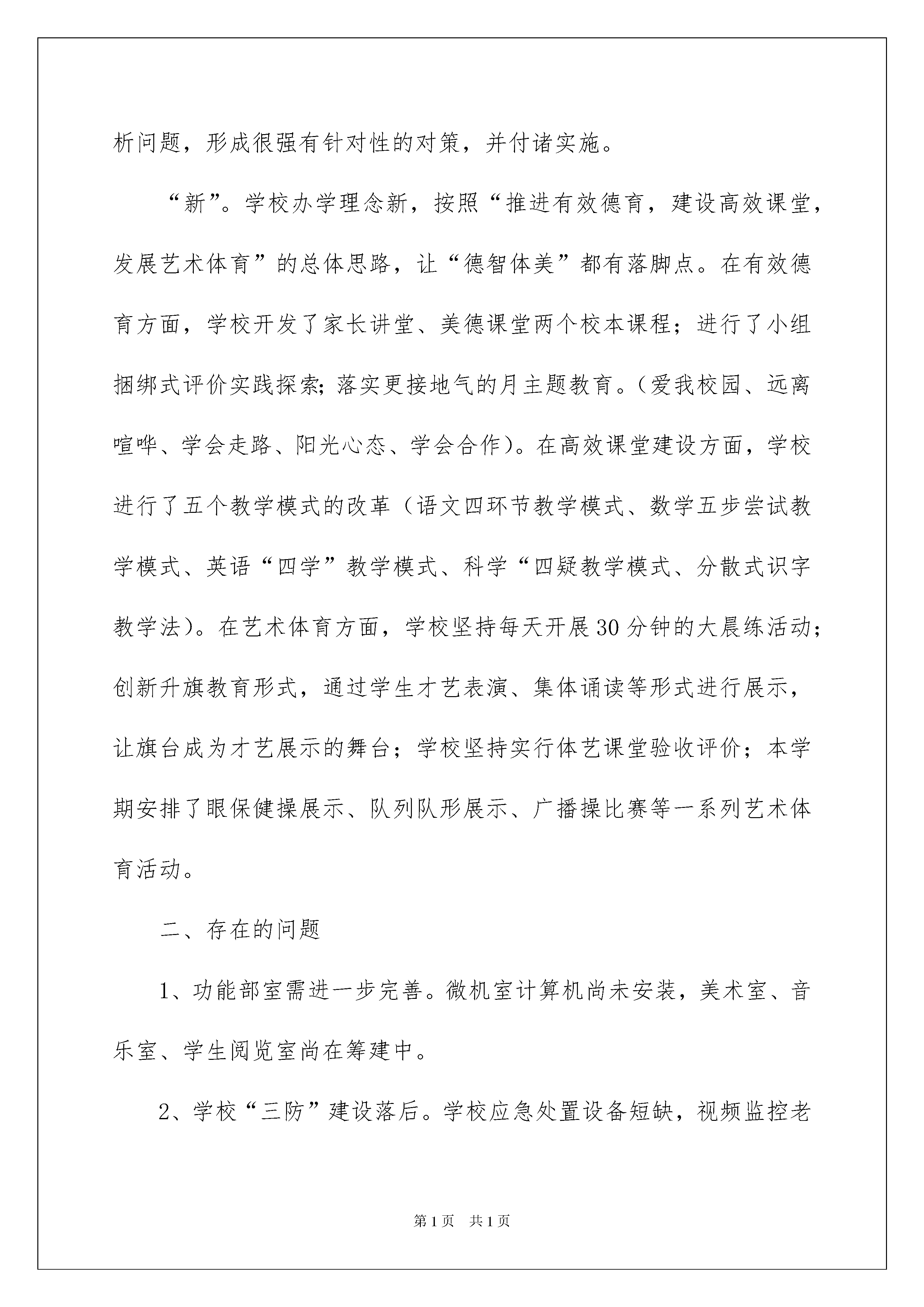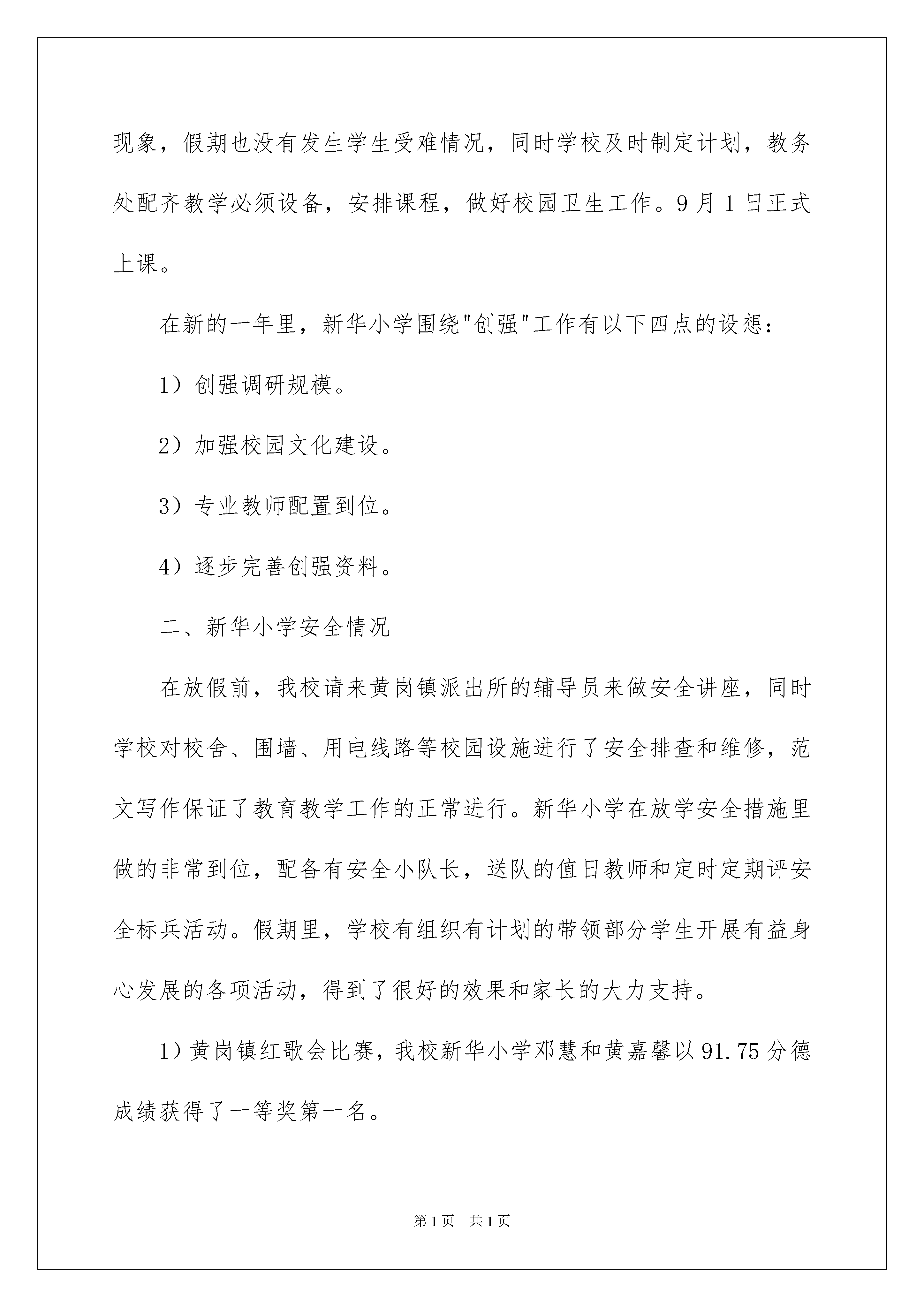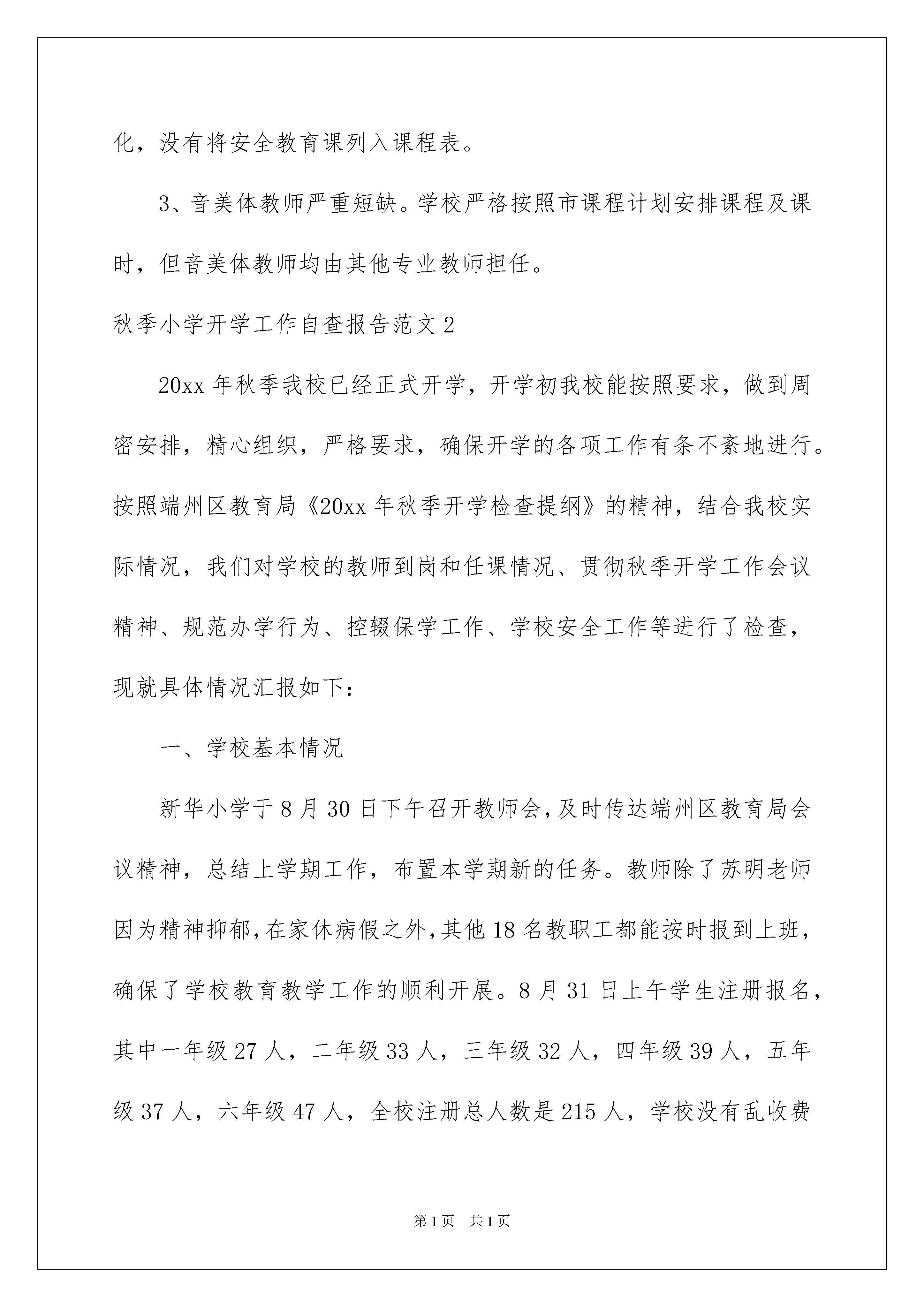 2022秋季小学开学工作自查报告范文秋季小学开学工作自查报告范文在学习、工作生活中,我们都不可避免地要接触到报告,多数报告都是在事情做完或发生后撰写的。那么一般报告是怎么写的呢?以下是我为大家整理的秋季小学开学工作自查报告范文,欢迎大家借鉴与参考,希望对大家有所帮助。秋季小学开学工作自查报告范文1本学期,我校开学工作呈现出“早”“严”“实”“新”四大特点,开学秩序井然,师生状态良好,各项工作有序展开。一、工作特点“早”。开学前一周,召开了校委会,就学校工作计划、教师工作安排、一年级招生、校园文化建设、校园尾留工程诸多方面提前进行了思考。开学前一天召开了教师会,解读了学校工作计划,对学期工作进行了整体安排。开学第一周就紧锣密鼓安排了以下活动:一是进行了各项工作计划的制定和审核;二是召开了各组室工作会,细化并分解落实学期具体工作任务;三是完善了校园文化和小组文化建设;四是组织了“分散式”教学研讨会;五是进行了一年级新生入学教育;六是组织四年级进行校园集体舞学习。“实”。学校的文档材料真实,所开展工作扎实。学校工作计划是一笔一划写出来的,符合校本特色,凝聚校委会一班人的智慧,实实在在,真真切切。学校提出了“深化课程改革,提升教育品质,建设榆林名校”的奋斗目标,按照“抓规范、补短板、创品牌、促发展”的`工作思路,确定“抓什么”、“怎样抓”,目标明确、措施得力,细致入微。各部门、各组室计划紧紧围绕学校工作计划制定,既有规定动作,又有自选动作,规范程度高,操作性强,任务落实到位。学校所开展的工作,扎扎实实,文档齐全。“严”。一是客服一切困难消除大班额,实行均衡分班。学校计划开设三个一年级班,原学前班升入一年级有151人,只另招收了11名新生,邀请督导室干部、学生家长代表进行抽签分班,每班均54人。二是坚持“诚信办学,原则办事,从严治校,全员创优”的工作理念,修订了《教学常规管理基本要求》、《教师学期综合考核细则》,成为全体教师共同遵守的准则,具有很强的规范性、激励性。三是推进“改薄计划”。就薄弱学科建设、薄弱年级转化、薄弱环节管理三个方面剖析问题,形成很强有针对性的对策,并付诸实施。“新”。学校办学理念新,按照“推进有效德育,建设高效课堂,发展艺术体育”的总体思路,让“德智体美”都有落脚点。在有效德育方面,学校开发了家长讲堂、美德课堂两个校本课程;进行了小组捆绑式评价实践探索;落实更接地气的月主题教育。(爱我校园、远离喧哗、学会走路、阳光心态、学会合作)。在高效课堂建设方面,学校进行了五个教学模式的改革(语文四环节教学模式、数学五步尝试教学模式、英语“四学”教学模式、科学“四疑教学模式、分散式识字教学法)。在艺术体育方面,学校坚持每天开展30分钟的大晨练活动;创新升旗教育形式,通过学生才艺表演、集体诵读等形式进行展示,让旗台成为才艺展示的舞台;学校坚持实行体艺课堂验收评价;本学期安排了眼保健操展示、队列队形展示、广播操比赛等一系列艺术体育活动。二、存在的问题1、功能部室需进一步完善。微机室计算机尚未安装,美术室、音乐室、学生阅览室尚在筹建中。2、学校“三防”建设落后。学校应急处置设备短缺,视频监控老化,没有将安全教育课列入课程表。3、音美体教师严重短缺。学校严格按照市课程计划安排课程及课时,但音美体教师均由其他专业教师担任。秋季小学开学工作自查报告范文220xx年秋季我校已经正式开学,开学初我校能按照要求,做到周密安排,精心组织,严格要求,确保开学的各项工作有条不紊地进行。按照端州区教育局《20xx年秋季开学检查提纲》的精神,结合我校实际情况,我们对学校的教师到岗和任课情况、贯彻秋季开学工作会议精神、规范办学行为、控辍保学工作、学校安全工作等进行了检查,现就具体情况汇报如下:一、学校基本情况新华小学于8月30日下午召开教师会,及时传达端州区教育局会议精神,总结上学期工作,布置本学期新的任务。教师除了苏明老师因为精神抑郁,在家休病假之外,其他18名教职工都能按时报到上班,确保了学校教育教学工作的顺利开展。8月31日上午学生注册报名,其中一年级27人,二年级33人,三年级32人,四年级39人,五年级37人,六年级47人,全校注册总人数是215人,学校没有乱收费现象,假期也没有发生学生受难情况,同时学校及时制定计划,教务处配齐教学必须设备,安排课程,做好校园卫生工作。9月1日正式上课。在新的一年里,新华小学围绕"创强"工作有以下四点的设想:1)创强调研规模。2)加强校园文化建设。3)专业教师配置到位。4)逐步完善创强资料。二、新华小学安全情况在放假前,我校请来黄岗镇派出所的辅导员来做安全讲