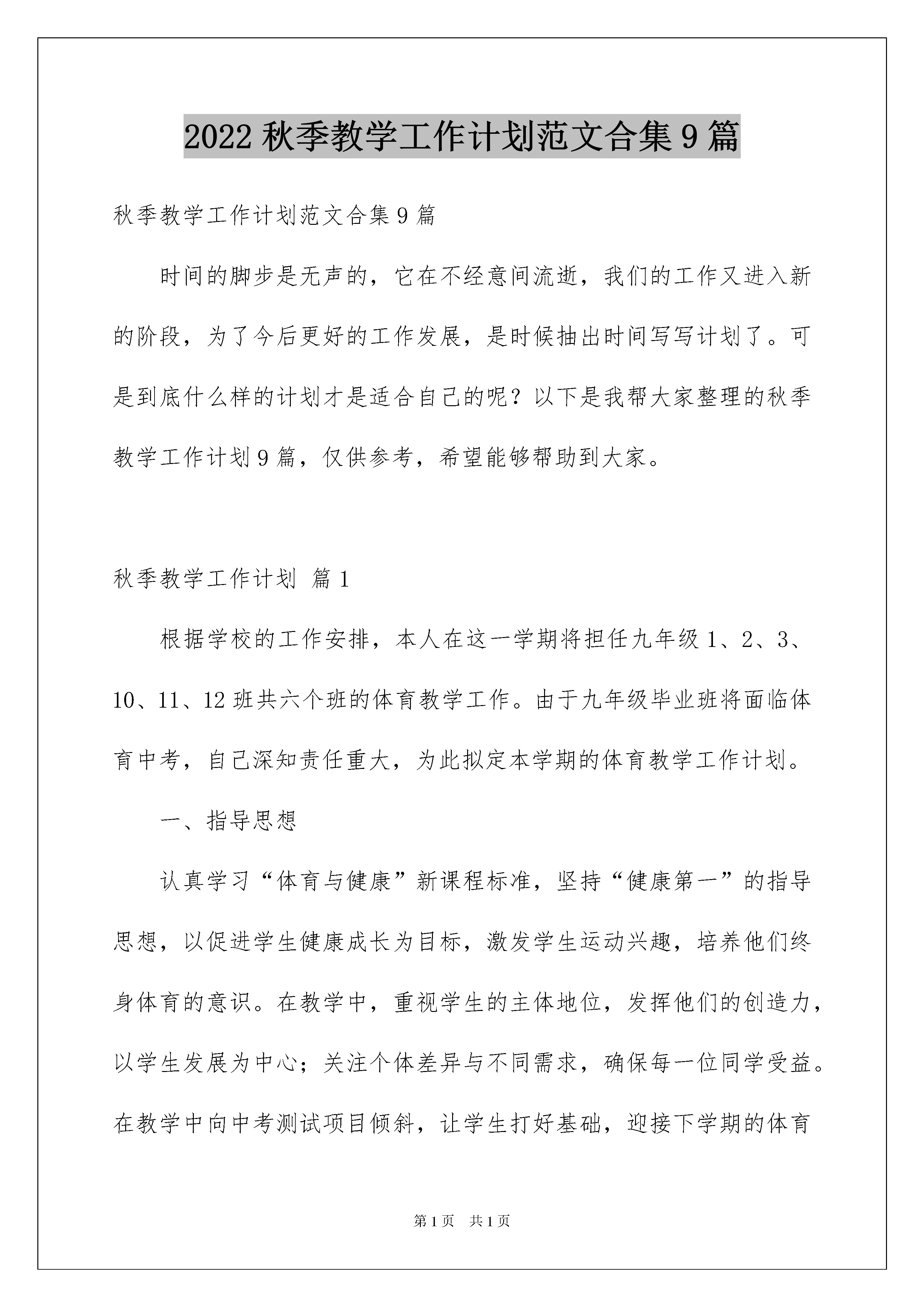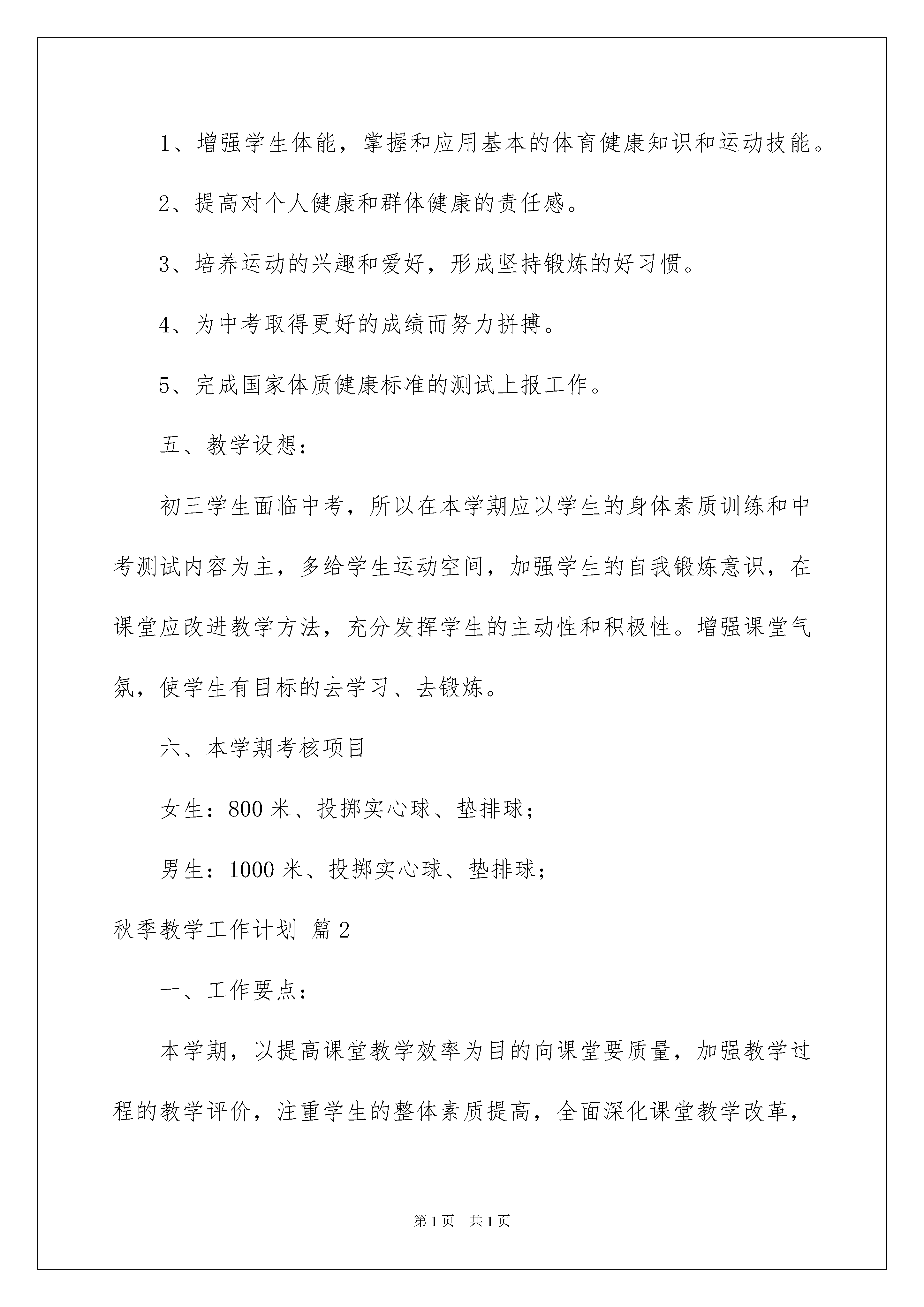 2022秋季教学工作计划范文合集9篇秋季教学工作计划范文合集9篇时间的脚步是无声的,它在不经意间流逝,我们的工作又进入新的阶段,为了今后更好的工作发展,是时候抽出时间写写计划了。可是到底什么样的计划才是适合自己的呢?以下是我帮大家整理的秋季教学工作计划9篇,仅供参考,希望能够帮助到大家。秋季教学工作计划篇1根据学校的工作安排,本人在这一学期将担任九年级1、2、3、10、11、12班共六个班的体育教学工作。由于九年级毕业班将面临体育中考,自己深知责任重大,为此拟定本学期的体育教学工作计划。一、指导思想认真学习“体育与健康”新课程标准,坚持“健康第一”的指导思想,以促进学生健康成长为目标,激发学生运动兴趣,培养他们终身体育的意识。在教学中,重视学生的主体地位,发挥他们的创造力,以学生发展为中心;关注个体差异与不同需求,确保每一位同学受益。在教学中向中考测试项目倾斜,让学生打好基础,迎接下学期的体育中考加试。二、学生现状分析所任教的九年级学生年龄在15-16岁之间,处于青春发育的高峰期,身体发育较快,男女差别较大,男生活泼好动,表现欲望强;女生趋于文静,不好活动。因此要因势利导,加强男生的身体素质练习,培养女生积极参与体育锻炼的习惯。三、教材分析根据20xx年我省初中毕业生升学体育考试的考试方案,20xx年我省的体育中考项目和20xx年一样,必考项目是:男生1000米跑、女生800米跑。男生自选项目包括立定跳远、引体向上、坐位体前屈、篮球运球;女生自选项目包括立定跳远、仰卧起坐、坐位体前屈、篮球运球;考生可从中自选一项。针对以上测试项目,制订上课内容,由针对性进行训练、练习。通过各种练习方法和辅助练习来提高运动成绩。通过本学期的学习使学生树立“健康第一”的指导思想,懂得一定的体育锻炼方法,培养学生的创新精神和实践能力,使学生得到全面的发展,最终为中考取得好的成绩而努力拼搏。四、教学目标:1、增强学生体能,掌握和应用基本的体育健康知识和运动技能。2、提高对个人健康和群体健康的责任感。3、培养运动的兴趣和爱好,形成坚持锻炼的好习惯。4、为中考取得更好的成绩而努力拼搏。5、完成国家体质健康标准的测试上报工作。五、教学设想:初三学生面临中考,所以在本学期应以学生的身体素质训练和中考测试内容为主,多给学生运动空间,加强学生的自我锻炼意识,在课堂应改进教学方法,充分发挥学生的主动性和积极性。增强课堂气氛,使学生有目标的去学习、去锻炼。六、本学期考核项目女生:800米、投掷实心球、垫排球;男生:1000米、投掷实心球、垫排球;秋季教学工作计划篇2一、工作要点:本学期,以提高课堂教学效率为目的向课堂要质量,加强教学过程的教学评价,注重学生的整体素质提高,全面深化课堂教学改革,推进我校“以学定导,多元互动”的教学模式向纵深发展。立足我校教育发展的实际深入开展教学研究,改变教师的教学行为和学生的学习方式,全面提高教学质量,力争取得新突破。二、具体措施(一)加强岗位培训,大力提高教师业务水平。1、进一步加强骨干教师的培养和管理工作,有目标,有层次,有措施地加强师资队伍建设,强化学科带头人、教学能手争创意识。本学期结合我校师资实际加强骨干教师教师的培养力度,使青年教师在教育、教学、班级管理水平有明显的提高。发挥骨干教师的作用,与薄弱教师接对,使所有教师尽快成为学校教学第一线的骨干,承新工程和磨课社团继续开展工作。2、努力转变教师工作观念本学期将结合我校教师当前的实际素质继续加强教师的政治学习和业务培训学习,通过开展各种行之有效的形式感染激发教师爱岗敬业、刻苦钻研,形成为人师表尽心奉献的意识,并溶入到具体的日常教学当中去,真正实现关注每一个学生的发展全面提高教师的修养,完善爱岗敬业的形象。本学期,将开展东城一小课改实验及经验交流会,促进教师的敬业精神有全面提升。3、强化教师的业务学习,完善自身素质。本学期我校将大力开展学习课改新理念的活动,利用每周的集体备课和专题集中研讨定期开展不同形式的业务培训活动,本学期决定进行定期有针对性的课改培训活动,力求从根本上解决教学定位盲目的现状。同时鼓励教师积极参加上级组织的教研、培训活动。本学期结合我校的校本研修进行富有实际特色的培训活动。参加培训的教师必须认真做好笔记,参加有关的测试、考核、培训后根据自身的体会促进教师不断更新教育观念,转变教学方式,提升教师业务水平。本学期,将开展教师计算机高级知识专业培训,以及英语教师基本功赛教。4、网络化教学反思活动。要求教师创建自己的教学博客,每月将自己的教学反思上传至博客,并且可以上传相关的教学课例及课堂典型案例,同时鼓励教