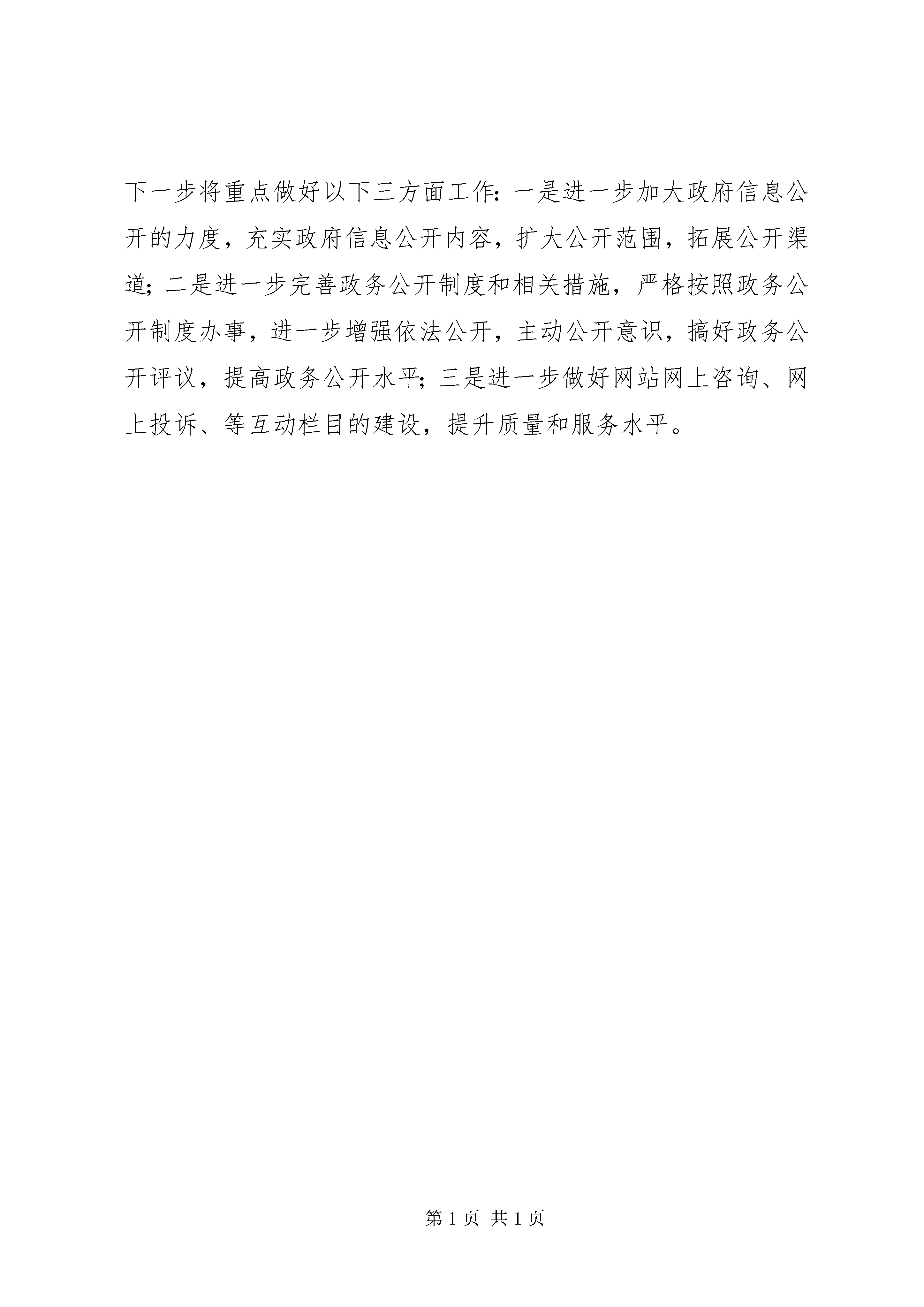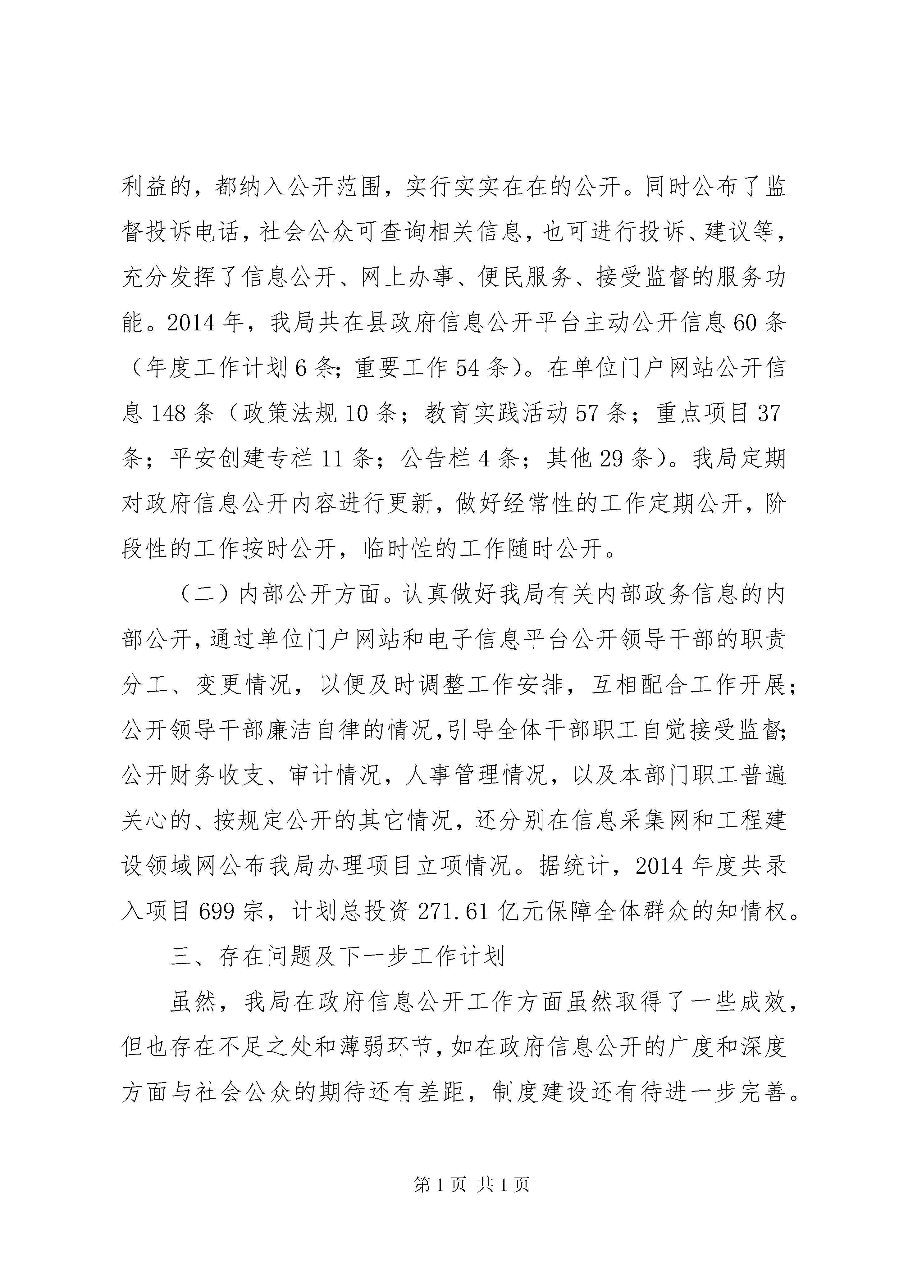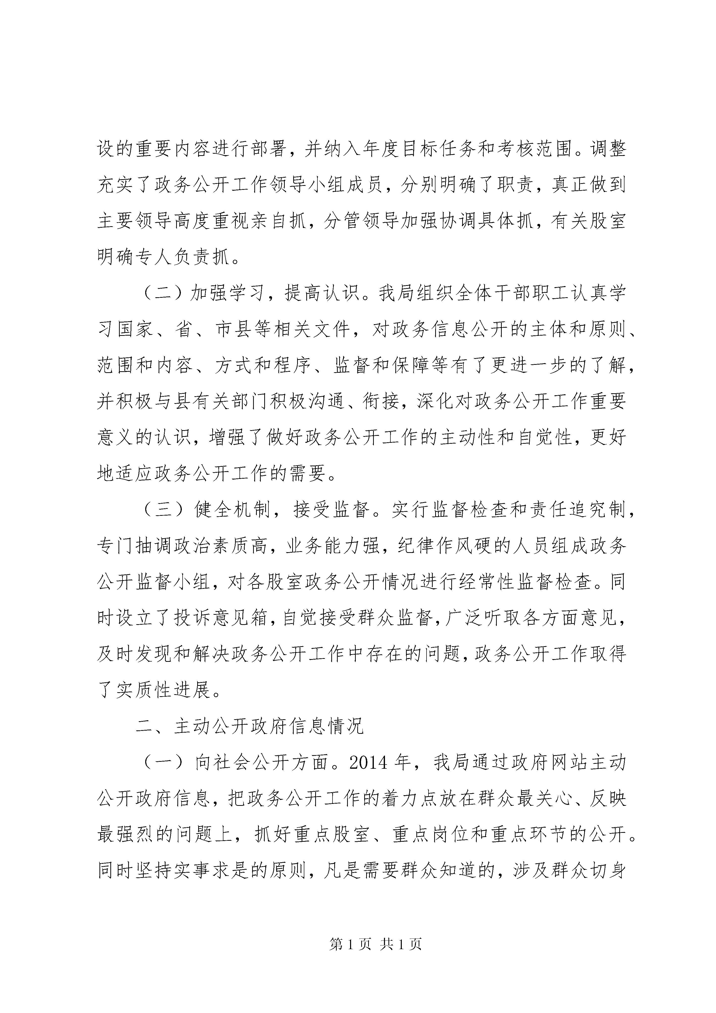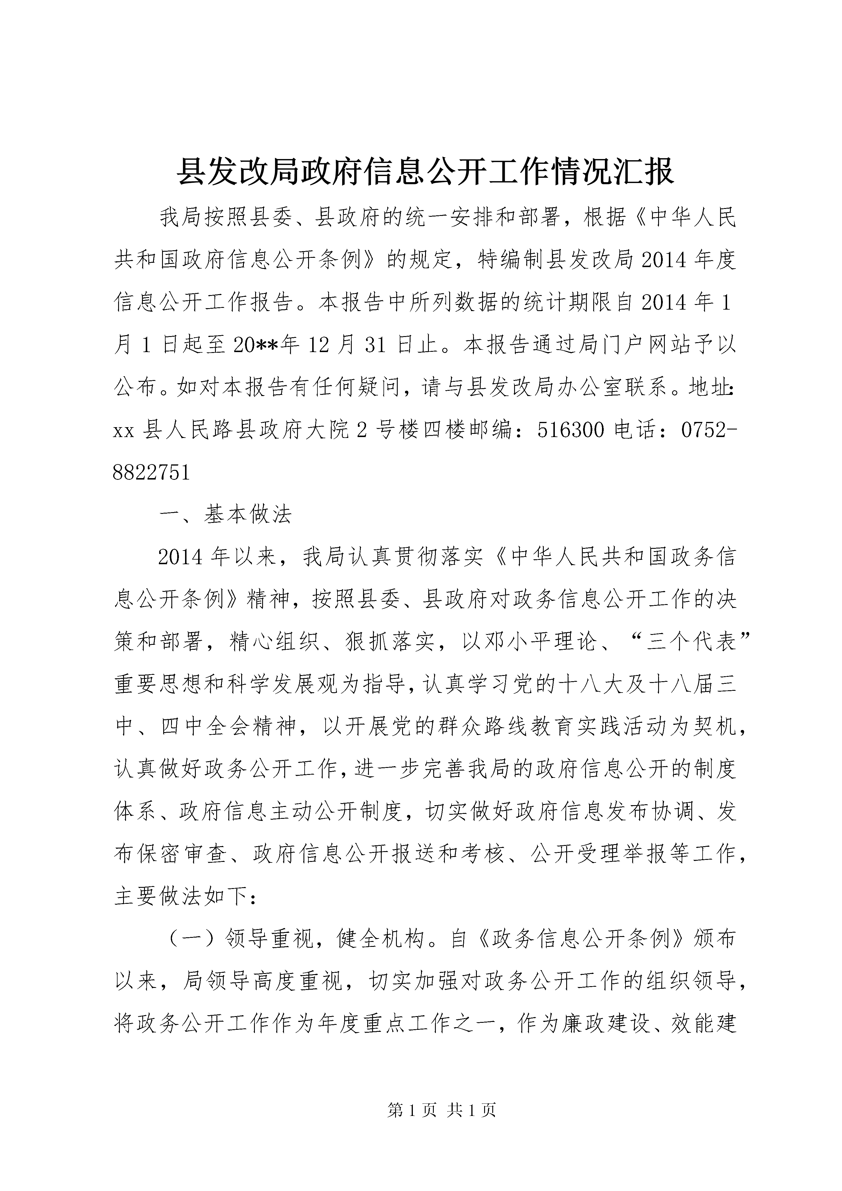 县发改局政府信息公开工作情况汇报我局按照县委、县政府的统一安排和部署,根据《中华人民共和国政府信息公开条例》的规定,特编制县发改局2014年度信息公开工作报告。本报告中所列数据的统计期限自2014年1月1日起至20**年12月31日止。本报告通过局门户网站予以公布。如对本报告有任何疑问,请与县发改局办公室联系。地址:xx县人民路县政府大院2号楼四楼邮编:516300电话:0752-8822751一、基本做法2014年以来,我局认真贯彻落实《中华人民共和国政务信息公开条例》精神,按照县委、县政府对政务信息公开工作的决策和部署,精心组织、狠抓落实,以邓小平理论、“三个代表”重要思想和科学发展观为指导,认真学习党的十八大及十八届三中、四中全会精神,以开展党的群众路线教育实践活动为契机,认真做好政务公开工作,进一步完善我局的政府信息公开的制度体系、政府信息主动公开制度,切实做好政府信息发布协调、发布保密审查、政府信息公开报送和考核、公开受理举报等工作,主要做法如下:(一)领导重视,健全机构。自《政务信息公开条例》颁布以来,局领导高度重视,切实加强对政务公开工作的组织领导,将政务公开工作作为年度重点工作之一,作为廉政建设、效能建设的重要内容进行部署,并纳入年度目标任务和考核范围。调整充实了政务公开工作领导小组成员,分别明确了职责,真正做到主要领导高度重视亲自抓,分管领导加强协调具体抓,有关股室明确专人负责抓。(二)加强学习,提高认识。我局组织全体干部职工认真学习国家、省、市县等相关文件,对政务信息公开的主体和原则、范围和内容、方式和程序、监督和保障等有了更进一步的了解,并积极与县有关部门积极沟通、衔接,深化对政务公开工作重要意义的认识,增强了做好政务公开工作的主动性和自觉性,更好地适应政务公开工作的需要。(三)健全机制,接受监督。实行监督检查和责任追究制,专门抽调政治素质高,业务能力强,纪律作风硬的人员组成政务公开监督小组,对各股室政务公开情况进行经常性监督检查。同时设立了投诉意见箱,自觉接受群众监督,广泛听取各方面意见,及时发现和解决政务公开工作中存在的问题,政务公开工作取得了实质性进展。二、主动公开政府信息情况(一)向社会公开方面。2014年,我局通过政府网站主动公开政府信息,把政务公开工作的着力点放在群众最关心、反映最强烈的问题上,抓好重点股室、重点岗位和重点环节的公开。同时坚持实事求是的原则,凡是需要群众知道的,涉及群众切身利益的,都纳入公开范围,实行实实在在的公开。同时公布了监督投诉电话,社会公众可查询相关信息,也可进行投诉、建议等,充分发挥了信息公开、网上办事、便民服务、接受监督的服务功能。2014年,我局共在县政府信息公开平台主动公开信息60条(年度工作计划6条;重要工作54条)。在单位门户网站公开信息148条(政策法规10条;教育实践活动57条;重点项目37条;平安创建专栏11条;公告栏4条;其他29条)。我局定期对政府信息公开内容进行更新,做好经常性的工作定期公开,阶段性的工作按时公开,临时性的工作随时公开。(二)内部公开方面。认真做好我局有关内部政务信息的内部公开,通过单位门户网站和电子信息平台公开领导干部的职责分工、变更情况,以便及时调整工作安排,互相配合工作开展;公开领导干部廉洁自律的情况,引导全体干部职工自觉接受监督;公开财务收支、审计情况,人事管理情况,以及本部门职工普遍关心的、按规定公开的其它情况,还分别在信息采集网和工程建设领域网公布我局办理项目立项情况。据统计,2014年度共录入项目699宗,计划总投资271.61亿元保障全体群众的知情权。三、存在问题及下一步工作计划虽然,我局在政府信息公开工作方面虽然取得了一些成效,但也存在不足之处和薄弱环节,如在政府信息公开的广度和深度方面与社会公众的期待还有差距,制度建设还有待进一步完善。下一步将重点做好以下三方面工作:一是进一步加大政府信息公开的力度,充实政府信息公开内容,扩大公开范围,拓展公开渠道;二是进一步完善政务公开制度和相关措施,严格按照政务公开制度办事,进一步增强依法公开,主动公开意识,搞好政务公开评议,提高政务公开水平;三是进一步做好网站网上咨询、网上投诉、等互动栏目的建设,提升质量和服务水平。