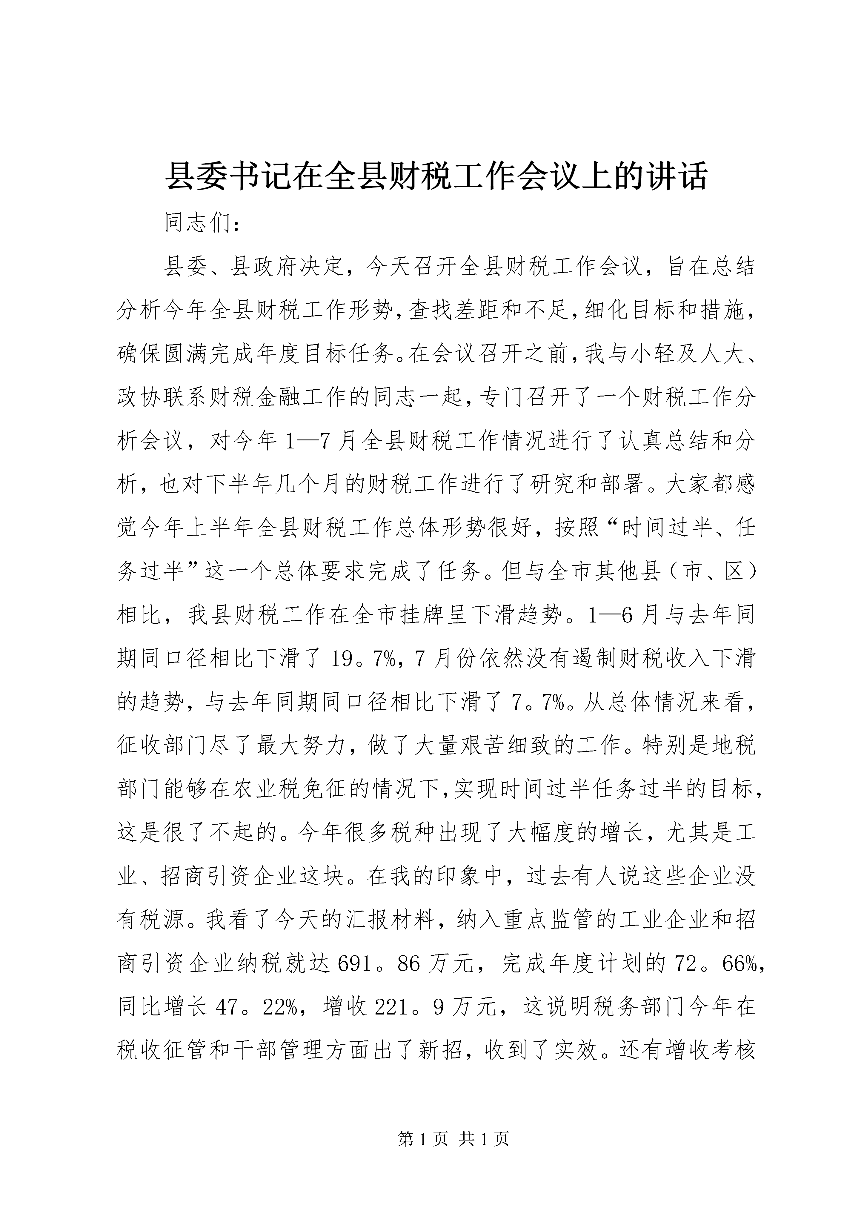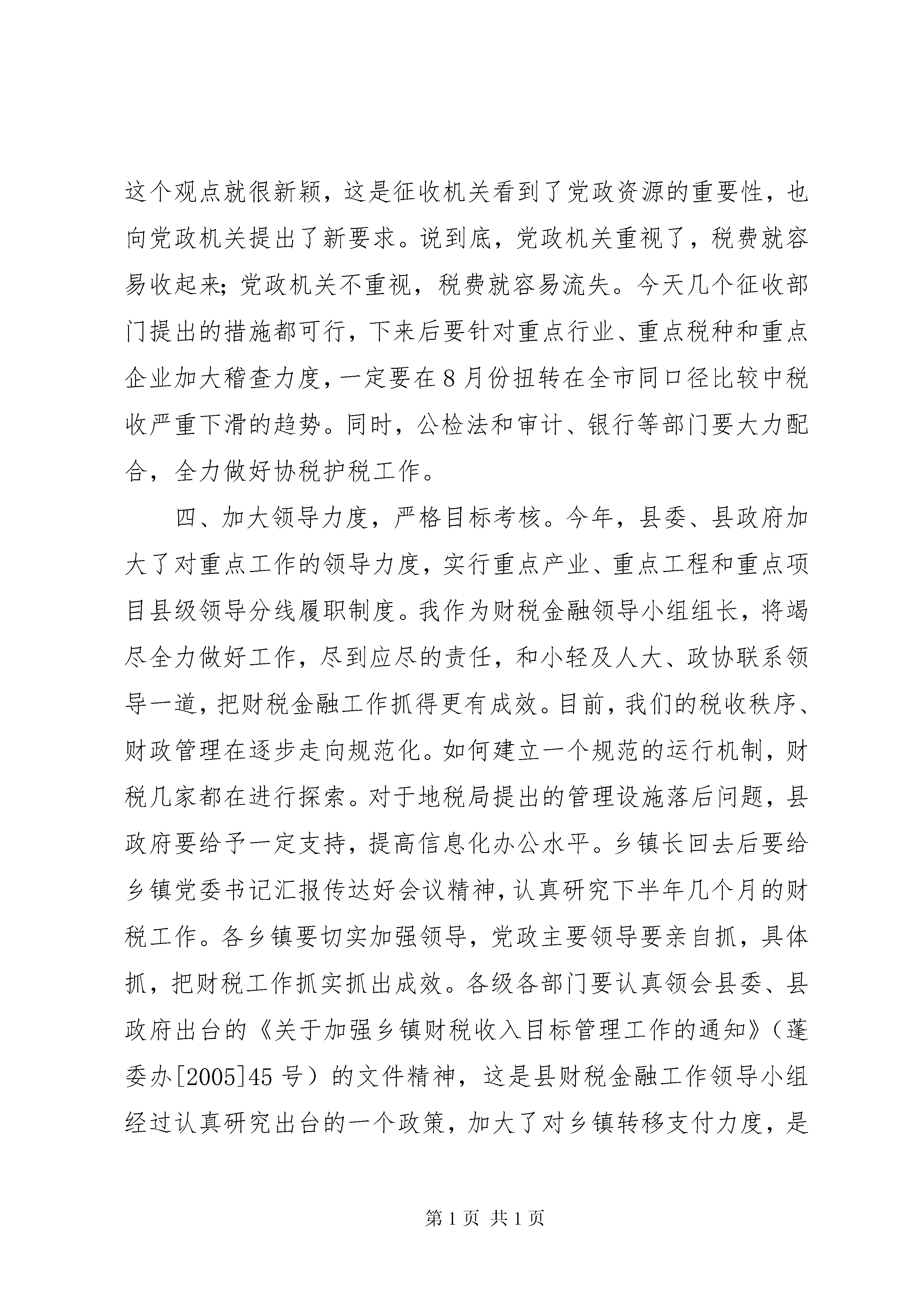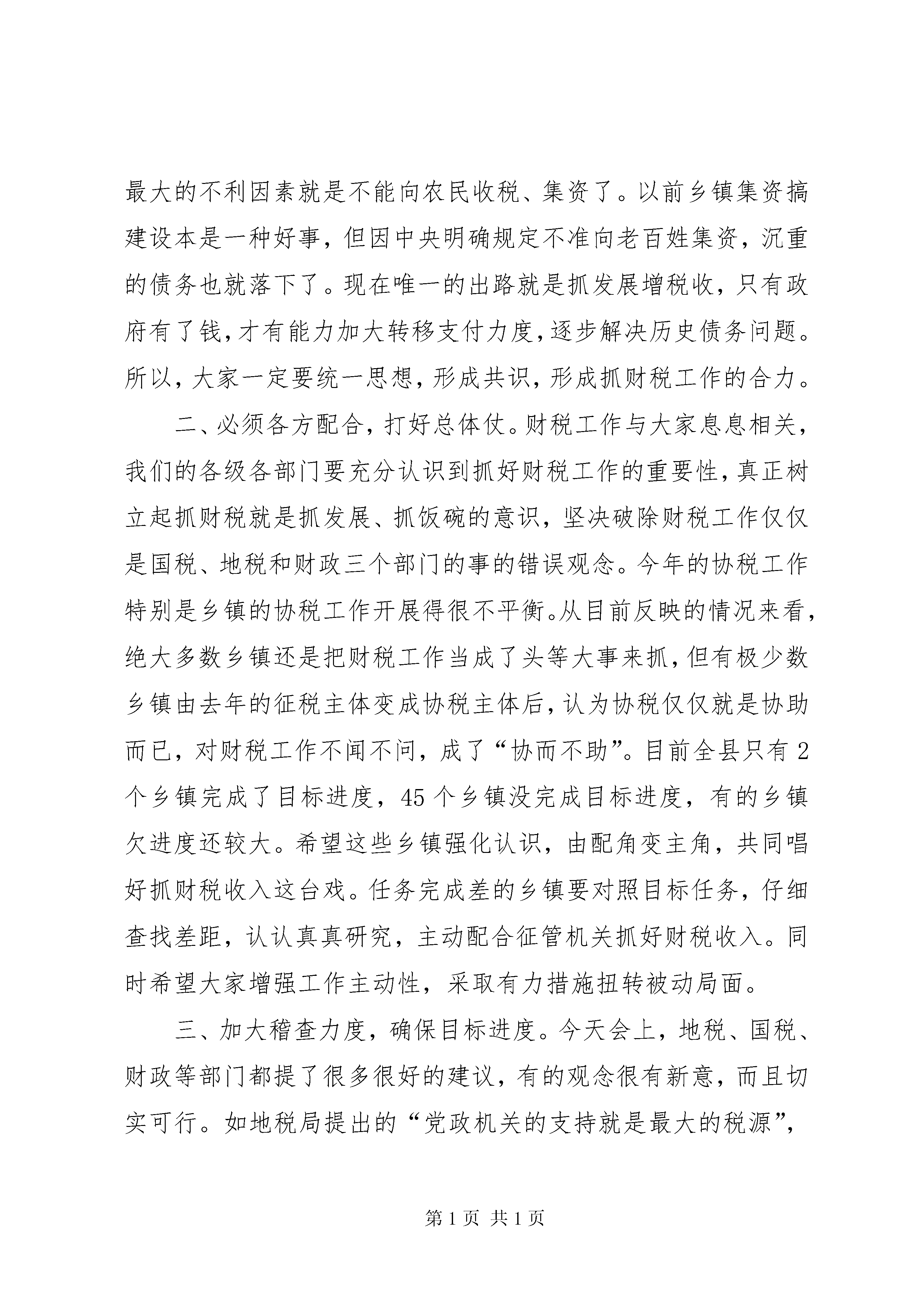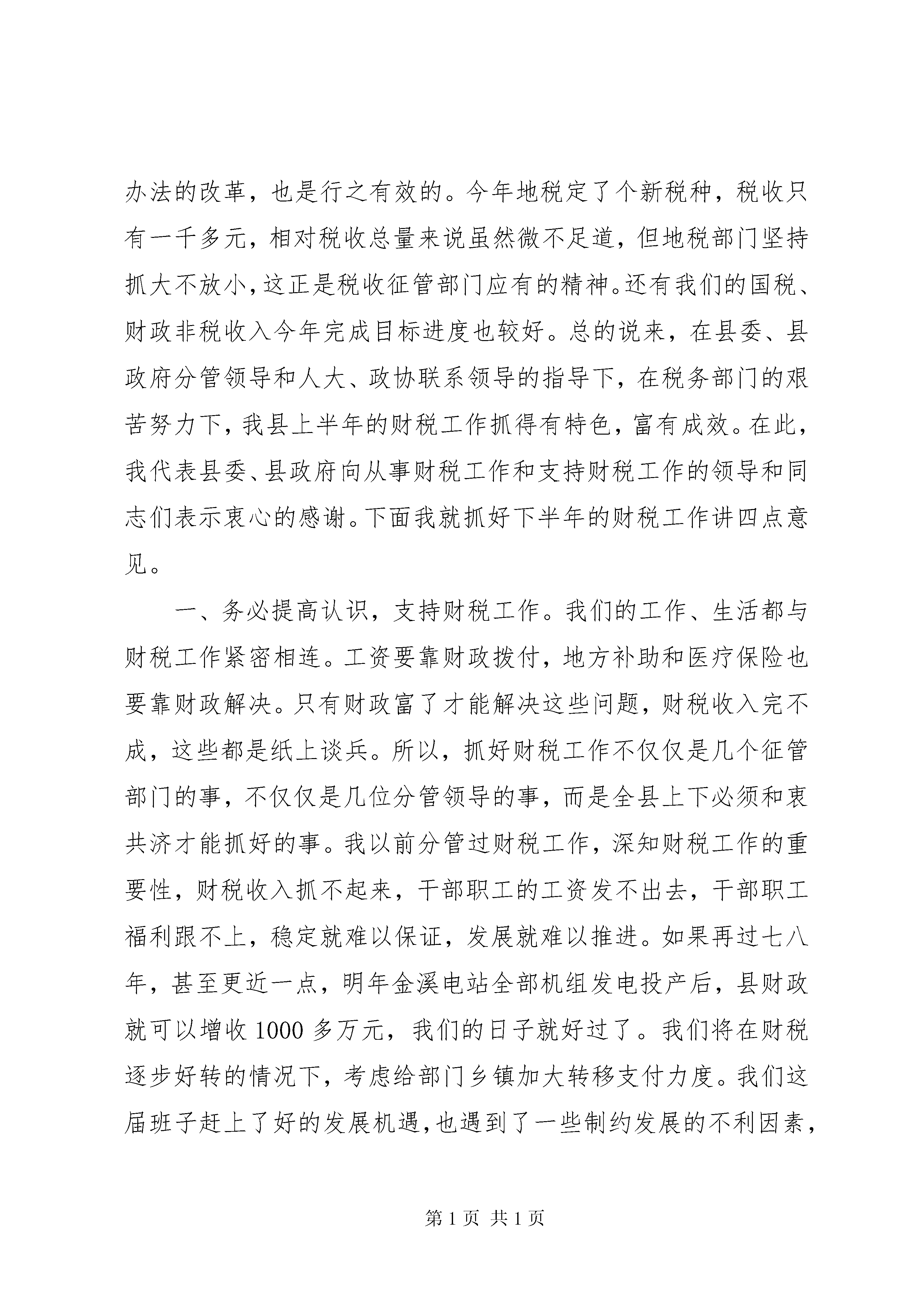 县委书记在全县财税工作会议上的讲话同志们:县委、县政府决定,今天召开全县财税工作会议,旨在总结分析今年全县财税工作形势,查找差距和不足,细化目标和措施,确保圆满完成年度目标任务。在会议召开之前,我与小轻及人大、政协联系财税金融工作的同志一起,专门召开了一个财税工作分析会议,对今年1—7月全县财税工作情况进行了认真总结和分析,也对下半年几个月的财税工作进行了研究和部署。大家都感觉今年上半年全县财税工作总体形势很好,按照“时间过半、任务过半”这一个总体要求完成了任务。但与全市其他县(市、区)相比,我县财税工作在全市挂牌呈下滑趋势。1—6月与去年同期同口径相比下滑了19。7%,7月份依然没有遏制财税收入下滑的趋势,与去年同期同口径相比下滑了7。7%。从总体情况来看,征收部门尽了最大努力,做了大量艰苦细致的工作。特别是地税部门能够在农业税免征的情况下,实现时间过半任务过半的目标,这是很了不起的。今年很多税种出现了大幅度的增长,尤其是工业、招商引资企业这块。在我的印象中,过去有人说这些企业没有税源。我看了今天的汇报材料,纳入重点监管的工业企业和招商引资企业纳税就达691。86万元,完成年度计划的72。66%,同比增长47。22%,增收221。9万元,这说明税务部门今年在税收征管和干部管理方面出了新招,收到了实效。还有增收考核办法的改革,也是行之有效的。今年地税定了个新税种,税收只有一千多元,相对税收总量来说虽然微不足道,但地税部门坚持抓大不放小,这正是税收征管部门应有的精神。还有我们的国税、财政非税收入今年完成目标进度也较好。总的说来,在县委、县政府分管领导和人大、政协联系领导的指导下,在税务部门的艰苦努力下,我县上半年的财税工作抓得有特色,富有成效。在此,我代表县委、县政府向从事财税工作和支持财税工作的领导和同志们表示衷心的感谢。下面我就抓好下半年的财税工作讲四点意见。一、务必提高认识,支持财税工作。我们的工作、生活都与财税工作紧密相连。工资要靠财政拨付,地方补助和医疗保险也要靠财政解决。只有财政富了才能解决这些问题,财税收入完不成,这些都是纸上谈兵。所以,抓好财税工作不仅仅是几个征管部门的事,不仅仅是几位分管领导的事,而是全县上下必须和衷共济才能抓好的事。我以前分管过财税工作,深知财税工作的重要性,财税收入抓不起来,干部职工的工资发不出去,干部职工福利跟不上,稳定就难以保证,发展就难以推进。如果再过七八年,甚至更近一点,明年金溪电站全部机组发电投产后,县财政就可以增收1000多万元,我们的日子就好过了。我们将在财税逐步好转的情况下,考虑给部门乡镇加大转移支付力度。我们这届班子赶上了好的发展机遇,也遇到了一些制约发展的不利因素,最大的不利因素就是不能向农民收税、集资了。以前乡镇集资搞建设本是一种好事,但因中央明确规定不准向老百姓集资,沉重的债务也就落下了。现在唯一的出路就是抓发展增税收,只有政府有了钱,才有能力加大转移支付力度,逐步解决历史债务问题。所以,大家一定要统一思想,形成共识,形成抓财税工作的合力。二、必须各方配合,打好总体仗。财税工作与大家息息相关,我们的各级各部门要充分认识到抓好财税工作的重要性,真正树立起抓财税就是抓发展、抓饭碗的意识,坚决破除财税工作仅仅是国税、地税和财政三个部门的事的错误观念。今年的协税工作特别是乡镇的协税工作开展得很不平衡。从目前反映的情况来看,绝大多数乡镇还是把财税工作当成了头等大事来抓,但有极少数乡镇由去年的征税主体变成协税主体后,认为协税仅仅就是协助而已,对财税工作不闻不问,成了“协而不助”。目前全县只有2个乡镇完成了目标进度,45个乡镇没完成目标进度,有的乡镇欠进度还较大。希望这些乡镇强化认识,由配角变主角,共同唱好抓财税收入这台戏。任务完成差的乡镇要对照目标任务,仔细查找差距,认认真真研究,主动配合征管机关抓好财税收入。同时希望大家增强工作主动性,采取有力措施扭转被动局面。三、加大稽查力度,确保目标进度。今天会上,地税、国税、财政等部门都提了很多很好的建议,有的观念很有新意,而且切实可行。如地税局提出的“党政机关的支持就是最大的税源”,这个观点就很新颖,这是征收机关看到了党政资源的重要性,也向党政机关提出了新要求。说到底,党政机关重视了,税费就容易收起来;党政机关不重视,税费就容易流失。今天几个征收部门提出的措施都可行,下来后要针对重点行业、重点税种和重点企业加大稽查力度,一定要在8月份扭转在全市同口径比较中税收严重下滑的趋势。同时,公检法和审计、银行等部门要大力配合,全力做好协税护税工作。四、加大领导力度,严格目标考核。今年,县委、县政府加大了对重点工作的领导力度,实行重点产业、重点工程和重点项目县级领导分线履职制度。我作为财税金融领导小组组长,将竭尽全力做好工