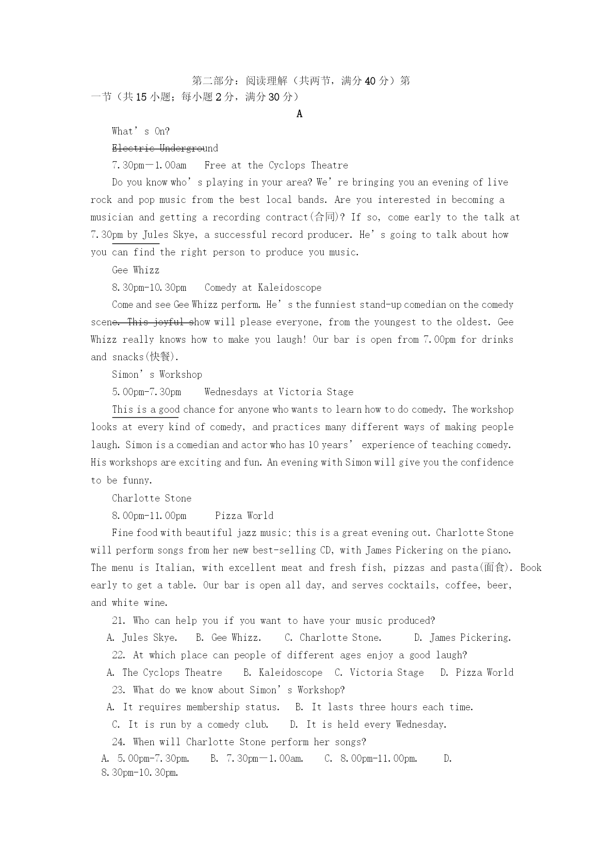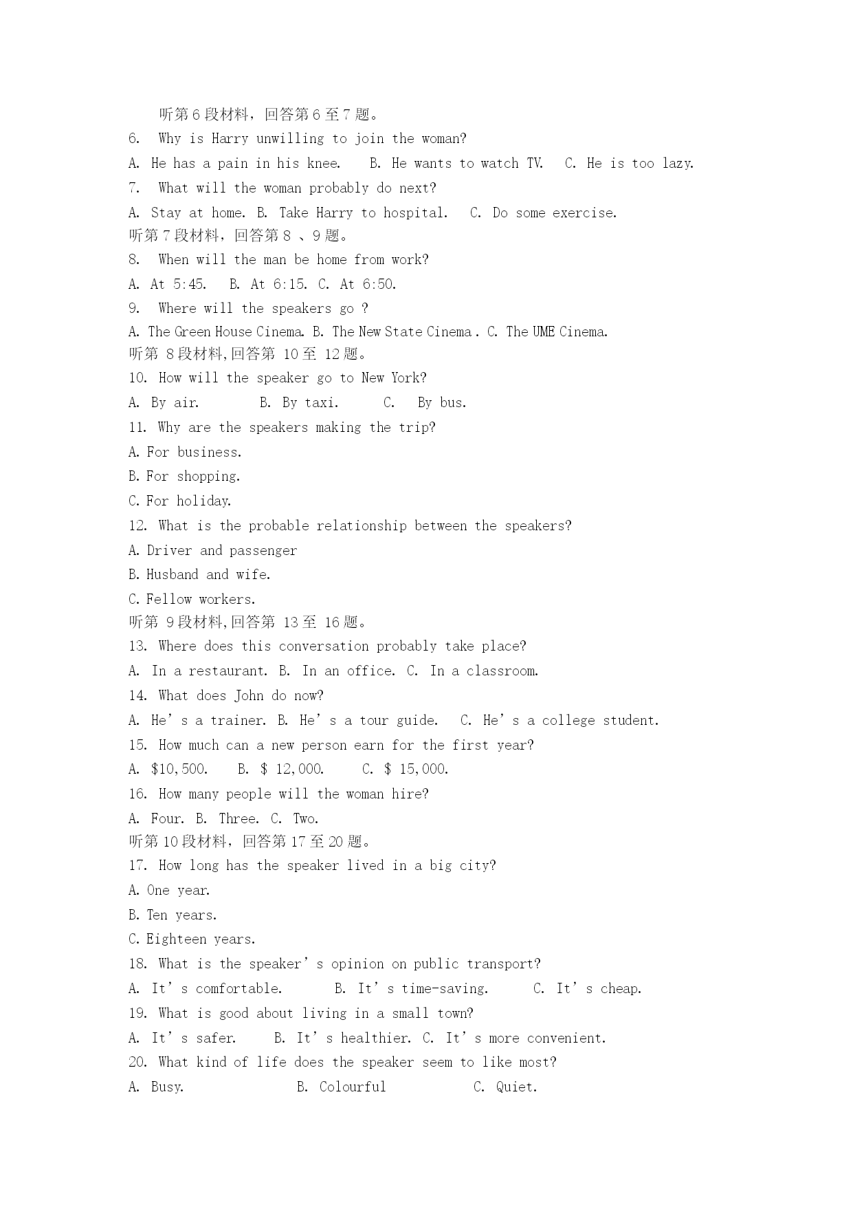 云南省昆明市外国语学校2020-2021学年高一英语下学期4月月考试题 (本试卷共6大题72小题,。考试时间120分钟,满分150分) 第一部分:听力(共两节,满分30分)第一部分听力(共两节,满分30分) 做题时,先将答案标在试卷上。录音内容结束后,你将有两分钟的时间将试卷上的答案转涂到答题卡上。 第一节(共5小题;每小题1.5分,满分7.5分) 听下面5段对话。每段对话后有一个小题,从题中所给的A、B、C三个选项中选出最 佳选项,并标在试卷的相应位置。听完每段对话后,你都有10称钟的时间来回答有关小题如阅读下一小题。每段对话仅读一遍。 例:Howmuchistheshirt? A.£19.15.B.£9.18.C.£9.15. 答案是C。 Whatdoesthewomanwanttodo? A.Findaplace.B.Buyamap.C.Getanaddress. Whatwillthemandoforthewoman? Repairhercar. Giveheraride. Pickupheraunt. WhomightMr.Petersonbe? Anewprofessor. Adepartmenthead. Acompanydirector. Whatdoesthemanthinkofthebook? Quitedifficult. Veryinteresting. Toosimple. Whatarethespeakerstalkingabout? Weather. Clothes. News. 第二节(共15小题;每小题1.5分,满分22.5分) 听下面5段对话或独白。每段对话或独白后有几个小题,从题中所给的A、B、C三个选项 中选出最佳选项,并标在试卷的相应位置。听每段对话或独白前,你将有时间阅读各个小题, 每 小题5秒钟;听完后,各小题将给出5秒钟的作答时间。每段对话或独白读两遍。 1听第6段材料,回答第6至7题。 WhyisHarryunwillingtojointhewoman? A.Hehasapaininhisknee.B.HewantstowatchTV.C.Heistoolazy. Whatwillthewomanprobablydonext? A.Stayathome.B.TakeHarrytohospital.C.Dosomeexercise. 听第7段材料,回答第8、9题。 Whenwillthemanbehomefromwork? A.At5:45.B.At6:15.C.At6:50. Wherewillthespeakersgo? A.TheGreenHouseCinema.B.TheNewStateCinema.C.TheUMECinema.听第8段材料,回答第10至12题。 HowwillthespeakergotoNewYork? A.Byair.B.Bytaxi.C.Bybus. 11.Whyarethespeakersmakingthetrip? Forbusiness. Forshopping. Forholiday. Whatistheprobablerelationshipbetweenthespeakers? Driverandpassenger Husbandandwife. Fellowworkers. 听第9段材料,回答第13至16题。 Wheredoesthisconversationprobablytakeplace? A.Inarestaurant.B.Inanoffice.C.Inaclassroom. WhatdoesJohndonow? A.He’satrainer.B.He’satourguide.C.He’sacollegestudent. Howmuchcananewpersonearnforthefirstyear? A.$10,500.B.$12,000.C.$15,000. Howmanypeoplewillthewomanhire? A.Four.B.Three.C.Two. 听第10段材料,回答第17至20题。 Howlonghasthespeakerlivedinabigcity? Oneyear. Tenyears. Eighteenyears. Whatisthespeaker’sopiniononpublictransport? A.It’scomfortable.B.It’stime-saving.C.It’scheap. Whatisgoodaboutlivinginasmalltown? A.It’ssafer.B.It’shealthier.C.It’smoreconvenient. Whatkindoflifedoe