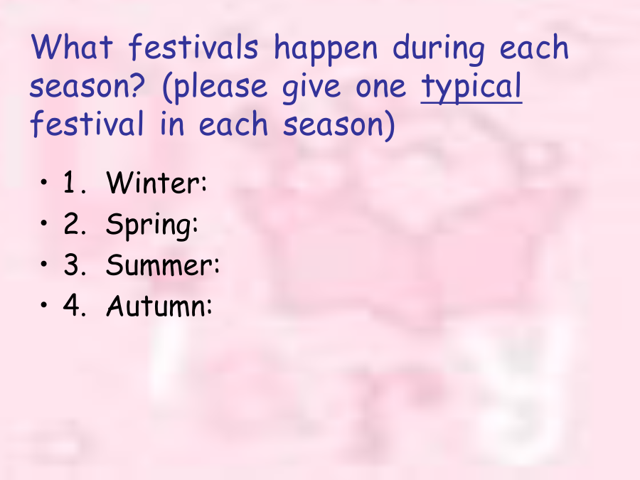 Unit3Celebration Lesson1 FestivalsGraduationWhat’syourfavoriteseason?Whatfestivalshappenduringeachseason?(pleasegiveonetypicalfestivalineachseason)PhraseslearningFast-readingWhichfestivaliscelebrated?Mid-AutumnFestivalTheLanternFestivalTypicalfood:FestivalsFillintheblanksHowtointroduceafestivalOralPracticeLanguagePointLanguagePointLanguagePointLanguagePointConsolidatethekeypointsbyexercise:Readagainandanswerthefollowingquestionsarelit aremadewith aredecoratedwith