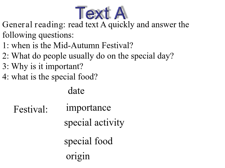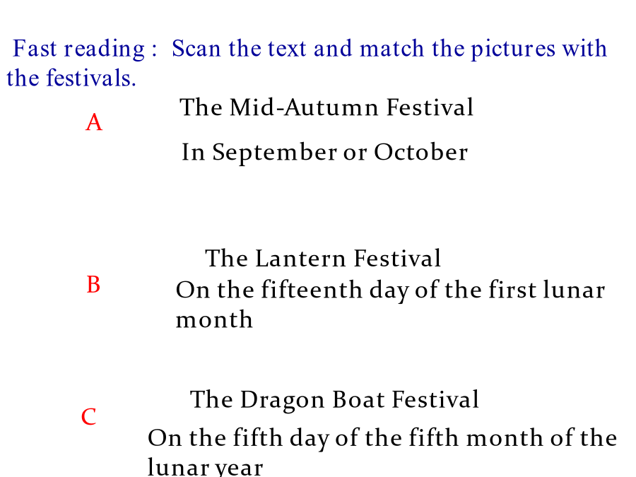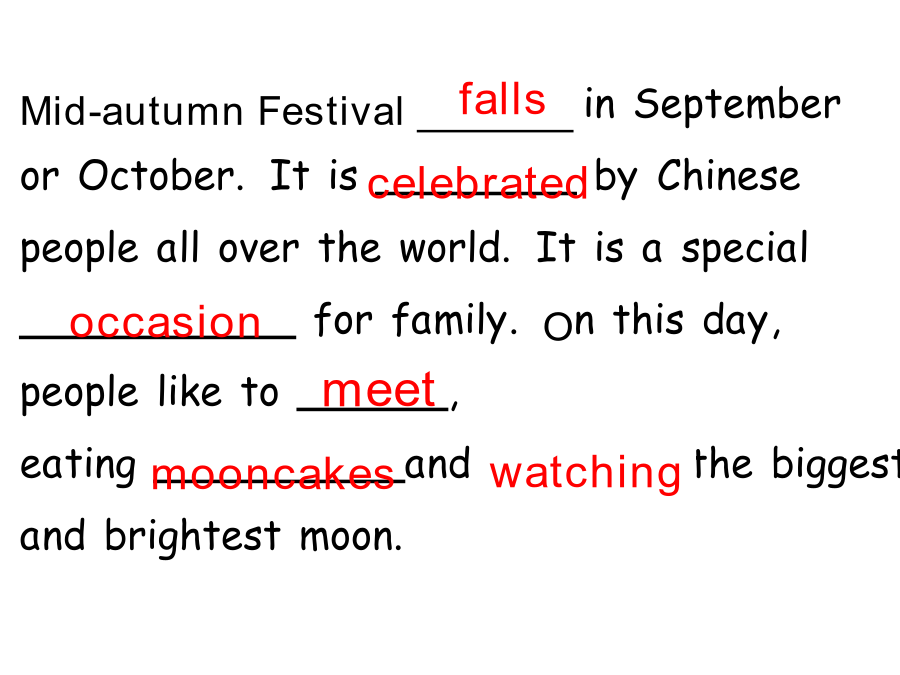 FestivalsAGeneralreading:readtextAquicklyandanswerthefollowingquestions: 1:whenistheMid-AutumnFestival? 2:Whatdopeopleusuallydoonthespecialday? 3:Whyisitimportant? 4:whatisthespecialfood?Mid-autumnFestival_______inSeptember orOctober.Itis________byChinese peopleallovertheworld.Itisaspecial ___________forfamily.Onthisday, peopleliketo______, eating__________and________thebiggestandbrightestmoon.Thetraditionalmooncakes aremadewithbeanpaste.TextBTheLanternFestivalfallsonthefifteenth dayofthefirstlunarmonth.It_________the endofChineseNewYearcelebrations. Inonestory,lanternswere_________to celebratedthe______oflightover Darkness.Inanotherstory,agodwho wantedto______downatown wasfooled.Otherwise,itwouldhavebeen ___________.onthisday,atypicalfood, ______________,isserved.Anddifferent kindsoflanternscanbeenjoyed.marklightlanternsInthepastTypicalfood:1.sb./sth.issaidtodo…2.occasion场合,时刻,时候3.includingprep.包括5.takepartin参加ConsolidatethekeypointsbyexerciseGrammar定义:被动语态,即不知道动作执行者或强调动作 承受者的一种语态。 构成:be+pastparticiple(过去分词,简称P.P.) (+by+动作执行者),时态的变化体现在 be动词上。 Onceenvironmentaldamageisdone,ittakesmanyyearsforthesystemtorecover. Aboywasknockeddownoffhisbicyclebyadeliveryvan. TensesForexample:TurnthefollowingsentencesintopassivevoiceCompletethesentenceswiththecorrectverbforms.7.Outerspace_______________(notexplore)bypeoplebefore1957. 8.Computerscience___________(teach)nowalmostinalluniversities. 9.Doyouknowwhenthefirstrailwayintheworld__________(design)? 10.Fiveunitsofthistextbook_____________(study)sofar. 11.Abeautifulhorse___________(draw)byJohnnextday.