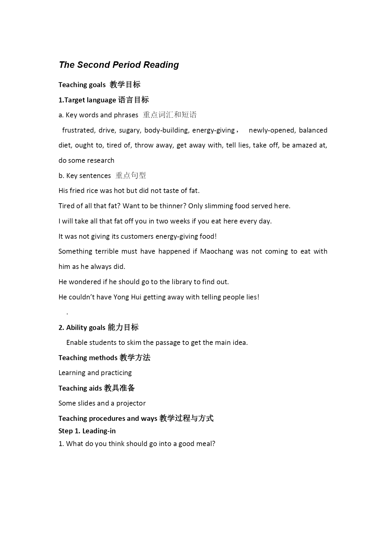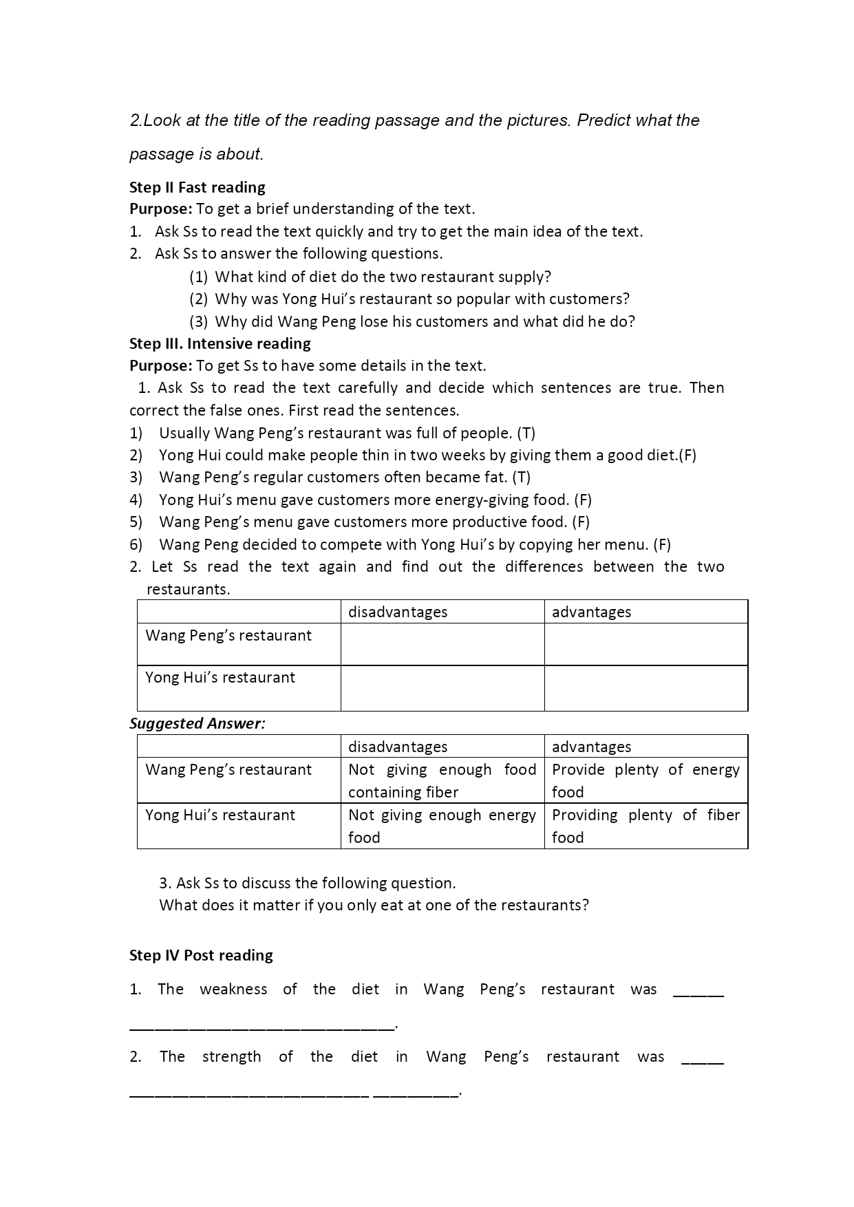 TheSecondPeriodReading Teachinggoals教学目标 1.Targetlanguage语言目标 a.Keywordsandphrases重点词汇和短语 frustrated,drive,sugary,body-building,energy-giving,newly-opened,balanceddiet,oughtto,tiredof,throwaway,getawaywith,telllies,takeoff,beamazedat,dosomeresearch b.Keysentences重点句型 Hisfriedricewashotbutdidnottasteoffat. Tiredofallthatfat?Wanttobethinner?Onlyslimmingfoodservedhere. Iwilltakeallthatfatoffyouintwoweeksifyoueathereeveryday. Itwasnotgivingitscustomersenergy-givingfood! SomethingterriblemusthavehappenedifMaochangwasnotcomingtoeatwithhimashealwaysdid. Hewonderedifheshouldgotothelibrarytofindout. Hecouldn’thaveYongHuigettingawaywithtellingpeoplelies! . 2.Abilitygoals能力目标 Enablestudentstoskimthepassagetogetthemainidea. Teachingmethods教学方法 Learningandpracticing Teachingaids教具准备 Someslidesandaprojector Teachingproceduresandways教学过程与方式 Step1.Leading-in 1.Whatdoyouthinkshouldgointoagoodmeal? 2.Lookatthetitleofthereadingpassageandthepictures.Predictwhatthepassageisabout. StepIIFastreading Purpose:Togetabriefunderstandingofthetext. AskSstoreadthetextquicklyandtrytogetthemainideaofthetext. AskSstoanswerthefollowingquestions. Whatkindofdietdothetworestaurantsupply? WhywasYongHui’srestaurantsopopularwithcustomers? WhydidWangPenglosehiscustomersandwhatdidhedo? StepIII.Intensivereading Purpose:TogetSstohavesomedetailsinthetext. 1.AskSstoreadthetextcarefullyanddecidewhichsentencesaretrue.Thencorrectthefalseones.Firstreadthesentences. UsuallyWangPeng’srestaurantwasfullofpeople.(T) YongHuicouldmakepeoplethinintwoweeksbygivingthemagooddiet.(F) WangPeng’sregularcustomersoftenbecamefat.(T) YongHui’smenugavecustomersmoreenergy-givingfood.(F) WangPeng’smenugavecustomersmoreproductivefood.(F) WangPengdecidedtocompetewithYongHui’sbycopyinghermenu.(F) 2.LetSsreadthetextagainandfindoutthedifferencesbetweenthetworestaurants. disadvantagesadvantagesWangPeng’srestaurantYongHui’srestaurantSuggestedAnswer: disadvantagesadvantagesWangPeng’srestaurantNotgivingenoughfoodcontainingfiberProvideplentyofene