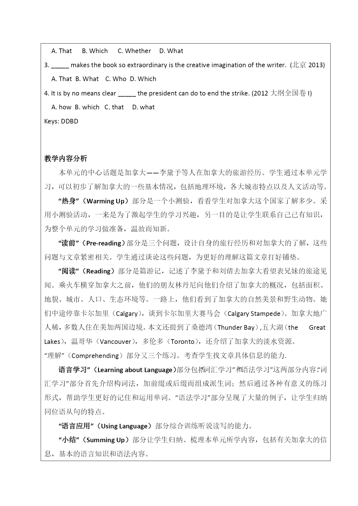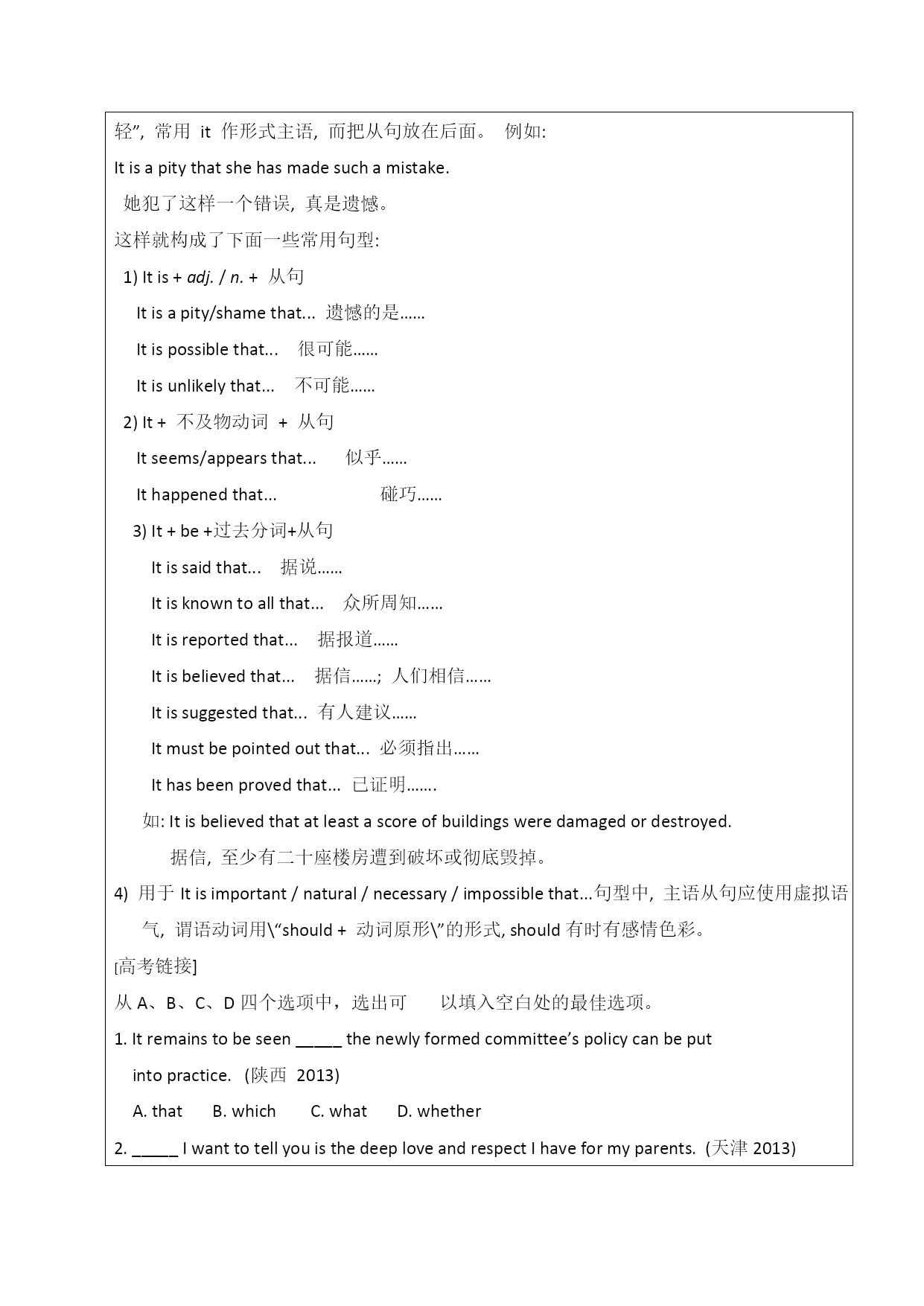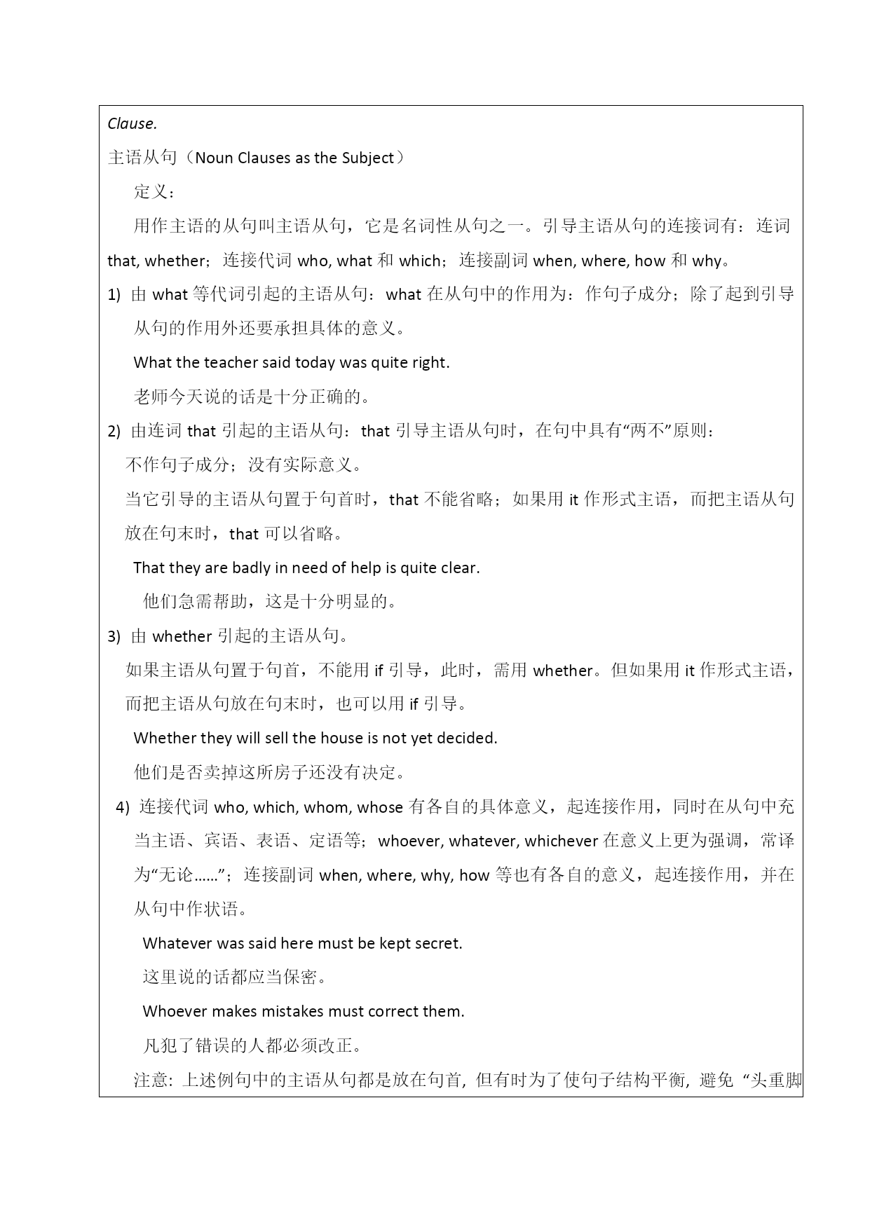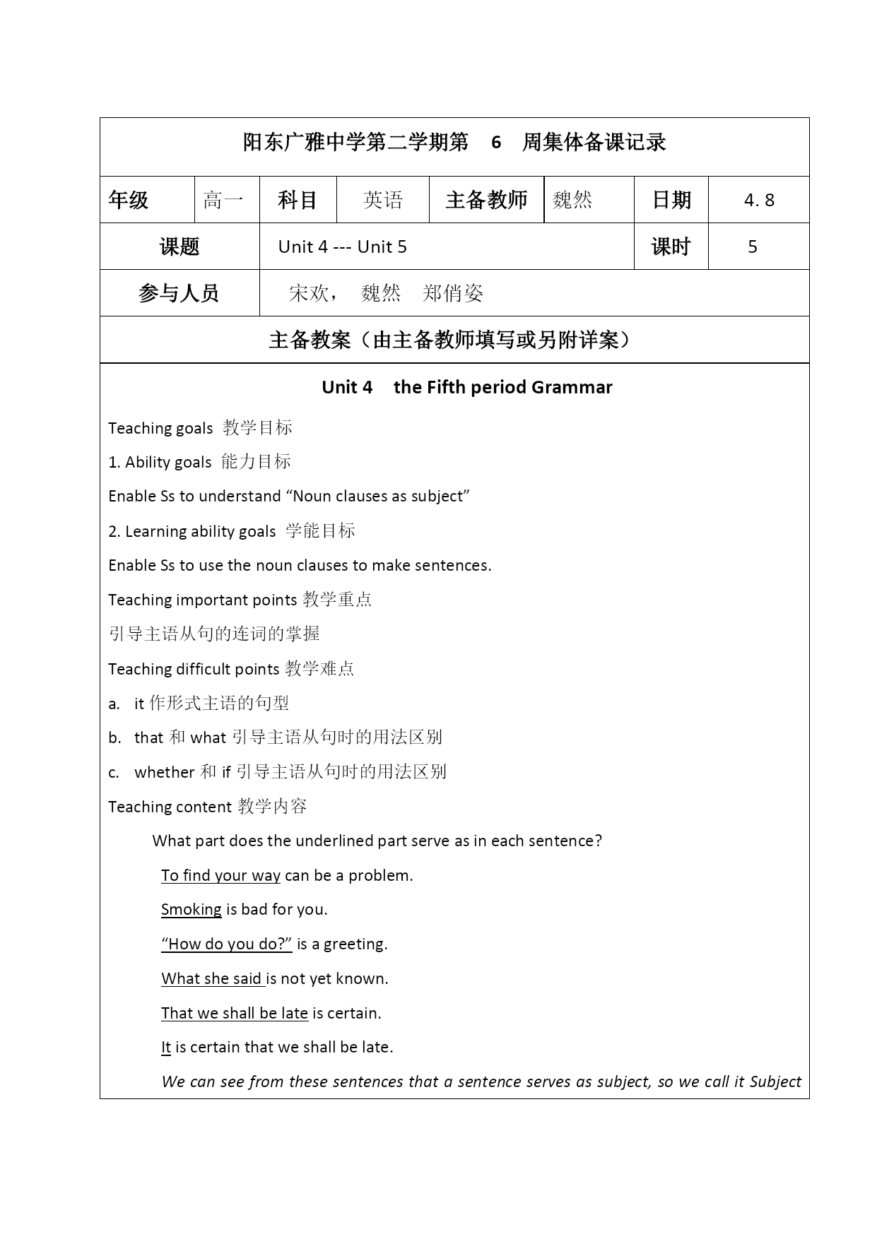 阳东广雅中学第二学期第6周集体备课记录 年级高一科目英语主备教师魏然日期4.8课题Unit4---Unit5课时5参与人员宋欢,魏然郑俏姿主备教案(由主备教师填写或另附详案)Unit4theFifthperiodGrammar Teachinggoals教学目标 1.Abilitygoals能力目标 EnableSstounderstand“Nounclausesassubject” 2.Learningabilitygoals学能目标 EnableSstousethenounclausestomakesentences. Teachingimportantpoints教学重点 引导主语从句的连词的掌握 Teachingdifficultpoints教学难点 it作形式主语的句型 that和what引导主语从句时的用法区别 whether和if引导主语从句时的用法区别 Teachingcontent教学内容 Whatpartdoestheunderlinedpartserveasineachsentence? Tofindyourwaycanbeaproblem. Smokingisbadforyou. “Howdoyoudo?”isagreeting. Whatshesaidisnotyetknown. Thatweshallbelateiscertain. Itiscertainthatweshallbelate. Wecanseefromthesesentencesthatasentenceservesassubject,sowecallitSubjectClause. 主语从句(NounClausesastheSubject) 定义: 用作主语的从句叫主语从句,它是名词性从句之一。引导主语从句的连接词有:连词that,whether;连接代词who,what和which;连接副词when,where,how和why。 1)由what等代词引起的主语从句:what在从句中的作用为:作句子成分;除了起到引导从句的作用外还要承担具体的意义。 Whattheteachersaidtodaywasquiteright. 老师今天说的话是十分正确的。 2)由连词that引起的主语从句:that引导主语从句时,在句中具有“两不”原则: 不作句子成分;没有实际意义。 当它引导的主语从句置于句首时,that不能省略;如果用it作形式主语,而把主语从句放在句末时,that可以省略。 Thattheyarebadlyinneedofhelpisquiteclear. 他们急需帮助,这是十分明显的。 3)由whether引起的主语从句。 如果主语从句置于句首,不能用if引导,此时,需用whether。但如果用it作形式主语,而把主语从句放在句末时,也可以用if引导。 Whethertheywillsellthehouseisnotyetdecided. 他们是否卖掉这所房子还没有决定。 4)连接代词who,which,whom,whose有各自的具体意义,起连接作用,同时在从句中充当主语、宾语、表语、定语等;whoever,whatever,whichever在意义上更为强调,常译为“无论……”;连接副词when,where,why,how等也有各自的意义,起连接作用,并在从句中作状语。 Whateverwassaidheremustbekeptsecret. 这里说的话都应当保密。 Whoevermakesmistakesmustcorrectthem. 凡犯了错误的人都必须改正。 注意:上述例句中的主语从句都是放在句首,但有时为了使句子结构平衡,避免“头重脚轻”,常用it作形式主语,而把从句放在后面。例如: Itisapitythatshehasmadesuchamistake. 她犯了这样一个错误,真是遗憾。 这样就构成了下面一些常用句型: 1)Itis+adj./n.+从句 Itisapity/shamethat...遗憾的是…… Itispossiblethat...很可能…… Itisunlikelythat...不可能…… 2)It+不及物动词+从句 Itseems/appearsthat...似乎…… Ithappenedthat...碰巧…… 3)It+be+过去分词+从句 Itissaidthat...据说…… Itisknowntoallthat...众所周知…… Itisreportedthat...据报道…… Itisbelievedthat...据信……;人们相信…… Itissuggestedthat...有人建议…… Itmustbepointedoutthat...必须指出…… Ithasbeenproved