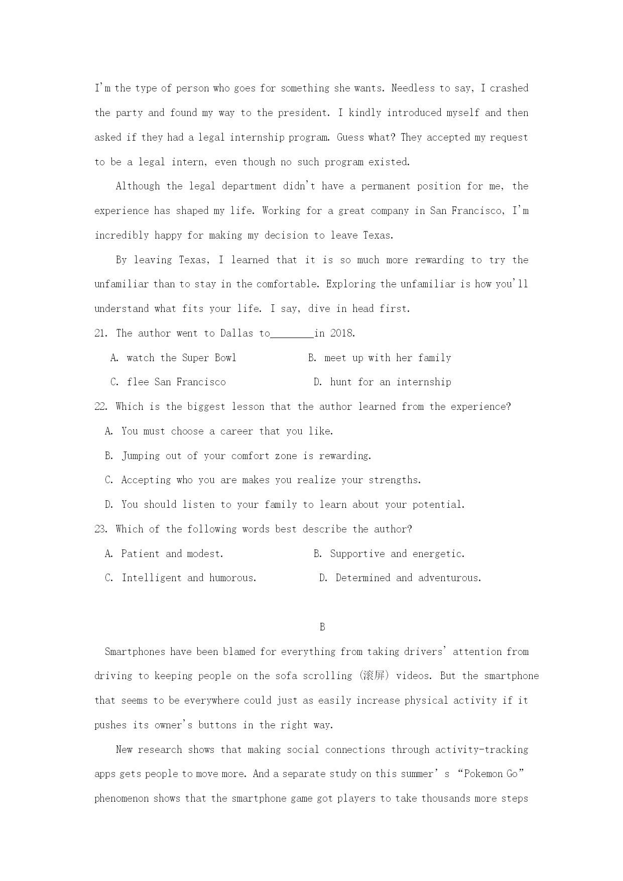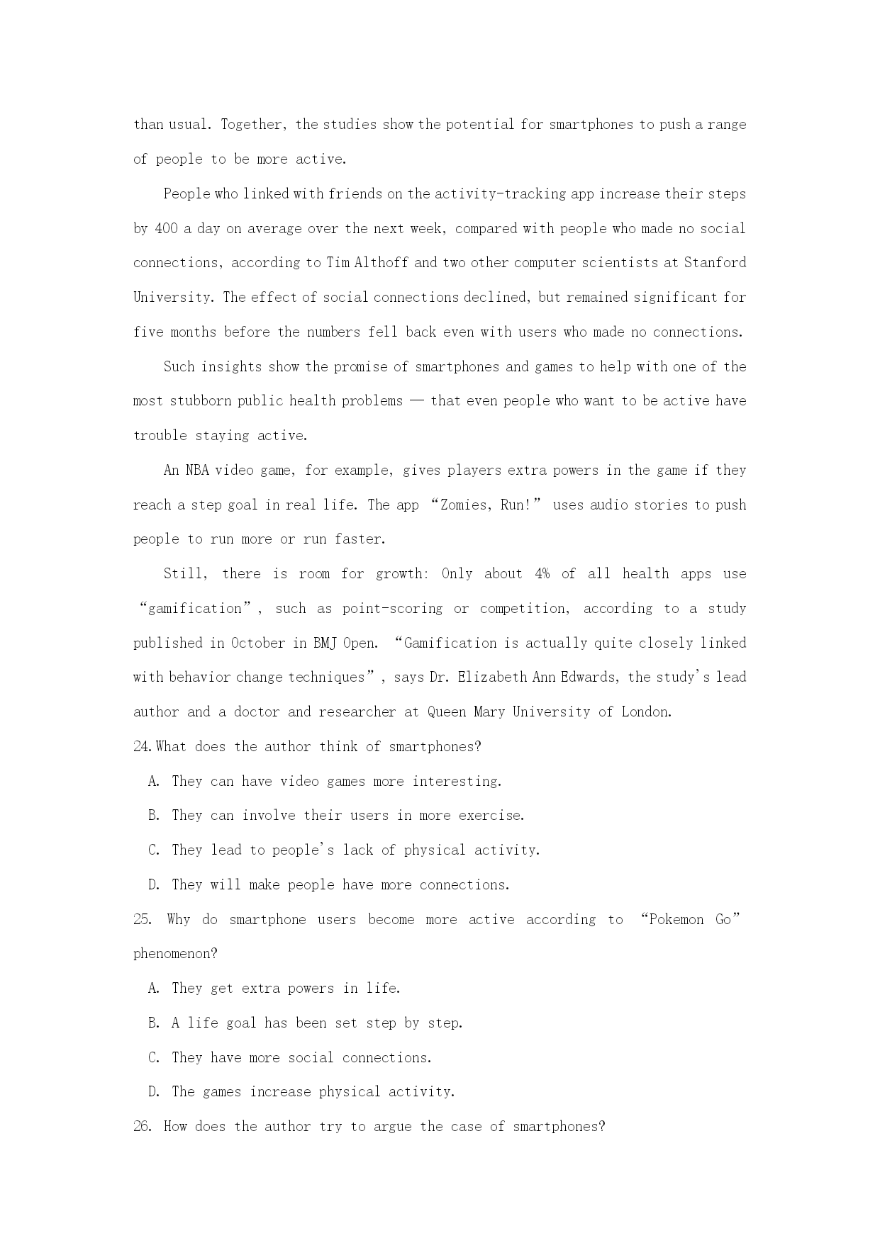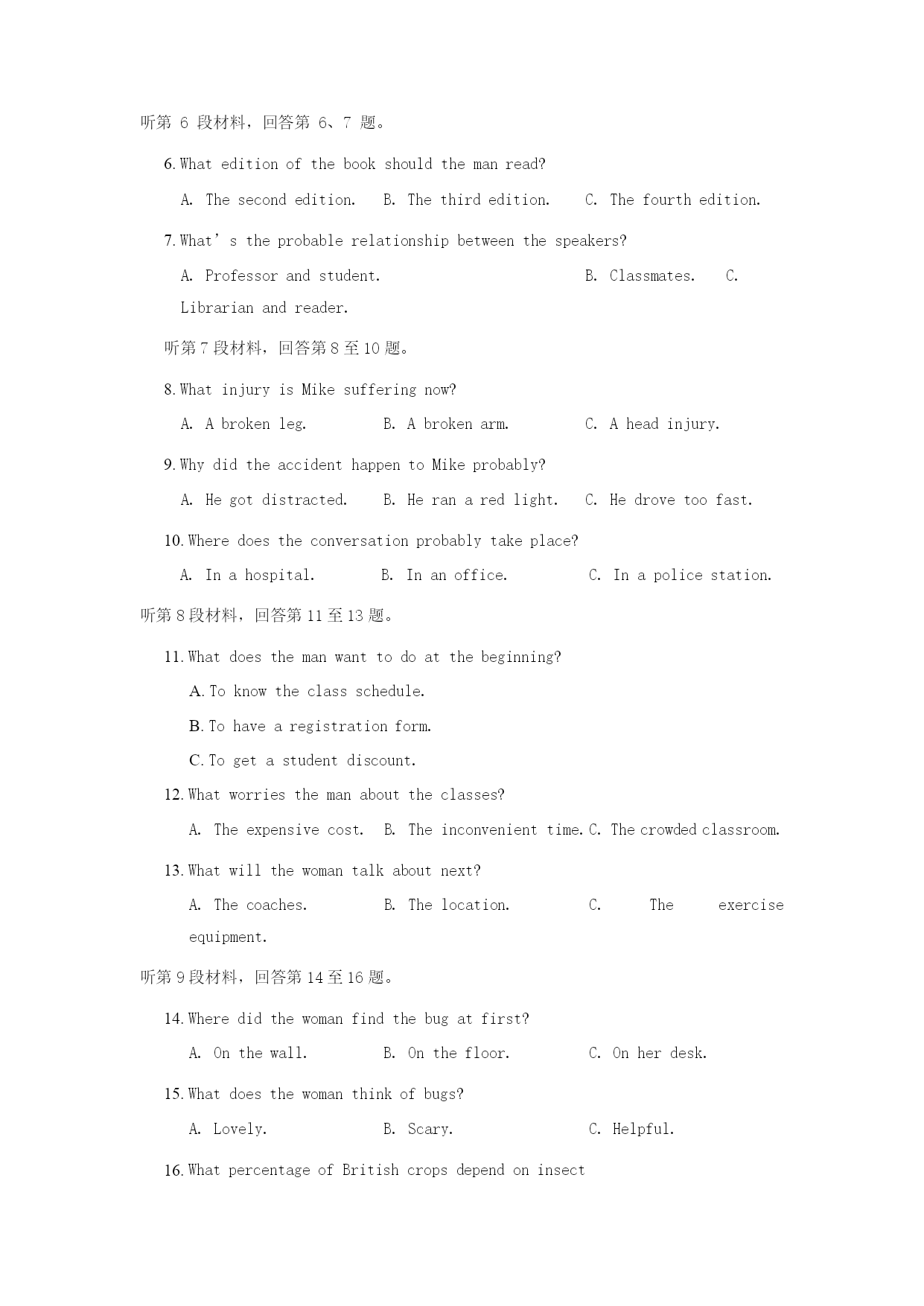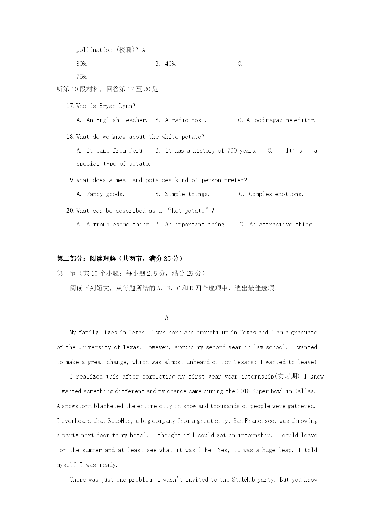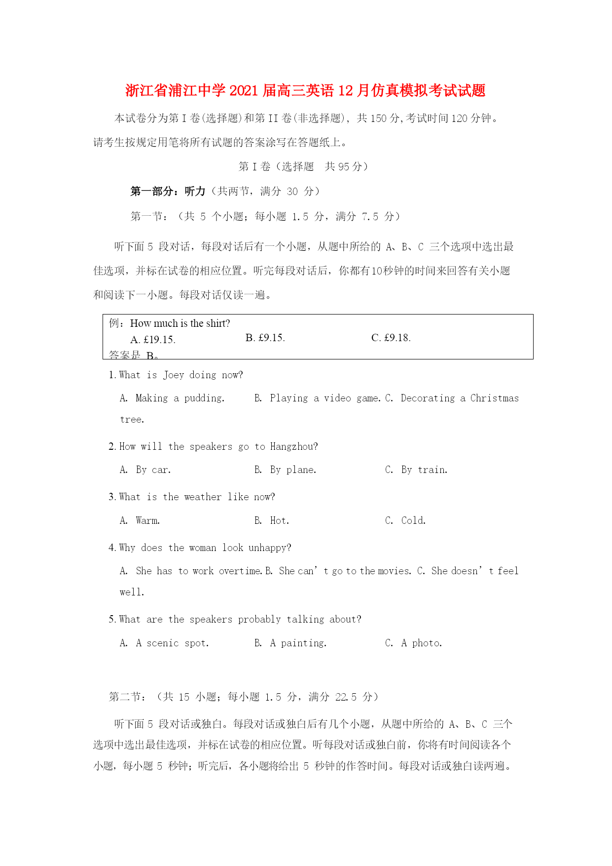 浙江省浦江中学2021届高三英语12月仿真模拟考试试题 本试卷分为第I卷(选择题)和第II卷(非选择题),共150分,考试时间120分钟。 请考生按规定用笔将所有试题的答案涂写在答题纸上。 第I卷(选择题共95分) 第一部分:听力(共两节,满分30分) 第一节:(共5个小题;每小题1.5分,满分7.5分) 听下面5段对话,每段对话后有一个小题,从题中所给的A、B、C三个选项中选出最佳选项,并标在试卷的相应位置。听完每段对话后,你都有10秒钟的时间来回答有关小题和阅读下一小题。每段对话仅读一遍。 C.£9.18. B.£9.15. 例:Howmuchistheshirt? A.£19.15. 答案是B。 WhatisJoeydoingnow? A.Makingapudding. B.Playingavideogame. C.DecoratingaChristmastree. HowwillthespeakersgotoHangzhou? A.Bycar. B.Byplane. C.Bytrain. Whatistheweatherlikenow? A.Warm. B.Hot. C.Cold. Whydoesthewomanlookunhappy? A.Shehastoworkovertime. B.Shecan’tgotothemovies.C.Shedoesn’tfeelwell. Whatarethespeakersprobablytalkingabout? A.Ascenicspot. B.Apainting. C.Aphoto. 第二节:(共15小题;每小题1.5分,满分22.5分) 听下面5段对话或独白。每段对话或独白后有几个小题,从题中所给的A、B、C三个选项中选出最佳选项,并标在试卷的相应位置。听每段对话或独白前,你将有时间阅读各个小题,每小题5秒钟;听完后,各小题将给出5秒钟的作答时间。每段对话或独白读两遍。 听第6段材料,回答第6、7题。 Whateditionofthebookshouldthemanread? A.Thesecondedition. B.Thethirdedition. C.Thefourthedition. What’stheprobablerelationshipbetweenthespeakers? A.Professorandstudent. B.Classmates. C.Librarianandreader. 听第7段材料,回答第8至10题。 WhatinjuryisMikesufferingnow? A.Abrokenleg. B.Abrokenarm. C.Aheadinjury. WhydidtheaccidenthappentoMikeprobably? A.Hegotdistracted. B.Heranaredlight. C.Hedrovetoofast. Wheredoestheconversationprobablytakeplace? A.Inahospital. B.Inanoffice. C.Inapolicestation. 听第8段材料,回答第11至13题。 Whatdoesthemanwanttodoatthebeginning? Toknowtheclassschedule. Tohavearegistrationform. Togetastudentdiscount. Whatworriesthemanabouttheclasses? A.Theexpensivecost. B.Theinconvenienttime. C.Thecrowdedclassroom. Whatwillthewomantalkaboutnext? A.Thecoaches. B.Thelocation. C.Theexerciseequipment. 听第9段材料,回答第14至16题。 Wheredidthewomanfindthebugatfirst? A.Onthewall. B.Onthefloor. C.Onherdesk. Whatdoesthewomanthinkofbugs? A.Lovely. B.Scary. C.Helpful. WhatpercentageofBritishcropsdependoninsectpollination(授粉)?A. 30%. B.40%. C.75%. 听第10段材料,回答第17至20题。 WhoisBryanLynn? A.AnEnglishteacher. B.Aradiohost. C.Afoodmagazineeditor. Whatdoweknowaboutthewhitepotato? A.Itca