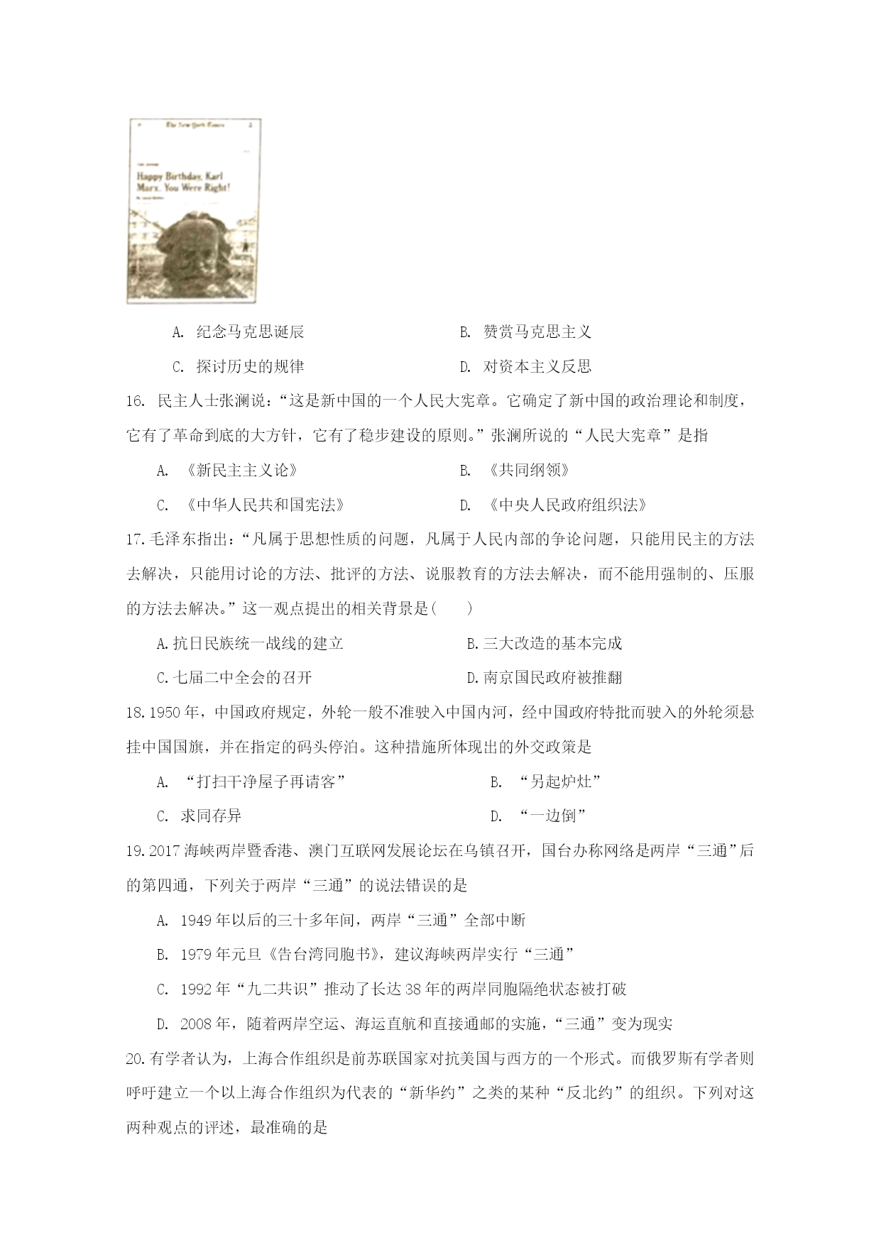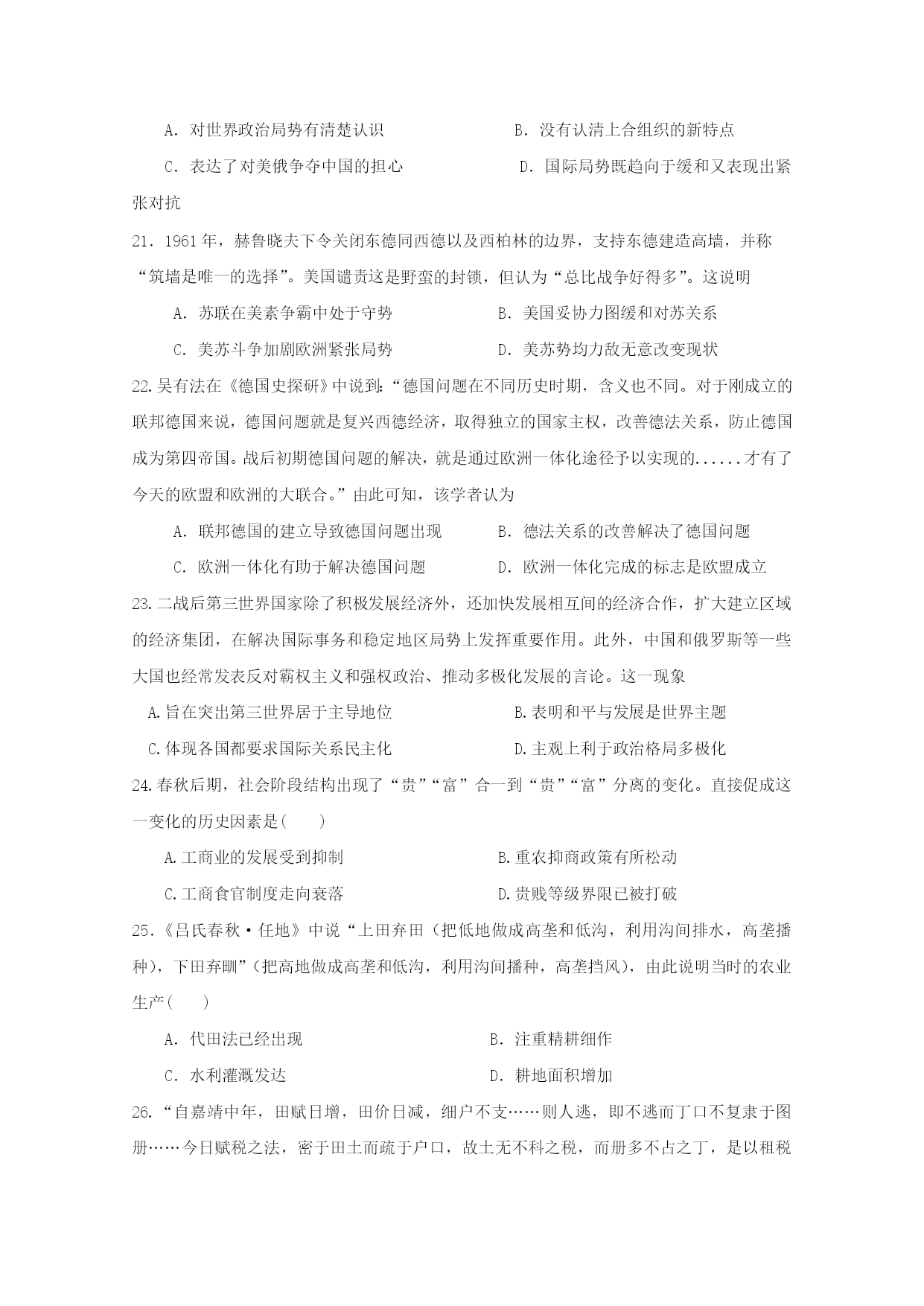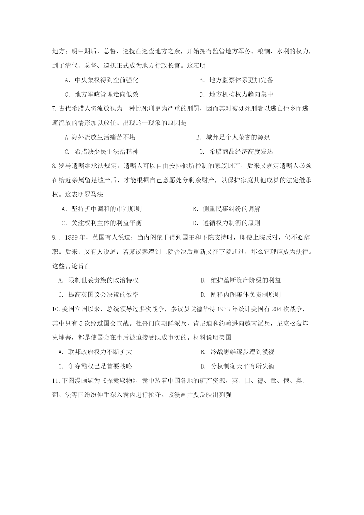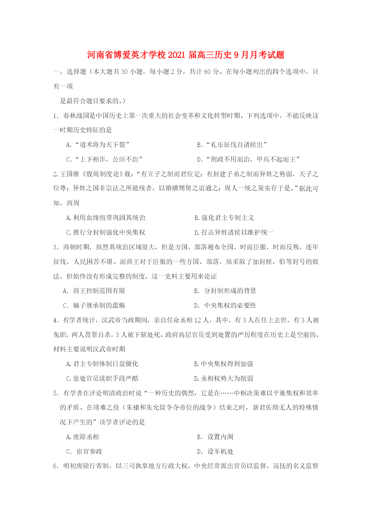 河南省博爱英才学校2021届高三历史9月月考试题 一、选择题(本大题共30小题,每小题2分,共计60分。在每小题列出的四个选项中,只有一项 是最符合题目要求的。) 1.春秋战国是中国历史上第一次重大的社会变革和文化转型时期。下列选项中,不能反映这一时期历史特征的是 A.“道术将为天下裂”B.“礼乐征伐自诸侯出” C.“上下相诈,公田不治”D.“刑政不用而治,甲兵不起而王” 2.王国维《殷周制度论》载:“有立子之制而君位定;有封建子弟之制而异姓之势弱,天子之位尊;异姓之国非宗法之所能统者,以婚媾甥舅之谊通之;周人一统之策实存于是。”据此可知,西周 A.利用血缘纽带巩固其统治B.强化君主专制主义 C.推行分封制强化中央集权D.打击异姓诸侯以维护统一 3.商朝时期,虽然其统治区域很大,但是方国、部落遍布全国,时而臣服,时而反叛,连年征伐,人民困苦不堪。而商王对于臣服的一些方国、部落,虽采取了加封候、伯等封号的做法,但始终没有形成完整的制度。这一史料主要用来论证 A.商王控制范围有限B.分封制形成的背景 C.嫡子继承制的滥觞D.中央集权的必要性 4.有学者统计,汉武帝当政期间,亲自任命丞相12人,其中,有3人在任上去世,有3人被免职,两人畏罪自杀,3人被下狱处死。政府高层官员受到处置的严厉程度在历史上是空前的。材料主要说明汉武帝时期 A.君主专制体制日益僵化B.中央集权得到加强 C.惩处官员渎职手段严酷D.丞相权势大为削弱 5.有学者在评论明清政治时说“一种历史的偶然,它是在……中枢决策难以平衡集权和效率的矛盾,在靖难之役(朱棣和朱允炆争夺帝位的战争)结束之时,新君佐助无人的特殊情况下产生的”该学者评论的是 A.废除丞相B.设置内阁 C.宦官参政D.设军机处 6.明初废除行省制,以三司执掌地方行政大权,中央经常派出官员以监督、巡抚的名义监察地方;明中期后,总督、巡抚在巡查地方之余,开始拥有监管地方军务、粮饷、水利的权力,到了清代,总督、巡抚正式成为地方行政长官。这表明 A.中央集权得到空前强化B.地方监察体系更加完备 C.地方军政管理走向低效D.地方机构权力趋向集中 7.古代希腊人将流放视为一种比死刑更为严重的刑罚,因而其对被处死刑者以逃亡他乡而逃避流放的情形加以放任。出现这一现象的原因是 A海外流放生活痛苦不堪B.城邦是个人荣誉的源泉 C.希腊缺少民主法治精神D.希腊商品经济高度发达 8.罗马遗嘱继承法规定,遗嘱人可以自由安排他所控制的家族财产,后来又规定遗嘱人必须在给近亲属留足遗产后,才能根据自己意愿处分剩余财产,以保护家庭其他成员的法定继承权。这表明罗马法 A.坚持折中调和的审判原则B.侧重民事纠纷的调解 C.关注权利主体的利益平衡D.遵循权力制衡的原则 9..1839年,英国有人说道:当内阁依旧得到国王和下院支持时,即使上院反对,仍不必辞职。后来,又有人说道:若某议案遭到上院否决后重新又在下院通过,那么它理应成为法律。这些言论旨在 A.限制世袭贵族的政治特权 B.维护垄断资产阶级的利益 C.提高英国议会决策的效率 D.阐释内阁集体负责制原则 10.美国立国以来,总统领导过多次战争,参议员戈德华特1973年统计美国有204次战争,其中只有5次经过国会宣战。杜鲁门向朝鲜派兵,肯尼迪和约翰逊向越南派兵,尼克松轰炸柬埔寨,都是使国会在事后被迫接受既成事实的。材料说明美国 A.联邦政府权力不断扩大 B.冷战思维逐步遭到漠视 C.争夺霸权已是首要战略 D.分权制衡天平有所失衡 11.下图漫画题为《探囊取物》,囊中装着中国各地的矿产资源,英、日、德、意、俄、奥、葡、法等国纷纷伸手探入囊内进行抢夺。该漫画主要反映出列强 A.在华划分势力范围B.加紧对华资本输出 C.加强对清政府控制D.在中国抢占租借地 12.孙中山以总统名义颁布的禁烟令说:“鸦片流毒中国垂及百年,须知保国存家,匹夫有责,束修自好,百姓与能,其有饮鸩自安,沉湎忘返者,不可为共和之民,当咨行参议院于立法时,剥夺其选举、被选举一切公权,示不与齐民耻。”对此解读不正确的是 A.此项禁烟令可能颁布于1912年5月B.将禁烟于个人政治权利相结合 C.孙中山认为鸦片流毒关系种族存亡D.辛亥革命深刻影响了习俗变革 13.从武昌起义至民国二年底,“集会结社犹如疯狂,而政党之名如春草怒生,为数几至近百”。据统计,当时全国公开成立的团体达682个,其中政治党团者312个。这种现象说明,该时期 A.政党政治在中国的确立B.民主共和观念深入人心 C.民主政治成为时代潮流D.专制主义已被彻底根除 14.1945年10月,毛泽东在《关于重庆谈判》文中指出:“太行山、太岳山、中条山的中间,有个脚盆,就是上党区。在那个脚盆里,有鱼有肉,阎锡山派了十三个师去抢。我们的方针也是老早定了的,就是针锋相对,寸土必争