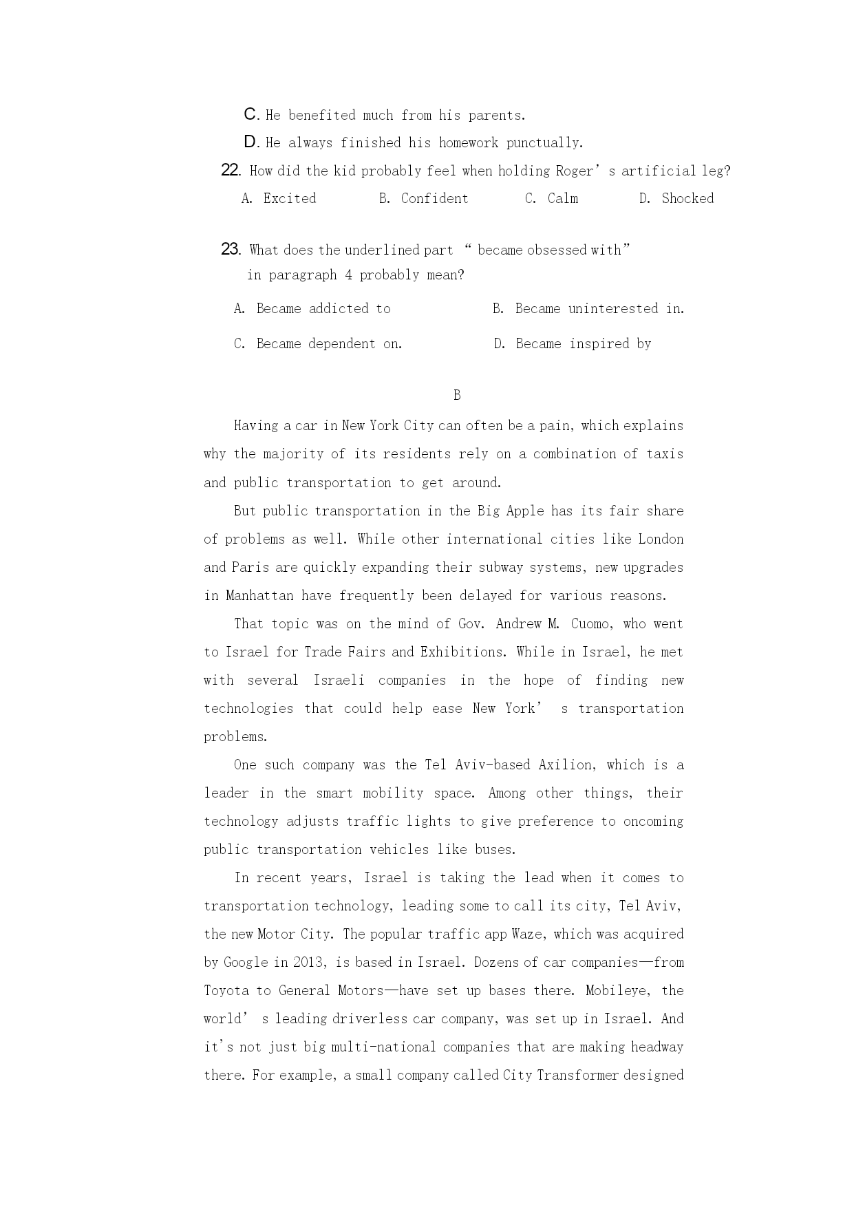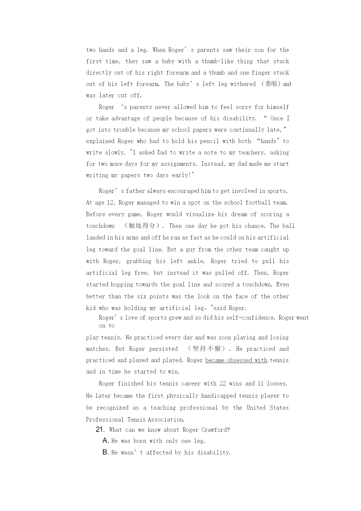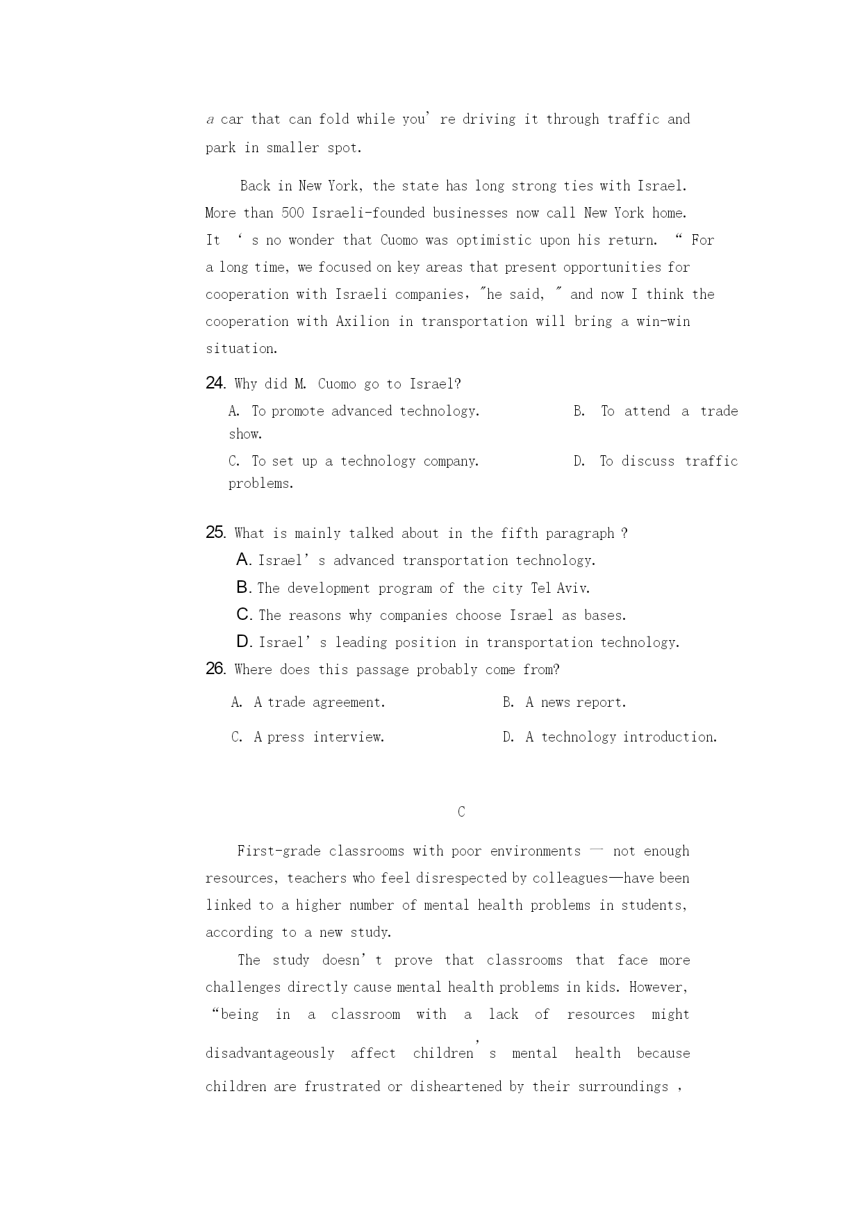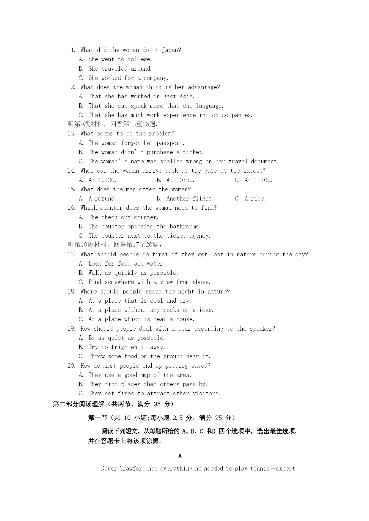 湖北省孝感市汉川市第一高级中学2019-2020学年高二英语摸底测试试题 (满分150分,考试用时120分钟) 第一节 听下面5段对话。每段对话后有一个小题,从题中所给的A、B、C三个选项中选出最佳选项。听完每段对话后,你都有10秒钟的时间来回答有关小题和阅读下一小题。每段对话仅读一遍。 1.Whatisthemanconcernedabout? A.Histrip. B.Hisfamily. C.Hispronunciation. 2.Whatistheprobablerelationshipbetweenthespeakers? A.Co-workers. B.Brotherandsister. C.Professorandstudent. 3.Howdoesthewomanfeelnow? A.Relaxed. B.Excited. C.Exhausted. 4.Whatarethespeakersprobablydoing? A.Flyingakite. B.Takingaplane. C.Trainingforthearmy. 5.Howmuchisneededtopayoffthebills? A.$200. B.$2000. C.$20,000. 第二节 听下面5段对话或独白。每段对话或独白后有几个小题,从题中所给的A、B、C三个选项中选出最佳选项。听每段对话或独白前,你将有时间阅读各个小题,每小题5秒钟;听完后,各小题将给出5秒钟的作答时间。每段对话或独白读两遍。 听第6段材料,回答第6、7题。 6.WhatarethespeakerslikelytobeeatingonSaturday? A.Hotpot. B.Noodles. C.Dumplings. 7.Whydoesthewomanwanttogoout? A.Shewonsomemoney. B.Shehopestoshowhernewdress. C.Shewantstocelebrateherbirthday. 听第7段材料,回答第8、9题。 8.Wheredoestheconversationprobablytakeplace? A.Athome. B.Inalibrary. C.Atastore. 9.Whatdoesthemansuggestthewomando? A.Gotothehospitaltocheckhereyes. B.Getanewphone. C.Changethebackgroundofherphone. 听第8段材料,回答第10至12题。 10.Whatistheconversationmainlyabout? A.Ajobposition. B.Aworkproject. C.Culturaldifferences. 11.WhatdidthewomandoinJapan? A.Shewenttocollege. B.Shetraveledaround. C.Sheworkedforacompany. 12.Whatdoesthewomanthinkisheradvantage? A.ThatshehasworkedinEastAsia. B.Thatshecanspeakmorethanonelanguage. C.Thatshehasmuchworkexperienceintopcompanies. 听第9段材料,回答第13至16题。 13.Whatseemstobetheproblem? A.Thewomanforgotherpassport. B.Thewomandidn’tpurchaseaticket. C.Thewoman’snamewasspelledwrongonhertraveldocument. 14.Whencanthewomanarrivebackatthegateatthelatest? A.At10:30. B.At10:50. C.At11:00. 15.Whatdoesthemanofferthewoman? A.Arefund. B.Anotherflight. C.Aride. 16.Whichcounterdoesthewomanneedtofind? A.Thecheck-outcounter. B.Thecounteroppositethebathrooms. C.Thecounternexttotheticketagency. 听第10段材料,回答第17至20题。 17.Whatshouldpeopledofirstiftheygetlostinnatureduringtheday? A.Lookforfoodandwater. B.Walkasquicklyasposs