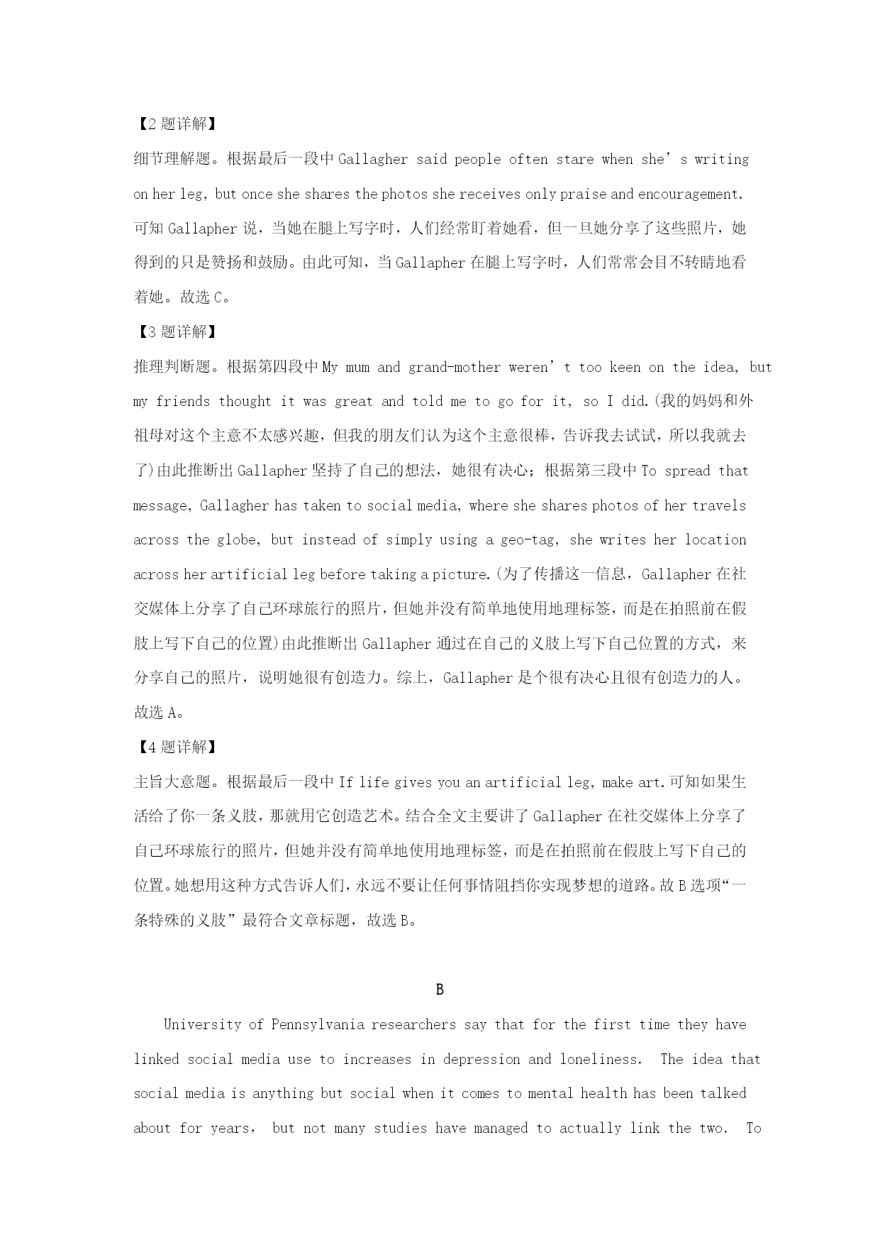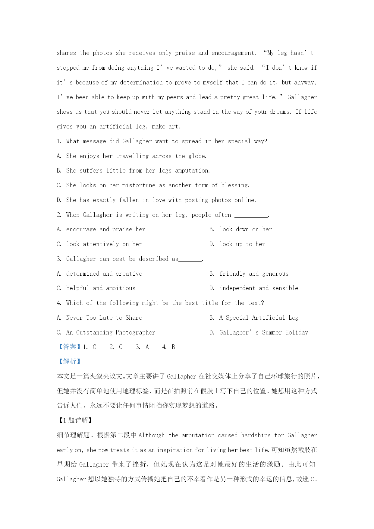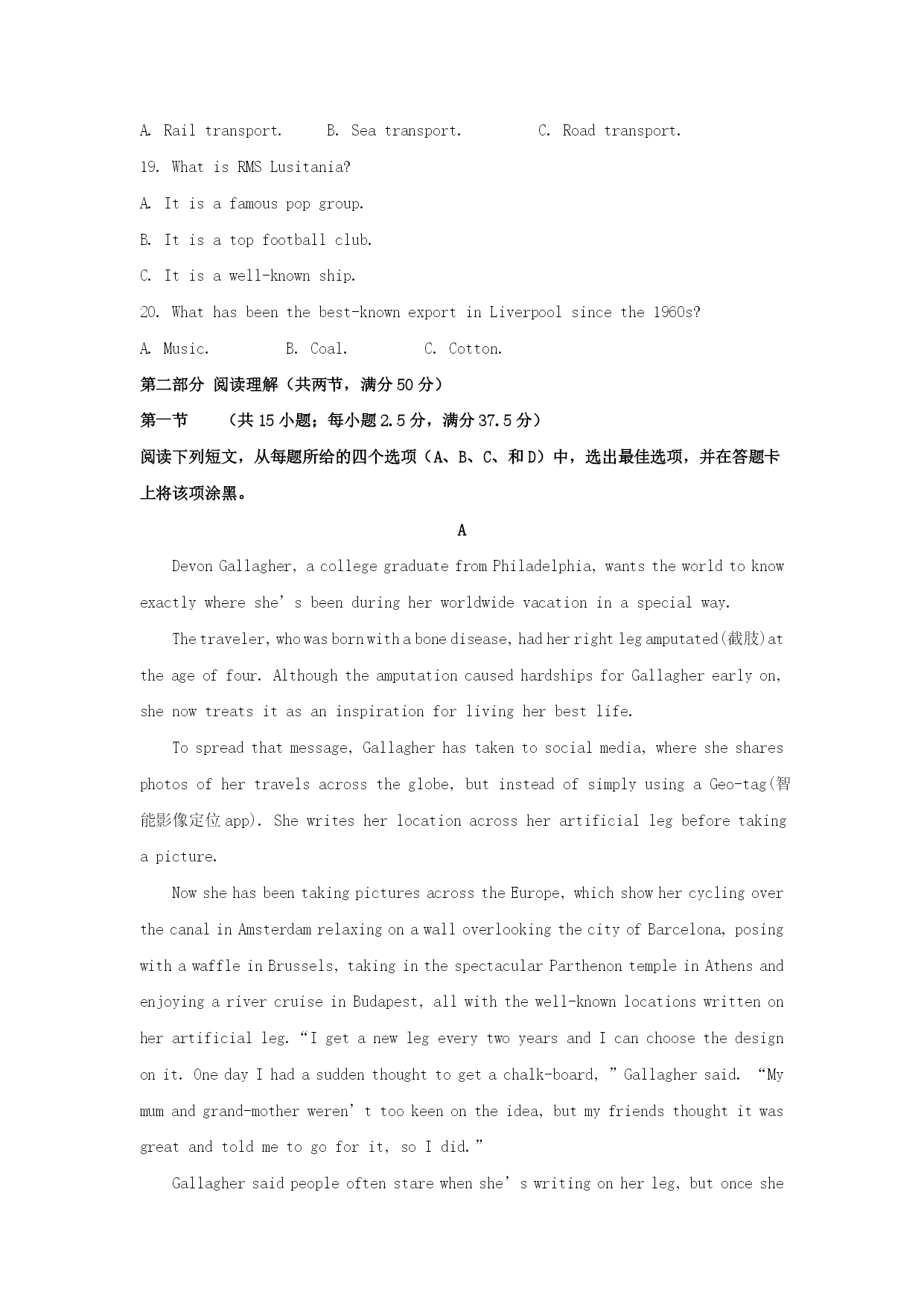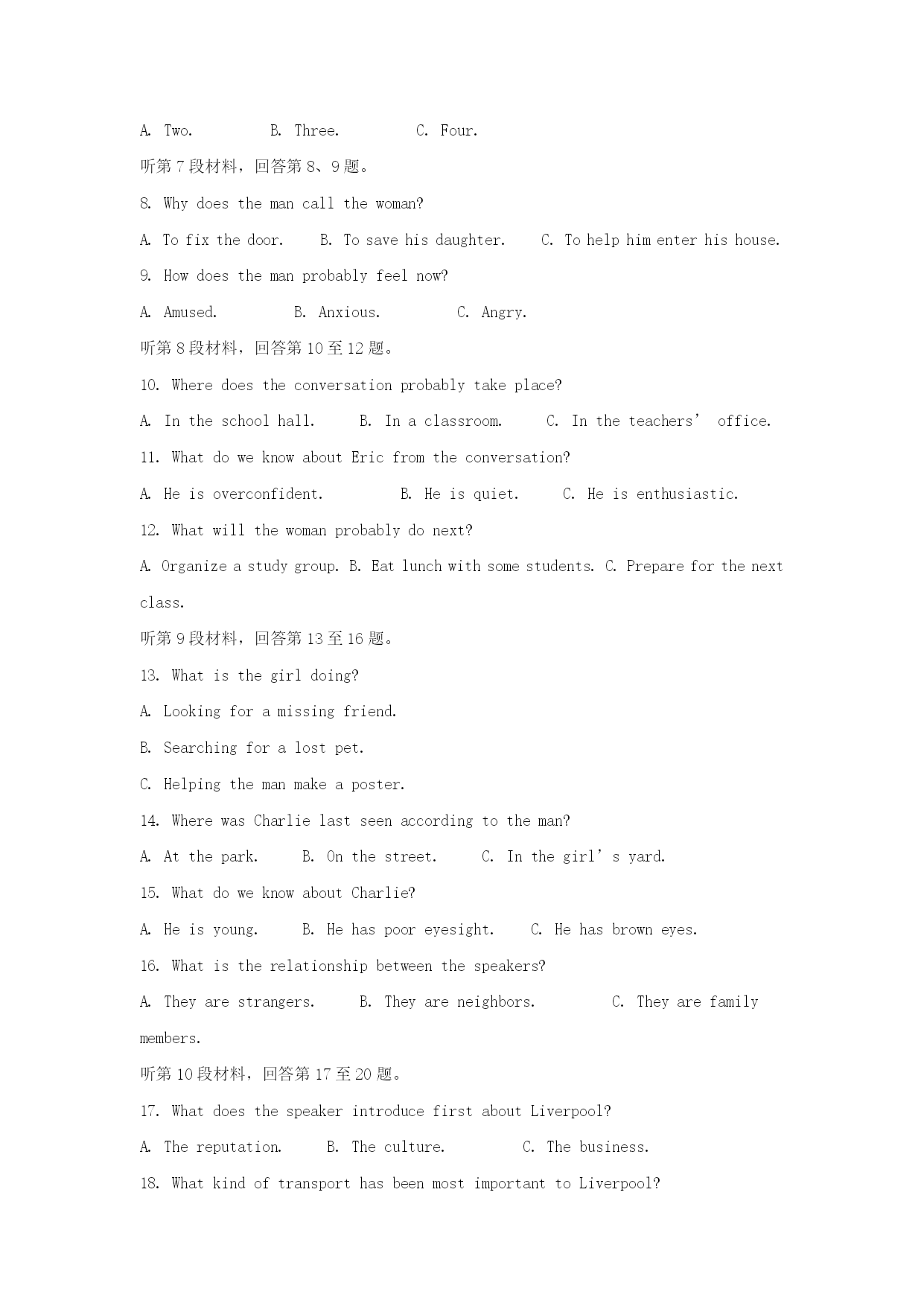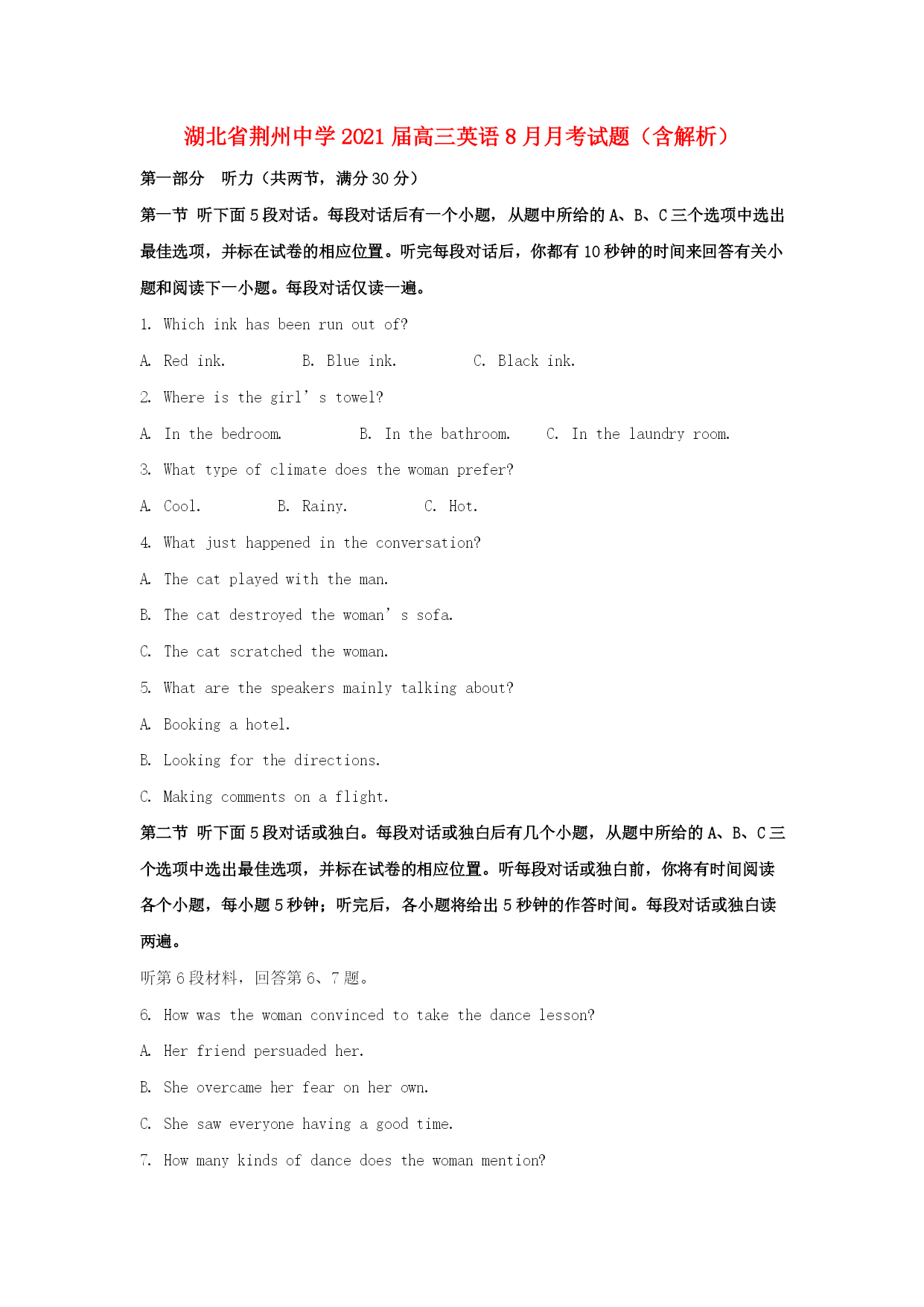 湖北省荆州中学2021届高三英语8月月考试题(含解析) 第一部分听力(共两节,满分30分) 第一节听下面5段对话。每段对话后有一个小题,从题中所给的A、B、C三个选项中选出最佳选项,并标在试卷的相应位置。听完每段对话后,你都有10秒钟的时间来回答有关小题和阅读下一小题。每段对话仅读一遍。 1.Whichinkhasbeenrunoutof? A.Redink.B.Blueink.C.Blackink. 2.Whereisthegirl’stowel? A.Inthebedroom.B.Inthebathroom.C.Inthelaundryroom. 3.Whattypeofclimatedoesthewomanprefer? A.Cool.B.Rainy.C.Hot. 4.Whatjusthappenedintheconversation? A.Thecatplayedwiththeman. B.Thecatdestroyedthewoman’ssofa. C.Thecatscratchedthewoman. 5.Whatarethespeakersmainlytalkingabout? A.Bookingahotel. B.Lookingforthedirections. C.Makingcommentsonaflight. 第二节听下面5段对话或独白。每段对话或独白后有几个小题,从题中所给的A、B、C三个选项中选出最佳选项,并标在试卷的相应位置。听每段对话或独白前,你将有时间阅读各个小题,每小题5秒钟;听完后,各小题将给出5秒钟的作答时间。每段对话或独白读两遍。 听第6段材料,回答第6、7题。 6.Howwasthewomanconvincedtotakethedancelesson? A.Herfriendpersuadedher. B.Sheovercameherfearonherown. C.Shesaweveryonehavingagoodtime. 7.Howmanykindsofdancedoesthewomanmention? A.Two.B.Three.C.Four. 听第7段材料,回答第8、9题。 8.Whydoesthemancallthewoman? A.Tofixthedoor.B.Tosavehisdaughter.C.Tohelphimenterhishouse. 9.Howdoesthemanprobablyfeelnow? A.Amused.B.Anxious.C.Angry. 听第8段材料,回答第10至12题。 10.Wheredoestheconversationprobablytakeplace? A.Intheschoolhall.B.Inaclassroom.C.Intheteachers’office. 11.WhatdoweknowaboutEricfromtheconversation? A.Heisoverconfident.B.Heisquiet.C.Heisenthusiastic. 12.Whatwillthewomanprobablydonext? A.Organizeastudygroup.B.Eatlunchwithsomestudents.C.Prepareforthenextclass. 听第9段材料,回答第13至16题。 13.Whatisthegirldoing? A.Lookingforamissingfriend. B.Searchingforalostpet. C.Helpingthemanmakeaposter. 14.WherewasCharlielastseenaccordingtotheman? A.Atthepark.B.Onthestreet.C.Inthegirl’syard. 15.WhatdoweknowaboutCharlie? A.Heisyoung.B.Hehaspooreyesight.C.Hehasbrowneyes. 16.Whatistherelationshipbetweenthespeakers? A.Theyarestrangers.B.Theyareneighbors.C.Theyarefamilymembers. 听第10段材料,回答第17至20题。 17.WhatdoesthespeakerintroducefirstaboutLiverpool? A.Thereputation.B.Theculture.C.Thebusiness. 18.WhatkindoftransporthasbeenmostimportanttoLiverpool? A.Railtransport.B.Seatransport