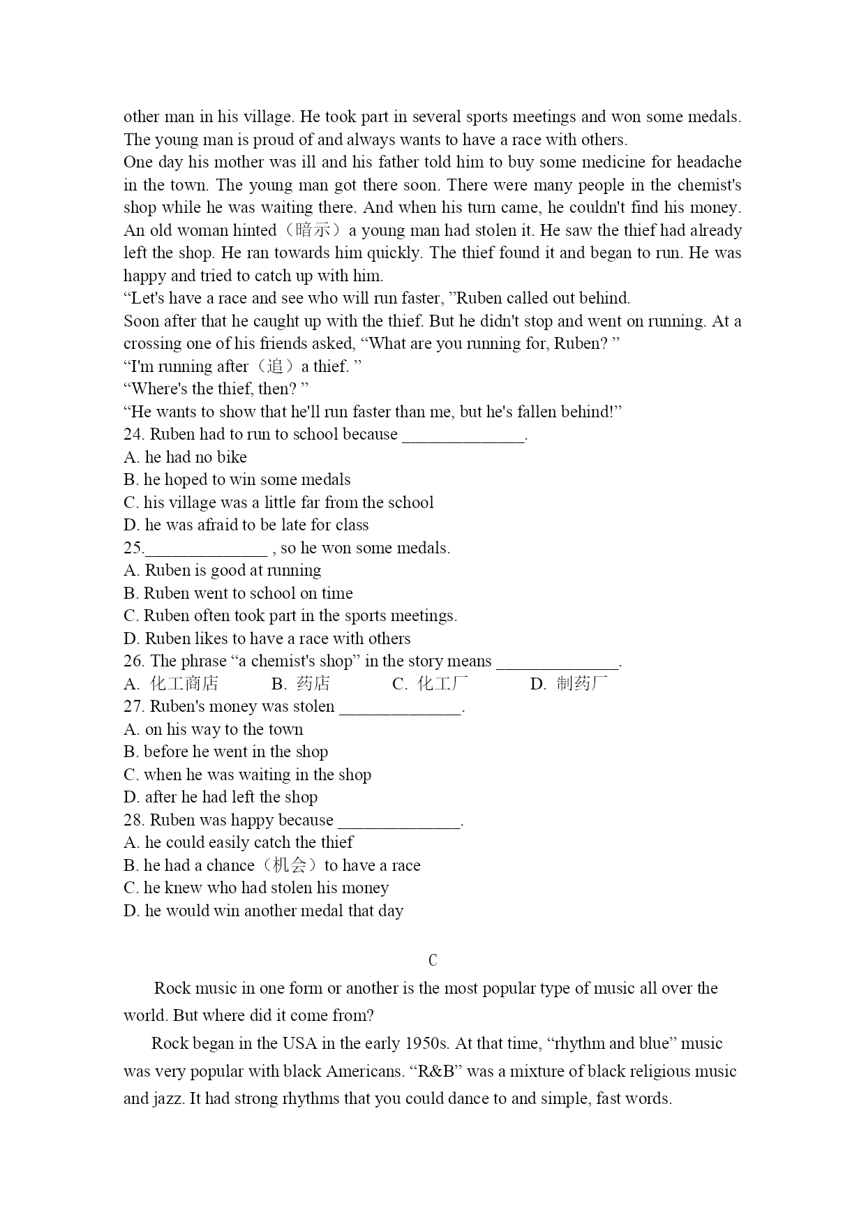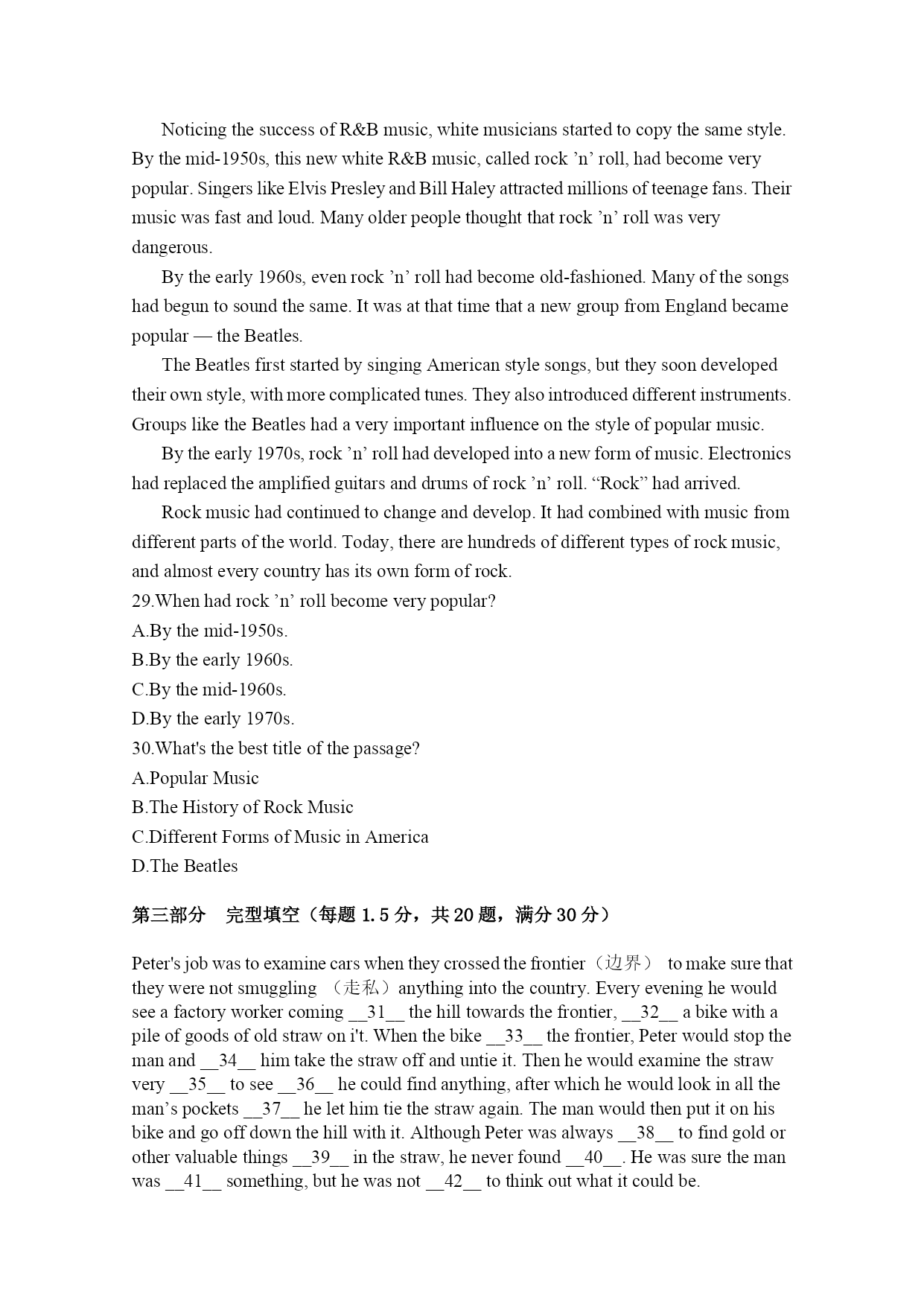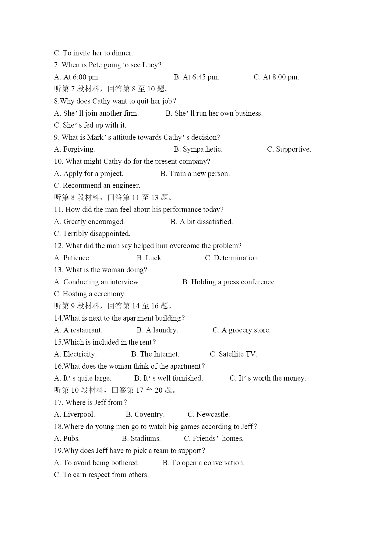 英语试卷 本试卷分第Ⅰ卷(选择题)和第Ⅱ卷(非选择题)两部分,满分120分,考试时间90分钟。考试结束后,将答题卡交回。 第Ⅰ卷(共三部分,70分) 第一部分:听力(共两节,满分20分) 做题时,先将答案标在试卷上。录音内容结束后,你将有两分钟的时间将试卷上的答案转涂到答题卡上。 第一节(共5小题;每小题1分,满分5分) 听下面5段对话。每段对话后有一个小题,从题中所给的A、B、C三个选项中选出最佳选项。听完每段对话后,你都有10秒钟的时间来回答有关小题和阅读下一小题。每段对话仅读一遍。 例:Howmuchistheshirt? A.£19.15. B.£9.18. C.£9.15. 答案是C。 1.Wherearethespeakers? A.Ataswimmingpool. B.Inaclothingshop. C.Ataschoollab. 2.WhatwillTomdonext? A.Turndownthemusic. B.Postponetheshow. C.Stoppracticing. 3.Whatisthewomanbusydoing? A.Workingonapaper.B.Tidyinguptheoffice. C.Organizingaparty. 4.WhenwillHenrystarthisvacation? A.Thisweekend. B.Nextweek. C.AttheendofAugust. 5.WhatdoesDonnaoffertodoforBill? A.Bookaflightforhim. B.Drivehimtotheairport. C.Helphimparkthecar. 第二节(共15小题;每小题1分,满分15分) 听下面5段对话或独白。每段对话或独白后有几个小题,从题中所给的A、B、C三个选项中选出最佳选项。听每段对话或独白前,你将有时间阅读各个小题,每小题5秒钟;听完后,各小题将给出5秒钟的作答时间。每段对话或独白读两遍。 听第6段材料,回答第6、7题。 6.WhydoesPetecallLucy? A.Tosaythathe’llbelate. B.Totellherabouthiswork. C.Toinvitehertodinner. 7.WhenisPetegoingtoseeLucy? A.At6:00pm. B.At6:45pm. C.At8:00pm. 听第7段材料,回答第8至10题。 8.WhydoesCathywanttoquitherjob? A.She’lljoinanotherfirm.B.She’llrunherownbusiness. C.She’sfedupwithit. 9.WhatisMark’sattitudetowardsCathy’sdecision? A.Forgiving. B.Sympathetic. C.Supportive. 10.WhatmightCathydoforthepresentcompany? A.Applyforaproject. B.Trainanewperson. C.Recommendanengineer. 听第8段材料,回答第11至13题。 11.Howdidthemanfeelabouthisperformancetoday? A.Greatlyencouraged.B.Abitdissatisfied. C.Terriblydisappointed. 12.Whatdidthemansayhelpedhimovercometheproblem? A.Patience.B.Luck.C.Determination. 13.Whatisthewomandoing? A.Conductinganinterview.B.Holdingapressconference. C.Hostingaceremony. 听第9段材料,回答第14至16题。 14.Whatisnexttotheapartmentbuilding? A.Arestaurant.B.Alaundry.C.Agrocerystore. 15.Whichisincludedintherent? A.Electricity.B.TheInternet.C.SatelliteTV. 16.Whatdoesthewomanthinkoftheapartment? A.It’squitelarge.B.It’swellfurnished.C.It’sworththemoney. 听第10段材料,回答第17至20题。 17.Wher