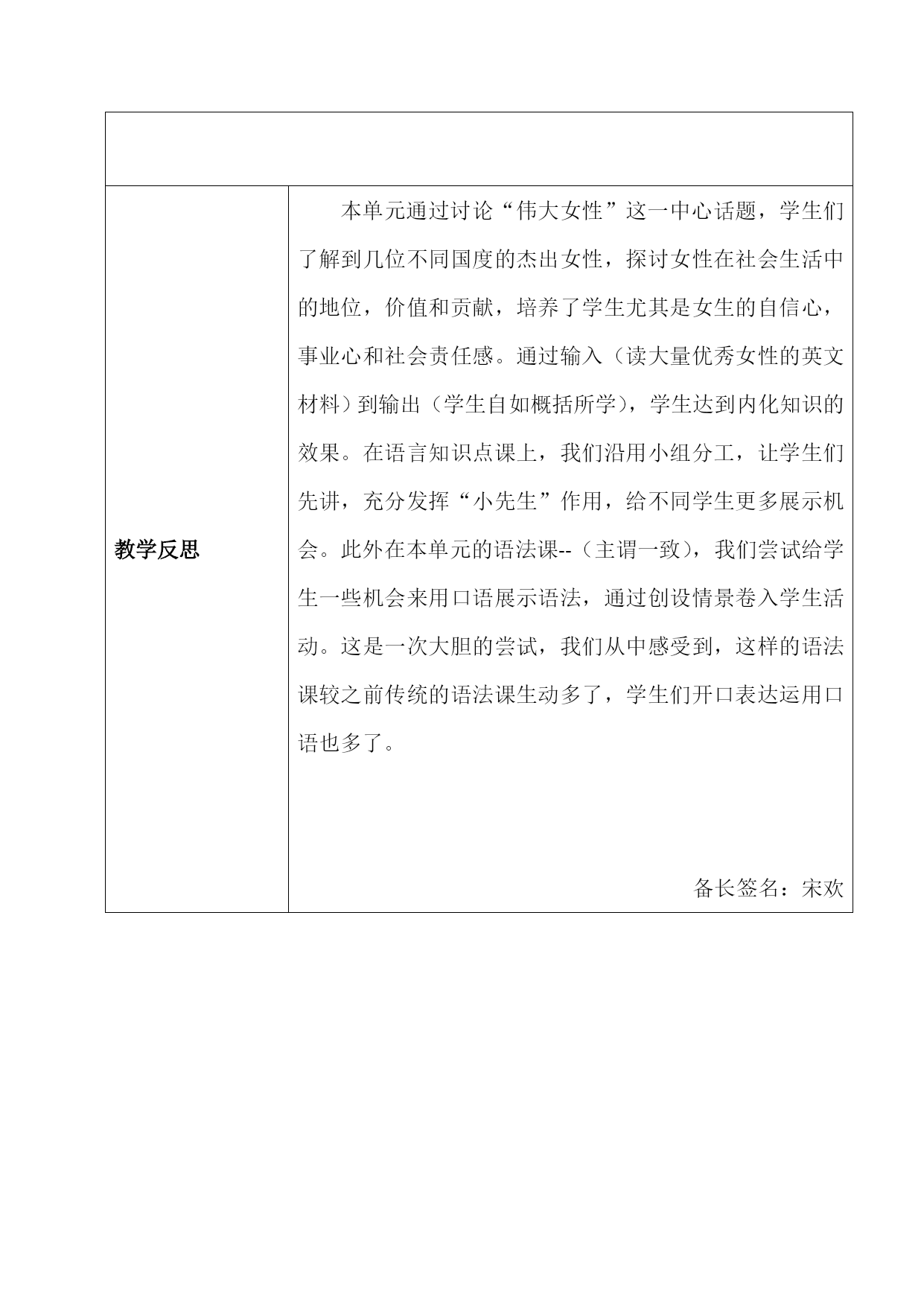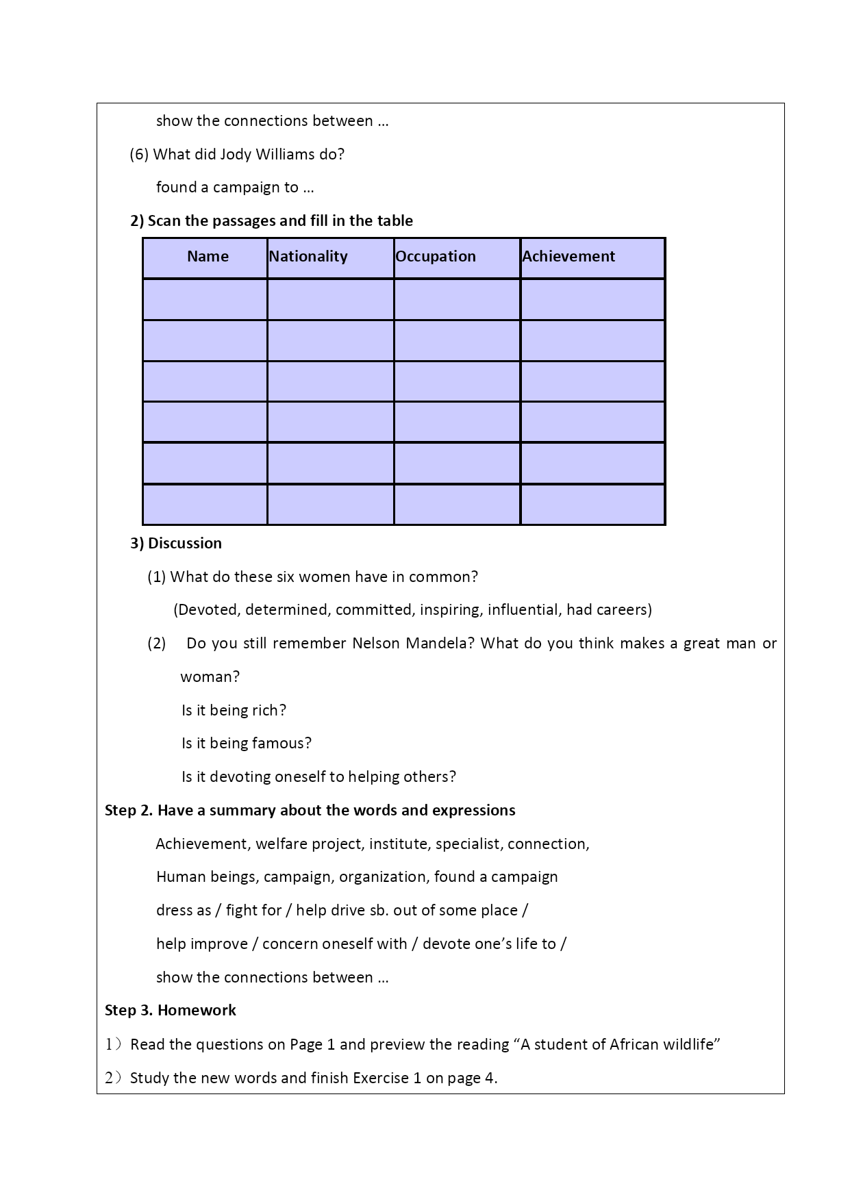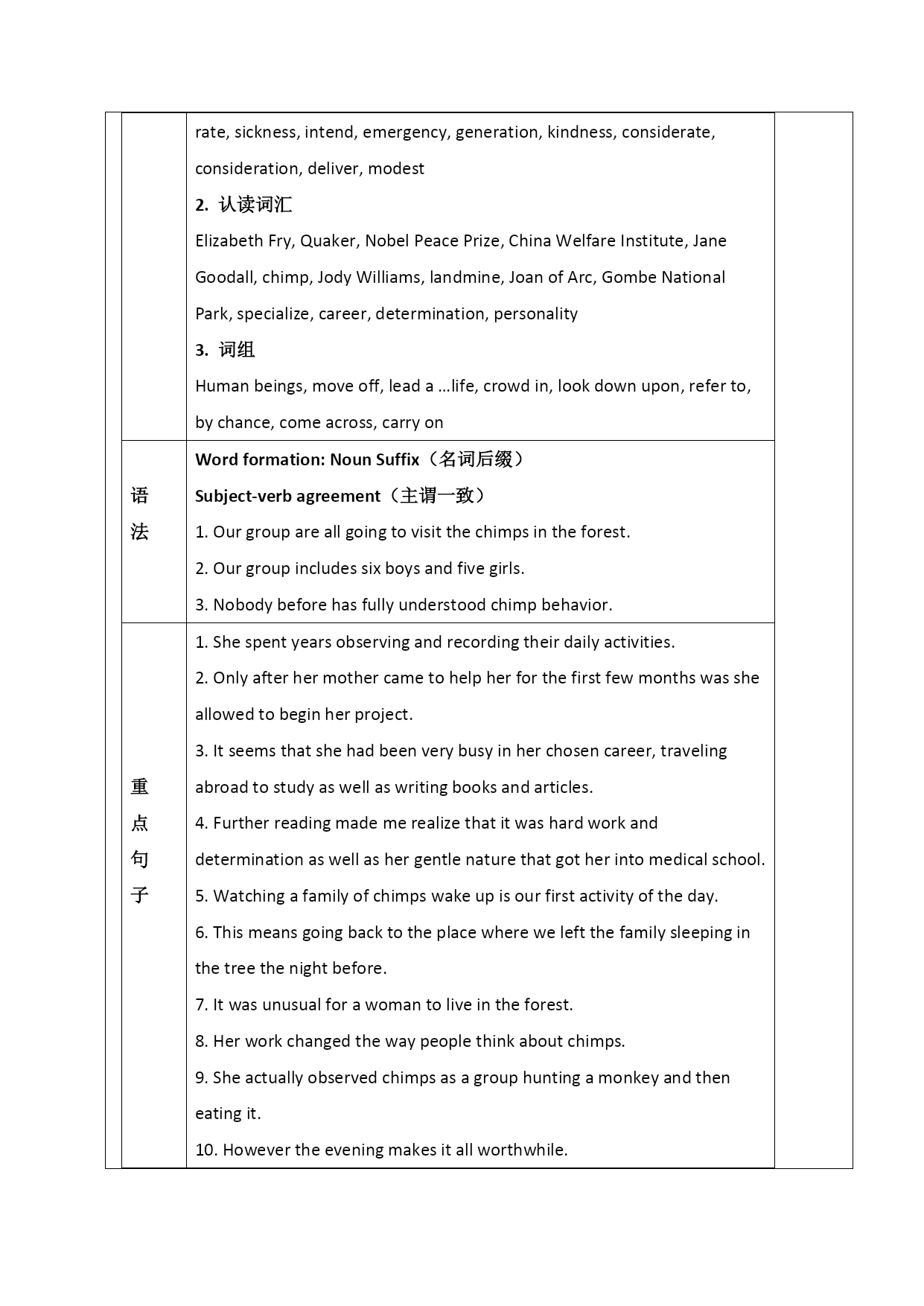 阳东广雅中学第二学期第11周集体备课记录 年级高一科目英语主备教师魏然日期5.12课题Unit1Womenofachievement课时5参与人员宋欢,魏然郑俏姿主备教案(由主备教师填写或另附详案)Unit1Womenofachievement I.单元教学目标 Talkaboutimportantwomen&greatwomen Describepeoplefromtheirlife,personalityandcharacter Word-formation:nounsuffix Subject-verbagreement MakeanoutlineII.目标语言 功 能 句 式Describingpeople Whatdoesshelooklike? Whatdoyouthinkabout...? Whydoyouadmireher? Howwouldyoudescribeher? Whydidshechooseto...? Whatareherstrengths? Whatareherweaknesses? Howdoherfriendsdescribeher? 词 汇1.四会词汇 achievement,welfare,project,institute,specialist,connection,campaign,organization,behave,shade,worthwhile,nest,nod,observe,outspoken,respect,argue,entertainment,crowd,inspire,support,refer,audience,rate,sickness,intend,emergency,generation,kindness,considerate,consideration,deliver,modest 2.认读词汇 ElizabethFry,Quaker,NobelPeacePrize,ChinaWelfareInstitute,JaneGoodall,chimp,JodyWilliams,landmine,JoanofArc,GombeNationalPark,specialize,career,determination,personality 3.词组 Humanbeings,moveoff,leada…life,crowdin,lookdownupon,referto,bychance,comeacross,carryon 语 法Wordformation:NounSuffix(名词后缀) Subject-verbagreement(主谓一致) 1.Ourgroupareallgoingtovisitthechimpsintheforest. 2.Ourgroupincludessixboysandfivegirls. 3.Nobodybeforehasfullyunderstoodchimpbehavior. 重点句子1.Shespentyearsobservingandrecordingtheirdailyactivities. 2.Onlyafterhermothercametohelpherforthefirstfewmonthswassheallowedtobeginherproject. 3.Itseemsthatshehadbeenverybusyinherchosencareer,travelingabroadtostudyaswellaswritingbooksandarticles. 4.Furtherreadingmademerealizethatitwashardworkanddeterminationaswellashergentlenaturethatgotherintomedicalschool. 5.Watchingafamilyofchimpswakeupisourfirstactivityoftheday. 6.Thismeansgoingbacktotheplacewhereweleftthefamilysleepinginthetreethenightbefore. 7.Itwasunusualforawomantoliveintheforest. 8.Herworkchangedthewaypeoplethinkaboutchimps. 9.Sheactuallyobservedchimpsasagrouphuntingamonkeyandtheneatingit. 10.Howevertheeveningmakesitallworthwhile. 11.Wewatchthemotherchimpan