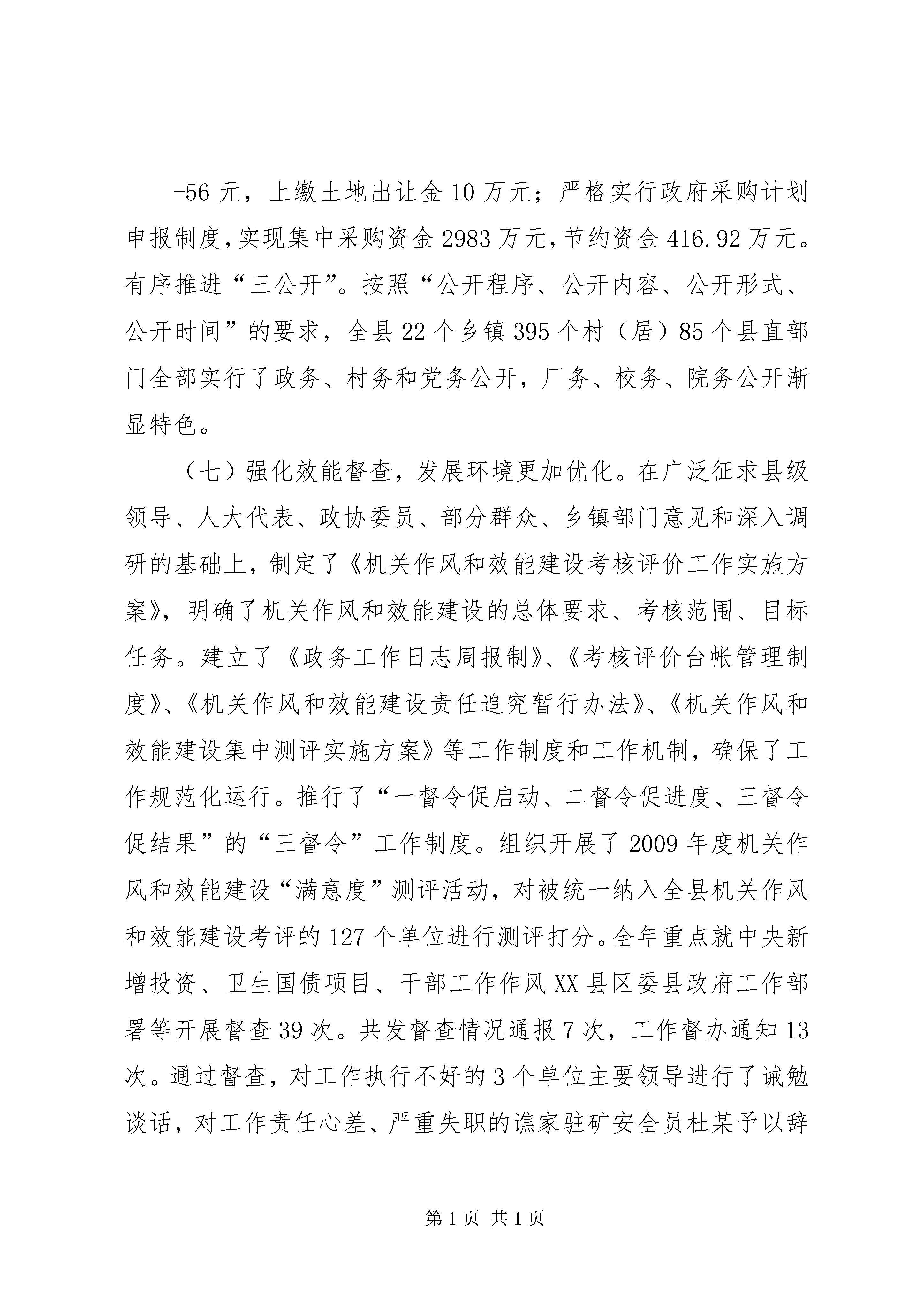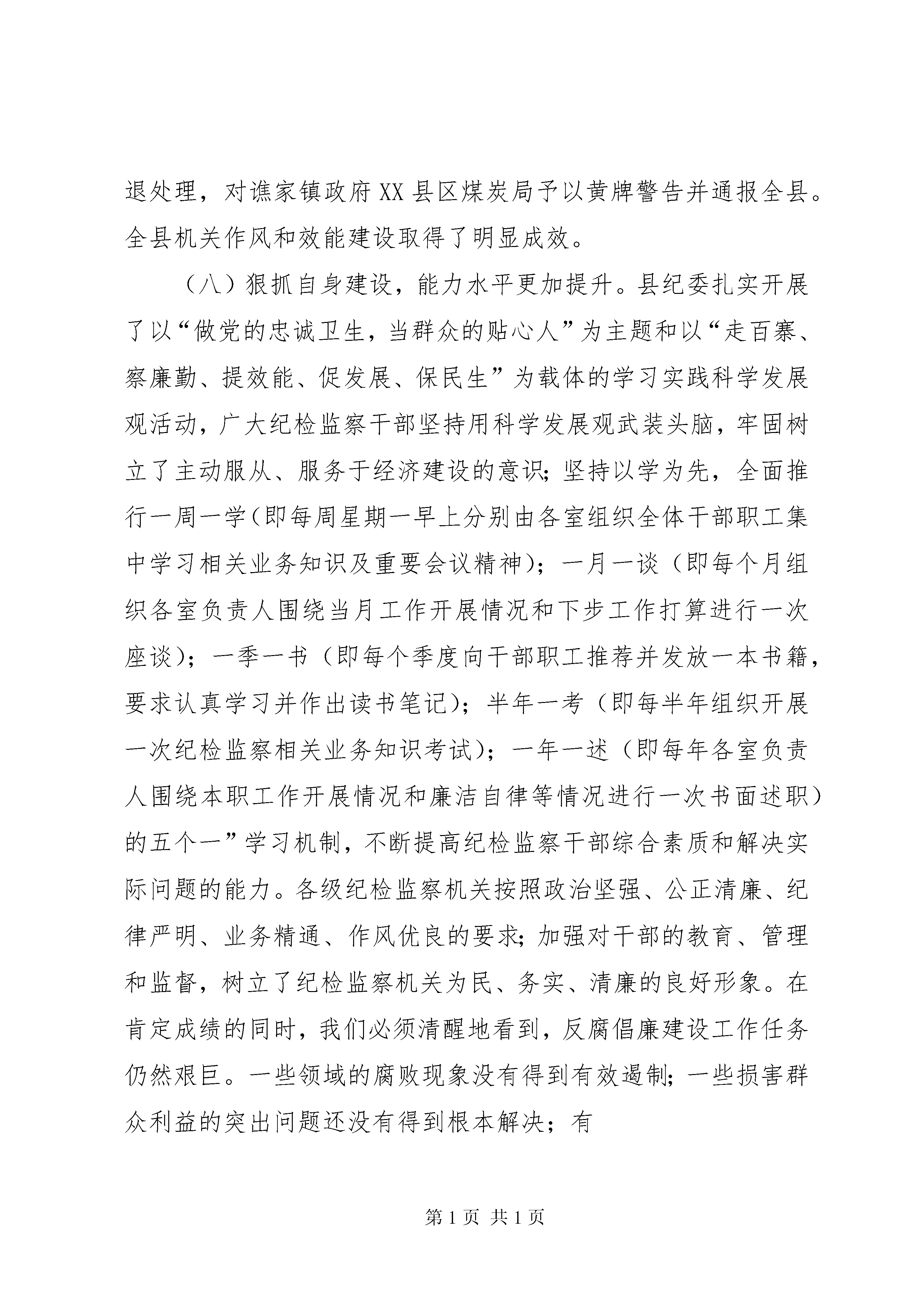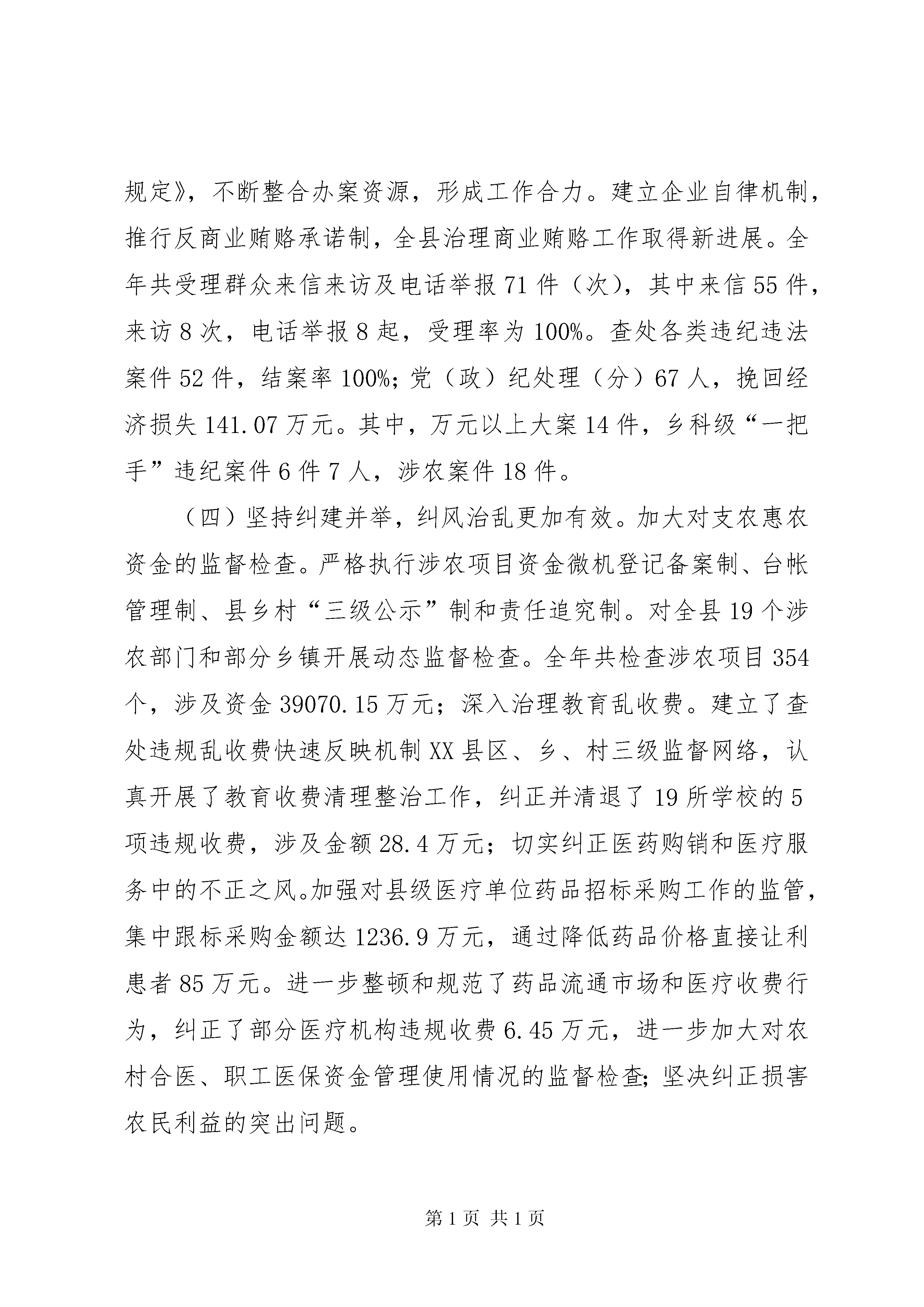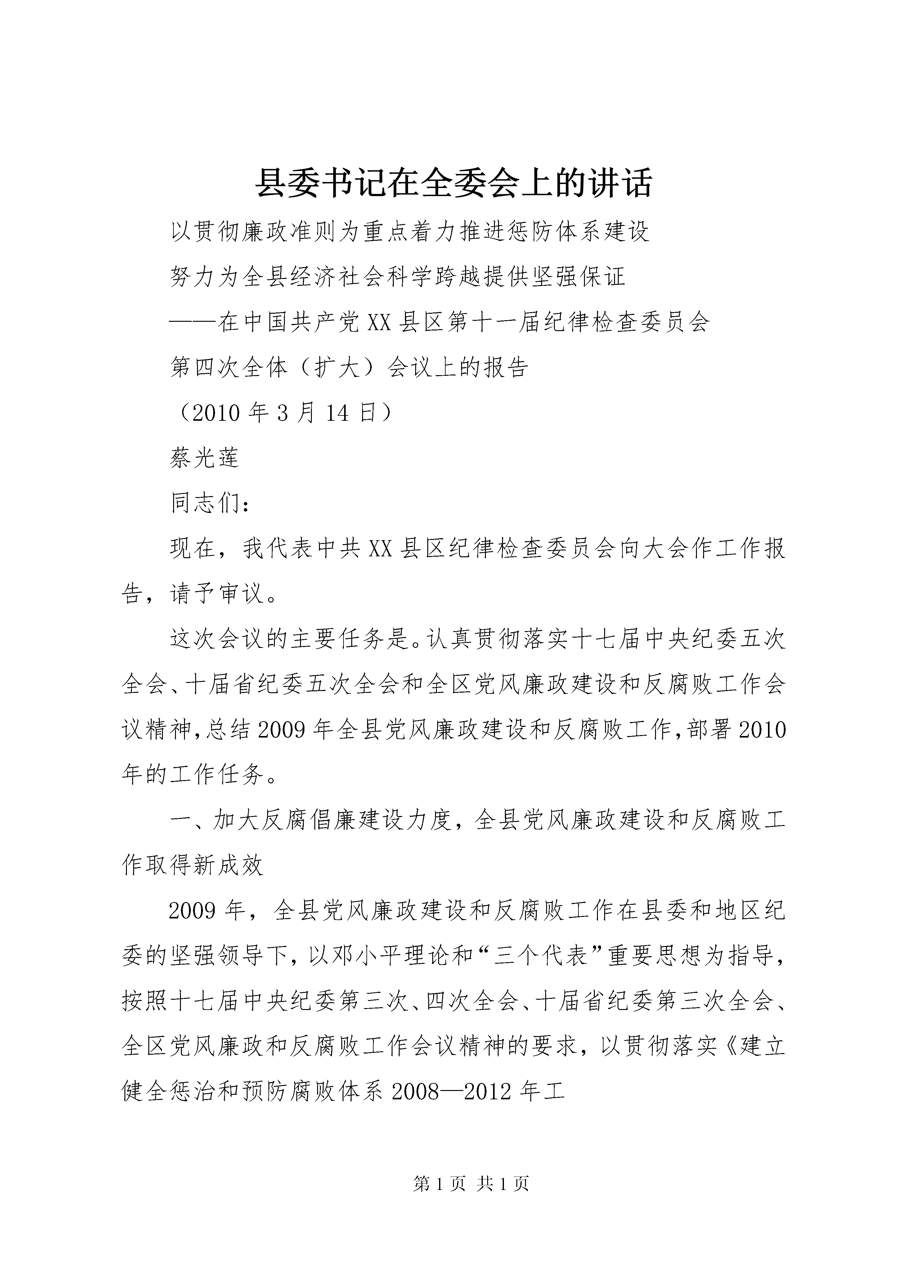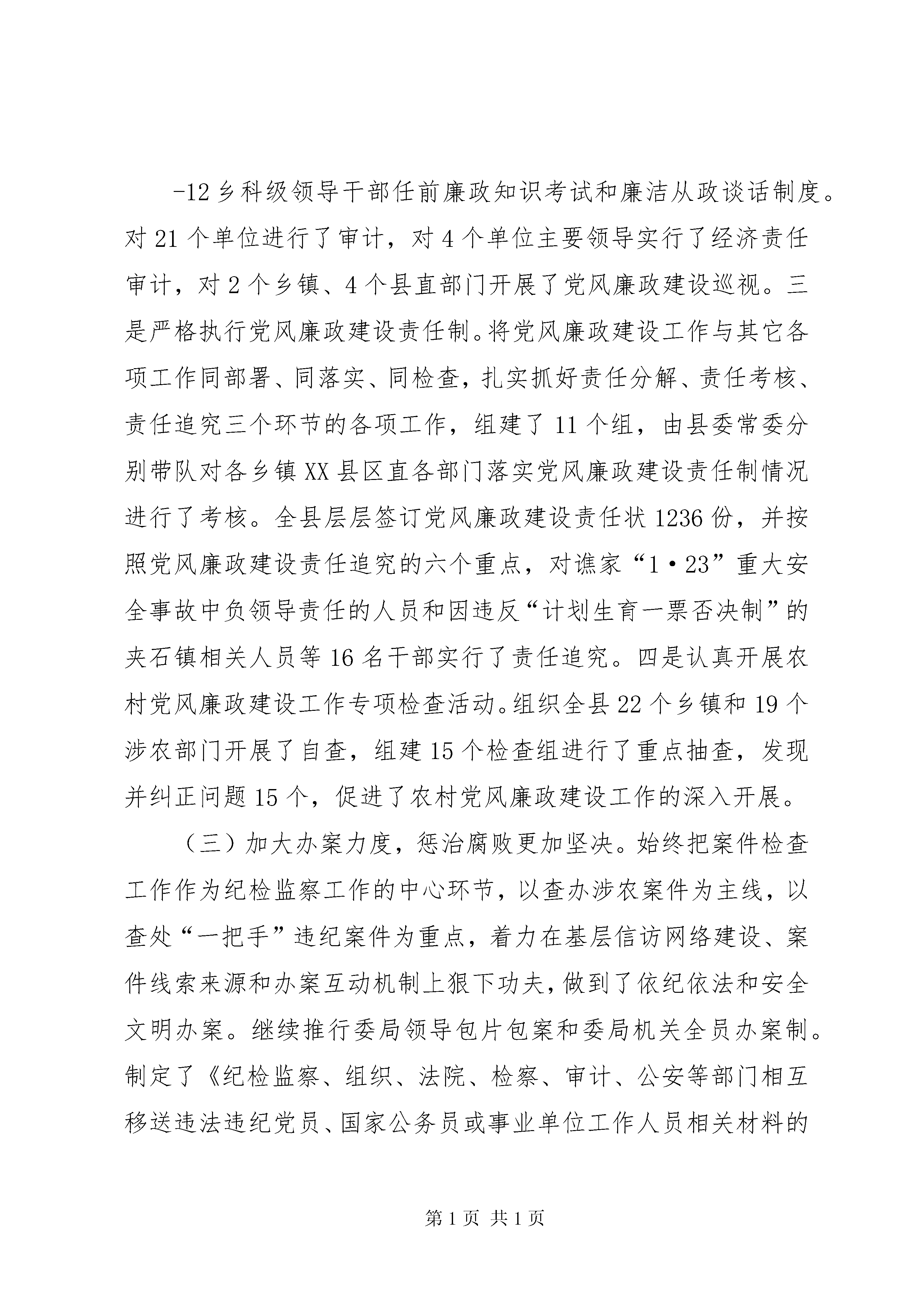 县委书记在全委会上的讲话以贯彻廉政准则为重点着力推进惩防体系建设努力为全县经济社会科学跨越提供坚强保证——在中国共产党XX县区第十一届纪律检查委员会第四次全体(扩大)会议上的报告(2010年3月14日)蔡光莲同志们:现在,我代表中共XX县区纪律检查委员会向大会作工作报告,请予审议。这次会议的主要任务是。认真贯彻落实十七届中央纪委五次全会、十届省纪委五次全会和全区党风廉政建设和反腐败工作会议精神,总结2009年全县党风廉政建设和反腐败工作,部署2010年的工作任务。一、加大反腐倡廉建设力度,全县党风廉政建设和反腐败工作取得新成效2009年,全县党风廉政建设和反腐败工作在县委和地区纪委的坚强领导下,以邓小平理论和“三个代表”重要思想为指导,按照十七届中央纪委第三次、四次全会、十届省纪委第三次全会、全区党风廉政和反腐败工作会议精神的要求,以贯彻落实《建立健全惩治和预防腐败体系2008—2012年工-12乡科级领导干部任前廉政知识考试和廉洁从政谈话制度。对21个单位进行了审计,对4个单位主要领导实行了经济责任审计,对2个乡镇、4个县直部门开展了党风廉政建设巡视。三是严格执行党风廉政建设责任制。将党风廉政建设工作与其它各项工作同部署、同落实、同检查,扎实抓好责任分解、责任考核、责任追究三个环节的各项工作,组建了11个组,由县委常委分别带队对各乡镇XX县区直各部门落实党风廉政建设责任制情况进行了考核。全县层层签订党风廉政建设责任状1236份,并按照党风廉政建设责任追究的六个重点,对谯家“1·23”重大安全事故中负领导责任的人员和因违反“计划生育一票否决制”的夹石镇相关人员等16名干部实行了责任追究。四是认真开展农村党风廉政建设工作专项检查活动。组织全县22个乡镇和19个涉农部门开展了自查,组建15个检查组进行了重点抽查,发现并纠正问题15个,促进了农村党风廉政建设工作的深入开展。(三)加大办案力度,惩治腐败更加坚决。始终把案件检查工作作为纪检监察工作的中心环节,以查办涉农案件为主线,以查处“一把手”违纪案件为重点,着力在基层信访网络建设、案件线索来源和办案互动机制上狠下功夫,做到了依纪依法和安全文明办案。继续推行委局领导包片包案和委局机关全员办案制。制定了《纪检监察、组织、法院、检察、审计、公安等部门相互移送违法违纪党员、国家公务员或事业单位工作人员相关材料的规定》,不断整合办案资源,形成工作合力。建立企业自律机制,推行反商业贿赂承诺制,全县治理商业贿赂工作取得新进展。全年共受理群众来信来访及电话举报71件(次),其中来信55件,来访8次,电话举报8起,受理率为100%。查处各类违纪违法案件52件,结案率100%;党(政)纪处理(分)67人,挽回经济损失141.07万元。其中,万元以上大案14件,乡科级“一把手”违纪案件6件7人,涉农案件18件。(四)坚持纠建并举,纠风治乱更加有效。加大对支农惠农资金的监督检查。严格执行涉农项目资金微机登记备案制、台帐管理制、县乡村“三级公示”制和责任追究制。对全县19个涉农部门和部分乡镇开展动态监督检查。全年共检查涉农项目354个,涉及资金39070.15万元;深入治理教育乱收费。建立了查处违规乱收费快速反映机制XX县区、乡、村三级监督网络,认真开展了教育收费清理整治工作,纠正并清退了19所学校的5项违规收费,涉及金额28.4万元;切实纠正医药购销和医疗服务中的不正之风。加强对县级医疗单位药品招标采购工作的监管,集中跟标采购金额达1236.9万元,通过降低药品价格直接让利患者85万元。进一步整顿和规范了药品流通市场和医疗收费行为,纠正了部分医疗机构违规收费6.45万元,进一步加大对农村合医、职工医保资金管理使用情况的监督检查;坚决纠正损害农民利益的突出问题。-56元,上缴土地出让金10万元;严格实行政府采购计划申报制度,实现集中采购资金2983万元,节约资金416.92万元。有序推进“三公开”。按照“公开程序、公开内容、公开形式、公开时间”的要求,全县22个乡镇395个村(居)85个县直部门全部实行了政务、村务和党务公开,厂务、校务、院务公开渐显特色。(七)强化效能督查,发展环境更加优化。在广泛征求县级领导、人大代表、政协委员、部分群众、乡镇部门意见和深入调研的基础上,制定了《机关作风和效能建设考核评价工作实施方案》,明确了机关作风和效能建设的总体要求、考核范围、目标任务。建立了《政务工作日志周报制》、《考核评价台帐管理制度》、《机关作风和效能建设责任追究暂行办法》、《机关作风和效能建设集中测评实施方案》等工作制度和工作机制,确保了工作规范化运行。推行了“一督令促启动、二督令促进度、三督令促结果”的“三督令”工作制度。组织开展了2009年度机关作风和效能建设“满意度”测评活动,