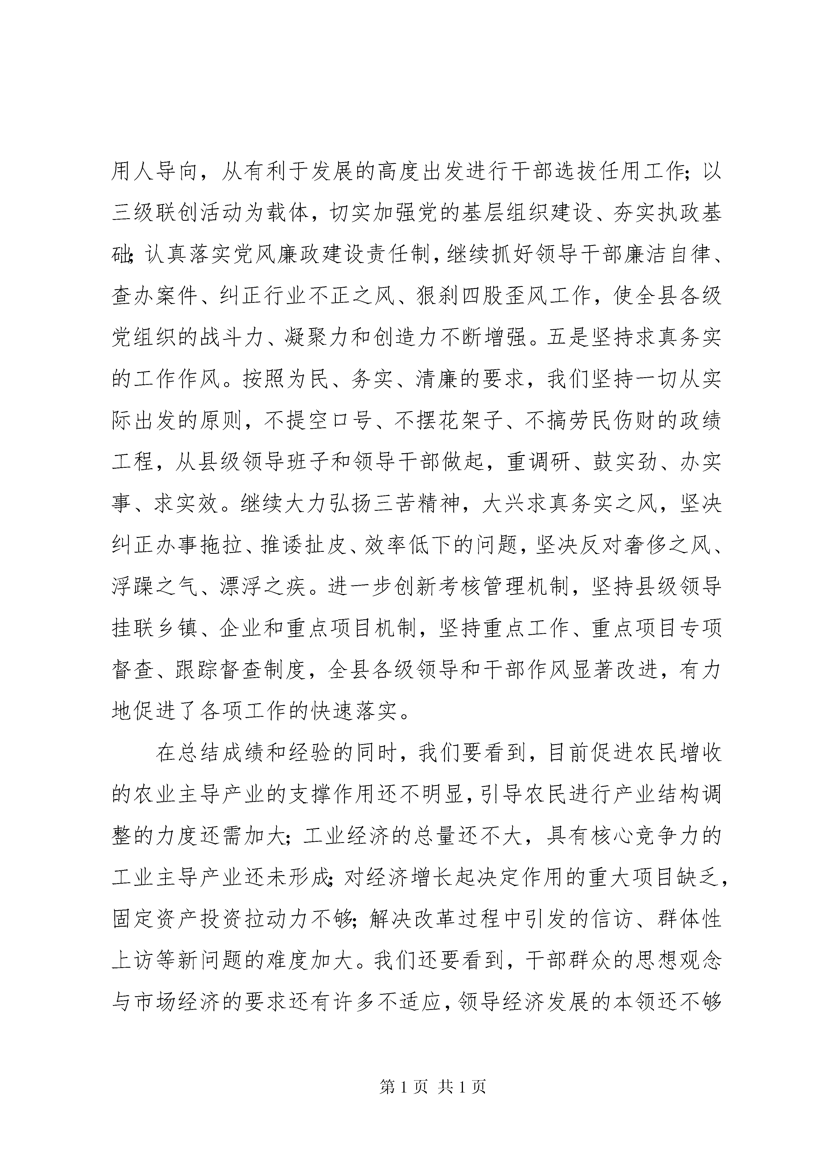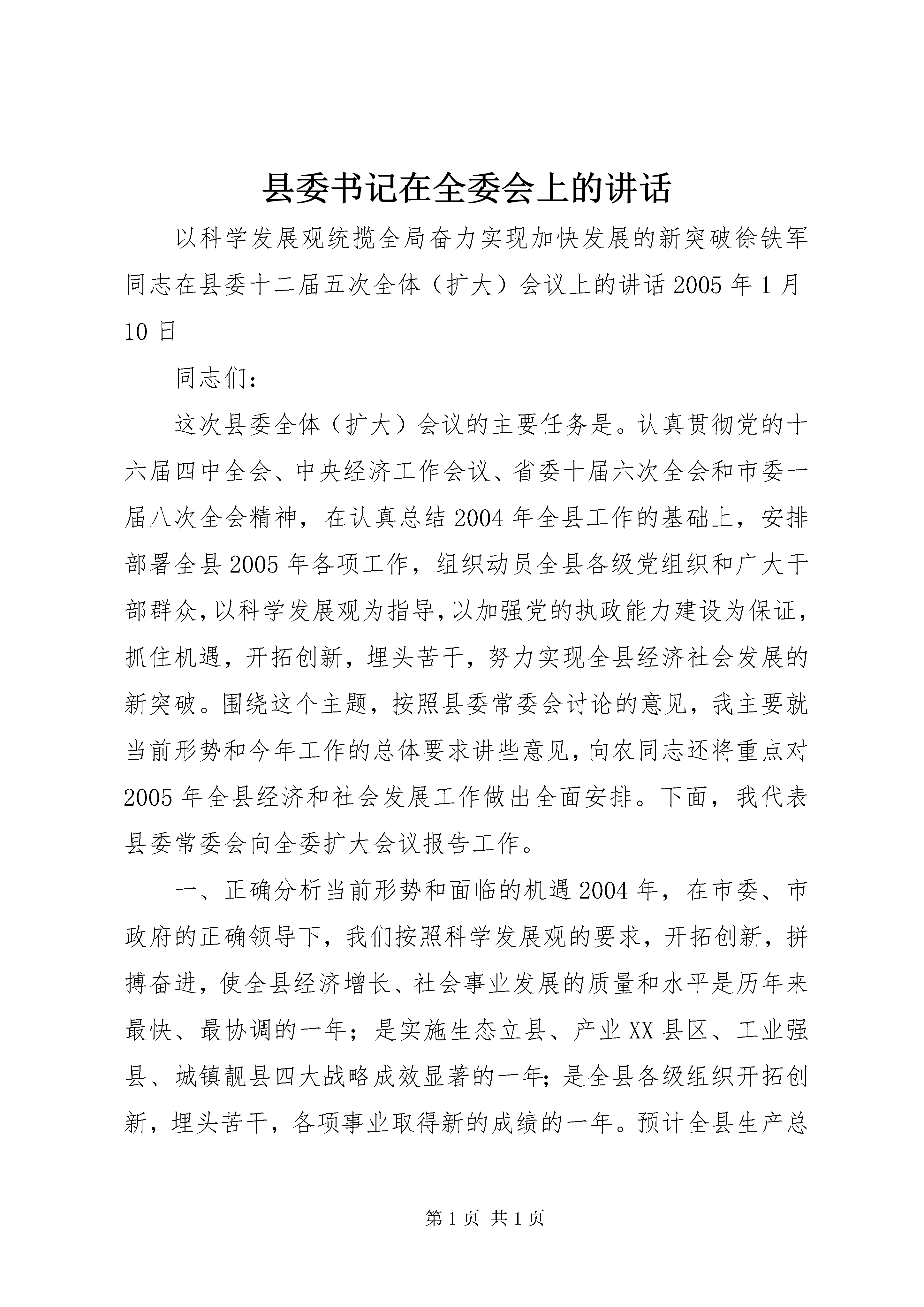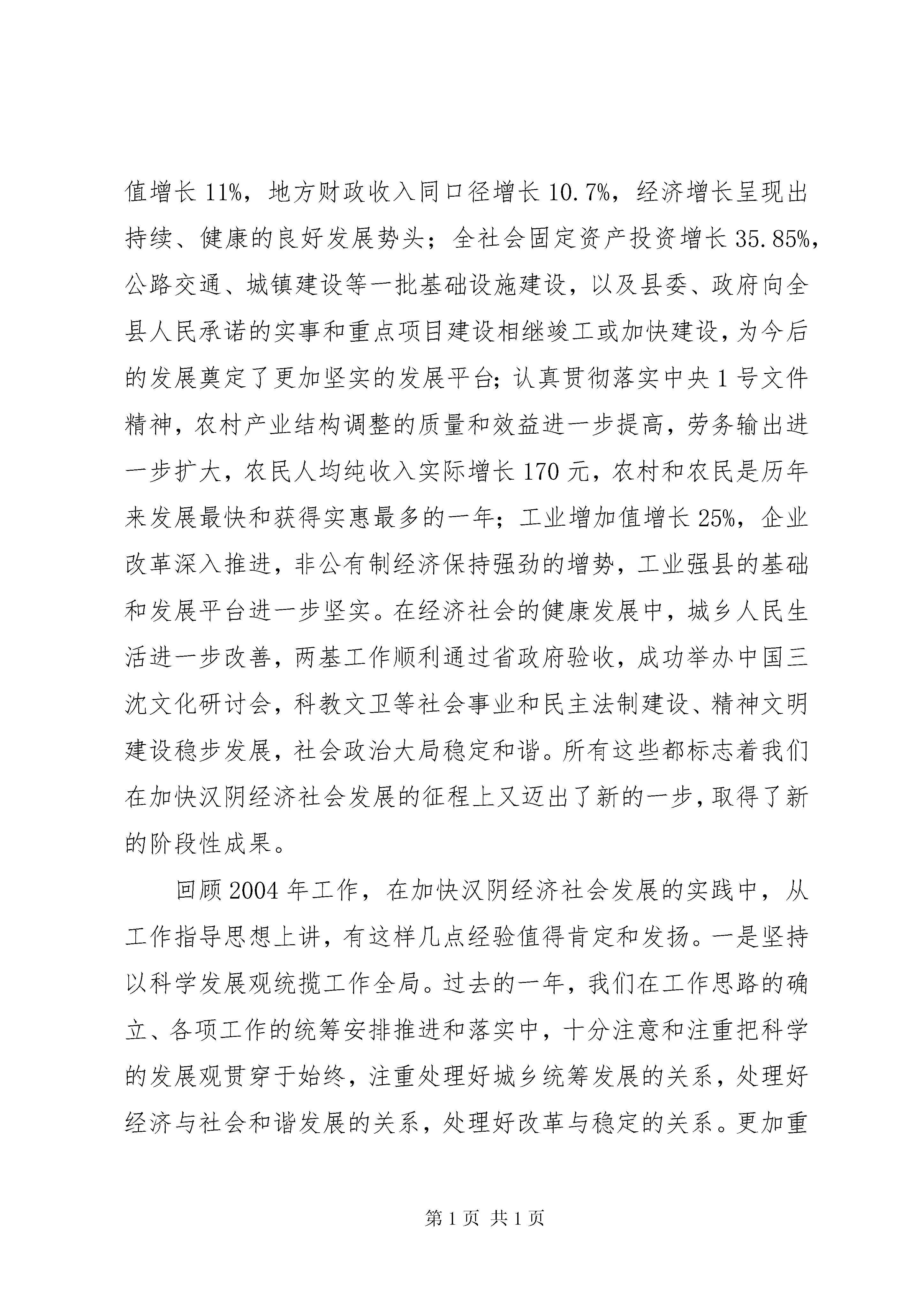 县委书记在全委会上的讲话以科学发展观统揽全局奋力实现加快发展的新突破徐铁军同志在县委十二届五次全体(扩大)会议上的讲话2005年1月10日同志们:这次县委全体(扩大)会议的主要任务是。认真贯彻党的十六届四中全会、中央经济工作会议、省委十届六次全会和市委一届八次全会精神,在认真总结2004年全县工作的基础上,安排部署全县2005年各项工作,组织动员全县各级党组织和广大干部群众,以科学发展观为指导,以加强党的执政能力建设为保证,抓住机遇,开拓创新,埋头苦干,努力实现全县经济社会发展的新突破。围绕这个主题,按照县委常委会讨论的意见,我主要就当前形势和今年工作的总体要求讲些意见,向农同志还将重点对2005年全县经济和社会发展工作做出全面安排。下面,我代表县委常委会向全委扩大会议报告工作。一、正确分析当前形势和面临的机遇2004年,在市委、市政府的正确领导下,我们按照科学发展观的要求,开拓创新,拼搏奋进,使全县经济增长、社会事业发展的质量和水平是历年来最快、最协调的一年;是实施生态立县、产业XX县区、工业强县、城镇靓县四大战略成效显著的一年;是全县各级组织开拓创新,埋头苦干,各项事业取得新的成绩的一年。预计全县生产总值增长11%,地方财政收入同口径增长10.7%,经济增长呈现出持续、健康的良好发展势头;全社会固定资产投资增长35.85%,公路交通、城镇建设等一批基础设施建设,以及县委、政府向全县人民承诺的实事和重点项目建设相继竣工或加快建设,为今后的发展奠定了更加坚实的发展平台;认真贯彻落实中央1号文件精神,农村产业结构调整的质量和效益进一步提高,劳务输出进一步扩大,农民人均纯收入实际增长170元,农村和农民是历年来发展最快和获得实惠最多的一年;工业增加值增长25%,企业改革深入推进,非公有制经济保持强劲的增势,工业强县的基础和发展平台进一步坚实。在经济社会的健康发展中,城乡人民生活进一步改善,两基工作顺利通过省政府验收,成功举办中国三沈文化研讨会,科教文卫等社会事业和民主法制建设、精神文明建设稳步发展,社会政治大局稳定和谐。所有这些都标志着我们在加快汉阴经济社会发展的征程上又迈出了新的一步,取得了新的阶段性成果。回顾2004年工作,在加快汉阴经济社会发展的实践中,从工作指导思想上讲,有这样几点经验值得肯定和发扬。一是坚持以科学发展观统揽工作全局。过去的一年,我们在工作思路的确立、各项工作的统筹安排推进和落实中,十分注意和注重把科学的发展观贯穿于始终,注重处理好城乡统筹发展的关系,处理好经济与社会和谐发展的关系,处理好改革与稳定的关系。更加重视解决好农业、农村、农民问题,深化农村税费改革,加强农村基础设施建设,引导农民进行产业结构调整,着力培育主导产业;更加重视科教文卫等各项社会事业协调发展,实施两基攻坚,打造三沈文化,加强科技推广,加快疾病防控体系建设;更加重视人与自然的和谐发展,大力推进计划生育、环境保护和生态建设;更加重视把改革的力度、发展的速度和社会可承受的程度结合起来,积极推进农村税费改革和企业改革,切实加强信访稳定、社会治安综合治理和安全生产工作,在维护社会稳定中促进发展,在加快发展中实现社会稳定。正是因为我们在工作的指导思想、政策措施上较好地落实了科学发展观,才有效地解决了改革和发展中的诸多困难,实现了经济社会的持续、健康、协调发展。二是坚持民主科学决策,大力实施四大战略。深入调查研究,善于集中集体智慧,充分顺应民意XX县区情实际,是县委始终坚持的一个重要领导方法。年初,我们在客观总结近年发展经验、认真分析研究国家产业政策的基础上,通过深入地调查研究,充分听取社会各界意见建议,确立了生态立县、产业XX县区、工业强县、城镇靓县四大战略,通过一年来全县各级的努力奋斗,实践证明,四大战略符合XX县区情实际,符合国家宏观经济政策的调整走向,符合全县广大干部群众的意愿,是加快汉阴发展的民主和科学的决策。三是坚持立党为公、执政为民的执政理念。过去的一年,我们努力践行三个代表重要思想,在各项工作中坚持以人为本,按照立党为公、执政为民的要求,把保护好、维护好和实现好最广大人民的根本利益体现在全县改革发展稳定的各项部署中,落实到经济社会发展的各个方面,坚持党的领导、人民当家作主和依法行政的有机统一,切实维护人民群众的合法权益,把人民群众的要求作为我们制定政策、推进工作的出发点和落脚点,把充分调动方方面面干部群众的积极性、创造性作为推动发展的根本力量,把解决人民群众最关心、最紧迫、最直接的困难和问题摆在党委、政府工作的首位,使全县上下的注意力和创造力都统一到全县的改革、发展和稳定上来。同时,也更进一步密切了党和政府同人民群众的血肉联系,巩固了党的执政基础。四是坚持抓好党的建设这个根本。县委班子带头做起,按照集体领导、