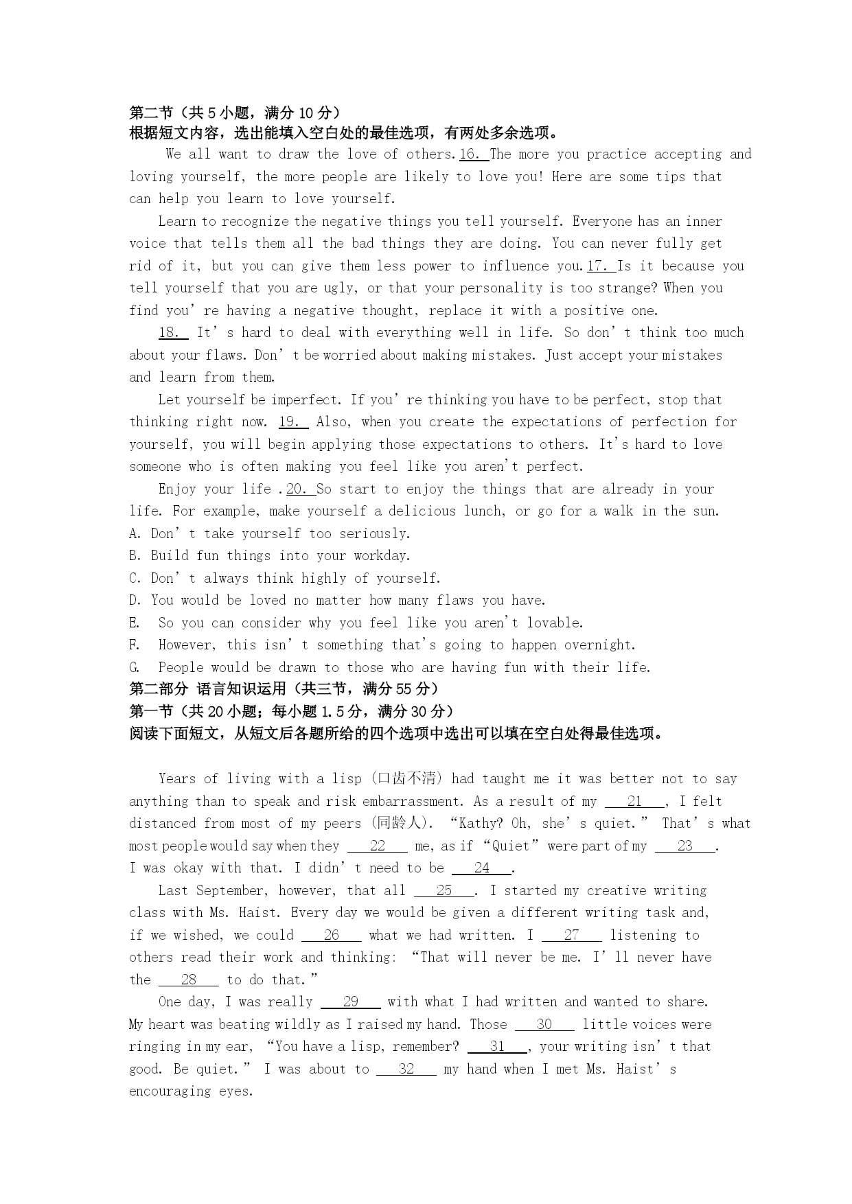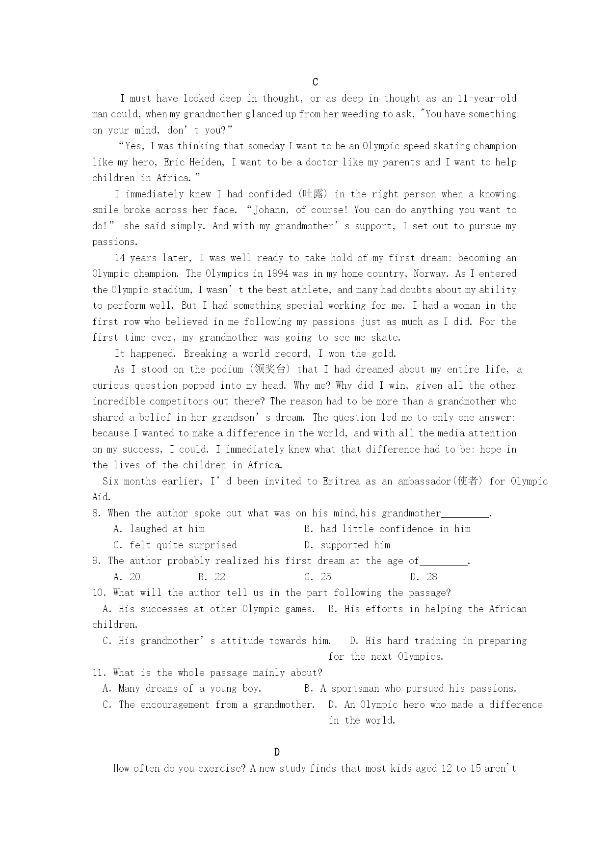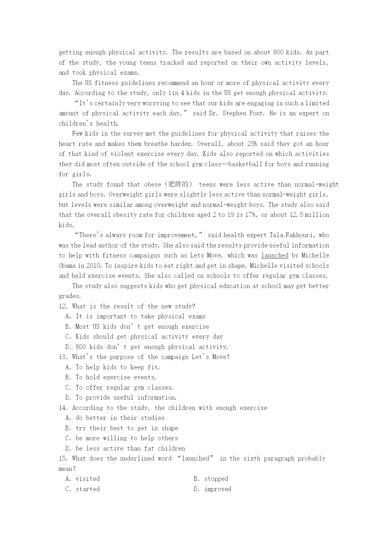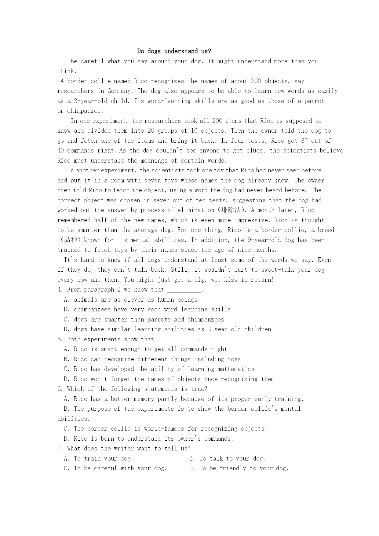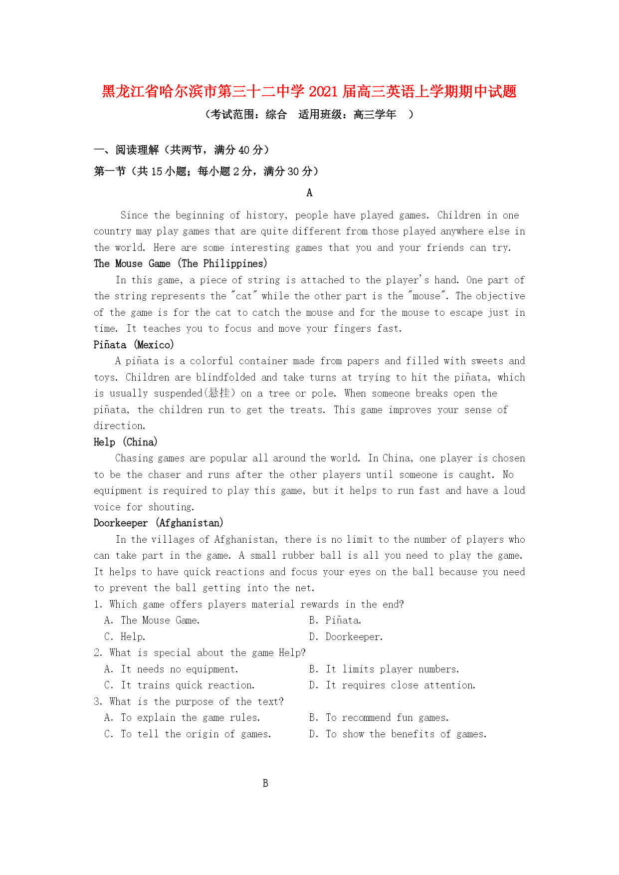 黑龙江省哈尔滨市第三十二中学2021届高三英语上学期期中试题 (考试范围:综合适用班级:高三学年) 一、阅读理解(共两节,满分40分) 第一节(共15小题;每小题2分,满分30分) A Sincethebeginningofhistory,peoplehaveplayedgames.Childreninonecountrymayplaygamesthatarequitedifferentfromthoseplayedanywhereelseintheworld.Herearesomeinterestinggamesthatyouandyourfriendscantry. TheMouseGame(ThePhilippines) Inthisgame,apieceofstringisattachedtotheplayer'shand.Onepartofthestringrepresentsthe"cat"whiletheotherpartisthe"mouse".Theobjectiveofthegameisforthecattocatchthemouseandforthemousetoescapejustintime.Itteachesyoutofocusandmoveyourfingersfast. Piñata(Mexico) Apiñataisacolorfulcontainermadefrompapersandfilledwithsweetsandtoys.Childrenareblindfoldedandtaketurnsattryingtohitthepiñata,whichisusuallysuspended(悬挂)onatreeorpole.Whensomeonebreaksopenthepiñata,thechildrenruntogetthetreats.Thisgameimprovesyoursenseofdirection. Help(China) Chasinggamesarepopularallaroundtheworld.InChina,oneplayerischosentobethechaserandrunsaftertheotherplayersuntilsomeoneiscaught.Noequipmentisrequiredtoplaythisgame,butithelpstorunfastandhavealoudvoiceforshouting. Doorkeeper(Afghanistan) InthevillagesofAfghanistan,thereisnolimittothenumberofplayerswhocantakepartinthegame.Asmallrubberballisallyouneedtoplaythegame.Ithelpstohavequickreactionsandfocusyoureyesontheballbecauseyouneedtopreventtheballgettingintothenet. 1.Whichgameoffersplayersmaterialrewardsintheend? A.TheMouseGame. B.Piñata. C.Help. D.Doorkeeper. 2.WhatisspecialaboutthegameHelp? A.Itneedsnoequipment. B.Itlimitsplayernumbers. C.Ittrainsquickreaction. D.Itrequirescloseattention. 3.Whatisthepurposeofthetext? A.Toexplainthegamerules. B.Torecommendfungames. C.Totelltheoriginofgames. D.Toshowthebenefitsofgames. B Dodogsunderstandus? Becarefulwhatyousayaroundyourdog.Itmightunderstandmorethanyouthink. AbordercollienamedRicorecognizesthenamesofabout200objects,sayresearchersinGermany.Thedogalsoappearstobeabletolearnnewwordsaseasilyasa3-year-oldchild.Itsword-learningskillsareasgoodasthoseofaparrotorchimpanzee. Inoneexperiment,theres