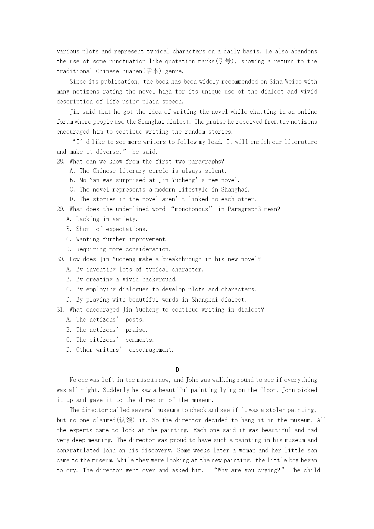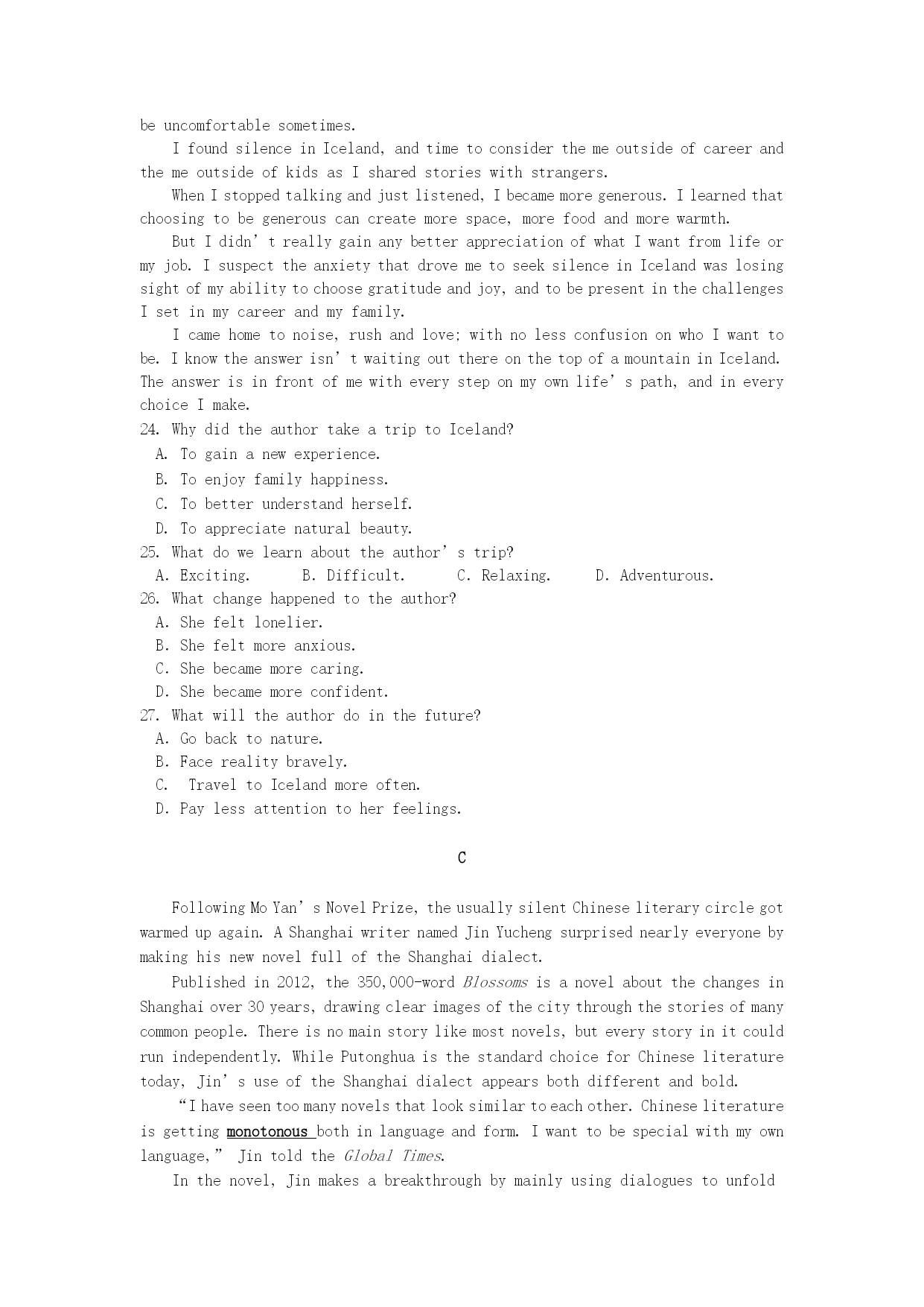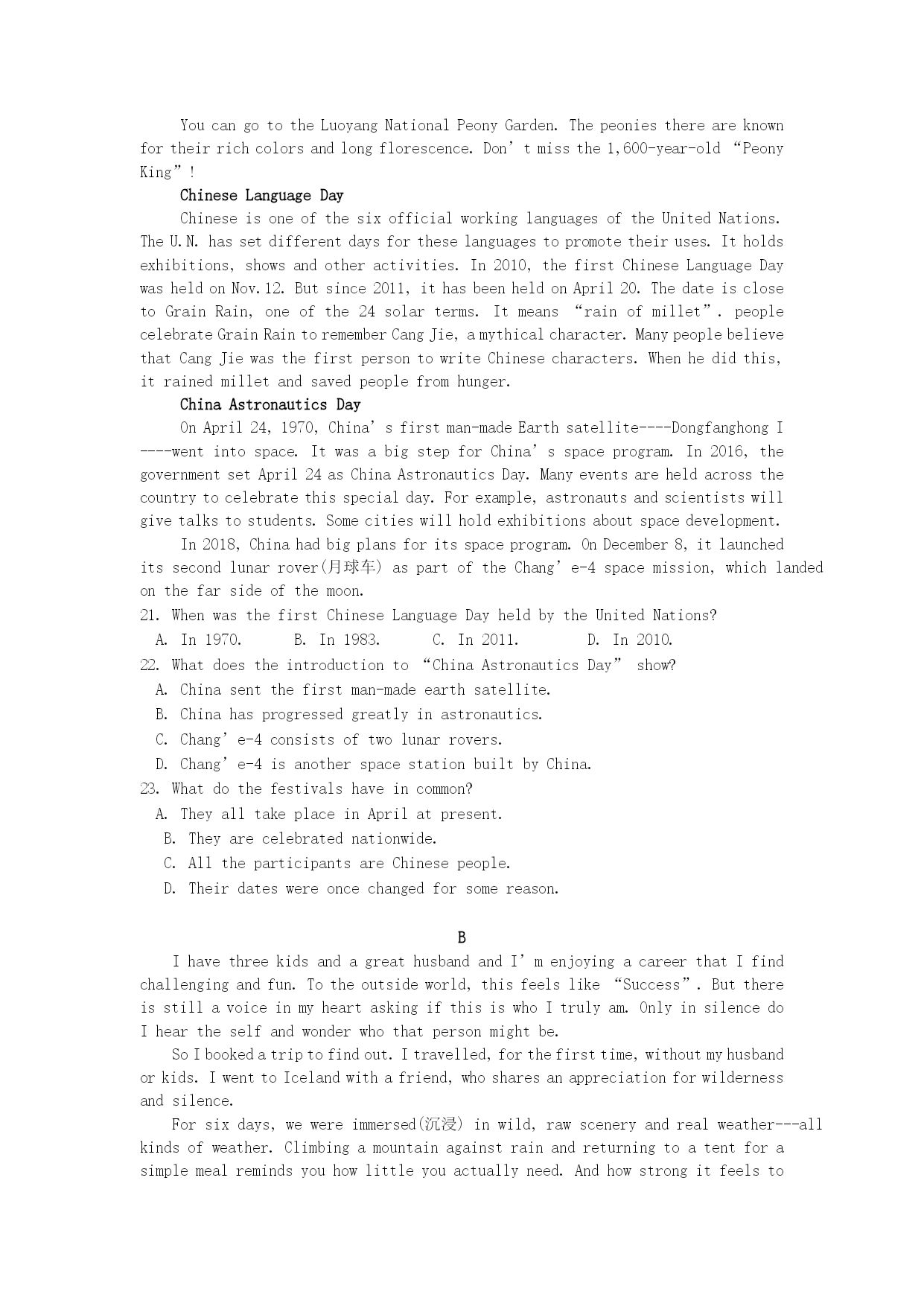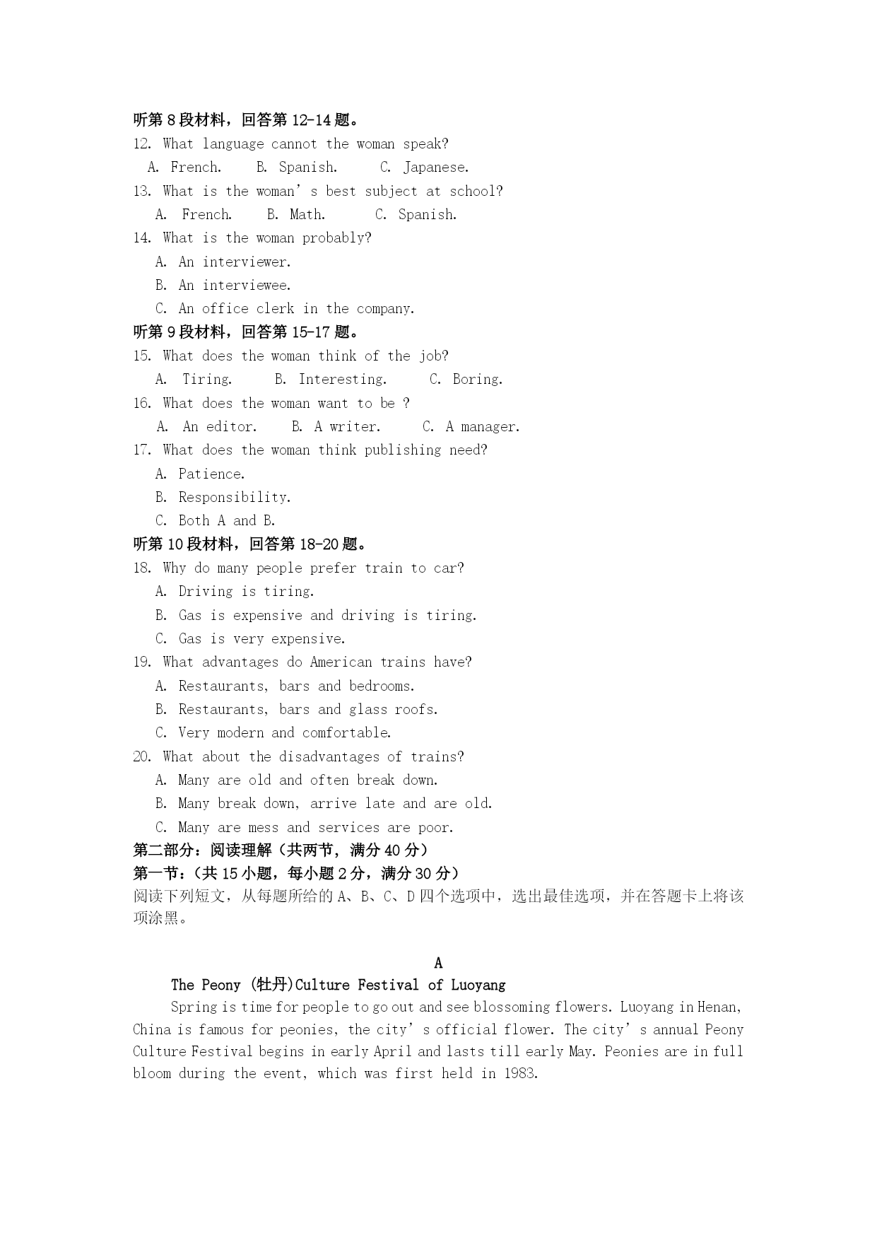 宁夏长庆高级中学2021届高三英语上学期第四次月考试题 分值:150分时间:120分钟 第一部分:听力(共两节,满分30分) 第一节:(共5小题;每小题1.5分,满分7.5分) 听下面5段对话。每段对话后有一个小题,从题中所给的A、B、C三个选项中选出最佳选项,并标在试卷的相应位置。听完每段对话后,你都有10秒钟的时间来回答有关小题和阅读下一小题。每段对话仅读一遍。 What’sthetelephonenumberoftheAcademicOffice? A.310-218-1452. B.310-280-1501. C.310-280-1552. Whatmakesthemanspeakersurprised? A.Hisheavybody. B.Hispoorhealth. C.Hisirregularexercise. Wheredoesthemanseetheadvertisement? A.Ontheposter. B.Onthetelevision. C.Inthenewspaper. What’stheweatherliketoday? A.Cloudy.B.Sunny.C.Windy. Whatisthewomanlikelytodo? A.ToattendapartyonFriday. B.ToattendaballonFriday. C.TohaveapartyonFriday. 第二节(共15小题,每小题1.5分,满分22.5分) 听下面6段对话或独白.每段对话或独白后有几个小题,从题中所给的A、B、C三个选项中选出最佳选项,,各小题将给出5秒钟的作答时间.每段对话或独白读两遍。 听第6段材料,回答6-8题. What’stheprobablerelationshipbetweenthetwospeakers? A.Businessmanandsalesgirl. B.Managerandsalesgirl. C.Salesmanandsalesgirl. Whatdoesthemanwanttobuyacomputerfor? A.Forhimself.B.Forhisfriend.C.Forhisbusiness. Howdoesthemanpayforthecomputer? Incash.B.Bycheck.C.Byinstallmentplan. 听第7段材料,回答第9-11题 Wherewillthewomango? Tothelibrary.B.Totheschool.C.Tothezoo. Whatistherelationshipbetweenthespeakers? Strangers.B.Friends.C.Colleagues. Whichbuswillthewomanchoose? A.No.36.B.No.301.C.No.310. 听第8段材料,回答第12-14题。 Whatlanguagecannotthewomanspeak? A.French.B.Spanish.C.Japanese. Whatisthewoman’sbestsubjectatschool? French.B.Math.C.Spanish. Whatisthewomanprobably? A.Aninterviewer. B.Aninterviewee. C.Anofficeclerkinthecompany. 听第9段材料,回答第15-17题。 Whatdoesthewomanthinkofthejob? Tiring.B.Interesting.C.Boring. Whatdoesthewomanwanttobe? Aneditor.B.Awriter.C.Amanager. Whatdoesthewomanthinkpublishingneed? A.Patience. B.Responsibility. C.BothAandB. 听第10段材料,回答第18-20题。 18.Whydomanypeopleprefertraintocar? A.Drivingistiring. B.Gasisexpensiveanddrivingistiring. C.Gasisveryexpensive. WhatadvantagesdoAmericantrainshave? A.Restaurants,barsandbedrooms. B.Restaurants,barsandglassroofs. C.Verymodernandcomfortable. Whataboutthedisadvantagesoftrains? A.Manyareoldandoftenbreakdown. B.Manybreakdo