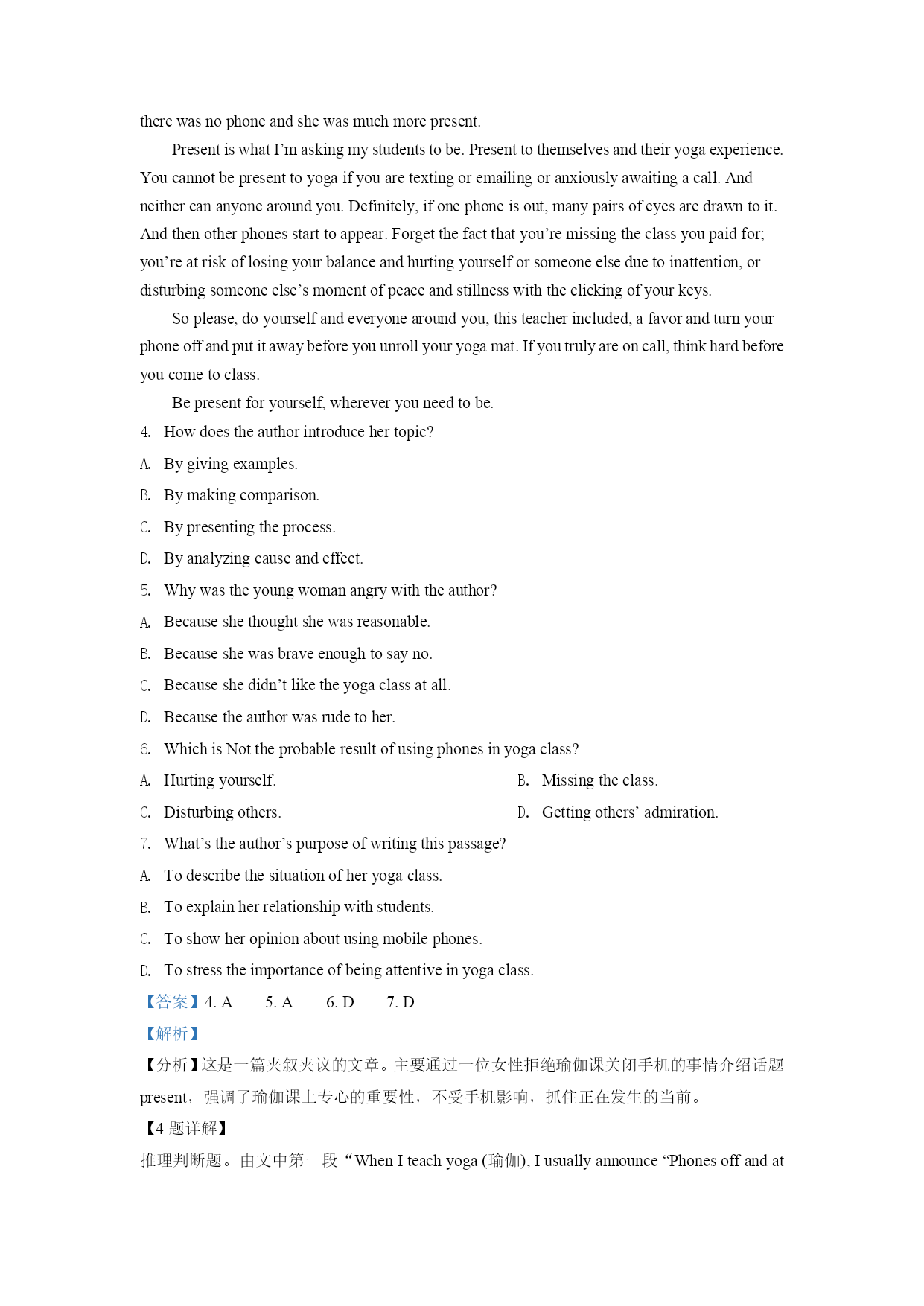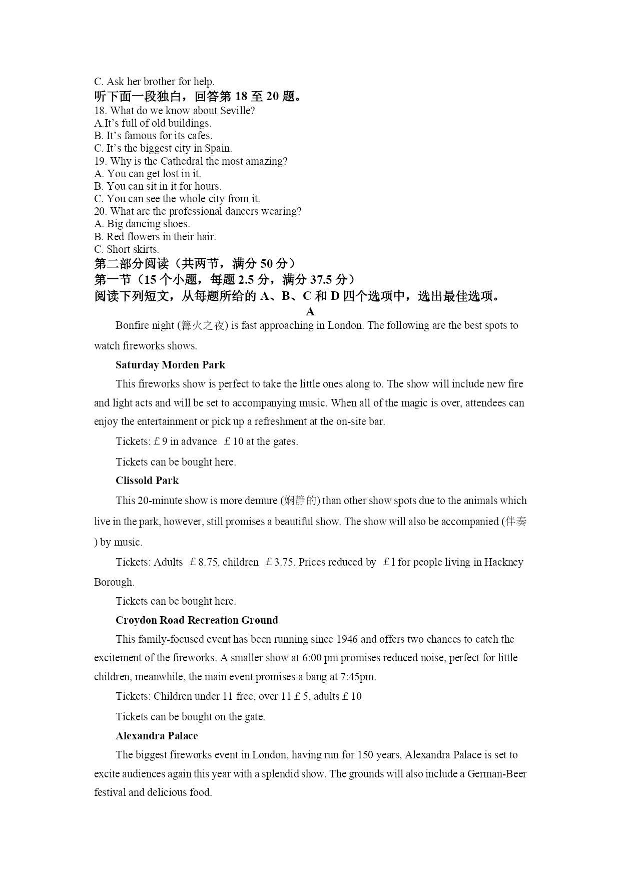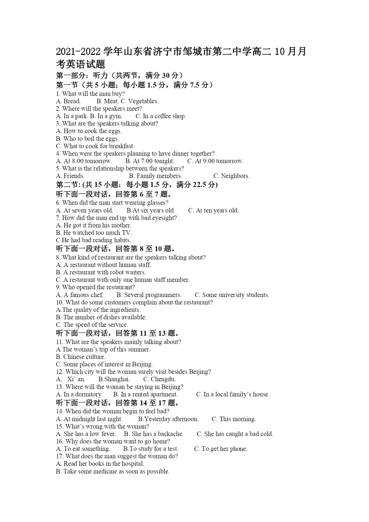 2021-2022学年山东省济宁市邹城市第二中学高二10月月考英语试题 第一部分:听力(共两节,满分30分) 第一节(共5小题;每小题1.5分,满分7.5分) 1.Whatwillthemanbuy? A.Bread.B.Meat.C.Vegetables. 2.Wherewillthespeakersmeet? A.Inapark.B.Inagym.C.Inacoffeeshop. 3.Whatarethespeakerstalkingabout? A.Howtocooktheeggs. B.Whotoboiltheeggs. C.Whattocookforbreakfast. 4.Whenwerethespeakersplanningtohavedinnertogether? A.At8:00tomorrow.B.At7:00tonight.C.At9:00tomorrow. 5.Whatistherelationshipbetweenthespeakers? A.Friends.B.Familymembers.C.Neighbors. 第二节:(共15小题:每小题1.5分,满分22.5分) 听下面一段对话,回答第6至7题。 6.Whendidthemanstartwearingglasses? A.Atsevenyearsold.B.Atsixyearsold.C.Attenyearsold. 7.Howdidthemanendupwithbadeyesight? A.Hegotitfromhismother. B.HewatchedtoomuchTV. CHehadbadreadinghabits. 听下面一段对话,回答第8至10题。 8.Whatkindofrestaurantarethespeakerstalkingabout? A.Arestaurantwithouthumanstaff. B.Arestaurantwithrobotwaiters. C.Arestaurantwithonlyonehumanstaffmember. 9.Whoopenedtherestaurant? A.Afamouschef.B.Severalprogrammers.C.Someuniversitystudents. 10.Whatdosomecustomerscomplainabouttherestaurant? A.Thequalityoftheingredients. B.Thenumberofdishesavailable. C.Thespeedoftheservice. 听下面一段对话,回答第11至13题。 11.Whatarethespeakersmainlytalkingabout? A.Thewoman’stripofthissummer. B.Chineseculture. C.SomeplacesofinterestinBeijing. 12.WhichcitywillthewomansurelyvisitbesidesBeijing? A.Xi’an.B.Shanghai.C.Chengdu. 13.WherewillthewomanbestayinginBeijing? A.Inadormitory.B.Inarentedapartment.C.Inalocalfamily’shouse. 听下面一段对话,回答第14至17题。 14.Whendidthewomanbegintofeelbad? A.Atmidnightlastnight.B.Yesterdayafternoon.C.Thismorning. 15.What’swrongwiththewoman? A.Shehasalowfever.B.Shehasabackache.C.Shehascaughtabadcold. 16.Whydoesthewomanwanttogohome? A.Toeatsomething.B.Tostudyforatest.C.Togetherphone. 17.Whatdoesthemansuggestthewomando? A.Readherbooksinthehospital. B.Takesomemedicineassoonaspossible. C.Askherbrotherforhelp. 听下面一段独白,回答第18至20题。 18.WhatdoweknowaboutSeville? A.It’sfullofoldbuildings. B.It’sfamousforitscafes. C.It’sthebiggestcityinSpain. 19.WhyistheCathedralthemostamaz