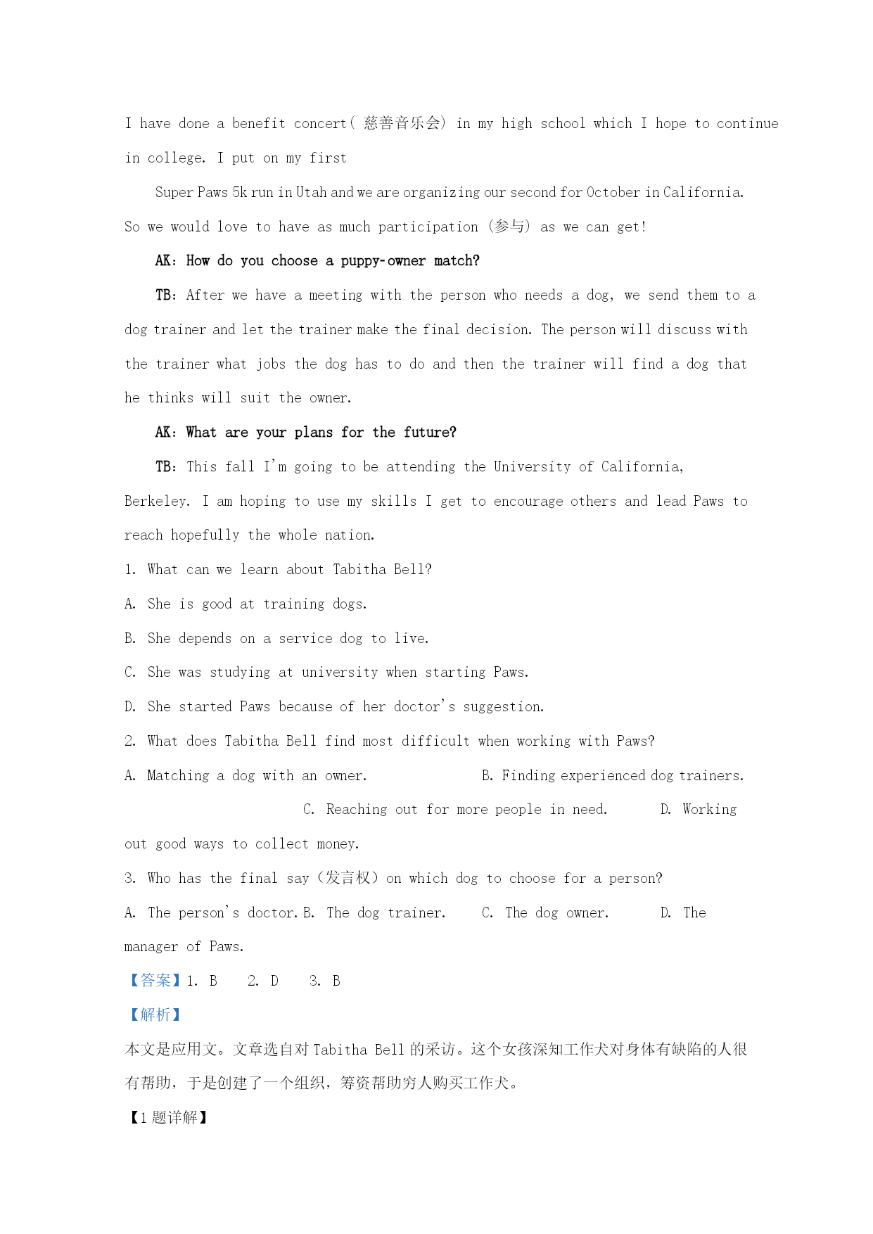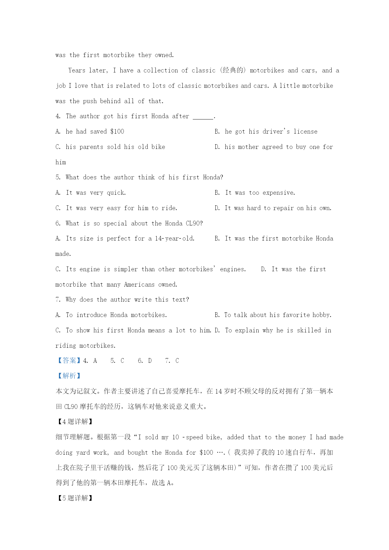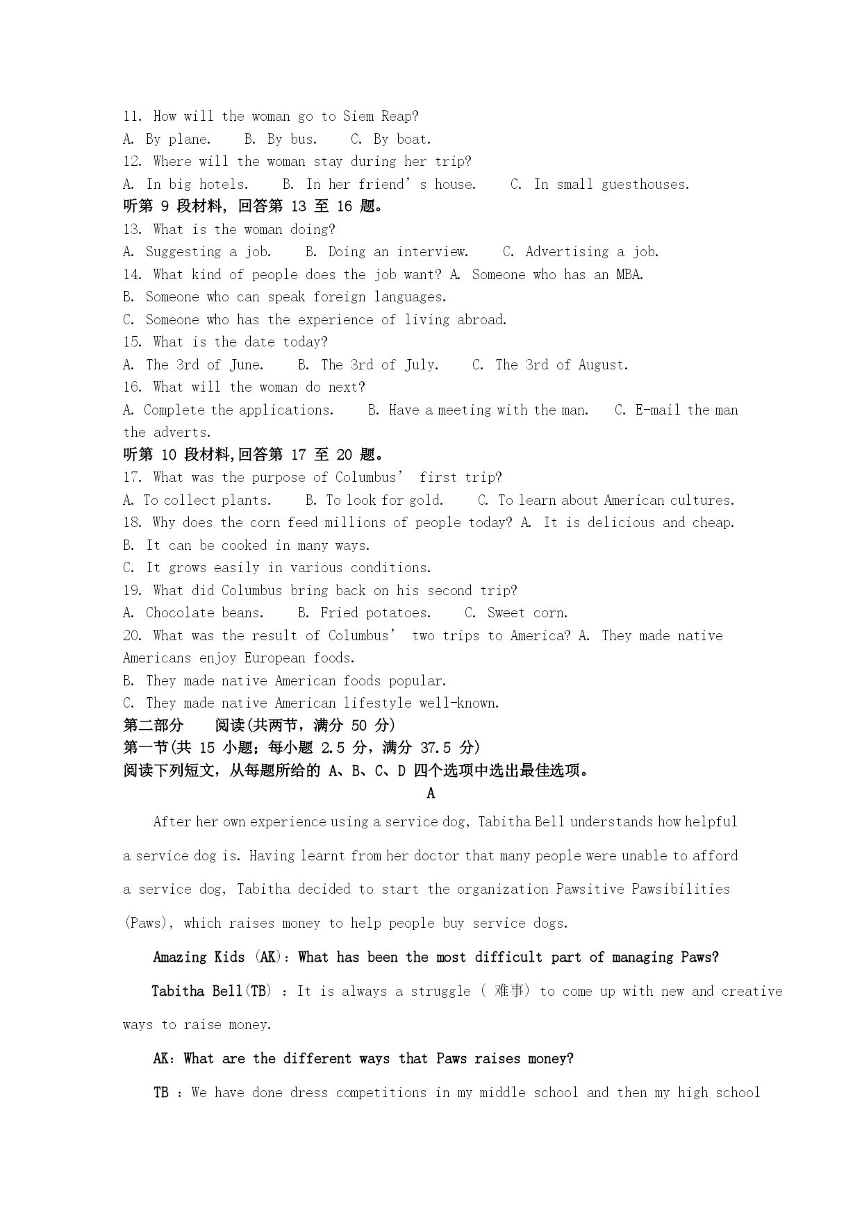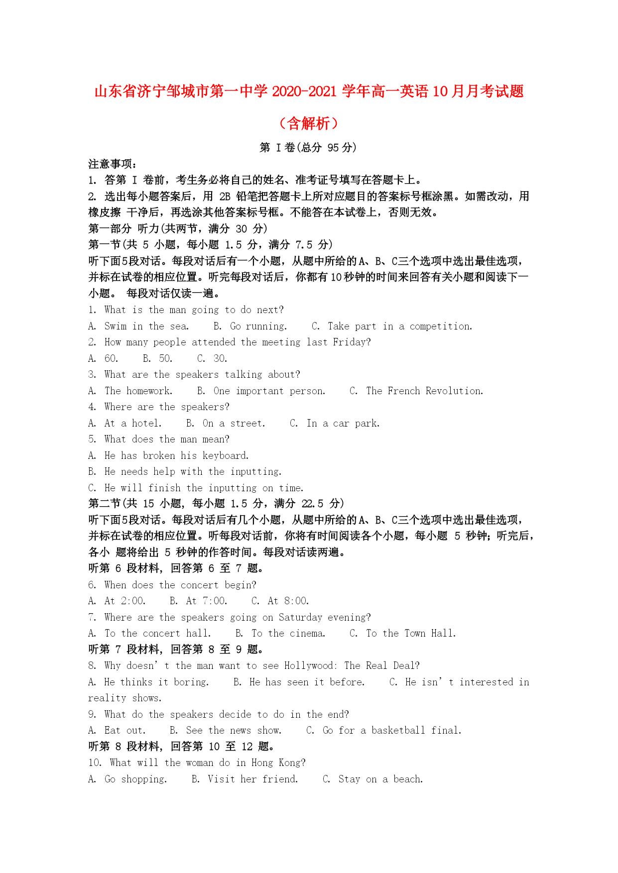 山东省济宁邹城市第一中学2020-2021学年高一英语10月月考试题(含解析) 第I卷(总分95分) 注意事项: 1.答第I卷前,考生务必将自己的姓名、准考证号填写在答题卡上。 2.选出每小题答案后,用2B铅笔把答题卡上所对应题目的答案标号框涂黑。如需改动,用橡皮擦干净后,再选涂其他答案标号框。不能答在本试卷上,否则无效。 第一部分听力(共两节,满分30分) 第一节(共5小题,每小题1.5分,满分7.5分) 听下面5段对话。每段对话后有一个小题,从题中所给的A、B、C三个选项中选出最佳选项,并标在试卷的相应位置。听完每段对话后,你都有10秒钟的时间来回答有关小题和阅读下一小题。每段对话仅读一遍。 1.Whatisthemangoingtodonext? A.Swiminthesea.B.Gorunning.C.Takepartinacompetition. 2.HowmanypeopleattendedthemeetinglastFriday? A.60.B.50.C.30. 3.Whatarethespeakerstalkingabout? A.Thehomework.B.Oneimportantperson.C.TheFrenchRevolution. 4.Wherearethespeakers? A.Atahotel.B.Onastreet.C.Inacarpark. 5.Whatdoesthemanmean? A.Hehasbrokenhiskeyboard. B.Heneedshelpwiththeinputting. C.Hewillfinishtheinputtingontime. 第二节(共15小题,每小题1.5分,满分22.5分) 听下面5段对话。每段对话后有几个小题,从题中所给的A、B、C三个选项中选出最佳选项,并标在试卷的相应位置。听每段对话前,你将有时间阅读各个小题,每小题5秒钟;听完后,各小题将给出5秒钟的作答时间。每段对话读两遍。 听第6段材料,回答第6至7题。 6.Whendoestheconcertbegin? A.At2:00.B.At7:00.C.At8:00. 7.WherearethespeakersgoingonSaturdayevening? A.Totheconcerthall.B.Tothecinema.C.TotheTownHall. 听第7段材料,回答第8至9题。 8.Whydoesn’tthemanwanttoseeHollywood:TheRealDeal? A.Hethinksitboring.B.Hehasseenitbefore.C.Heisn’tinterestedinrealityshows. 9.Whatdothespeakersdecidetodointheend? A.Eatout.B.Seethenewsshow.C.Goforabasketballfinal. 听第8段材料,回答第10至12题。 10.WhatwillthewomandoinHongKong? A.Goshopping.B.Visitherfriend.C.Stayonabeach. 11.HowwillthewomangotoSiemReap? A.Byplane.B.Bybus.C.Byboat. 12.Wherewillthewomanstayduringhertrip? A.Inbighotels.B.Inherfriend’shouse.C.Insmallguesthouses. 听第9段材料,回答第13至16题。 13.Whatisthewomandoing? A.Suggestingajob.B.Doinganinterview.C.Advertisingajob. 14.Whatkindofpeopledoesthejobwant?A.SomeonewhohasanMBA. B.Someonewhocanspeakforeignlanguages. C.Someonewhohastheexperienceoflivingabroad. 15.Whatisthedatetoday? A.The3rdofJune.B.The3rdofJuly.C.The3rdofAugust. 16.Whatwillthewomandonext? A.Completetheapplications.B.Haveameetingwiththeman.C.E-mailthemantheadverts. 听第10段材料,回答第17至20题。 17.WhatwasthepurposeofColumbus’firsttrip? A.Tocollectplants.B.Tolookforgold.C.
