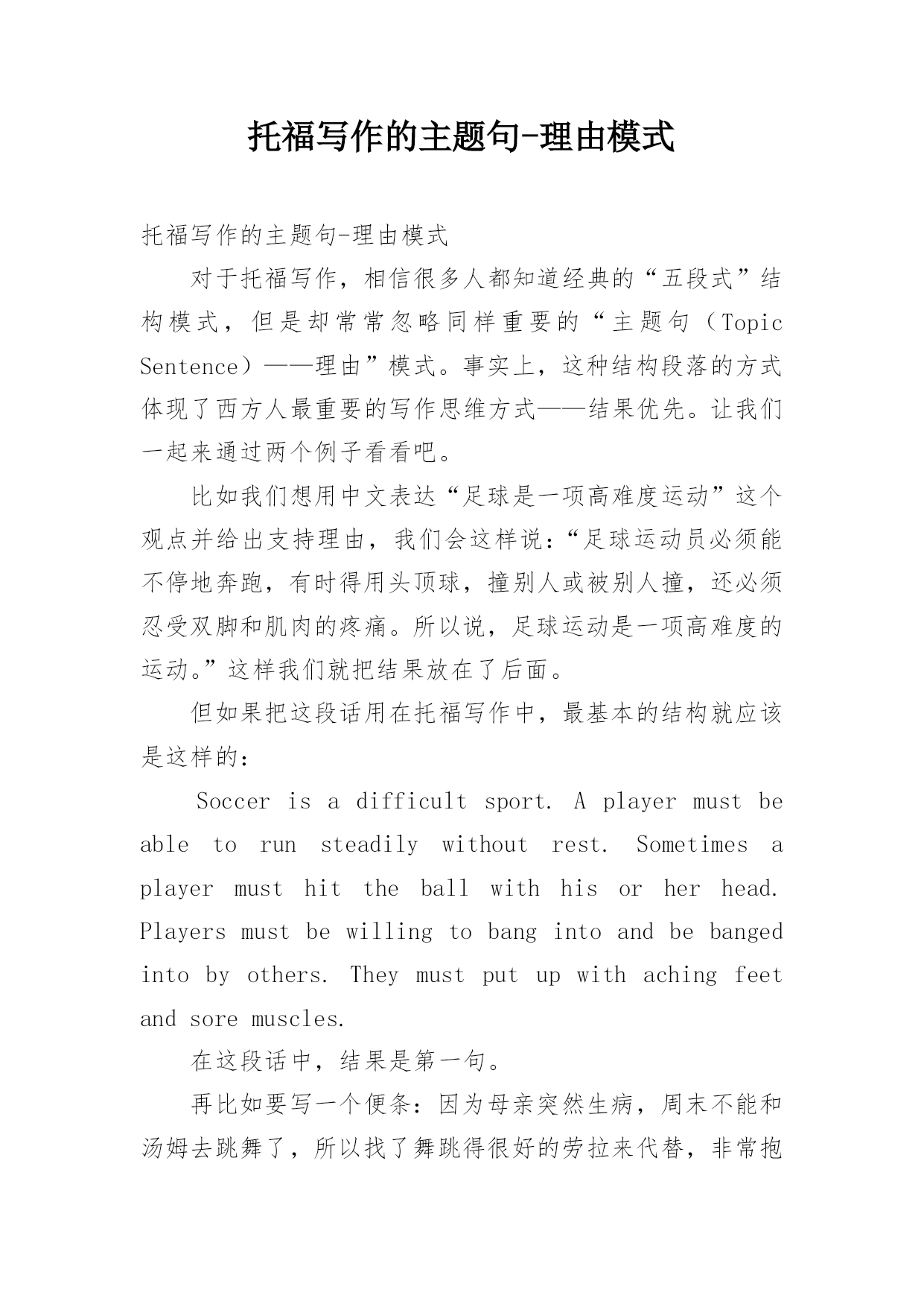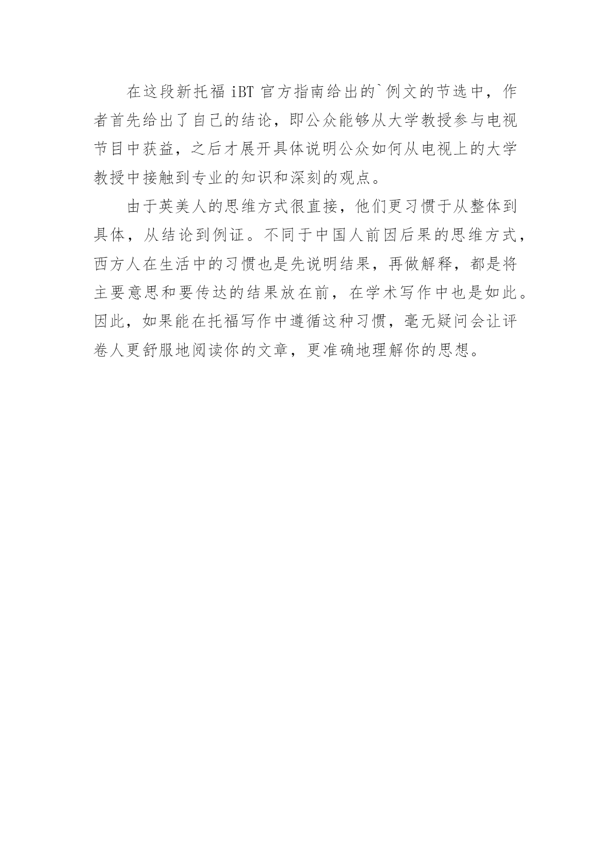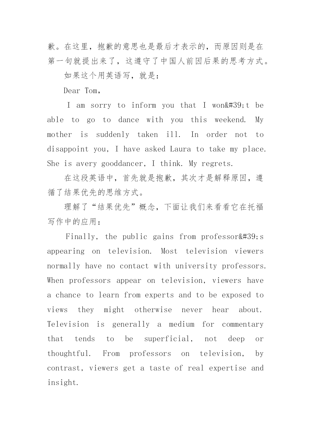 托福写作的主题句-理由模式 托福写作的主题句-理由模式对于托福写作,相信很多人都知道经典的“五段式”结构模式,但是却常常忽略同样重要的“主题句(TopicSentence)——理由”模式。事实上,这种结构段落的方式体现了西方人最重要的写作思维方式——结果优先。让我们一起来通过两个例子看看吧。比如我们想用中文表达“足球是一项高难度运动”这个观点并给出支持理由,我们会这样说:“足球运动员必须能不停地奔跑,有时得用头顶球,撞别人或被别人撞,还必须忍受双脚和肌肉的疼痛。所以说,足球运动是一项高难度的运动。”这样我们就把结果放在了后面。但如果把这段话用在托福写作中,最基本的结构就应该是这样的:Soccerisadifficultsport.Aplayermustbeabletorunsteadilywithoutrest.Sometimesaplayermusthittheballwithhisorherhead.Playersmustbewillingtobangintoandbebangedintobyothers.Theymustputupwithachingfeetandsoremuscles.在这段话中,结果是第一句。再比如要写一个便条:因为母亲突然生病,周末不能和汤姆去跳舞了,所以找了舞跳得很好的劳拉来代替,非常抱歉。在这里,抱歉的意思也是最后才表示的,而原因则是在第一句就提出来了,这遵守了中国人前因后果的思考方式。如果这个用英语写,就是:DearTom,IamsorrytoinformyouthatIwon'tbeabletogotodancewithyouthisweekend.Mymotherissuddenlytakenill.Inordernottodisappointyou,IhaveaskedLauratotakemyplace.Sheisaverygooddancer,Ithink.Myregrets.在这段英语中,首先就是抱歉,其次才是解释原因,遵循了结果优先的思维方式。理解了“结果优先”概念,下面让我们来看看它在托福写作中的应用:Finally,thepublicgainsfromprofessor'sappearingontelevision.Mosttelevisionviewersnormallyhavenocontactwithuniversityprofessors.Whenprofessorsappearontelevision,viewershaveachancetolearnfromexpertsandtobeexposedtoviewstheymightotherwiseneverhearabout.Televisionisgenerallyamediumforcommentarythattendstobesuperficial,notdeeporthoughtful.Fromprofessorsontelevision,bycontrast,viewersgetatasteofrealexpertiseandinsight.在这段新托福iBT官方指南给出的`例文的节选中,作者首先给出了自己的结论,即公众能够从大学教授参与电视节目中获益,之后才展开具体说明公众如何从电视上的大学教授中接触到专业的知识和深刻的观点。由于英美人的思维方式很直接,他们更习惯于从整体到具体,从结论到例证。不同于中国人前因后果的思维方式,西方人在生活中的习惯也是先说明结果,再做解释,都是将主要意思和要传达的结果放在前,在学术写作中也是如此。因此,如果能在托福写作中遵循这种习惯,毫无疑问会让评卷人更舒服地阅读你的文章,更准确地理解你的思想。