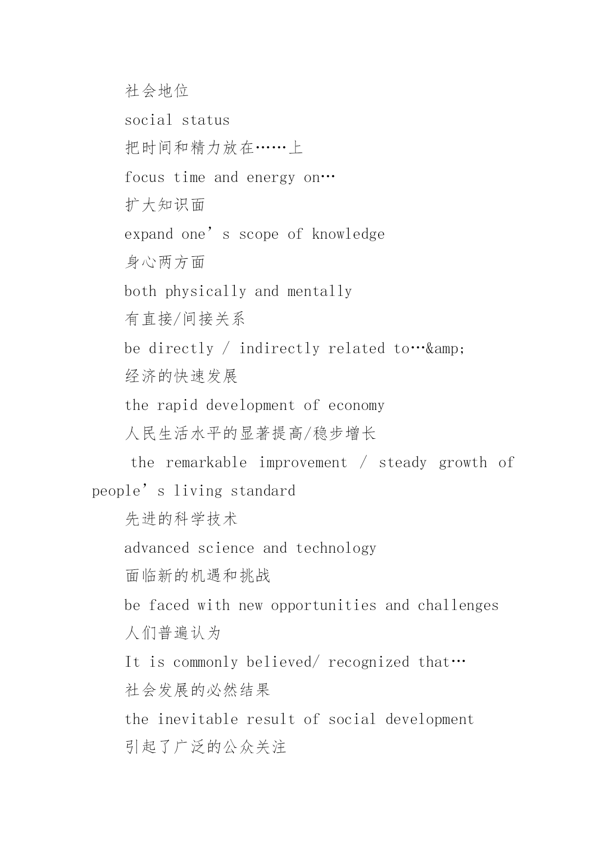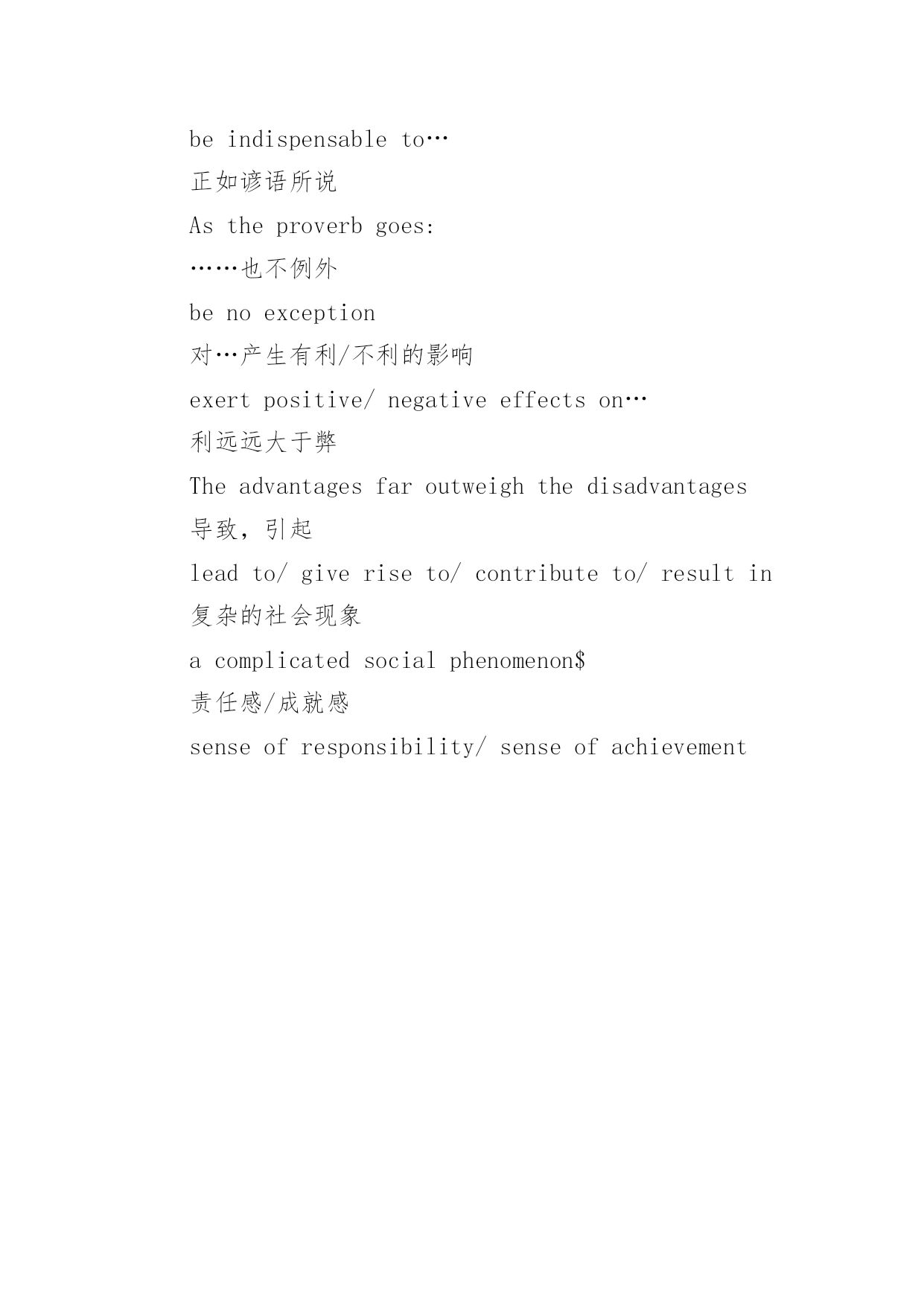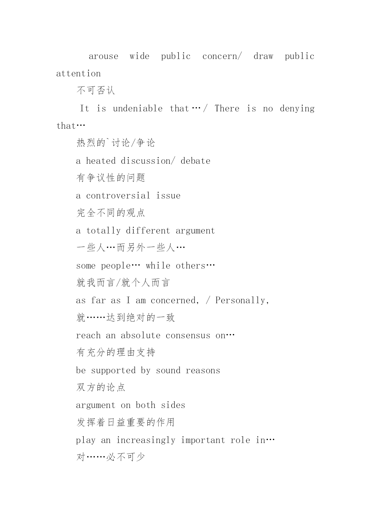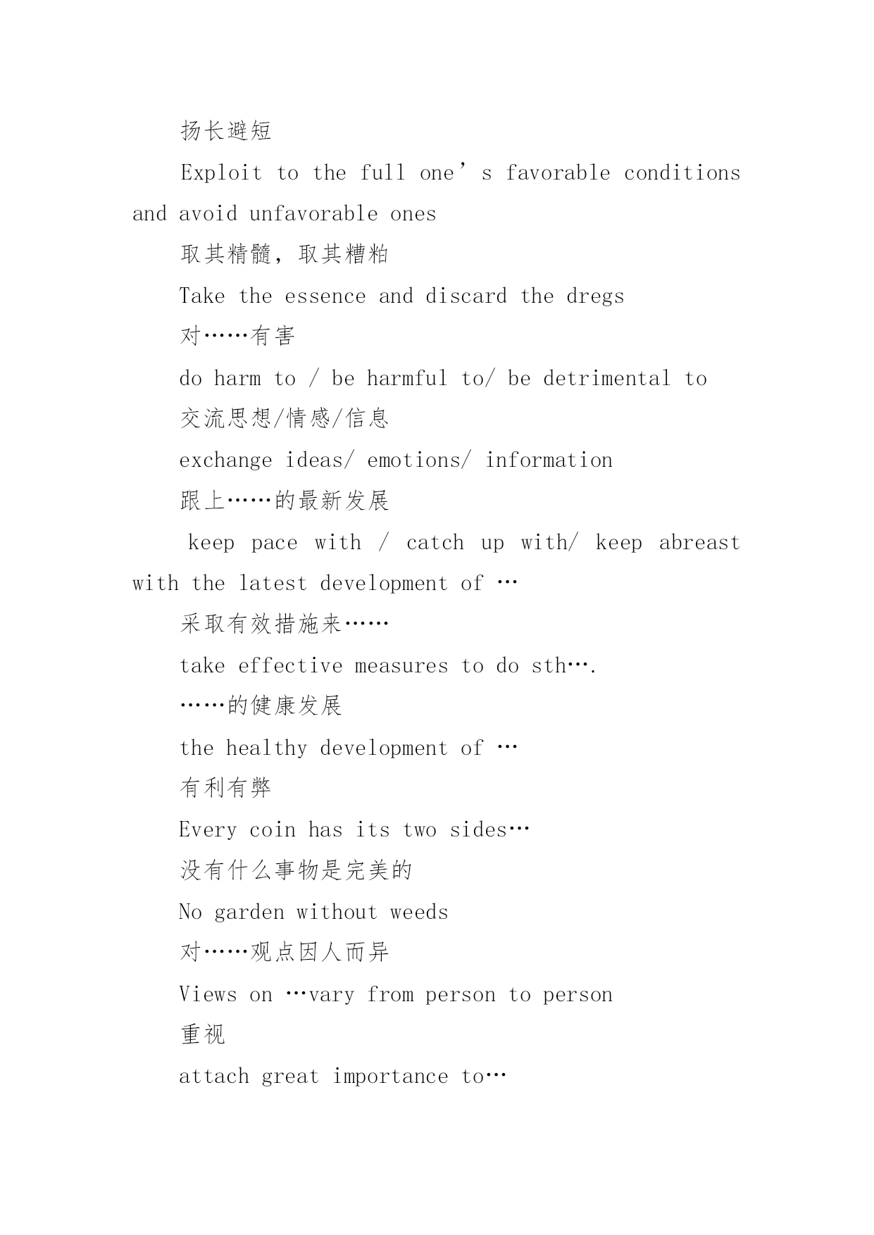 托福写作当中遇到的词汇分析 托福写作当中遇到的词汇分析支持前/后种观点的人people/thoseinfavoroftheformer/latteropinion4}有/提供如下理由/证据have/providethefollowingreasons/evidence在一定程度上tosomeextent/degree/insomeway理论和实践相结合integratetheorywithpractice……必然趋势anirresistibletrendof…日益激烈的社会竞争theincreasinglyfiercesocialcompetition眼前利益immediateinterest/short-terminterest长远利益interestinthelongrun有其自身的优缺点hasitsmeritsanddemerits/advantagesanddisadvantages扬长避短Exploittothefullone’sfavorableconditionsandavoidunfavorableones取其精髓,取其糟粕Taketheessenceanddiscardthedregs对……有害doharmto/beharmfulto/bedetrimentalto交流思想/情感/信息exchangeideas/emotions/information跟上……的最新发展keeppacewith/catchupwith/keepabreastwiththelatestdevelopmentof…采取有效措施来……takeeffectivemeasurestodosth….……的健康发展thehealthydevelopmentof…有利有弊Everycoinhasitstwosides…没有什么事物是完美的Nogardenwithoutweeds对……观点因人而异Viewson…varyfrompersontoperson重视attachgreatimportanceto…社会地位socialstatus把时间和精力放在……上focustimeandenergyon…扩大知识面expandone’sscopeofknowledge身心两方面bothphysicallyandmentally有直接/间接关系bedirectly/indirectlyrelatedto…&经济的快速发展therapiddevelopmentofeconomy人民生活水平的显著提高/稳步增长theremarkableimprovement/steadygrowthofpeople’slivingstandard先进的科学技术advancedscienceandtechnology面临新的机遇和挑战befacedwithnewopportunitiesandchallenges人们普遍认为Itiscommonlybelieved/recognizedthat…社会发展的必然结果theinevitableresultofsocialdevelopment引起了广泛的公众关注arousewidepublicconcern/drawpublicattention不可否认Itisundeniablethat…/Thereisnodenyingthat…热烈的`讨论/争论aheateddiscussion/debate有争议性的问题acontroversialissue完全不同的观点atotallydifferentargument一些人…而另外一些人…somepeople…whileothers…就我而言/就个人而言asfarasIamconcerned,/Personally,就……达到绝对的一致reachanabsoluteconsensuson…有充分的理由支持besupportedbysoundreasons双方的论点argumentonbothsides发挥着日益重要的作用playanincreasinglyimportantrolein…对……必不可少beindispensableto…正如谚语所说Astheproverbgoes:……也不例外benoexception对…产生有利/不利的影响exertpositive/negativeeffectson…利远远大于弊Theadvantagesfaroutweighthedisadvantages导致,引起leadto/giveriseto/contributeto/resultin复杂的社会现象acomplicatedsocialphenomenon$责任感/成就感senseofresponsibility/senseofachievement