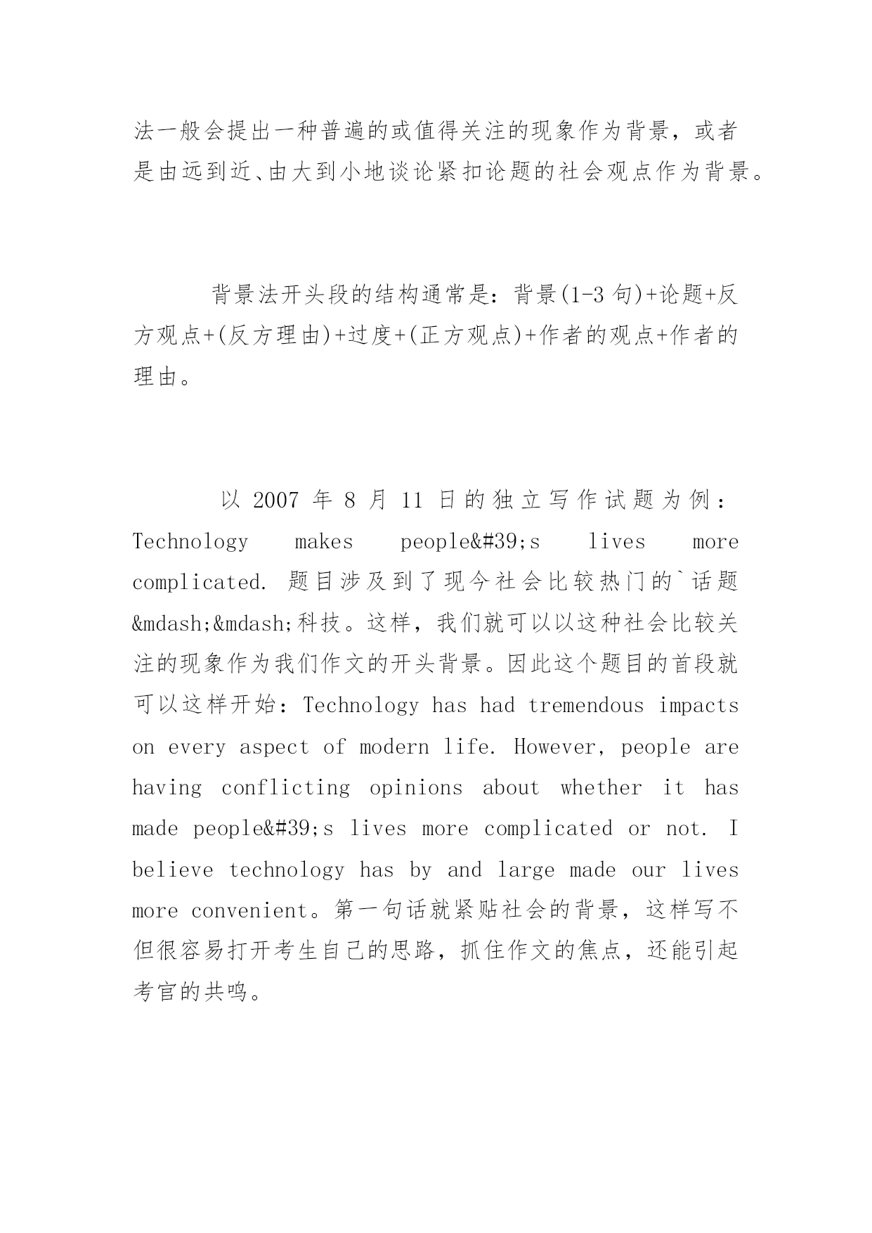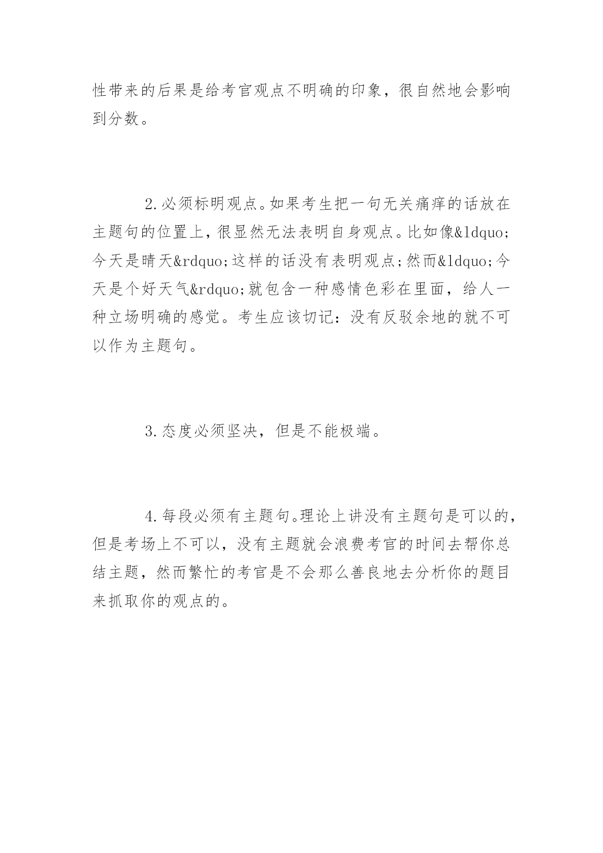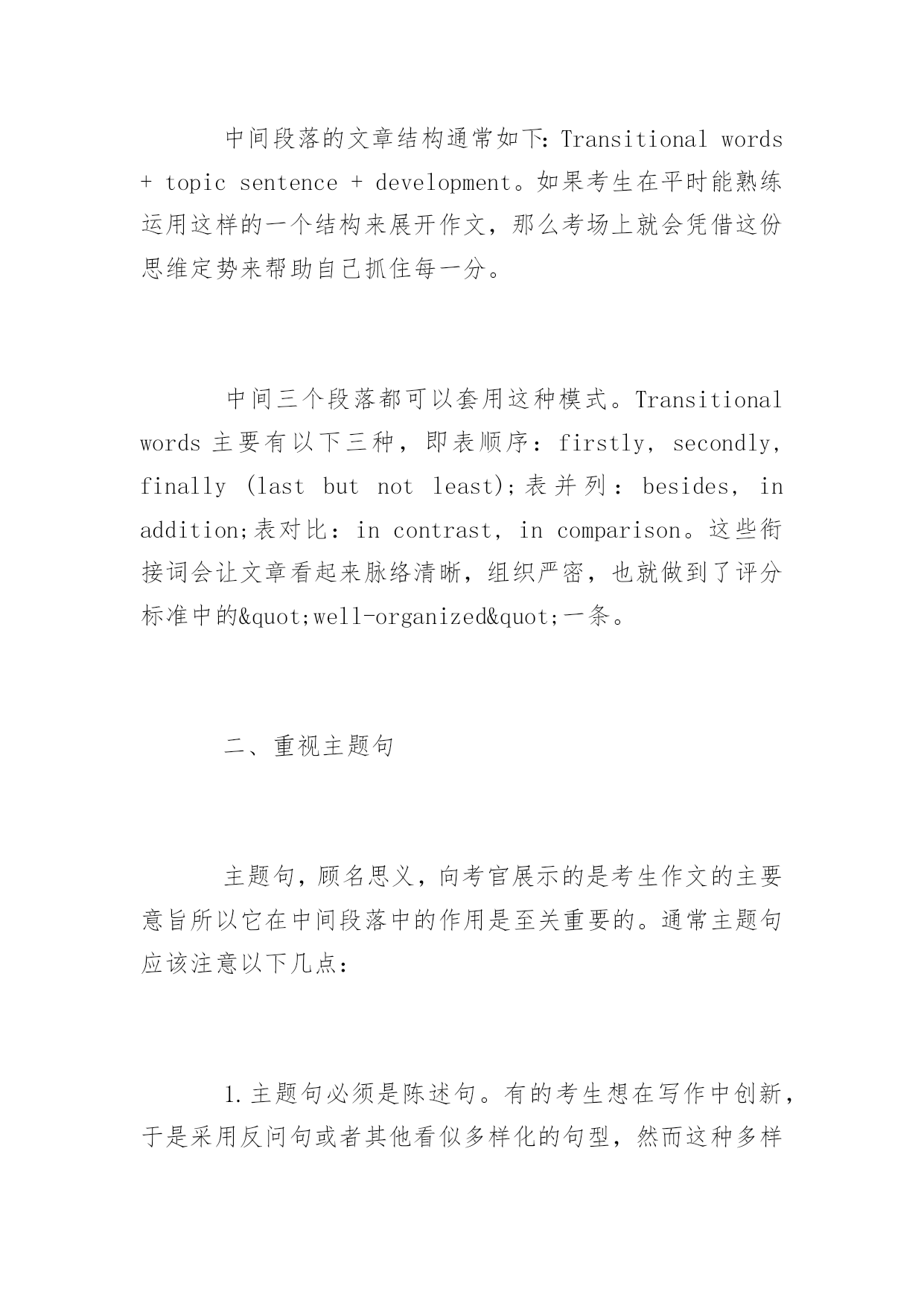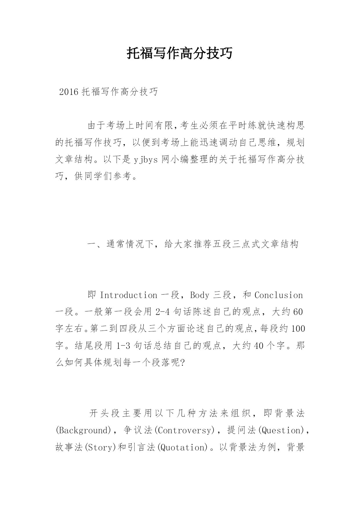 托福写作高分技巧 2016托福写作高分技巧 由于考场上时间有限,考生必须在平时练就快速构思的托福写作技巧,以便到考场上能迅速调动自己思维,规划文章结构。以下是yjbys网小编整理的关于托福写作高分技巧,供同学们参考。 一、通常情况下,给大家推荐五段三点式文章结构 即Introduction一段,Body三段,和Conclusion一段。一般第一段会用2-4句话陈述自己的观点,大约60字左右。第二到四段从三个方面论述自己的观点,每段约100字。结尾段用1-3句话总结自己的观点,大约40个字。那么如何具体规划每一个段落呢? 开头段主要用以下几种方法来组织,即背景法(Background),争议法(Controversy),提问法(Question),故事法(Story)和引言法(Quotation)。以背景法为例,背景法一般会提出一种普遍的或值得关注的现象作为背景,或者是由远到近、由大到小地谈论紧扣论题的社会观点作为背景。 背景法开头段的结构通常是:背景(1-3句)+论题+反方观点+(反方理由)+过度+(正方观点)+作者的观点+作者的理由。 以2007年8月11日的独立写作试题为例:Technologymakespeople'slivesmorecomplicated.题目涉及到了现今社会比较热门的`话题——科技。这样,我们就可以以这种社会比较关注的现象作为我们作文的开头背景。因此这个题目的首段就可以这样开始:Technologyhashadtremendousimpactsoneveryaspectofmodernlife.However,peoplearehavingconflictingopinionsaboutwhetherithasmadepeople'slivesmorecomplicatedornot.Ibelievetechnologyhasbyandlargemadeourlivesmoreconvenient。第一句话就紧贴社会的背景,这样写不但很容易打开考生自己的思路,抓住作文的焦点,还能引起考官的共鸣。 中间段落的文章结构通常如下:Transitionalwords+topicsentence+development。如果考生在平时能熟练运用这样的一个结构来展开作文,那么考场上就会凭借这份思维定势来帮助自己抓住每一分。 中间三个段落都可以套用这种模式。Transitionalwords主要有以下三种,即表顺序:firstly,secondly,finally(lastbutnotleast);表并列:besides,inaddition;表对比:incontrast,incomparison。这些衔接词会让文章看起来脉络清晰,组织严密,也就做到了评分标准中的"well-organized"一条。 二、重视主题句 主题句,顾名思义,向考官展示的是考生作文的主要意旨所以它在中间段落中的作用是至关重要的。通常主题句应该注意以下几点: 1.主题句必须是陈述句。有的考生想在写作中创新,于是采用反问句或者其他看似多样化的句型,然而这种多样性带来的后果是给考官观点不明确的印象,很自然地会影响到分数。 2.必须标明观点。如果考生把一句无关痛痒的话放在主题句的位置上,很显然无法表明自身观点。比如像“今天是晴天”这样的话没有表明观点;然而“今天是个好天气”就包含一种感情色彩在里面,给人一种立场明确的感觉。考生应该切记:没有反驳余地的就不可以作为主题句。 3.态度必须坚决,但是不能极端。 4.每段必须有主题句。理论上讲没有主题句是可以的,但是考场上不可以,没有主题就会浪费考官的时间去帮你总结主题,然而繁忙的考官是不会那么善良地去分析你的题目来抓取你的观点的。