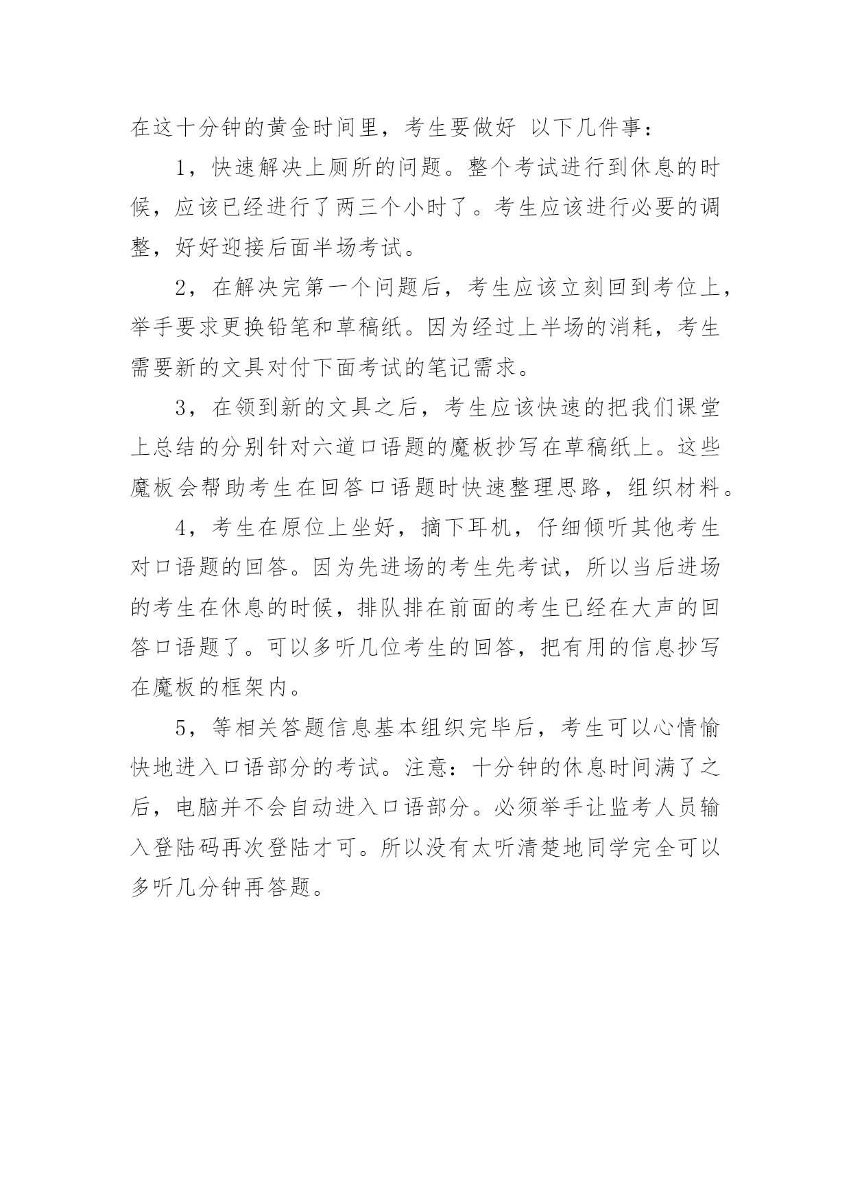 托福口语考试技巧分享 托福口语考试技巧分享古人云:观千剑而后识器。想要破解新托福口语部分,我们首先把托福考试与托福考试做一个横向的对比。我们发现,托福的口语部分一般由考官来主导考察过程。考官的作用体现在两方面:1,当考生由于紧张等原因无法发挥出水平时,考官会尽量提供帮助,诱导该考生发挥出真实的水平。2,当考生对考题作了充分的研究准备,并按照事先准备的回答流畅的进行背诵时,考官会主动打断该考生的背诵,且有意转换到生僻话题。目的仍然是要考察该考生真实的英语水平。由此可知,在托福口语考试中,侧重进行考察的是conversation,即真实的交流,交谈能力。但是,托福的口语考试与此恰恰相反。因为没有考官的参与,整个的考察过程更类似于一个presentation.考生只要围绕考题进行回答,整个的回答过程都不会被打扰。这就意味着:提前准备好回答的魔板,完全可以大大减低口语回答的难度。具体操作流程如下:首先,考生们在排队进入考场时,要尽可能选择中间靠后的位置。这个排序非常重要。因为在国内绝大部分的'考场中,考生参加考试的顺序就是由排队的顺序决定的。换句话说,先进入考场的考生先进行考试。在考完阅读和听力后,考生将会有十分钟的强制休息的时间。在这十分钟的黄金时间里,考生要做好以下几件事:1,快速解决上厕所的问题。整个考试进行到休息的时候,应该已经进行了两三个小时了。考生应该进行必要的调整,好好迎接后面半场考试。2,在解决完第一个问题后,考生应该立刻回到考位上,举手要求更换铅笔和草稿纸。因为经过上半场的消耗,考生需要新的文具对付下面考试的笔记需求。3,在领到新的文具之后,考生应该快速的把我们课堂上总结的分别针对六道口语题的魔板抄写在草稿纸上。这些魔板会帮助考生在回答口语题时快速整理思路,组织材料。4,考生在原位上坐好,摘下耳机,仔细倾听其他考生对口语题的回答。因为先进场的考生先考试,所以当后进场的考生在休息的时候,排队排在前面的考生已经在大声的回答口语题了。可以多听几位考生的回答,把有用的信息抄写在魔板的框架内。5,等相关答题信息基本组织完毕后,考生可以心情愉快地进入口语部分的考试。注意:十分钟的休息时间满了之后,电脑并不会自动进入口语部分。必须举手让监考人员输入登陆码再次登陆才可。所以没有太听清楚地同学完全可以多听几分钟再答题。