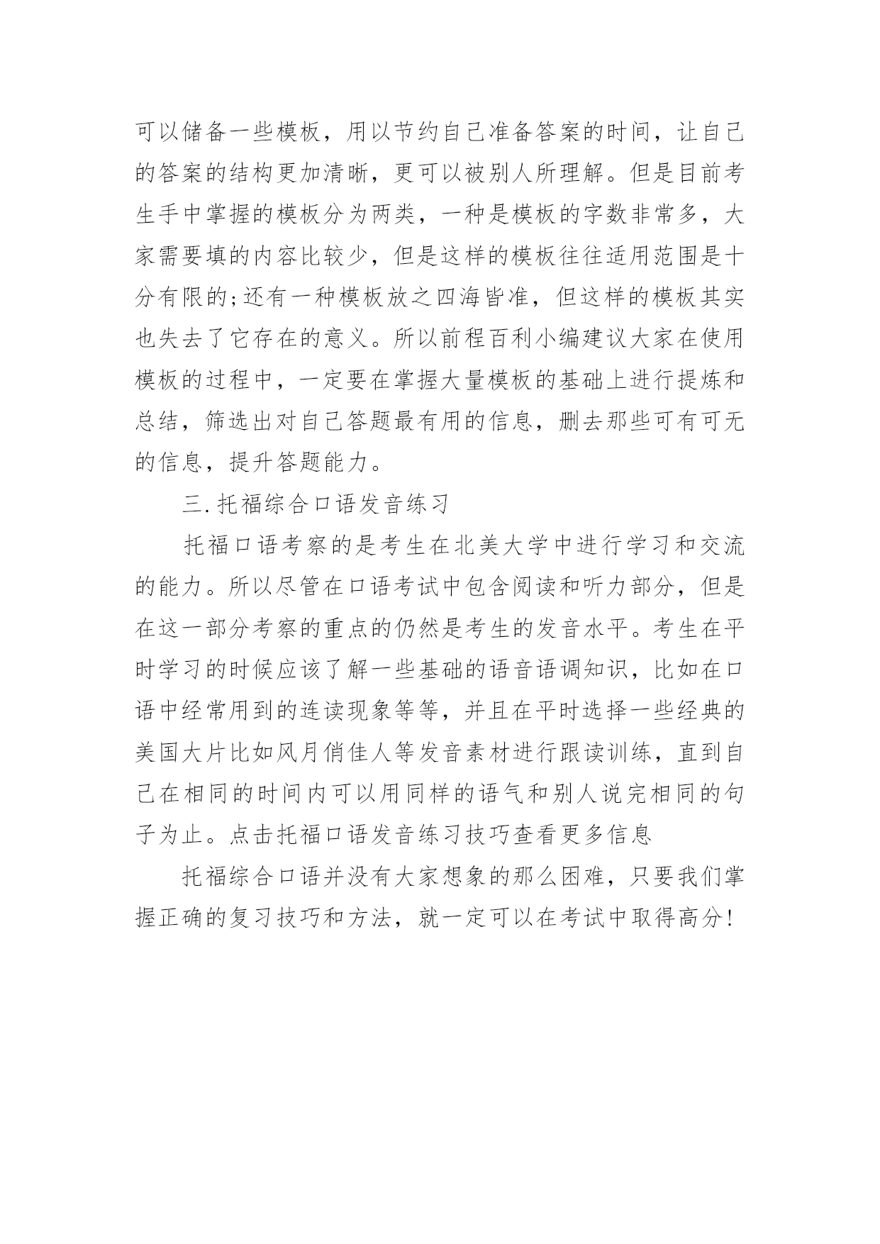 托福听力口语如何复习 托福听力口语如何复习在托福口语考试中包含独立口语和综合口语两部分。对于很多考生而言,托福综合口语一直是一个难点,很多考生宁愿做十道独立口语题目都不愿意做一道综合口语题。托福综合口语考试中的阅读题一般比较简单,所以本次前程百利小编主要从提升托福听力水平,准备自己的专有模板,和进行发音练习三个方面来进行解析。一.提升托福听力水平从托福口语task3开始,托福口语考试就进开始了对于考生听力能力的考察,考生听力水平的好坏,直接关系到考生在综合口语部分得分的多少。所以考生如果想在托福口语考试中取得高分,就应该着重提升就是自己的听力能力。因为在听力部分,考生一秒钟要听3~4个词,所以小编建议考生在备考的时候增强词汇储备,并且因为口语考试的听力中经常出现艺术类,生命科学或者自然科学类的文章,小编也建议考生在平时多多关注关于这些领域的信息。最重要的是,考生在平时一定要充分利用TPO的.资源进行听写练习,锻炼自己对单词的反应力,提升听力水平。二.准备自己的专有模板托福口语考试中的综合口语部分,需要考生根据阅读和听力中的信息来整理自己的答案,而且在综合口语考试中留给考生准备的时间特别少,所以小编建议大家在备考的时候可以储备一些模板,用以节约自己准备答案的时间,让自己的答案的结构更加清晰,更可以被别人所理解。但是目前考生手中掌握的模板分为两类,一种是模板的字数非常多,大家需要填的内容比较少,但是这样的模板往往适用范围是十分有限的;还有一种模板放之四海皆准,但这样的模板其实也失去了它存在的意义。所以前程百利小编建议大家在使用模板的过程中,一定要在掌握大量模板的基础上进行提炼和总结,筛选出对自己答题最有用的信息,删去那些可有可无的信息,提升答题能力。三.托福综合口语发音练习托福口语考察的是考生在北美大学中进行学习和交流的能力。所以尽管在口语考试中包含阅读和听力部分,但是在这一部分考察的重点的仍然是考生的发音水平。考生在平时学习的时候应该了解一些基础的语音语调知识,比如在口语中经常用到的连读现象等等,并且在平时选择一些经典的美国大片比如风月俏佳人等发音素材进行跟读训练,直到自己在相同的时间内可以用同样的语气和别人说完相同的句子为止。点击托福口语发音练习技巧查看更多信息托福综合口语并没有大家想象的那么困难,只要我们掌握正确的复习技巧和方法,就一定可以在考试中取得高分!