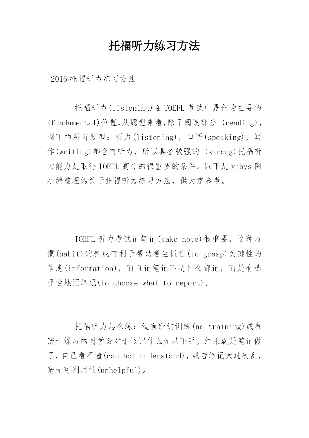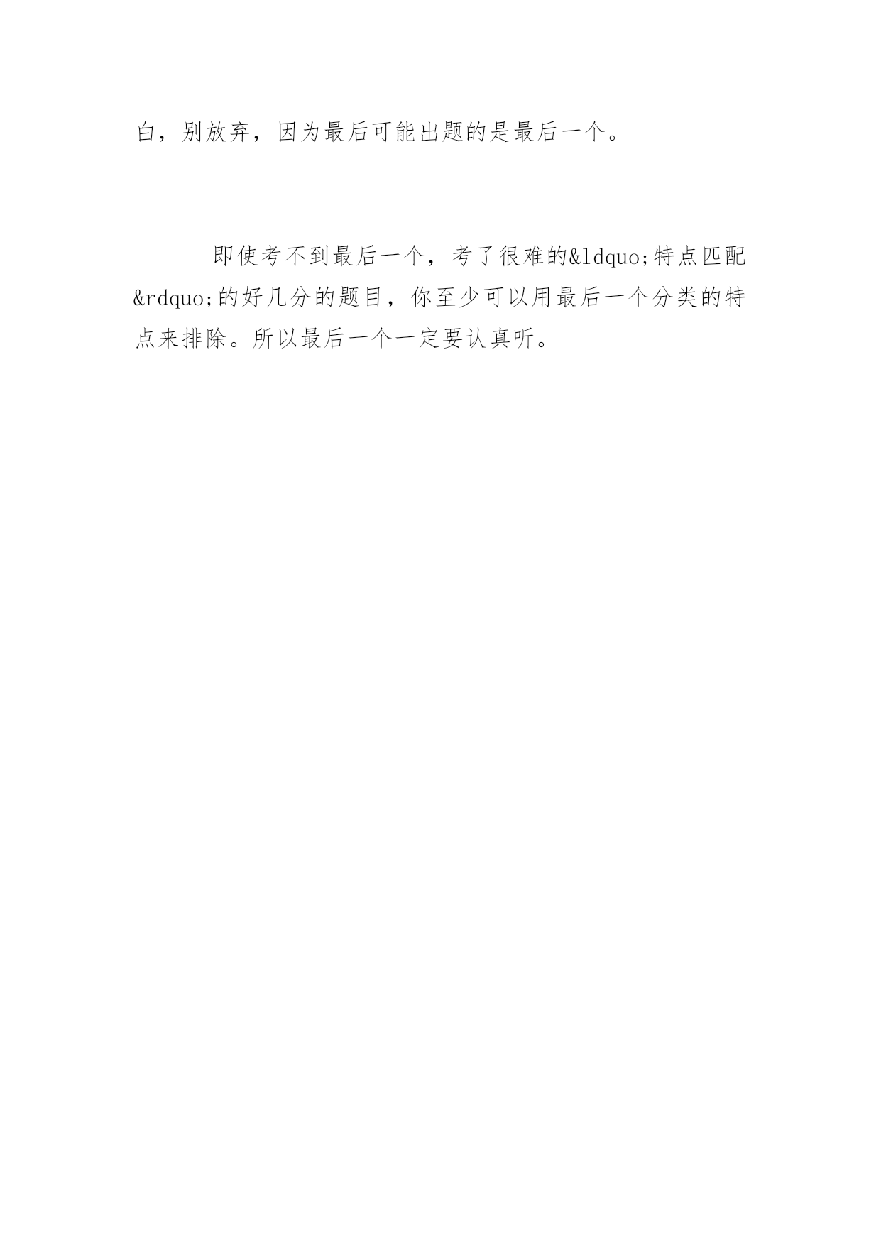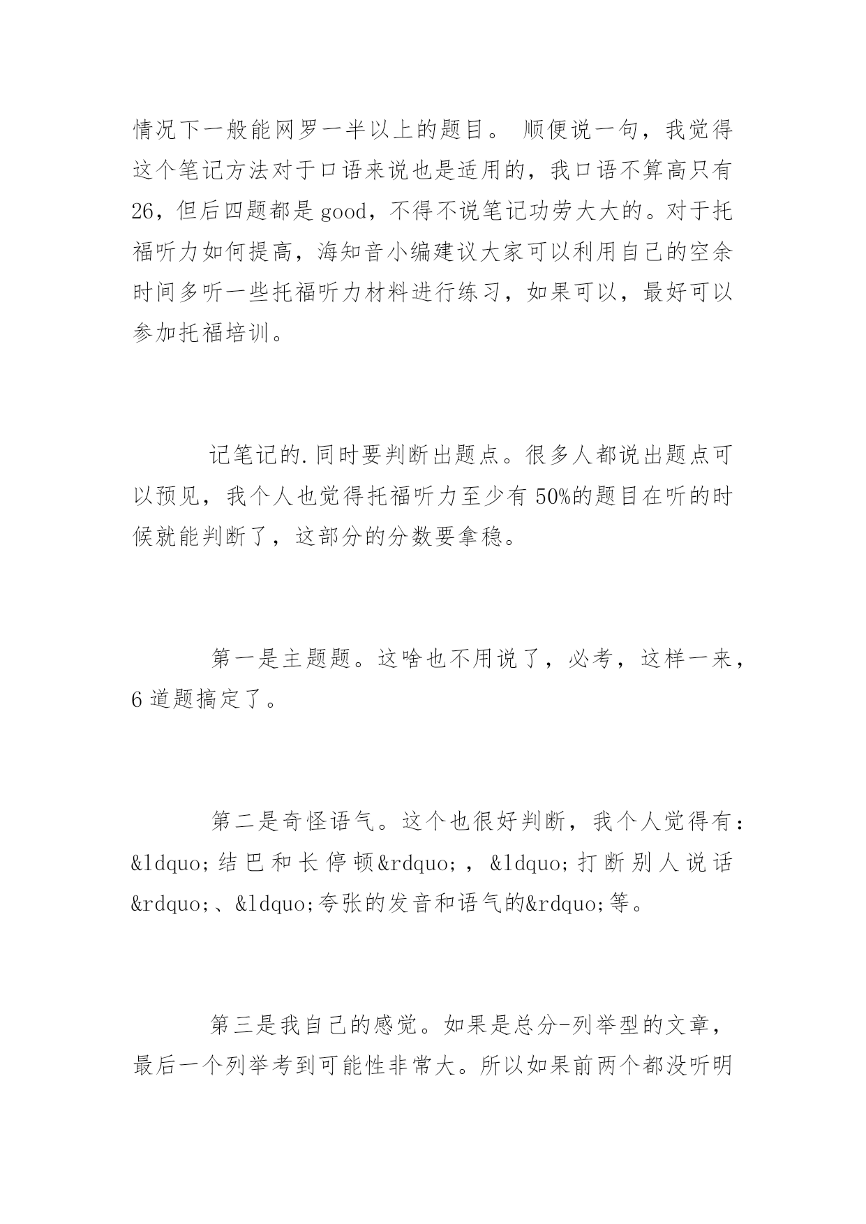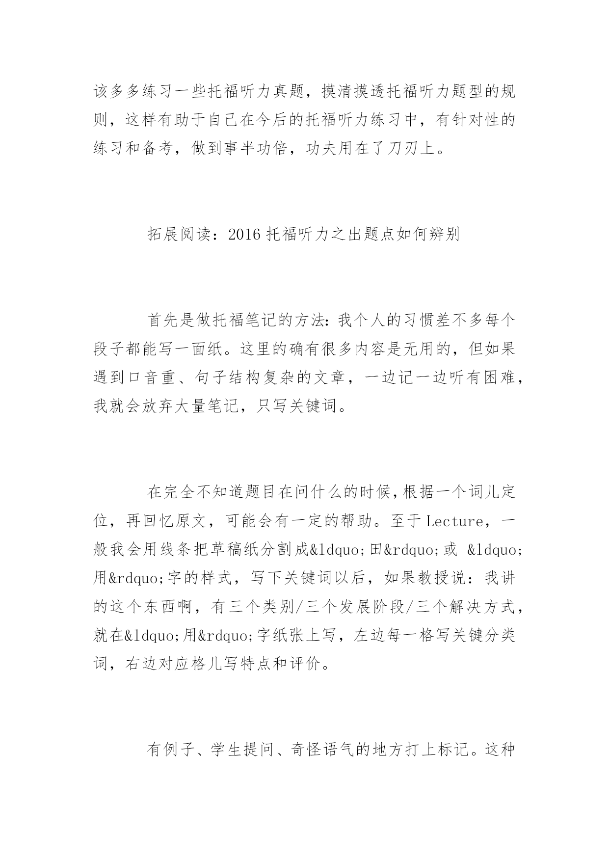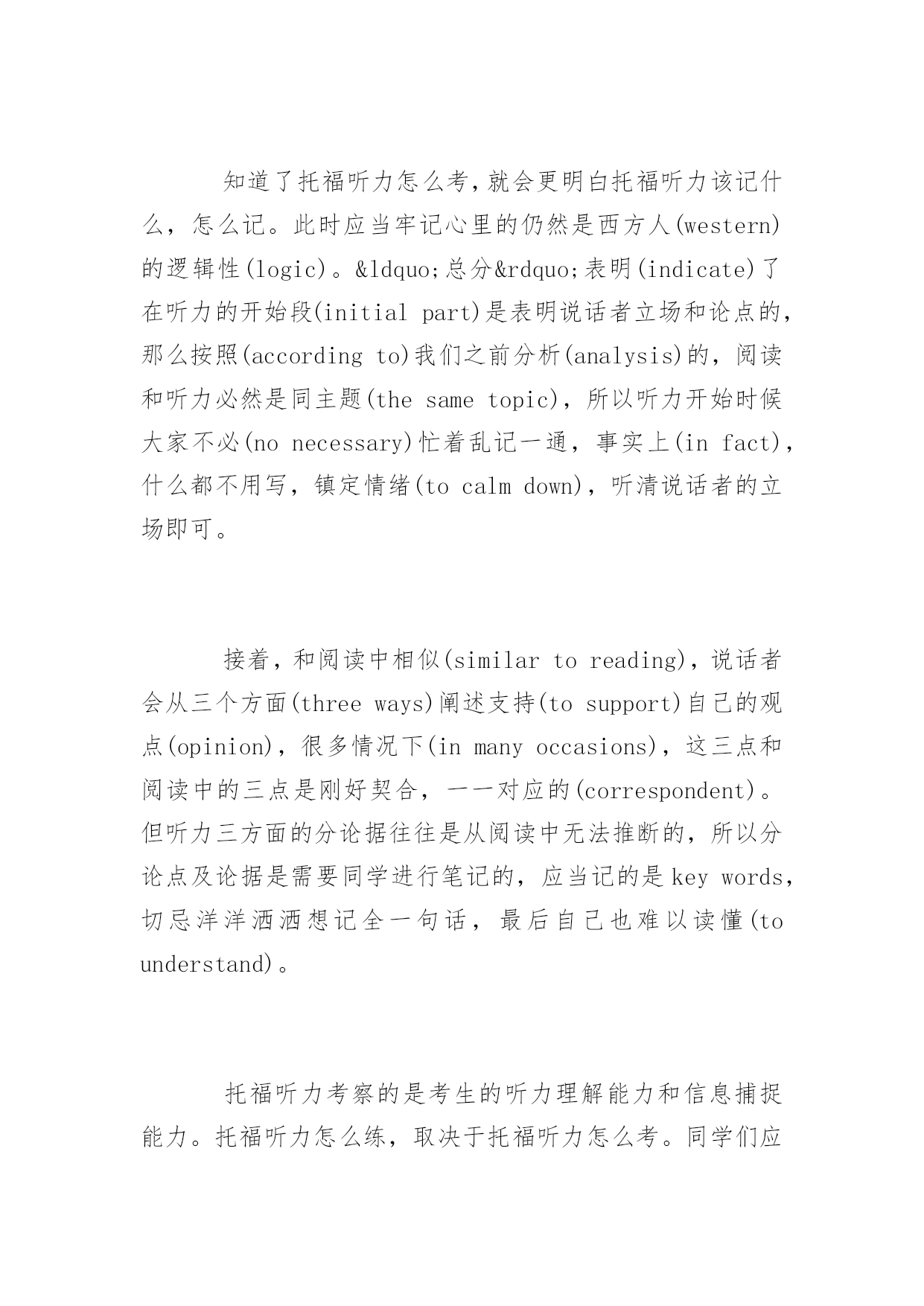 托福听力练习方法 2016托福听力练习方法 托福听力(listening)在TOEFL考试中是作为主导的(fundamental)位置,从题型来看,除了阅读部分(reading),剩下的所有题型:听力(listening),口语(speaking),写作(writing)都含有听力,所以具备较强的(strong)托福听力能力是取得TOEFL高分的很重要的条件。以下是yjbys网小编整理的关于托福听力练习方法,供大家参考。 TOEFL听力考试记笔记(takenote)很重要,这种习惯(habit)的养成有利于帮助考生抓住(tograsp)关键性的信息(information),而且记笔记不是什么都记,而是有选择性地记笔记(tochoosewhattoreport)。 托福听力怎么练:没有经过训练(notraining)或者疏于练习的同学会对于该记什么无从下手,结果就是笔记做了,自己看不懂(cannotunderstand),或者笔记太过凌乱,毫无可利用性(unhelpful)。 知道了托福听力怎么考,就会更明白托福听力该记什么,怎么记。此时应当牢记心里的仍然是西方人(western)的逻辑性(logic)。“总分”表明(indicate)了在听力的开始段(initialpart)是表明说话者立场和论点的,那么按照(accordingto)我们之前分析(analysis)的,阅读和听力必然是同主题(thesametopic),所以听力开始时候大家不必(nonecessary)忙着乱记一通,事实上(infact),什么都不用写,镇定情绪(tocalmdown),听清说话者的立场即可。 接着,和阅读中相似(similartoreading),说话者会从三个方面(threeways)阐述支持(tosupport)自己的观点(opinion),很多情况下(inmanyoccasions),这三点和阅读中的三点是刚好契合,一一对应的(correspondent)。但听力三方面的分论据往往是从阅读中无法推断的,所以分论点及论据是需要同学进行笔记的,应当记的是keywords,切忌洋洋洒洒想记全一句话,最后自己也难以读懂(tounderstand)。 托福听力考察的是考生的听力理解能力和信息捕捉能力。托福听力怎么练,取决于托福听力怎么考。同学们应该多多练习一些托福听力真题,摸清摸透托福听力题型的规则,这样有助于自己在今后的托福听力练习中,有针对性的练习和备考,做到事半功倍,功夫用在了刀刃上。 拓展阅读:2016托福听力之出题点如何辨别 首先是做托福笔记的方法:我个人的习惯差不多每个段子都能写一面纸。这里的确有很多内容是无用的,但如果遇到口音重、句子结构复杂的文章,一边记一边听有困难,我就会放弃大量笔记,只写关键词。 在完全不知道题目在问什么的时候,根据一个词儿定位,再回忆原文,可能会有一定的帮助。至于Lecture,一般我会用线条把草稿纸分割成“田”或“用”字的样式,写下关键词以后,如果教授说:我讲的这个东西啊,有三个类别/三个发展阶段/三个解决方式,就在“用”字纸张上写,左边每一格写关键分类词,右边对应格儿写特点和评价。 有例子、学生提问、奇怪语气的地方打上标记。这种情况下一般能网罗一半以上的题目。顺便说一句,我觉得这个笔记方法对于口语来说也是适用的,我口语不算高只有26,但后四题都是good,不得不说笔记功劳大大的。对于托福听力如何提高,海知音小编建议大家可以利用自己的空余时间多听一些托福听力材料进行练习,如果可以,最好可以参加托福培训。 记笔记的.同时要判断出题点。很多人都说出题点可以预见,我个人也觉得托福听力至少有50%的题目在听的时候就能判断了,这部分的分数要拿稳。 第一是主题题。这啥也不用说了,必考,这样一来,6道题搞定了。 第二是奇怪语气。这个也很好判断,我个人觉得有:“结巴和长停顿”,“打断别人说话”、“夸张的发音和语气的”等。 第三是我自己的感觉。如果是总分-列举型的文章,最后一个列举考到可能性非常大。所以如果前两个都没听明白,别放弃,因为最后可能出题的是最后一个。 即使考不到最后一个,考了很难的“特点匹配”的好几分的题目,你至少可以用最后一个分类的特点来排除。所以最后一个一定要认真听。