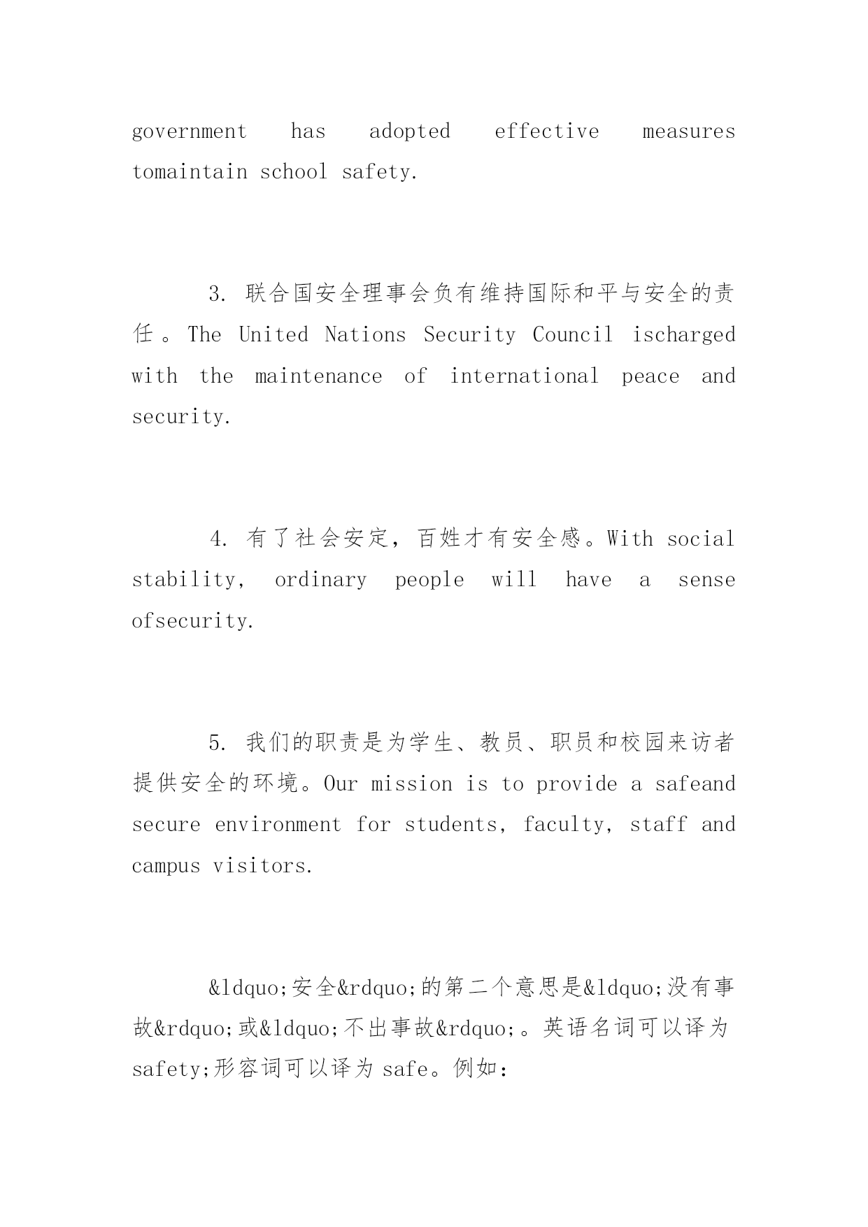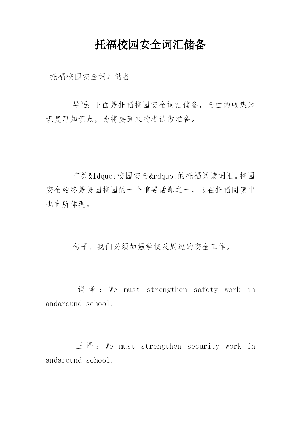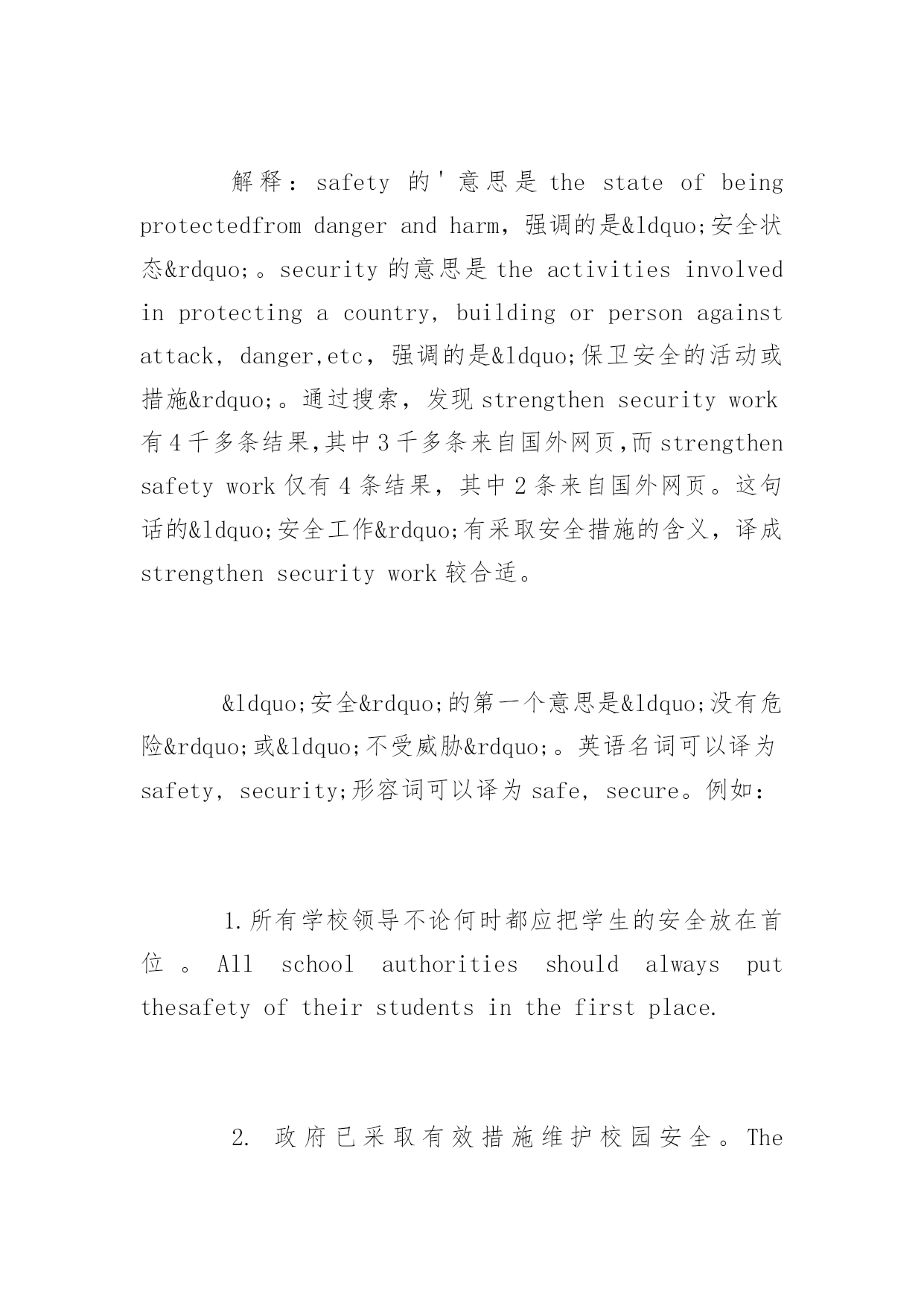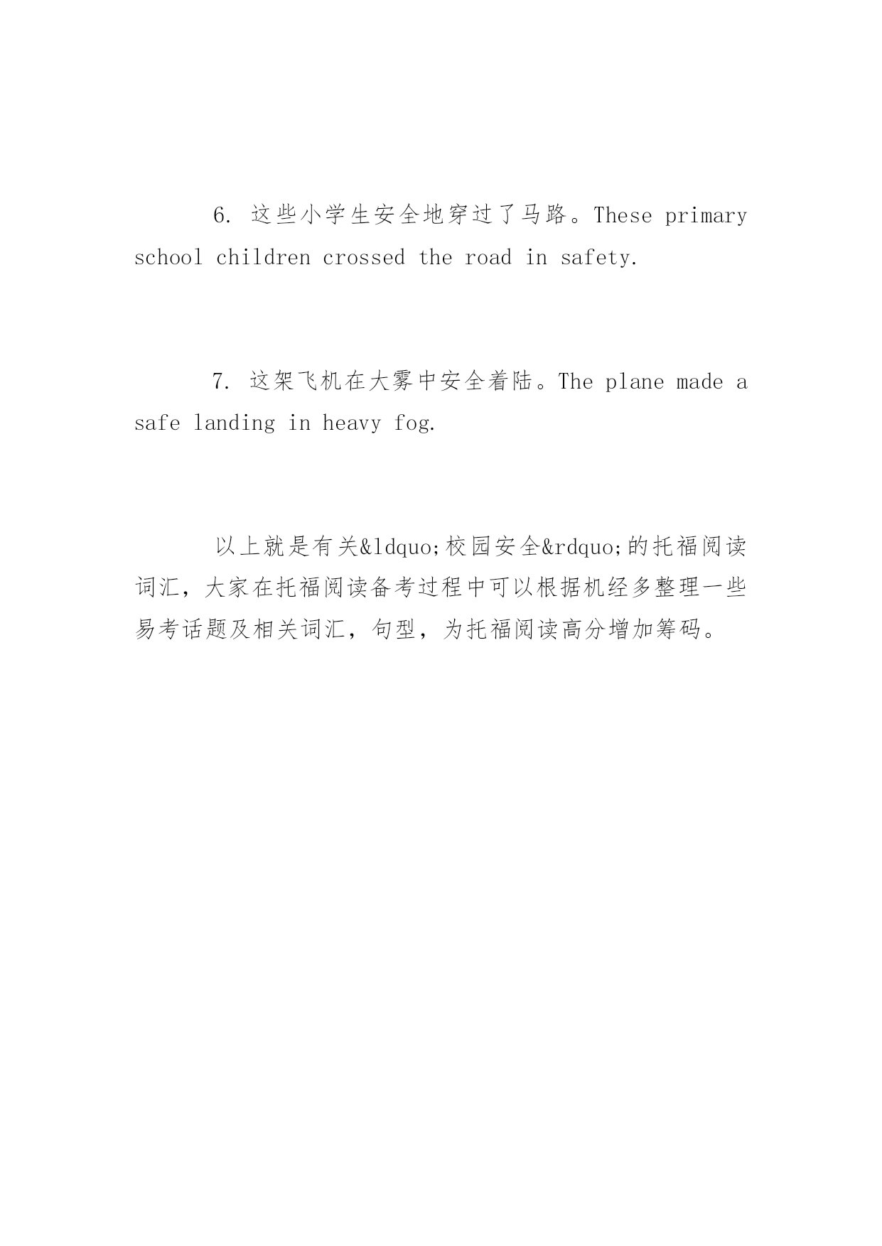 托福校园安全词汇储备 托福校园安全词汇储备 导语:下面是托福校园安全词汇储备,全面的收集知识复习知识点,为将要到来的考试做准备。 有关“校园安全”的托福阅读词汇。校园安全始终是美国校园的一个重要话题之一,这在托福阅读中也有所体现。 句子:我们必须加强学校及周边的安全工作。 误译:Wemuststrengthensafetyworkinandaroundschool. 正译:Wemuststrengthensecurityworkinandaroundschool. 解释:safety的'意思是thestateofbeingprotectedfromdangerandharm,强调的是“安全状态”。security的意思是theactivitiesinvolvedinprotectingacountry,buildingorpersonagainstattack,danger,etc,强调的是“保卫安全的活动或措施”。通过搜索,发现strengthensecuritywork有4千多条结果,其中3千多条来自国外网页,而strengthensafetywork仅有4条结果,其中2条来自国外网页。这句话的“安全工作”有采取安全措施的含义,译成strengthensecuritywork较合适。 “安全”的第一个意思是“没有危险”或“不受威胁”。英语名词可以译为safety,security;形容词可以译为safe,secure。例如: 1.所有学校领导不论何时都应把学生的安全放在首位。Allschoolauthoritiesshouldalwaysputthesafetyoftheirstudentsinthefirstplace. 2.政府已采取有效措施维护校园安全。Thegovernmenthasadoptedeffectivemeasurestomaintainschoolsafety. 3.联合国安全理事会负有维持国际和平与安全的责任。TheUnitedNationsSecurityCouncilischargedwiththemaintenanceofinternationalpeaceandsecurity. 4.有了社会安定,百姓才有安全感。Withsocialstability,ordinarypeoplewillhaveasenseofsecurity. 5.我们的职责是为学生、教员、职员和校园来访者提供安全的环境。Ourmissionistoprovideasafeandsecureenvironmentforstudents,faculty,staffandcampusvisitors. “安全”的第二个意思是“没有事故”或“不出事故”。英语名词可以译为safety;形容词可以译为safe。例如: 6.这些小学生安全地穿过了马路。Theseprimaryschoolchildrencrossedtheroadinsafety. 7.这架飞机在大雾中安全着陆。Theplanemadeasafelandinginheavyfog. 以上就是有关“校园安全”的托福阅读词汇,大家在托福阅读备考过程中可以根据机经多整理一些易考话题及相关词汇,句型,为托福阅读高分增加筹码。