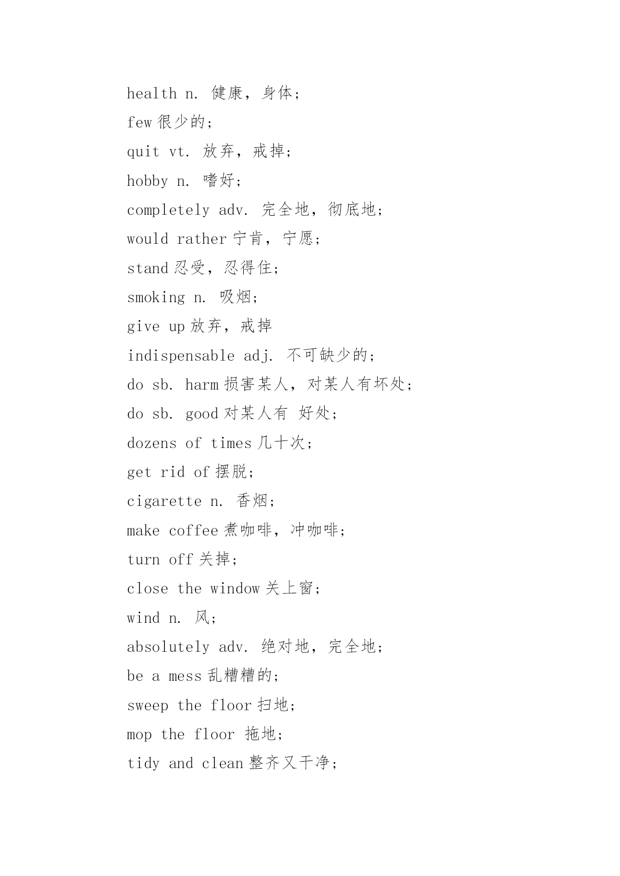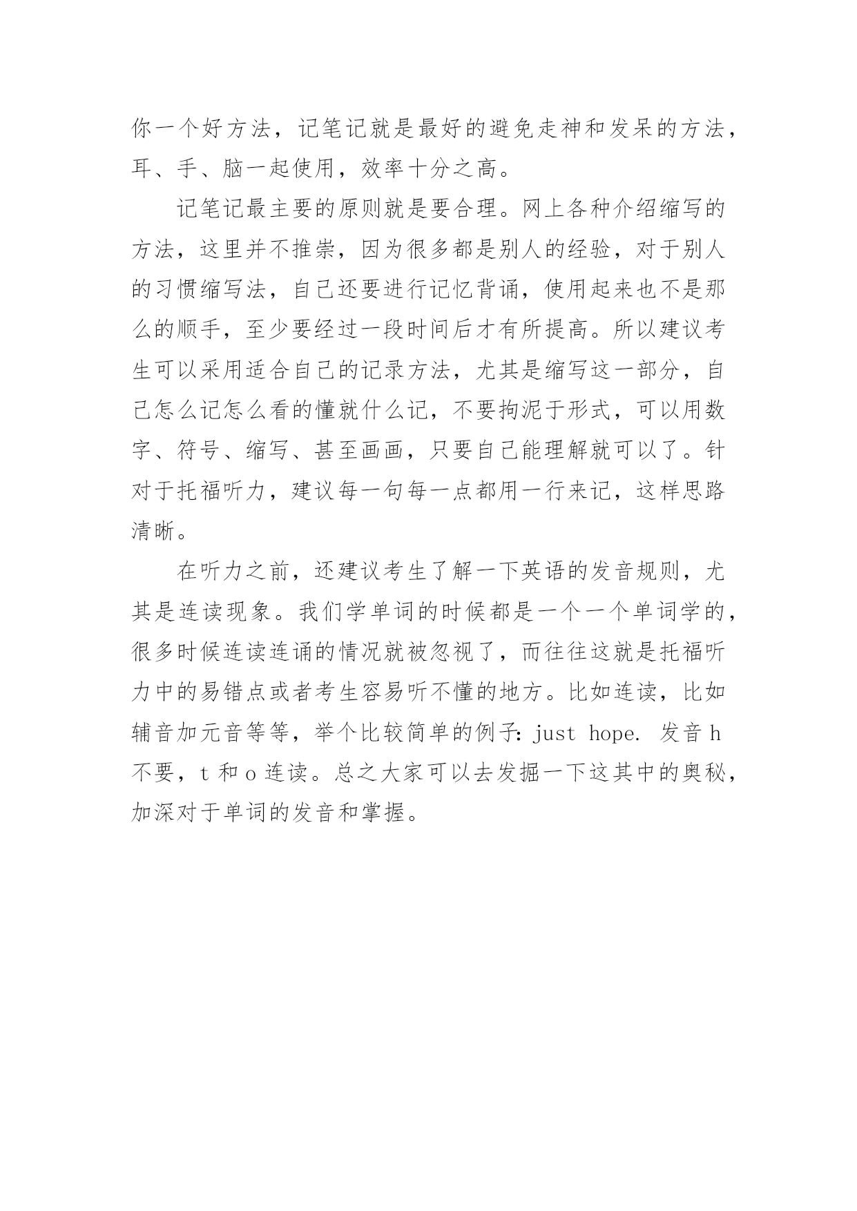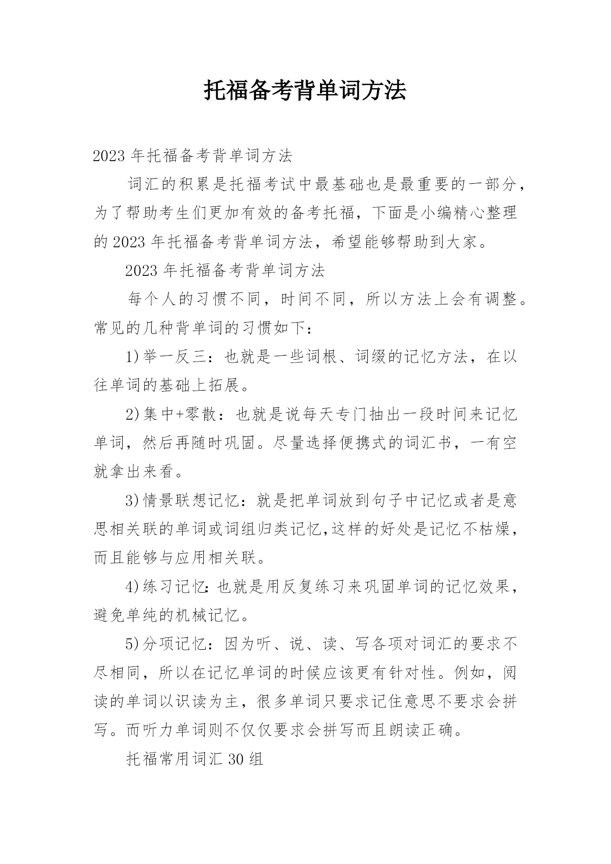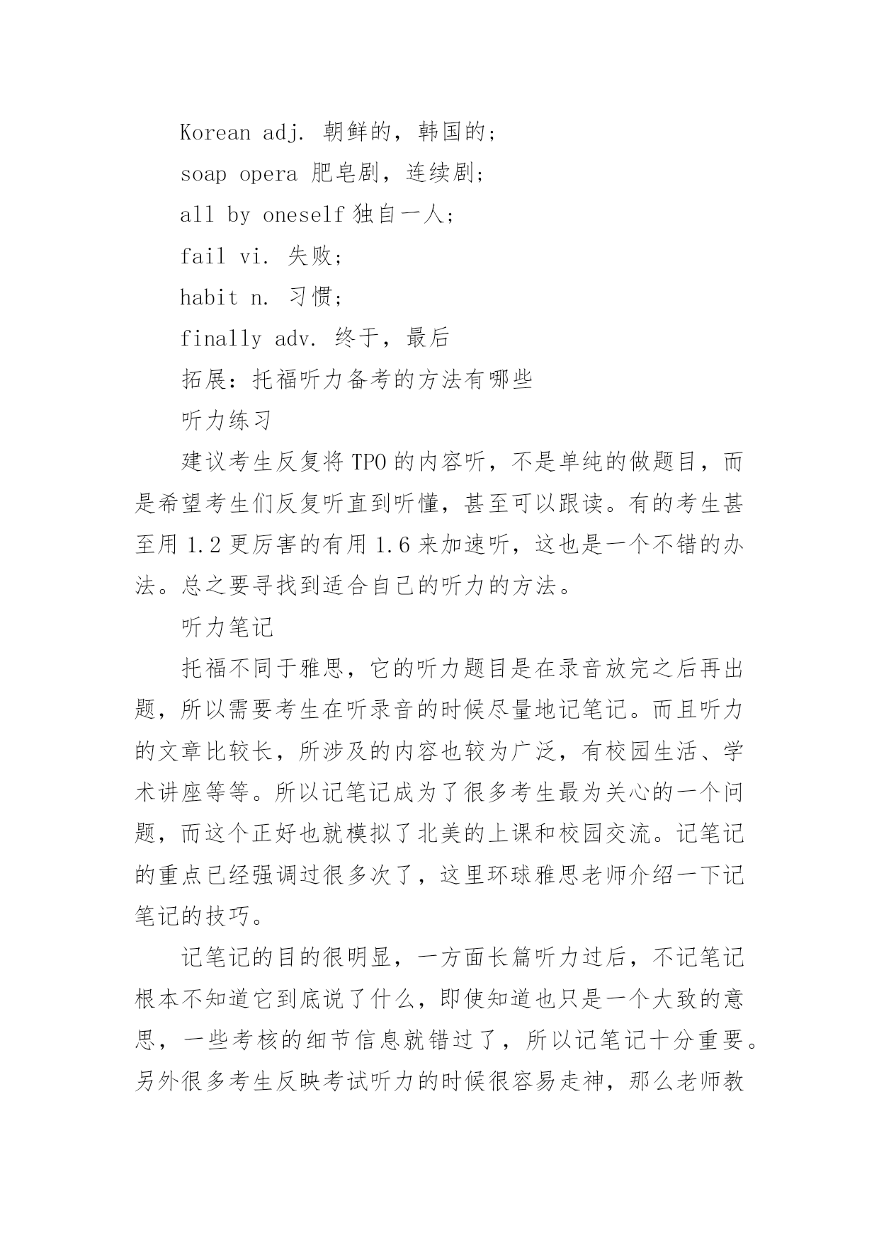 托福备考背单词方法 2023年托福备考背单词方法词汇的积累是托福考试中最基础也是最重要的一部分,为了帮助考生们更加有效的备考托福,下面是小编精心整理的2023年托福备考背单词方法,希望能够帮助到大家。2023年托福备考背单词方法每个人的习惯不同,时间不同,所以方法上会有调整。常见的几种背单词的习惯如下:1)举一反三:也就是一些词根、词缀的记忆方法,在以往单词的基础上拓展。2)集中+零散:也就是说每天专门抽出一段时间来记忆单词,然后再随时巩固。尽量选择便携式的词汇书,一有空就拿出来看。3)情景联想记忆:就是把单词放到句子中记忆或者是意思相关联的单词或词组归类记忆,这样的好处是记忆不枯燥,而且能够与应用相关联。4)练习记忆:也就是用反复练习来巩固单词的记忆效果,避免单纯的机械记忆。5)分项记忆:因为听、说、读、写各项对词汇的要求不尽相同,所以在记忆单词的时候应该更有针对性。例如,阅读的单词以识读为主,很多单词只要求记住意思不要求会拼写。而听力单词则不仅仅要求会拼写而且朗读正确。托福常用词汇30组healthn.健康,身体;few很少的;quitvt.放弃,戒掉;hobbyn.嗜好;completelyadv.完全地,彻底地;wouldrather宁肯,宁愿;stand忍受,忍得住;smokingn.吸烟;giveup放弃,戒掉indispensableadj.不可缺少的;dosb.harm损害某人,对某人有坏处;dosb.good对某人有好处;dozensoftimes几十次;getridof摆脱;cigaretten.香烟;makecoffee煮咖啡,冲咖啡;turnoff关掉;closethewindow关上窗;windn.风;absolutelyadv.绝对地,完全地;beamess乱糟糟的;sweepthefloor扫地;mopthefloor拖地;tidyandclean整齐又干净;Koreanadj.朝鲜的,韩国的;soapopera肥皂剧,连续剧;allbyoneself独自一人;failvi.失败;habitn.习惯;finallyadv.终于,最后拓展:托福听力备考的方法有哪些听力练习建议考生反复将TPO的内容听,不是单纯的做题目,而是希望考生们反复听直到听懂,甚至可以跟读。有的考生甚至用1.2更厉害的有用1.6来加速听,这也是一个不错的办法。总之要寻找到适合自己的听力的方法。听力笔记托福不同于雅思,它的听力题目是在录音放完之后再出题,所以需要考生在听录音的时候尽量地记笔记。而且听力的文章比较长,所涉及的内容也较为广泛,有校园生活、学术讲座等等。所以记笔记成为了很多考生最为关心的一个问题,而这个正好也就模拟了北美的上课和校园交流。记笔记的重点已经强调过很多次了,这里环球雅思老师介绍一下记笔记的技巧。记笔记的目的很明显,一方面长篇听力过后,不记笔记根本不知道它到底说了什么,即使知道也只是一个大致的意思,一些考核的细节信息就错过了,所以记笔记十分重要。另外很多考生反映考试听力的时候很容易走神,那么老师教你一个好方法,记笔记就是最好的避免走神和发呆的方法,耳、手、脑一起使用,效率十分之高。记笔记最主要的原则就是要合理。网上各种介绍缩写的方法,这里并不推崇,因为很多都是别人的经验,对于别人的习惯缩写法,自己还要进行记忆背诵,使用起来也不是那么的顺手,至少要经过一段时间后才有所提高。所以建议考生可以采用适合自己的记录方法,尤其是缩写这一部分,自己怎么记怎么看的懂就什么记,不要拘泥于形式,可以用数字、符号、缩写、甚至画画,只要自己能理解就可以了。针对于托福听力,建议每一句每一点都用一行来记,这样思路清晰。在听力之前,还建议考生了解一下英语的发音规则,尤其是连读现象。我们学单词的时候都是一个一个单词学的,很多时候连读连诵的情况就被忽视了,而往往这就是托福听力中的易错点或者考生容易听不懂的地方。比如连读,比如辅音加元音等等,举个比较简单的例子:justhope.发音h不要,t和o连读。总之大家可以去发掘一下这其中的奥秘,加深对于单词的发音和掌握。