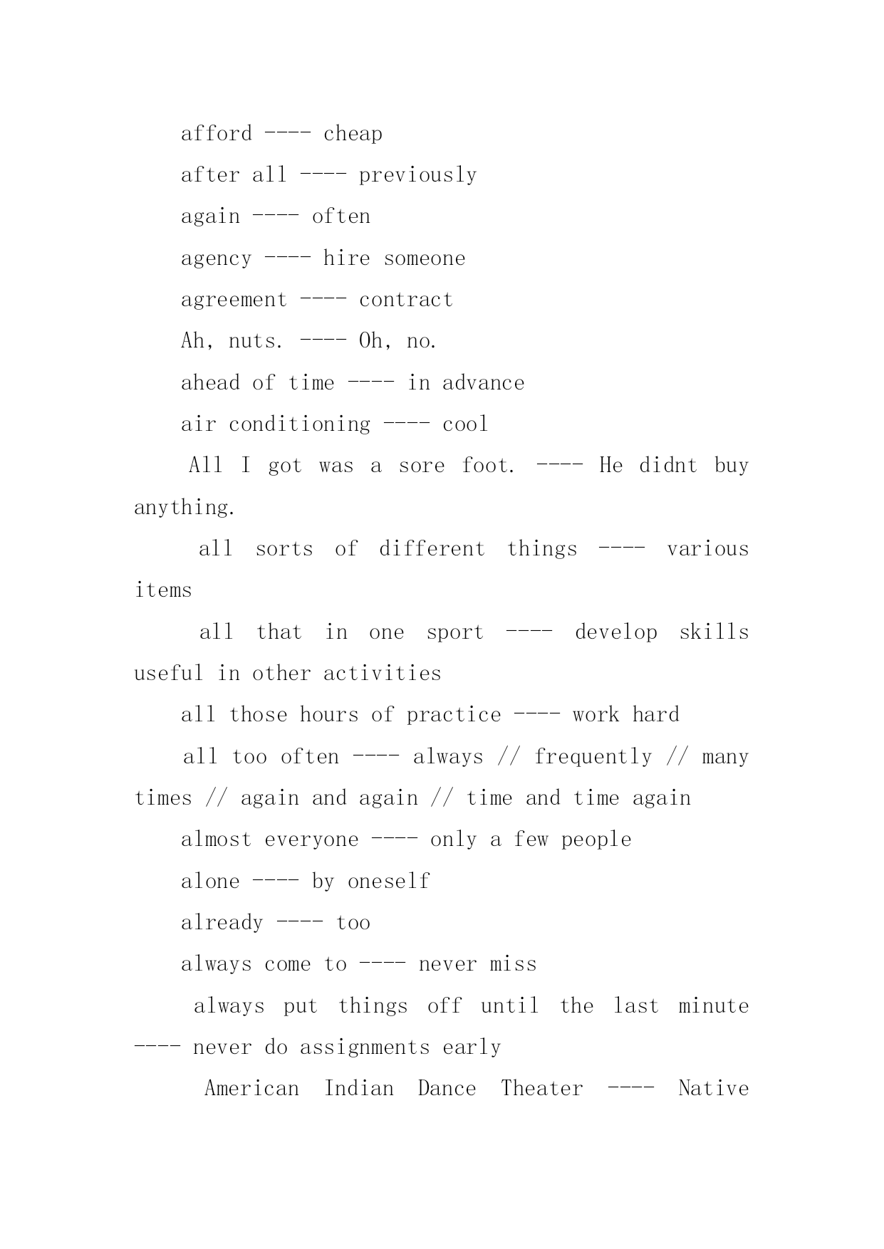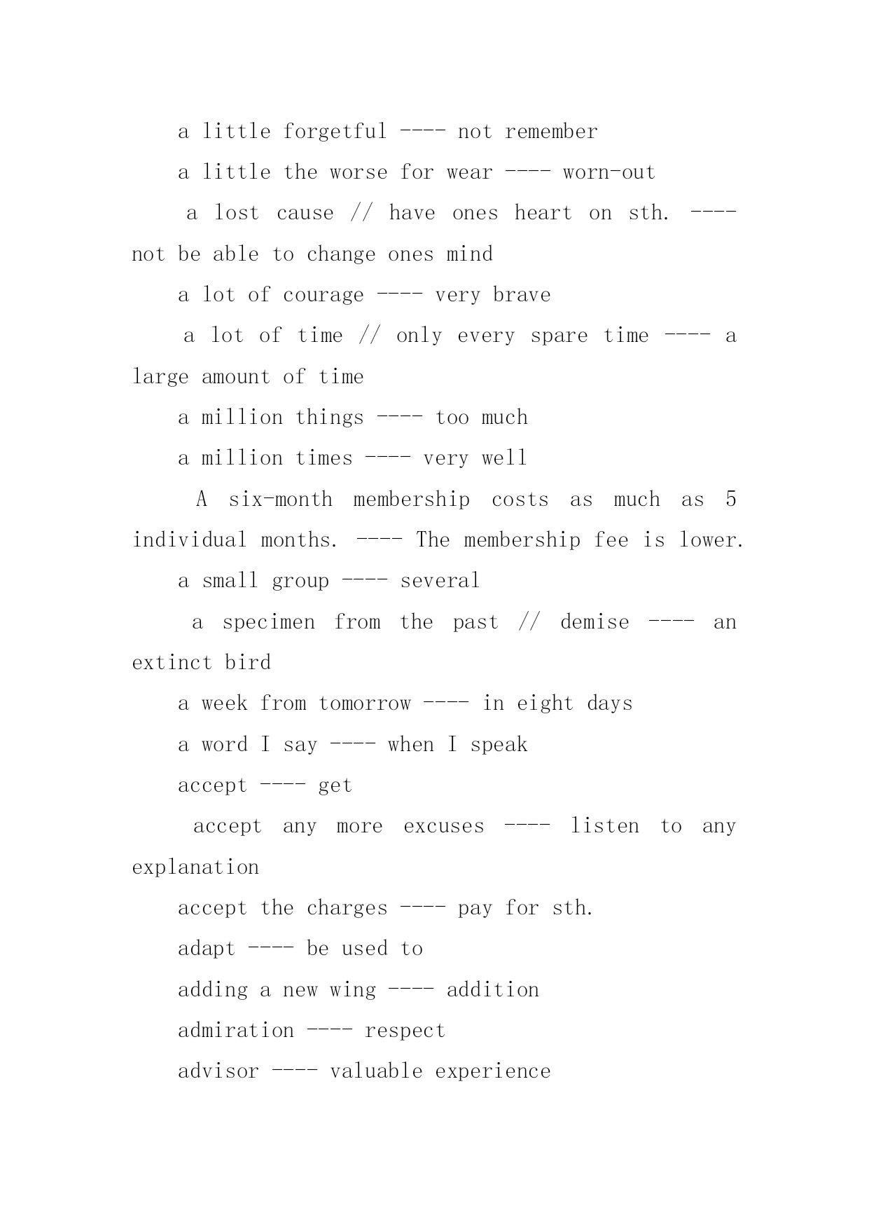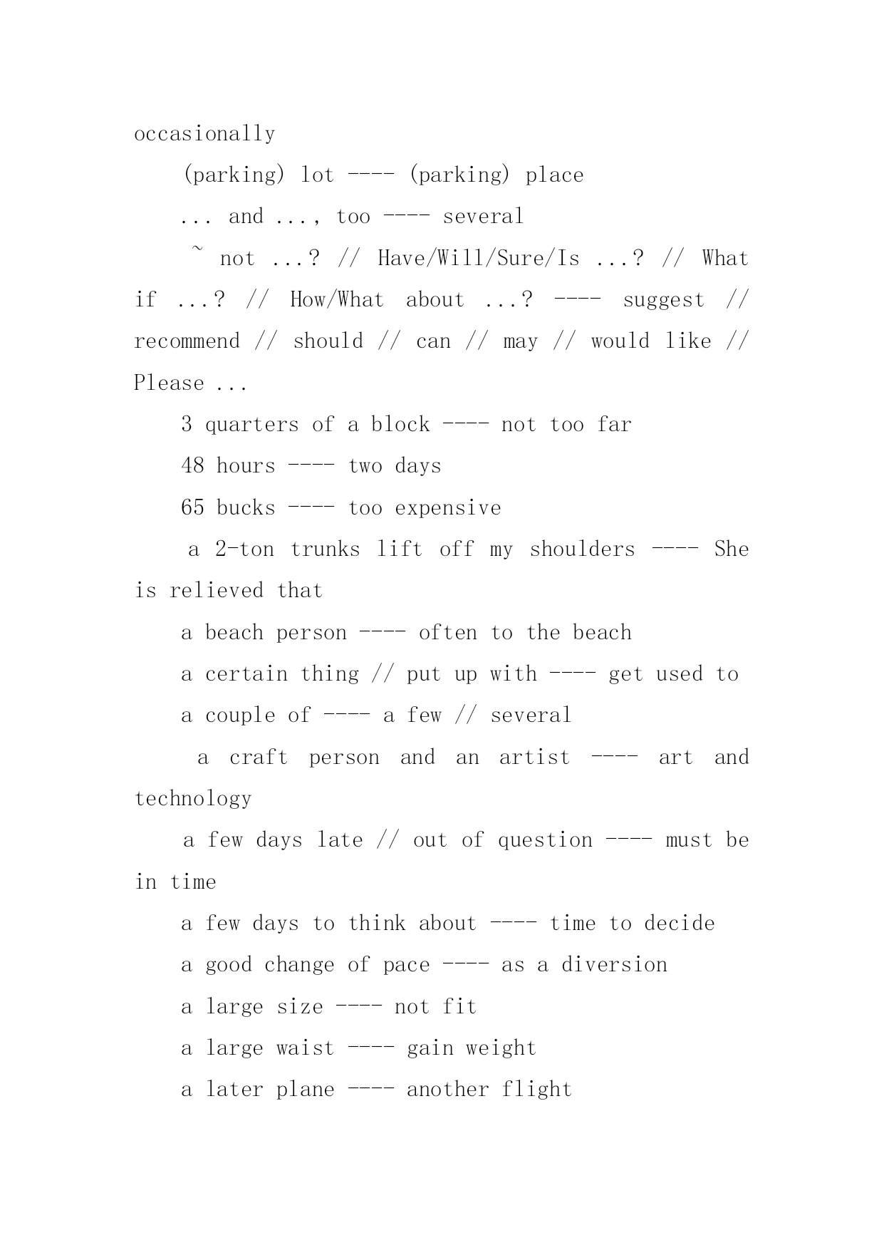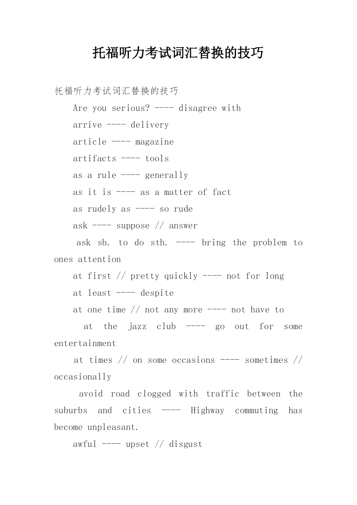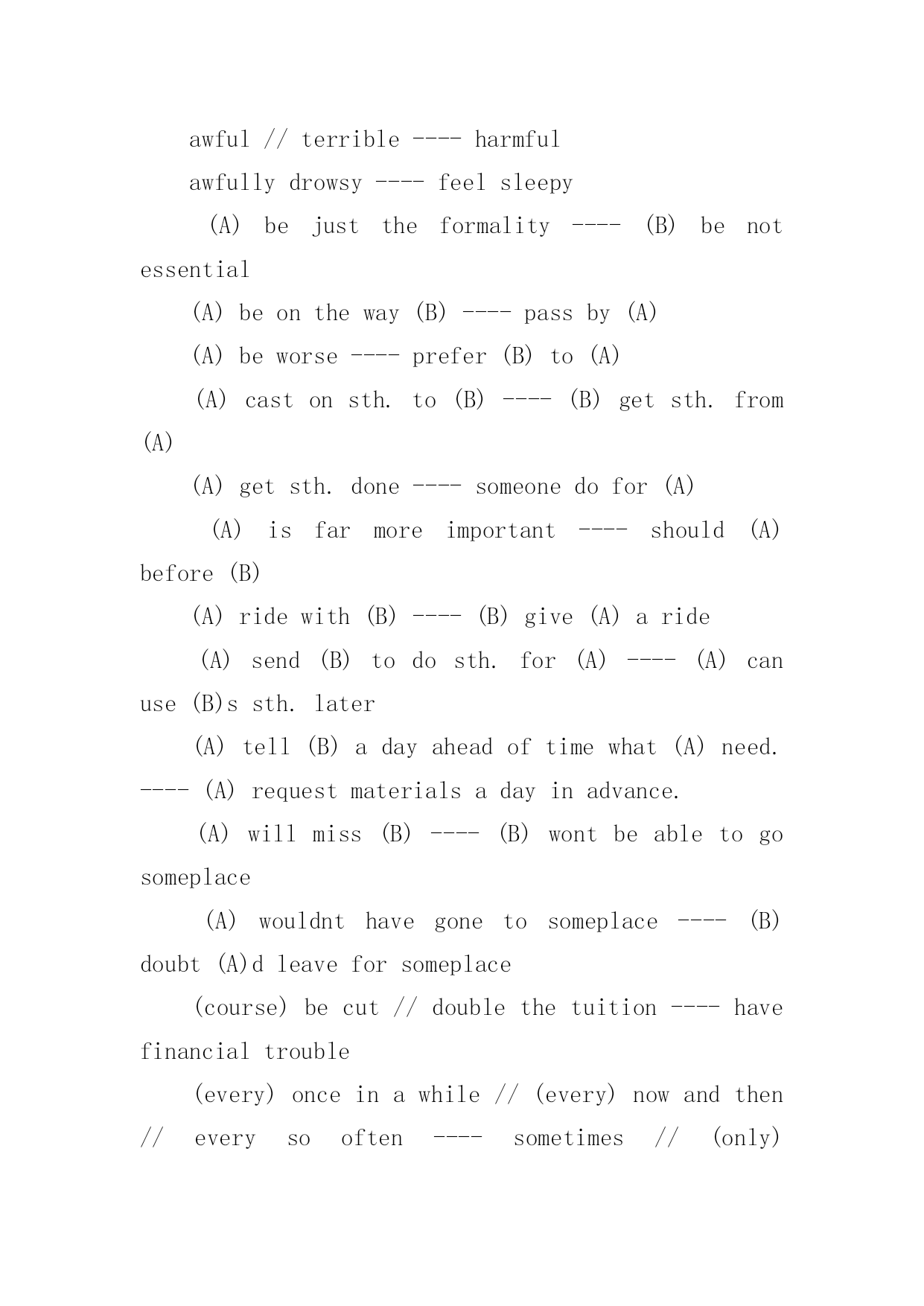 托福听力考试词汇替换的技巧 托福听力考试词汇替换的技巧Areyouserious?----disagreewitharrive----deliveryarticle----magazineartifacts----toolsasarule----generallyasitis----asamatteroffactasrudelyas----sorudeask----suppose//answerasksb.todosth.----bringtheproblemtoonesattentionatfirst//prettyquickly----notforlongatleast----despiteatonetime//notanymore----nothavetoatthejazzclub----gooutforsomeentertainmentattimes//onsomeoccasions----sometimes//occasionallyavoidroadcloggedwithtrafficbetweenthesuburbsandcities----Highwaycommutinghasbecomeunpleasant.awful----upset//disgustawful//terrible----harmfulawfullydrowsy----feelsleepy(A)bejusttheformality----(B)benotessential(A)beontheway(B)----passby(A)(A)beworse----prefer(B)to(A)(A)castonsth.to(B)----(B)getsth.from(A)(A)getsth.done----someonedofor(A)(A)isfarmoreimportant----should(A)before(B)(A)ridewith(B)----(B)give(A)aride(A)send(B)todosth.for(A)----(A)canuse(B)ssth.later(A)tell(B)adayaheadoftimewhat(A)need.----(A)requestmaterialsadayinadvance.(A)willmiss(B)----(B)wontbeabletogosomeplace(A)wouldnthavegonetosomeplace----(B)doubt(A)dleaveforsomeplace(course)becut//doublethetuition----havefinancialtrouble(every)onceinawhile//(every)nowandthen//everysooften----sometimes//(only)occasionally(parking)lot----(parking)place...and...,too----several~not...?//Have/Will/Sure/Is...?//Whatif...?//How/Whatabout...?----suggest//recommend//should//can//may//wouldlike//Please...3quartersofablock----nottoofar48hours----twodays65bucks----tooexpensivea2-tontrunksliftoffmyshoulders----Sheisrelievedthatabeachperson----oftentothebeachacertainthing//putupwith----getusedtoacoupleof----afew//severalacraftpersonandanartist----artandtechnologyafewdayslate//outofquestion----mustbeintimeafewdaystothinkabout----timetodecideagoodchangeofpace----asadiversionalargesize----notfitalargewaist----gainweightalaterplane----anotherflightalittleforgetful----notrememberalittletheworseforwear----worn-outalostcause//haveonesheartonsth.----notbeabletochangeonesmindalotofcourage----verybravealotoftime//