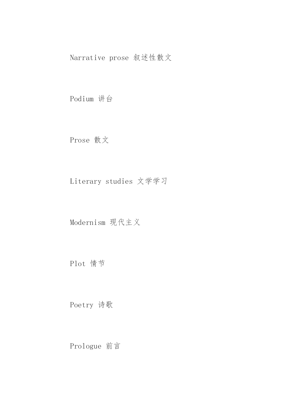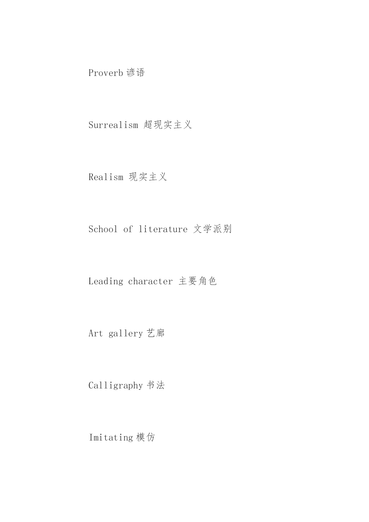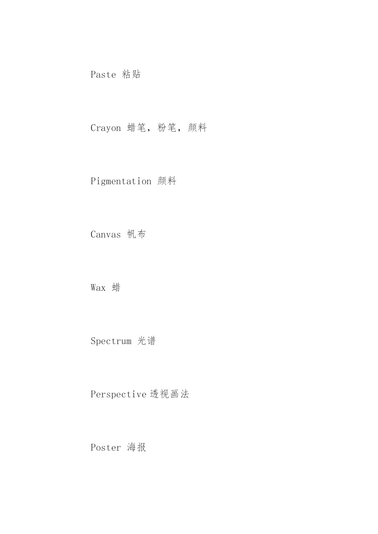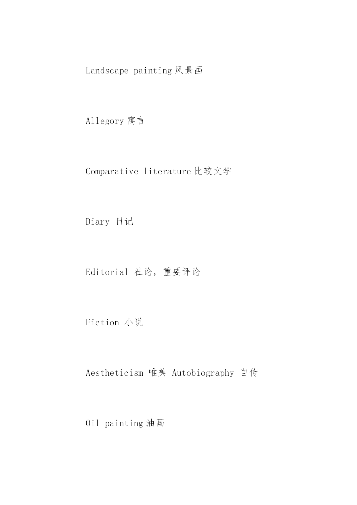 托福听力高频词汇文学美学类 托福听力高频词汇文学美学类 文学与艺术的词汇历来是英语考试里的'重点词汇,这在托福考试里也不例外。下面是小编为大家整理的一些文学美学类托福听力高频词汇,希望对大家有用。 Descriptiveprose描述散文 Fairytale童话 Futurism未来派 Legend传说 Literarystudies文学研究 Narrativeprose叙述性散文 Podium讲台 Prose散文 Literarystudies文学学习 Modernism现代主义 Plot情节 Poetry诗歌 Prologue前言 Proverb谚语 Surrealism超现实主义 Realism现实主义 Schoolofliterature文学派别 Leadingcharacter主要角色 Artgallery艺廊 Calligraphy书法 Imitating模仿 Landscapepainting风景画 Allegory寓言 Comparativeliterature比较文学 Diary日记 Editorial社论,重要评论 Fiction小说 Aestheticism唯美Autobiography自传 Oilpainting油画 Paste粘贴 Crayon蜡笔,粉笔,颜料 Pigmentation颜料 Canvas帆布 Wax蜡 Spectrum光谱 Perspective透视画法 Poster海报 Portrait肖像 Model模式,模特 mural壁画 Panorama全景 Pasteldrawing蜡笔画 Sketch草图 Autograph手稿 Literarycriticism文学评论