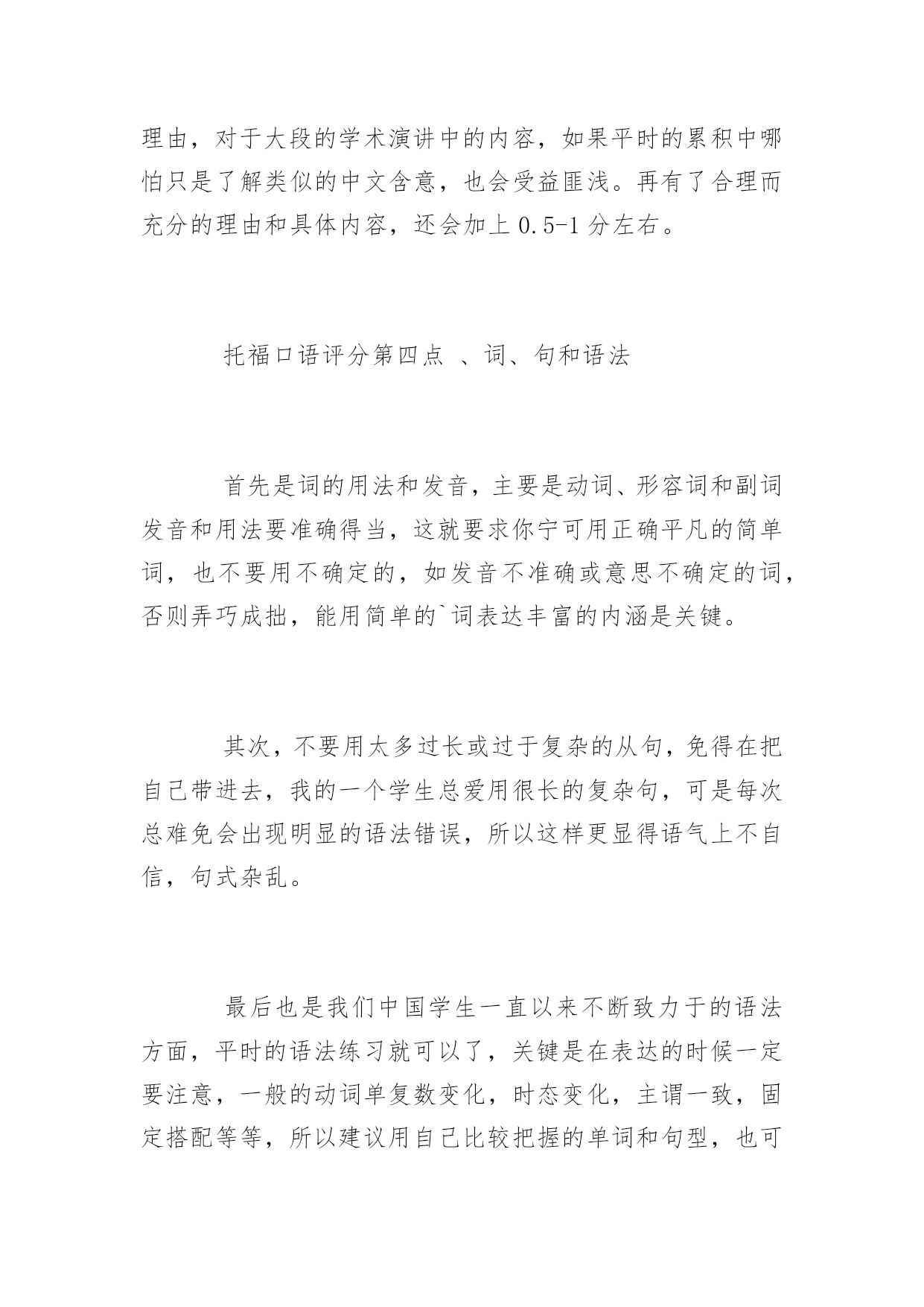 托福考试口语考试评分标准 2016年托福考试口语考试评分标准 话说知己知彼才能百战不殆,下面是百分网小编精心为大家整理的托福考试口语考试评分标准,希望对大家有帮助,更多内容请关注应届毕业生网! 托福口语评分第一点、结构清晰 新托福的口语考试中,首先会注意你的整个presentation的结构框架(format)。在最考验考生能力的写作部分,写作老师会给出不同文体的固定模式,而这些模式就是我们在进行口语presentation部分最有效的参考模式,只不过在用词方面更加口语化,没有在作文中那么正式,用词相对自由。熟记文体模式,尤其是议论文和记叙文的文体,而议论文的模式又是重中之重,所以考生在参加培训时一定要多注意写作的文体对于口语表达的转换和运用。如果有一个比较富有逻辑和完整的模式,就会得一个基本分数1分。 托福口语评分第二点、标准的发音 跟读,也就是跟着原始的录音,人家说一句,自己跟着读一句,而且有时候要读很多句,力求的就是要无限接近录音本身的发音,通过这种方法来校正自己的发音。其实这个方法就好像是,小孩总喜欢去模仿一些结巴,但是经常出现的情况就是模仿了几次结巴之后,就会发现自己真的开始结巴了。这其实就是跟读的作用的典型体现。当然,这里马上面临另外一个问题,就是是否要跟着原文来读,其实这是一个见仁见智的了,如果你听力水平很好,那么不用原文你也知道在说什么,这个时候最好不用原文。但是,如果你的听力水平不够好,那就一定要看原文的,否则,当都不知道在说什么的时候,鹦鹉学生又有什么意义呢?这就是跟读。 托福口语评分第三点、充实内容、明确观点 在每一个presentation的内容中,都有给出2-3个理由,并给出理由的具体支持点,平时考生可以多积累一些常用话题的正反观点,多看一些英文报刊杂志来累积观点和理由,对于大段的学术演讲中的内容,如果平时的累积中哪怕只是了解类似的中文含意,也会受益匪浅。再有了合理而充分的理由和具体内容,还会加上0.5-1分左右。 托福口语评分第四点、词、句和语法 首先是词的用法和发音,主要是动词、形容词和副词发音和用法要准确得当,这就要求你宁可用正确平凡的简单词,也不要用不确定的,如发音不准确或意思不确定的词,否则弄巧成拙,能用简单的`词表达丰富的内涵是关键。 其次,不要用太多过长或过于复杂的从句,免得在把自己带进去,我的一个学生总爱用很长的复杂句,可是每次总难免会出现明显的语法错误,所以这样更显得语气上不自信,句式杂乱。 最后也是我们中国学生一直以来不断致力于的语法方面,平时的语法练习就可以了,关键是在表达的时候一定要注意,一般的动词单复数变化,时态变化,主谓一致,固定搭配等等,所以建议用自己比较把握的单词和句型,也可以减少语法错误。这些注意部分也占0.5分。