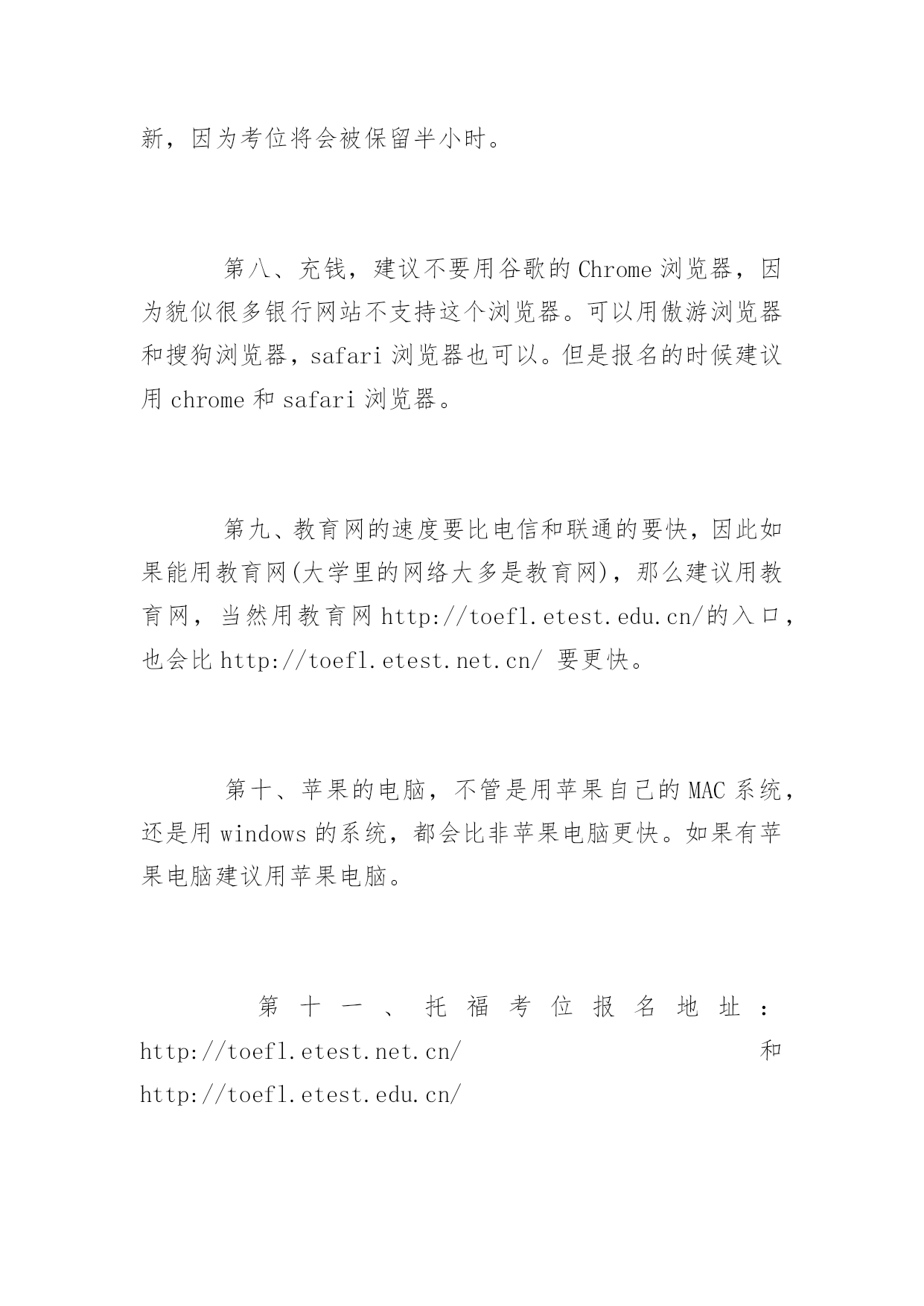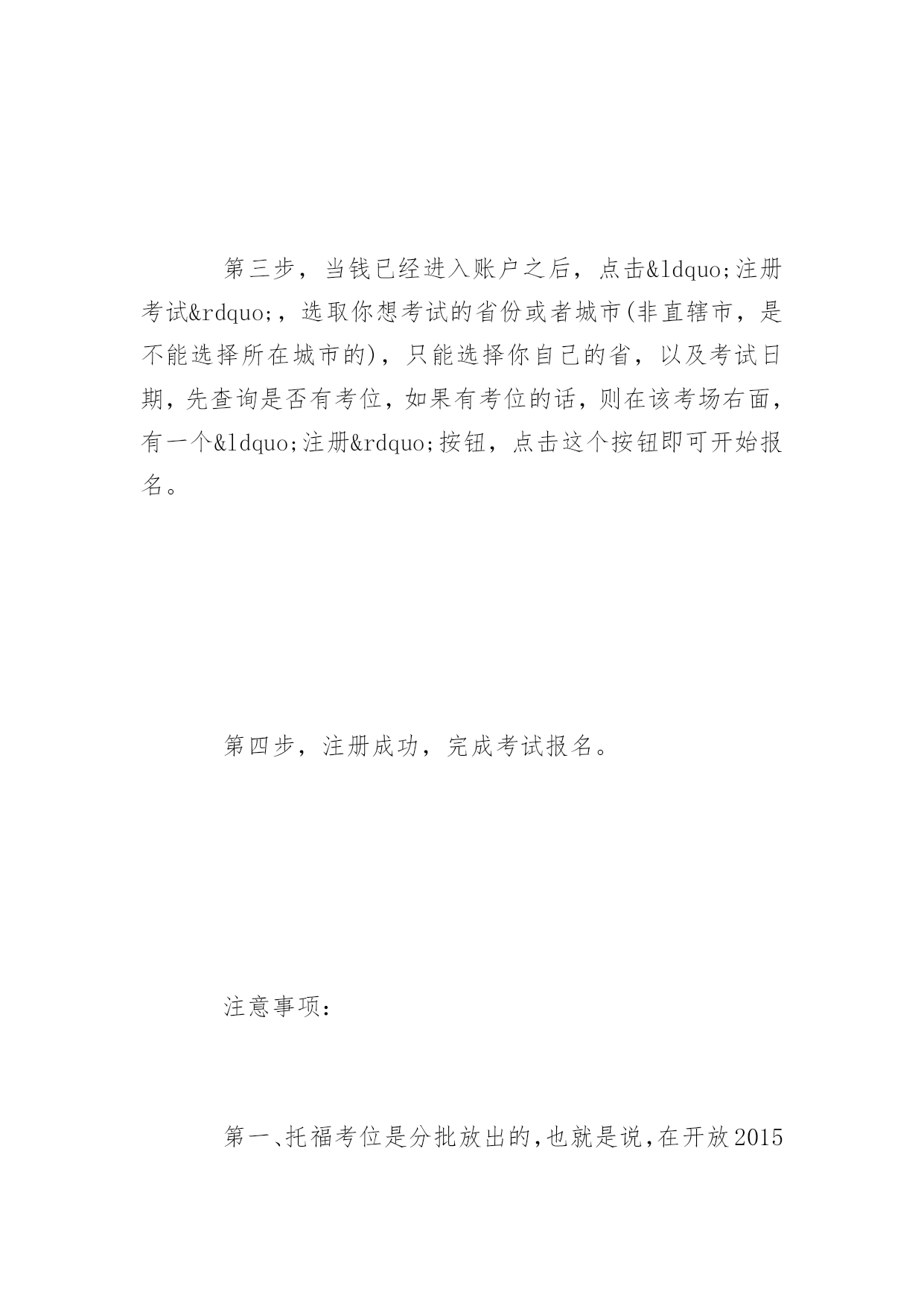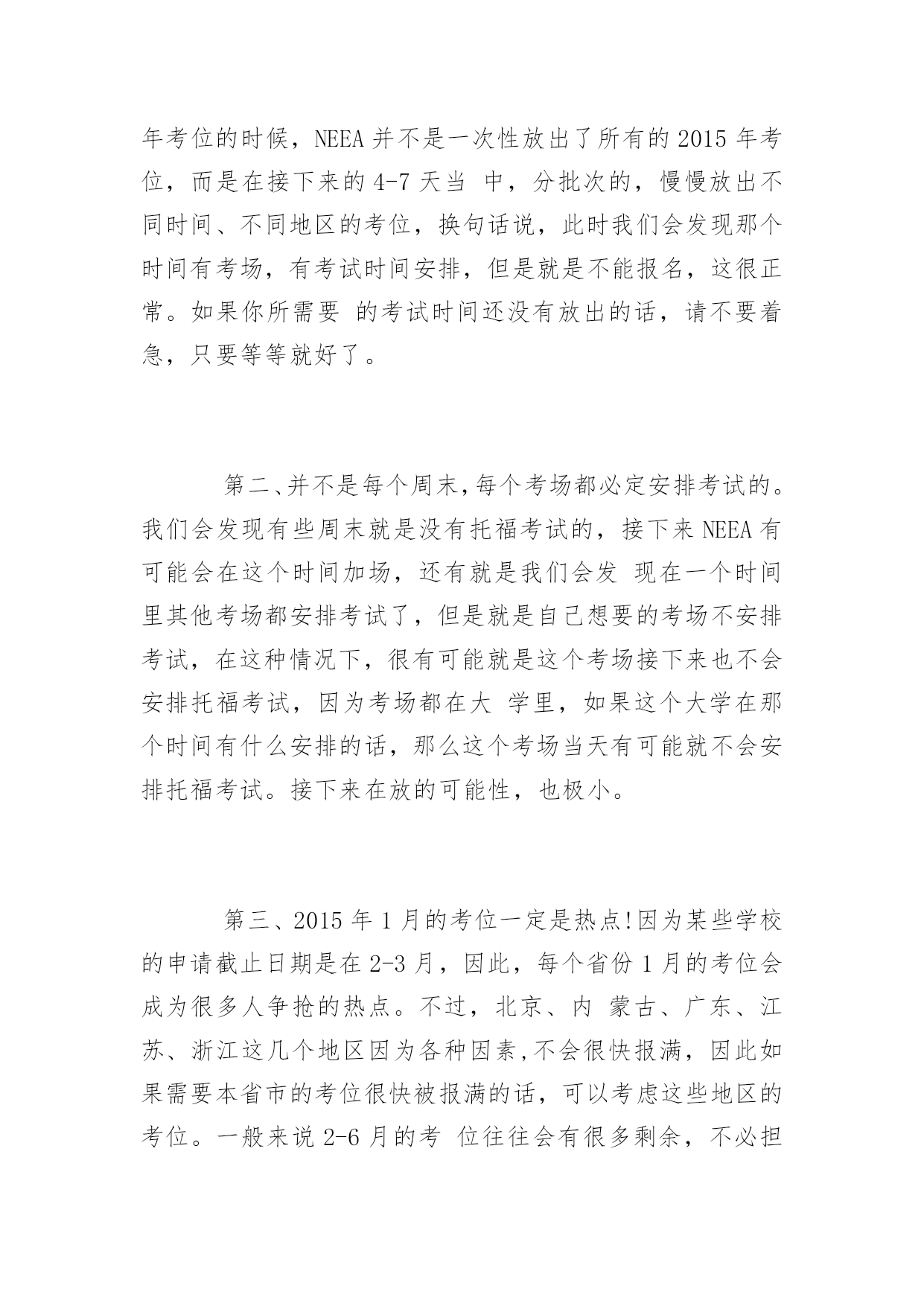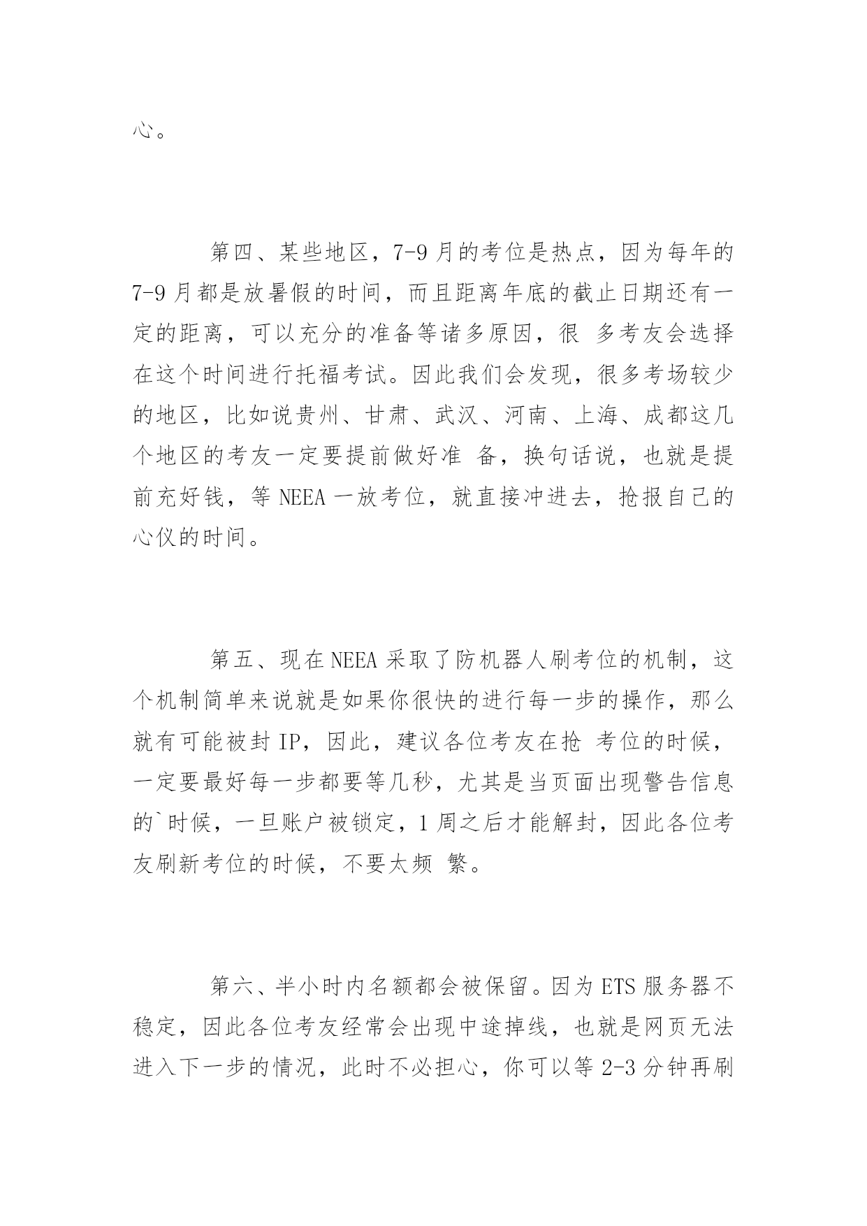 托福考试报名流程详解 2016年托福考试报名流程详解 托福考试报名流程具体是如何操作的呢?为了帮助大家更好地报考托福考试,以下是yjbys网小编整理的关于托福考试报名流程详解,供同学们参考。 第一步,在NEEA网站上http://toefl.etest.net.cn/,注册一个ID 第二步,用刚才注册的用户名和密码登陆NEEA网站,在报名网站当中点击付款,充入1540元报名费,在这里,请注意,NEEA网站只接受中国银行、工商银行、招商银行的网银,其他银行都不行,没有网银也不行。请注意,有时会立刻到账,有时则需要等待1-2个小时。建议各位考友提前注册,提前把资金充入账户。 第三步,当钱已经进入账户之后,点击“注册考试”,选取你想考试的省份或者城市(非直辖市,是不能选择所在城市的),只能选择你自己的省,以及考试日期,先查询是否有考位,如果有考位的话,则在该考场右面,有一个“注册”按钮,点击这个按钮即可开始报名。 第四步,注册成功,完成考试报名。 注意事项: 第一、托福考位是分批放出的,也就是说,在开放2015年考位的时候,NEEA并不是一次性放出了所有的2015年考位,而是在接下来的4-7天当中,分批次的,慢慢放出不同时间、不同地区的考位,换句话说,此时我们会发现那个时间有考场,有考试时间安排,但是就是不能报名,这很正常。如果你所需要的考试时间还没有放出的话,请不要着急,只要等等就好了。 第二、并不是每个周末,每个考场都必定安排考试的。我们会发现有些周末就是没有托福考试的,接下来NEEA有可能会在这个时间加场,还有就是我们会发现在一个时间里其他考场都安排考试了,但是就是自己想要的考场不安排考试,在这种情况下,很有可能就是这个考场接下来也不会安排托福考试,因为考场都在大学里,如果这个大学在那个时间有什么安排的话,那么这个考场当天有可能就不会安排托福考试。接下来在放的可能性,也极小。 第三、2015年1月的考位一定是热点!因为某些学校的申请截止日期是在2-3月,因此,每个省份1月的考位会成为很多人争抢的热点。不过,北京、内蒙古、广东、江苏、浙江这几个地区因为各种因素,不会很快报满,因此如果需要本省市的考位很快被报满的话,可以考虑这些地区的考位。一般来说2-6月的考位往往会有很多剩余,不必担心。 第四、某些地区,7-9月的考位是热点,因为每年的7-9月都是放暑假的时间,而且距离年底的截止日期还有一定的距离,可以充分的准备等诸多原因,很多考友会选择在这个时间进行托福考试。因此我们会发现,很多考场较少的地区,比如说贵州、甘肃、武汉、河南、上海、成都这几个地区的考友一定要提前做好准备,换句话说,也就是提前充好钱,等NEEA一放考位,就直接冲进去,抢报自己的心仪的时间。 第五、现在NEEA采取了防机器人刷考位的机制,这个机制简单来说就是如果你很快的进行每一步的操作,那么就有可能被封IP,因此,建议各位考友在抢考位的时候,一定要最好每一步都要等几秒,尤其是当页面出现警告信息的`时候,一旦账户被锁定,1周之后才能解封,因此各位考友刷新考位的时候,不要太频繁。 第六、半小时内名额都会被保留。因为ETS服务器不稳定,因此各位考友经常会出现中途掉线,也就是网页无法进入下一步的情况,此时不必担心,你可以等2-3分钟再刷新,因为考位将会被保留半小时。 第八、充钱,建议不要用谷歌的Chrome浏览器,因为貌似很多银行网站不支持这个浏览器。可以用傲游浏览器和搜狗浏览器,safari浏览器也可以。但是报名的时候建议用chrome和safari浏览器。 第九、教育网的速度要比电信和联通的要快,因此如果能用教育网(大学里的网络大多是教育网),那么建议用教育网,当然用教育网http://toefl.etest.edu.cn/的入口,也会比http://toefl.etest.net.cn/要更快。 第十、苹果的电脑,不管是用苹果自己的MAC系统,还是用windows的系统,都会比非苹果电脑更快。如果有苹果电脑建议用苹果电脑。 第十一、托福考位报名地址:http://toefl.etest.net.cn/和http://toefl.etest.edu.cn/