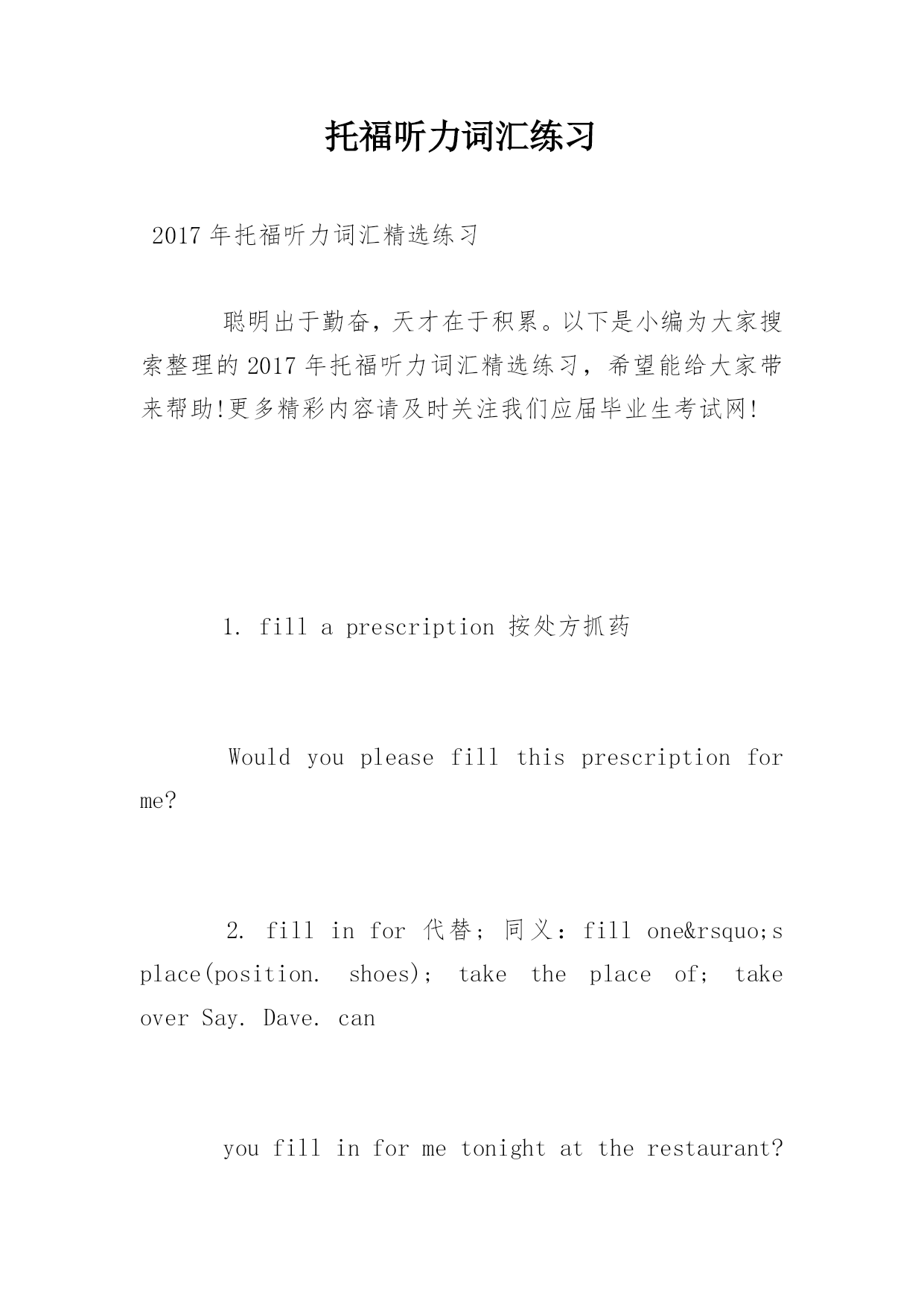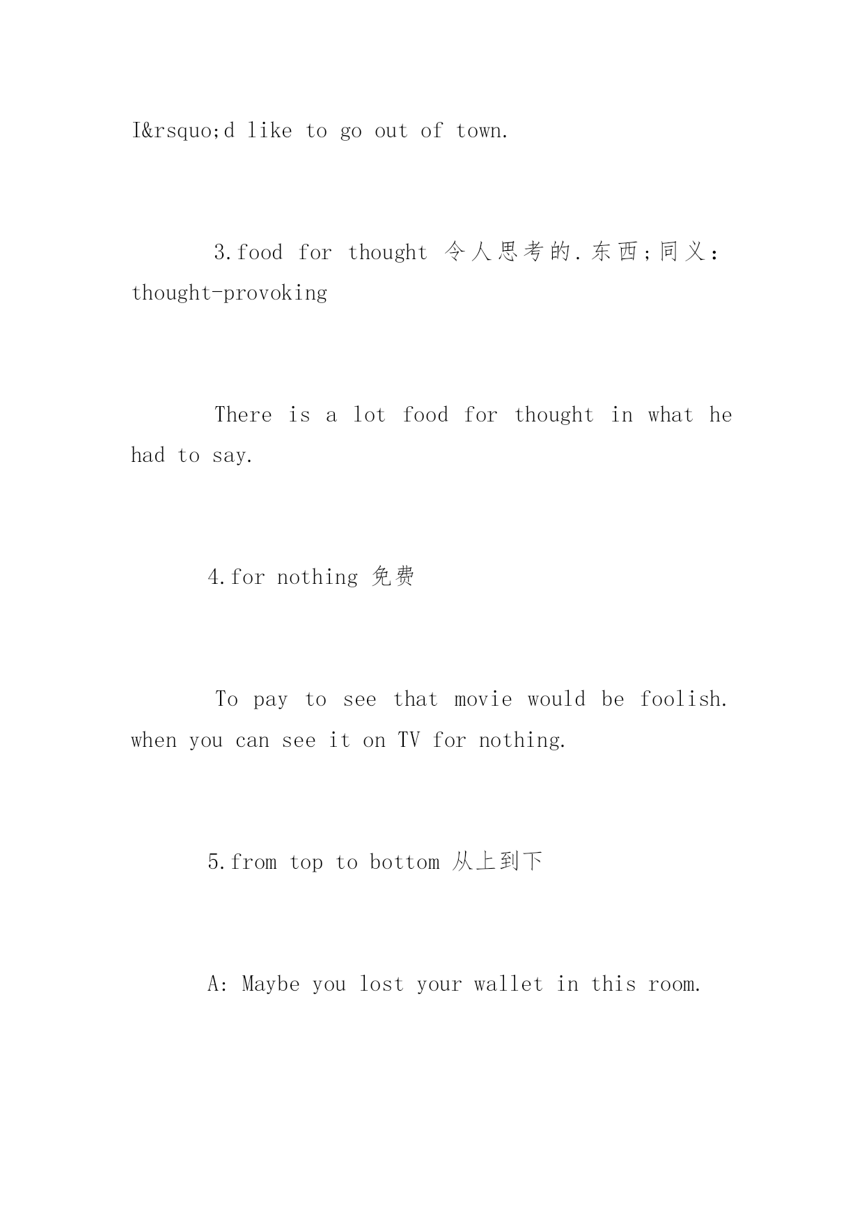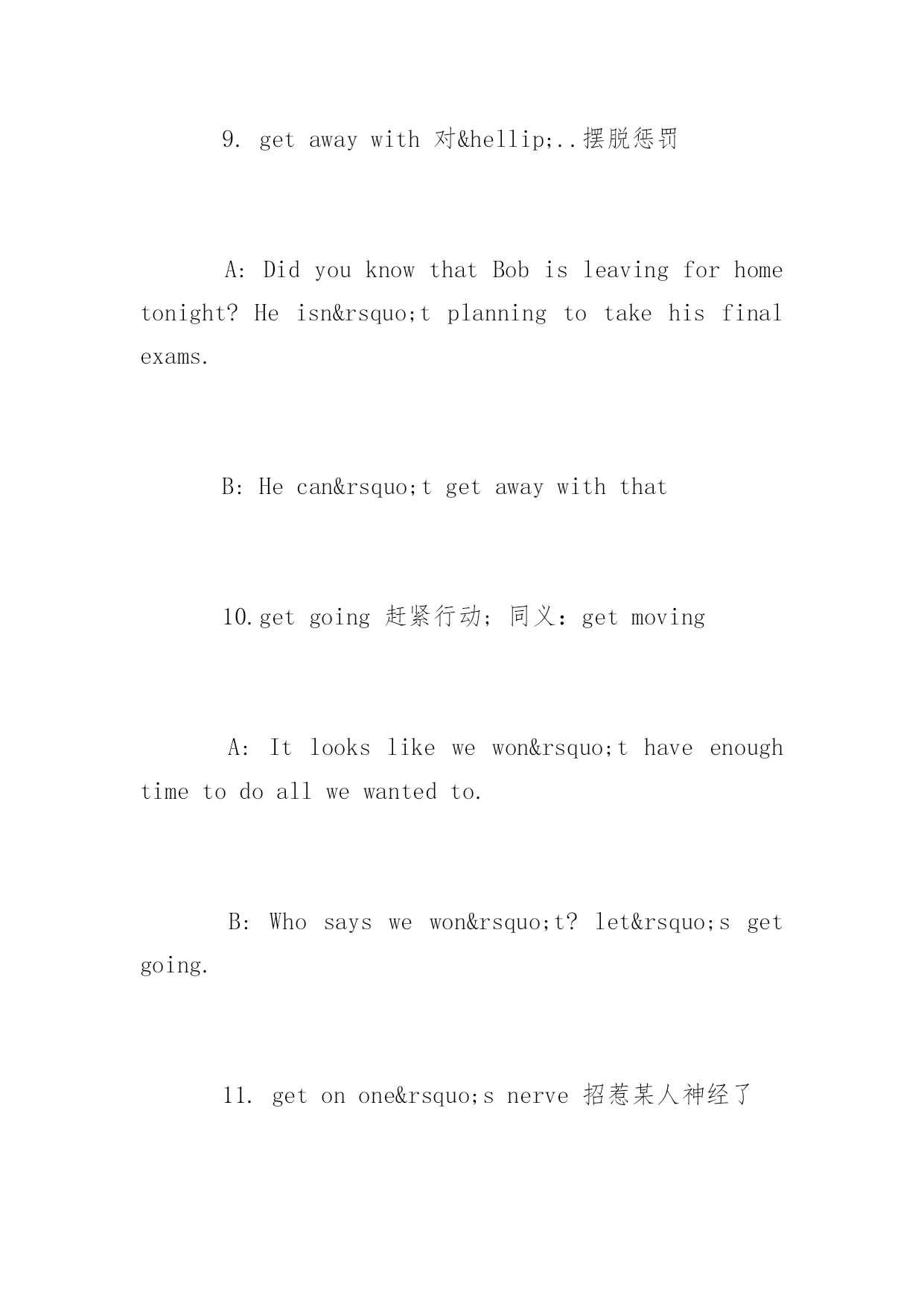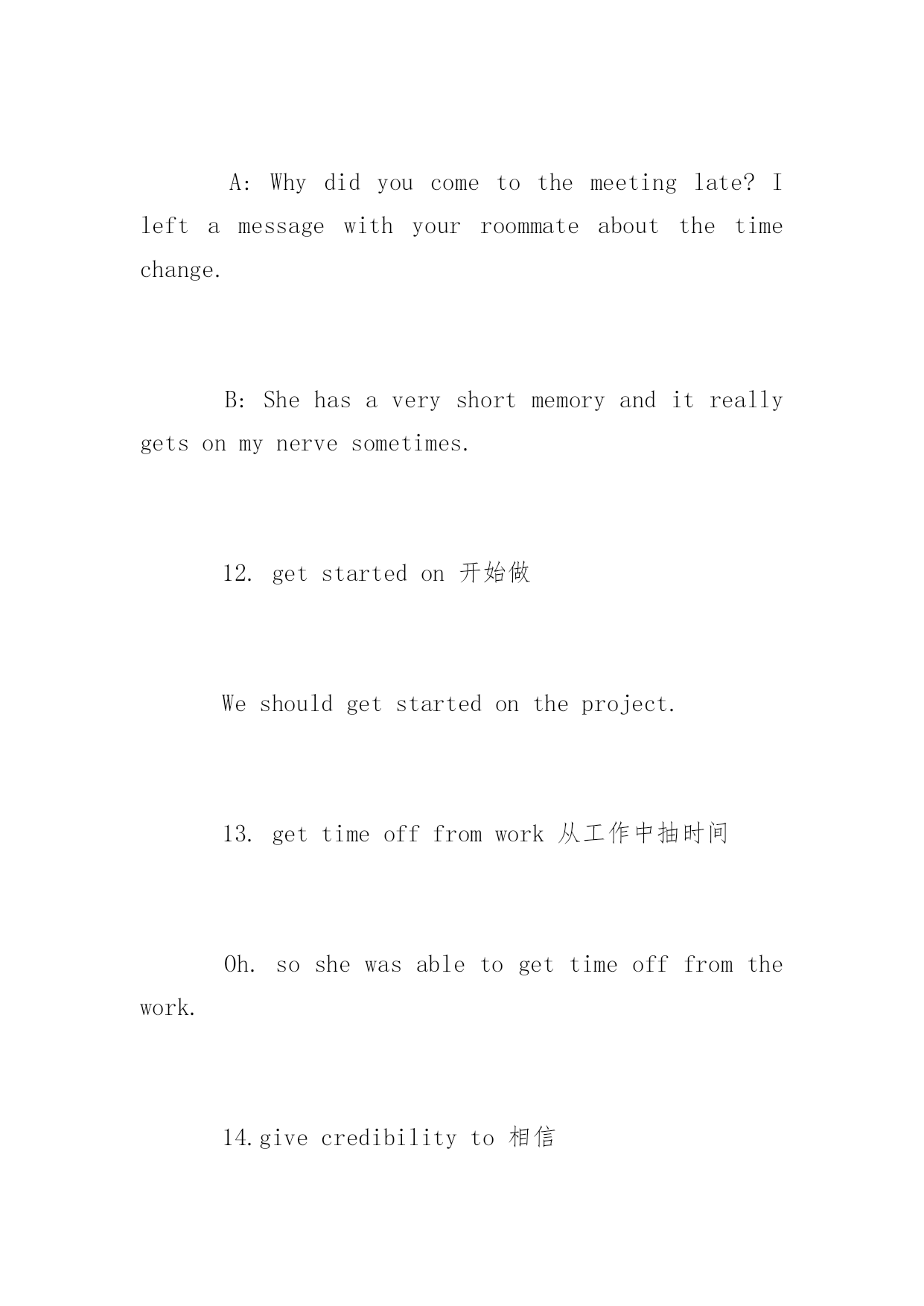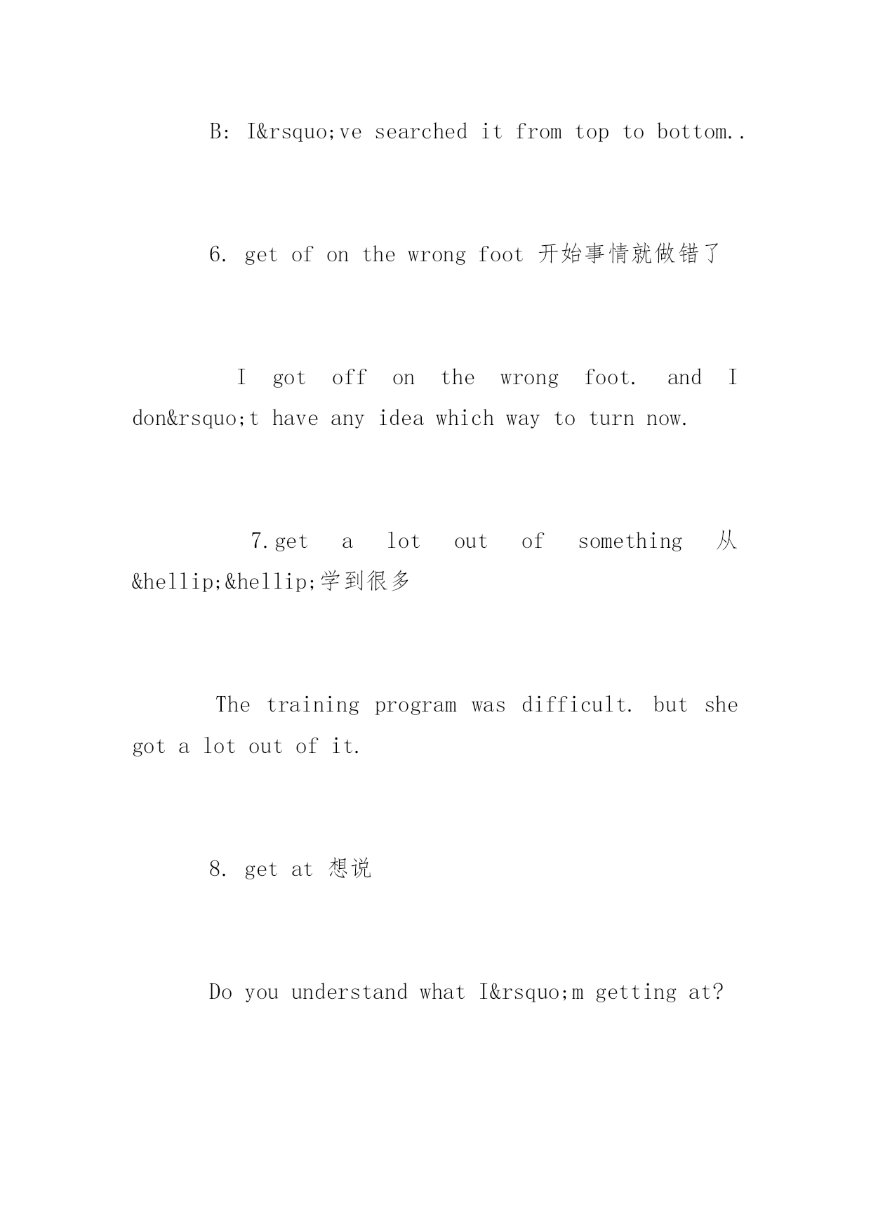 托福听力词汇练习 2017年托福听力词汇精选练习 聪明出于勤奋,天才在于积累。以下是小编为大家搜索整理的2017年托福听力词汇精选练习,希望能给大家带来帮助!更多精彩内容请及时关注我们应届毕业生考试网! 1.fillaprescription按处方抓药 Wouldyoupleasefillthisprescriptionforme? 2.fillinfor代替;同义:fillone’splace(position.shoes);taketheplaceof;takeoverSay.Dave.can youfillinformetonightattherestaurant?I’dliketogooutoftown. 3.foodforthought令人思考的.东西;同义:thought-provoking Thereisalotfoodforthoughtinwhathehadtosay. 4.fornothing免费 Topaytoseethatmoviewouldbefoolish.whenyoucanseeitonTVfornothing. 5.fromtoptobottom从上到下 A:Maybeyoulostyourwalletinthisroom. B:I’vesearcheditfromtoptobottom.. 6.getofonthewrongfoot开始事情就做错了 Igotoffonthewrongfoot.andIdon’thaveanyideawhichwaytoturnnow. 7.getalotoutofsomething从……学到很多 Thetrainingprogramwasdifficult.butshegotalotoutofit. 8.getat想说 DoyouunderstandwhatI’mgettingat? 9.getawaywith对…..摆脱惩罚 A:DidyouknowthatBobisleavingforhometonight?Heisn’tplanningtotakehisfinalexams. B:Hecan’tgetawaywiththat 10.getgoing赶紧行动;同义:getmoving A:Itlookslikewewon’thaveenoughtimetodoallwewantedto. B:Whosayswewon’t?let’sgetgoing. 11.getonone’snerve招惹某人神经了 A:Whydidyoucometothemeetinglate?Ileftamessagewithyourroommateaboutthetimechange. B:Shehasaveryshortmemoryanditreallygetsonmynervesometimes. 12.getstartedon开始做 Weshouldgetstartedontheproject. 13.gettimeofffromwork从工作中抽时间 Oh.soshewasabletogettimeofffromthework. 14.givecredibilityto相信 A:didyouhearaboutJim? B:Iwouldn’tgivethatrumoranycredibility. 15.goeasyon温和对待 Well.sinceit’syourfirstandonlyticket.thejudgewillprobablygoeasyonyou. 16.goinoneearandouttheother一耳朵进,一耳朵出 Well.youknowMike.everything’sinoneearandouttheother. 17.gojogging去跑步 Areyoureadytogojogging? 18.gotoone’shead某人自负 A:HaveyounoticedhowJohn’schangedsincehebecamestudentgovernmentpresident? B:Ithinkthewholethinghasgonetohishead.andheusedtobesosociableandopen. 19.gotthetime几点了 A:Gotthetime? B:It’salittleafterten. 20.graduationannouncements毕业典礼请柬 Haveyouo