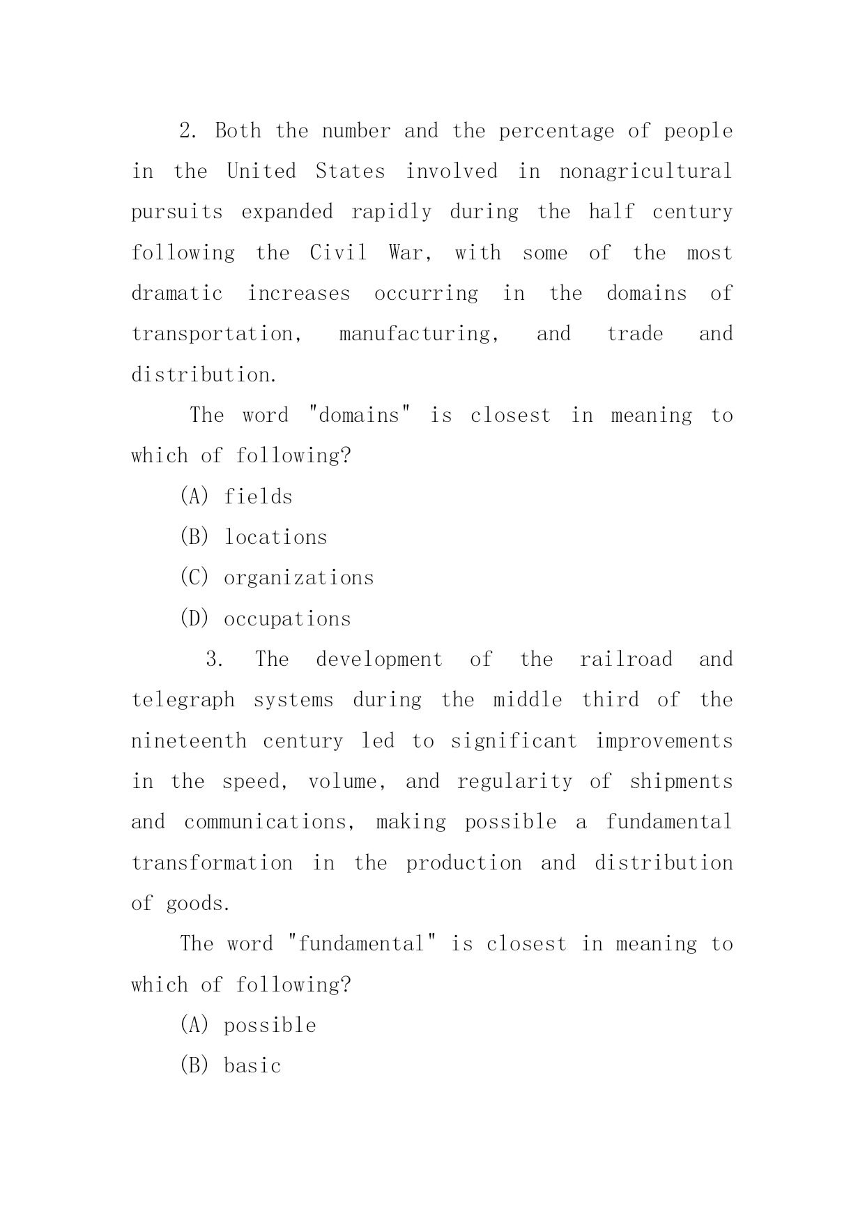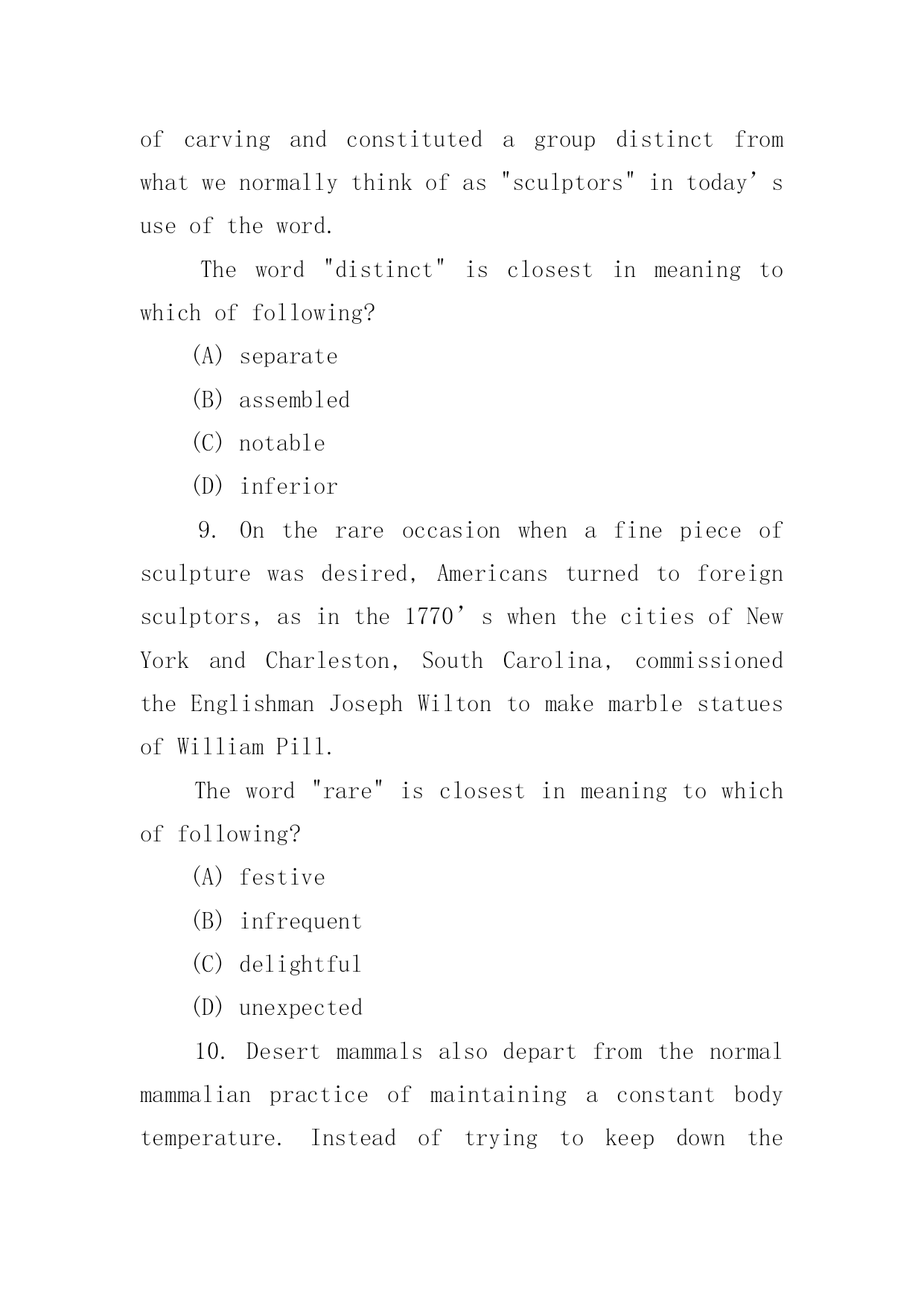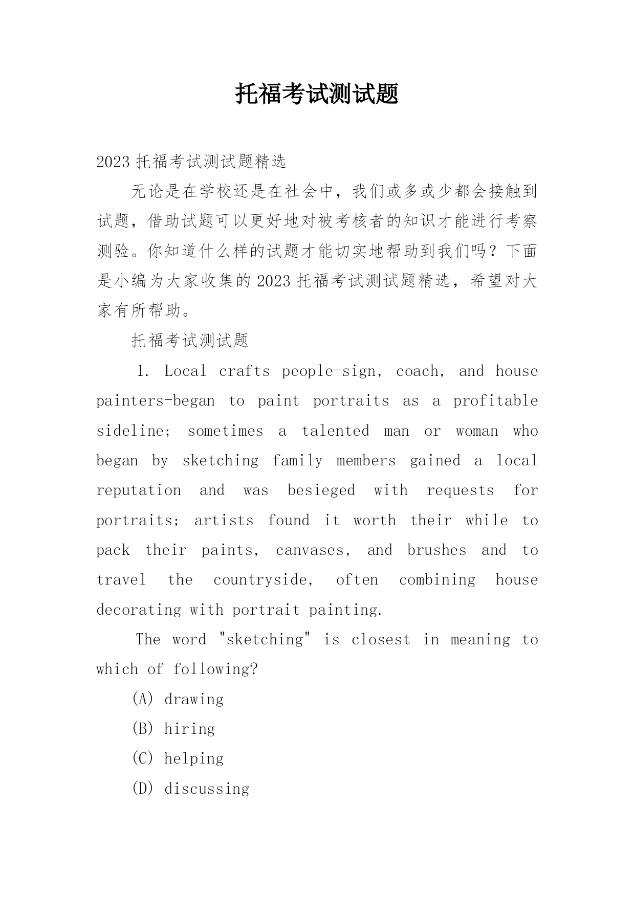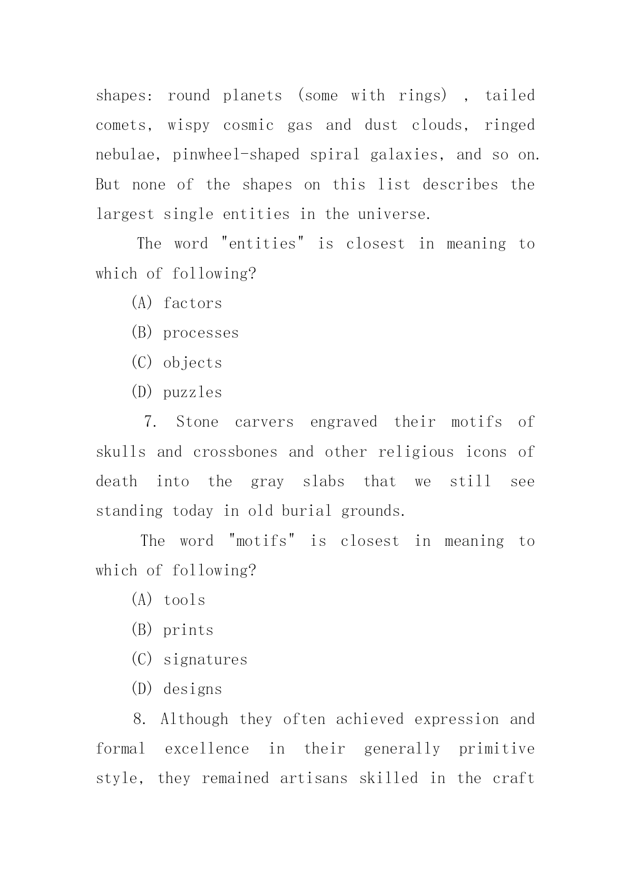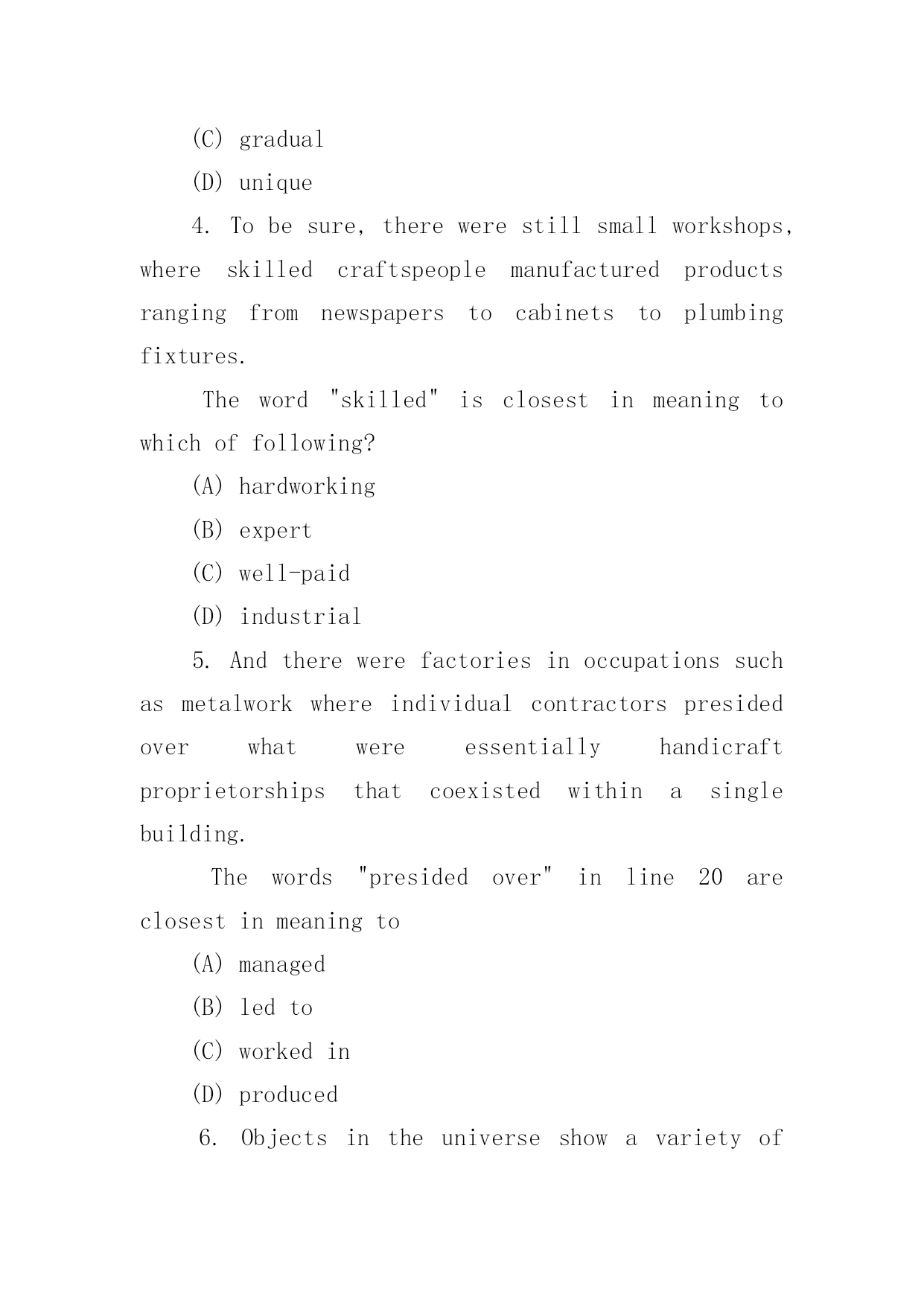 托福考试测试题 2023托福考试测试题精选无论是在学校还是在社会中,我们或多或少都会接触到试题,借助试题可以更好地对被考核者的知识才能进行考察测验。你知道什么样的试题才能切实地帮助到我们吗?下面是小编为大家收集的2023托福考试测试题精选,希望对大家有所帮助。托福考试测试题1.Localcraftspeople-sign,coach,andhousepainters-begantopaintportraitsasaprofitablesideline;sometimesatalentedmanorwomanwhobeganbysketchingfamilymembersgainedalocalreputationandwasbesiegedwithrequestsforportraits;artistsfounditworththeirwhiletopacktheirpaints,canvases,andbrushesandtotravelthecountryside,oftencombininghousedecoratingwithportraitpainting.Theword"sketching"isclosestinmeaningtowhichoffollowing?(A)drawing(B)hiring(C)helping(D)discussing2.BoththenumberandthepercentageofpeopleintheUnitedStatesinvolvedinnonagriculturalpursuitsexpandedrapidlyduringthehalfcenturyfollowingtheCivilWar,withsomeofthemostdramaticincreasesoccurringinthedomainsoftransportation,manufacturing,andtradeanddistribution.Theword"domains"isclosestinmeaningtowhichoffollowing?(A)fields(B)locations(C)organizations(D)occupations3.Thedevelopmentoftherailroadandtelegraphsystemsduringthemiddlethirdofthenineteenthcenturyledtosignificantimprovementsinthespeed,volume,andregularityofshipmentsandcommunications,makingpossibleafundamentaltransformationintheproductionanddistributionofgoods.Theword"fundamental"isclosestinmeaningtowhichoffollowing?(A)possible(B)basic(C)gradual(D)unique4.Tobesure,therewerestillsmallworkshops,whereskilledcraftspeoplemanufacturedproductsrangingfromnewspaperstocabinetstoplumbingfixtures.Theword"skilled"isclosestinmeaningtowhichoffollowing?(A)hardworking(B)expert(C)well-paid(D)industrial5.Andtherewerefactoriesinoccupationssuchasmetalworkwhereindividualcontractorspresidedoverwhatwereessentiallyhandicraftproprietorshipsthatcoexistedwithinasinglebuilding.Thewords"presidedover"inline20areclosestinmeaningto(A)managed(B)ledto(C)workedin(D)produced6.Objectsintheuniverseshowavarietyofshapes:roundplanets(somewithrings),tailedcomets,wispycosmicgasanddustclouds,ringednebulae,pinwheel-shapedspiralgalaxies,andsoon.Butnoneoftheshapesonthislistdescribesthelar
