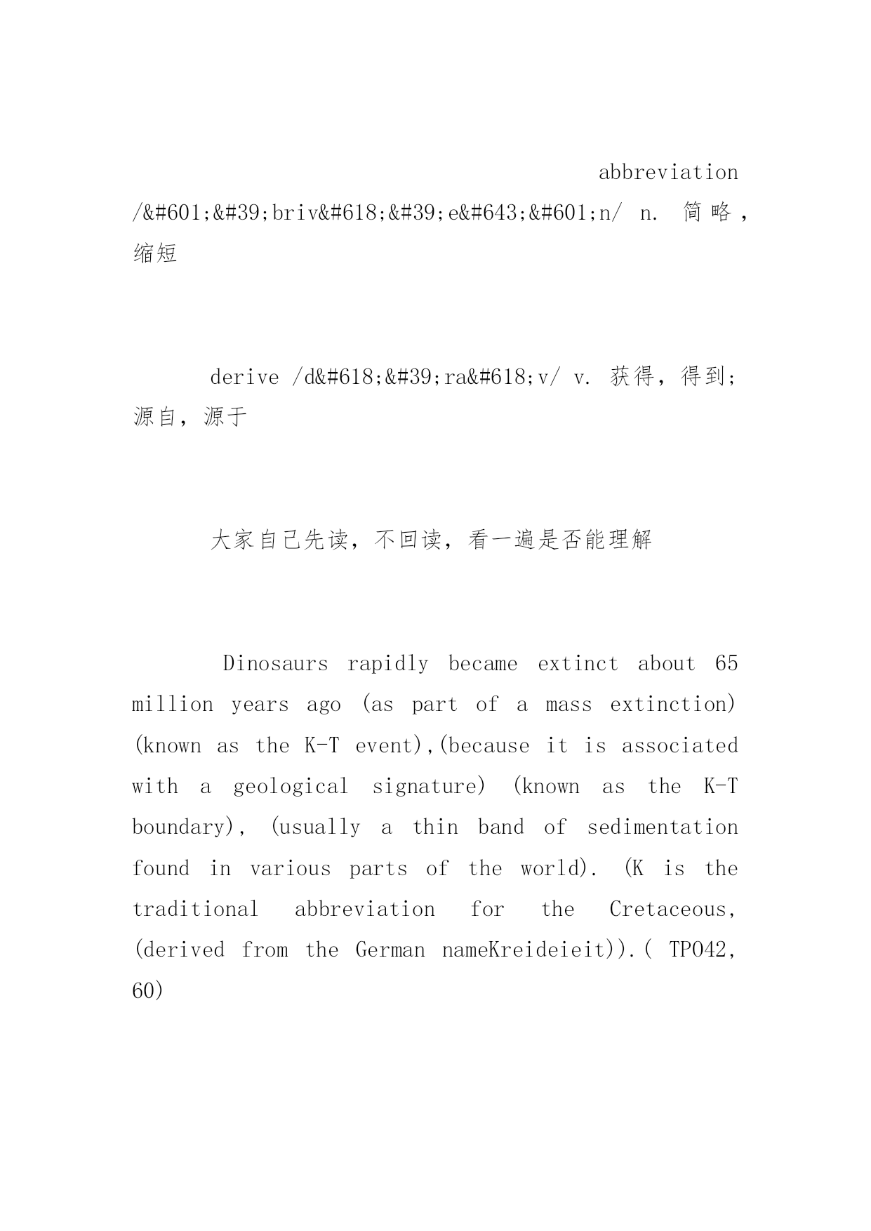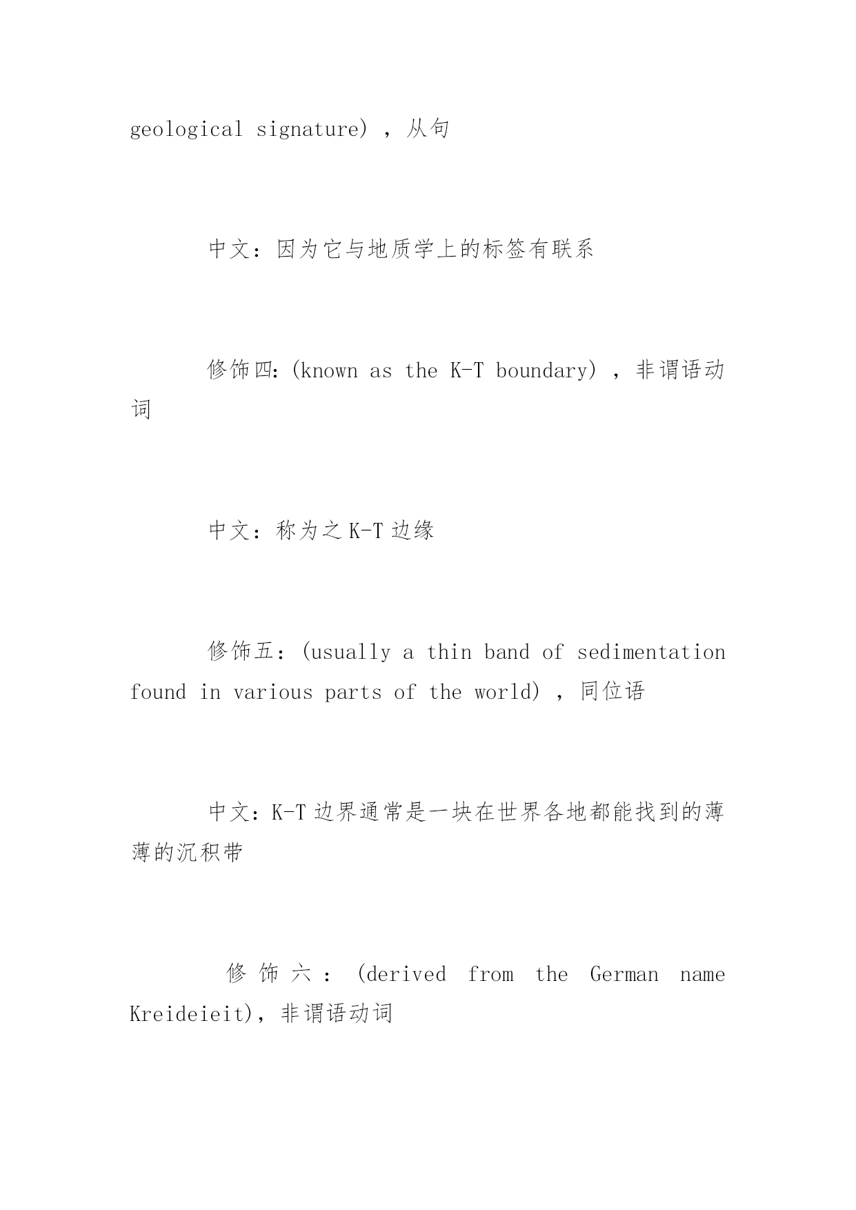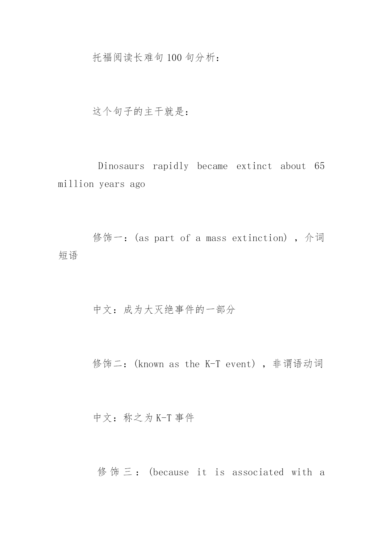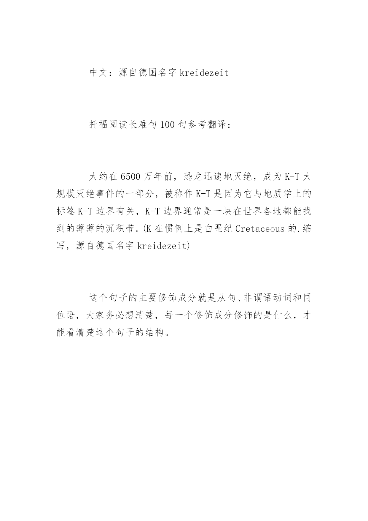 托福阅读备考长难句分析 2016托福阅读备考长难句分析 很多考生觉得托福考试有用难度,但只要我们能好好备考,好好准备,相信许多考生都能取得好的成绩。以下是yjbys网小编整理的关于托福阅读备考长难句分析,供大家备考。 托福阅读备考长难句分析之白垩纪灭绝事件: Dinosaursrapidlybecameextinctabout65millionyearsagoaspartofamassextinctionknownastheK-Tevent,becauseitisassociatedwithageologicalsignatureknownastheK-Tboundary,usuallyathinbandofsedimentationfoundinvariouspartsoftheworld.(KisthetraditionalabbreviationfortheCretaceous,derivedfromtheGermannameKreideieit).(TPO42,60) abbreviation/ə'brivɪ'eʃən/n.简略,缩短 derive/dɪ'raɪv/v.获得,得到;源自,源于 大家自己先读,不回读,看一遍是否能理解 Dinosaursrapidlybecameextinctabout65millionyearsago(aspartofamassextinction)(knownastheK-Tevent),(becauseitisassociatedwithageologicalsignature)(knownastheK-Tboundary),(usuallyathinbandofsedimentationfoundinvariouspartsoftheworld).(KisthetraditionalabbreviationfortheCretaceous,(derivedfromtheGermannameKreideieit)).(TPO42,60) 托福阅读长难句100句分析: 这个句子的主干就是: Dinosaursrapidlybecameextinctabout65millionyearsago 修饰一:(aspartofamassextinction),介词短语 中文:成为大灭绝事件的一部分 修饰二:(knownastheK-Tevent),非谓语动词 中文:称之为K-T事件 修饰三:(becauseitisassociatedwithageologicalsignature),从句 中文:因为它与地质学上的标签有联系 修饰四:(knownastheK-Tboundary),非谓语动词 中文:称为之K-T边缘 修饰五:(usuallyathinbandofsedimentationfoundinvariouspartsoftheworld),同位语 中文:K-T边界通常是一块在世界各地都能找到的薄薄的沉积带 修饰六:(derivedfromtheGermannameKreideieit),非谓语动词 中文:源自德国名字kreidezeit 托福阅读长难句100句参考翻译: 大约在6500万年前,恐龙迅速地灭绝,成为K-T大规模灭绝事件的一部分,被称作K-T是因为它与地质学上的标签K-T边界有关,K-T边界通常是一块在世界各地都能找到的薄薄的沉积带。(K在惯例上是白垩纪Cretaceous的.缩写,源自德国名字kreidezeit) 这个句子的主要修饰成分就是从句、非谓语动词和同位语,大家务必想清楚,每一个修饰成分修饰的是什么,才能看清楚这个句子的结构。