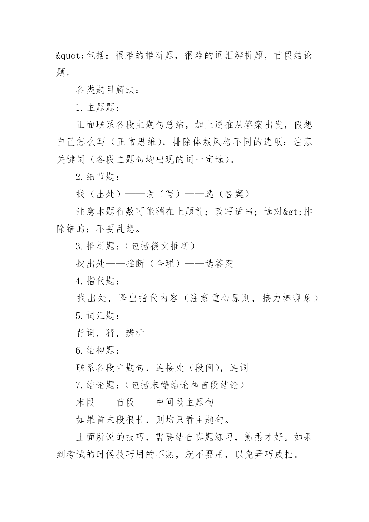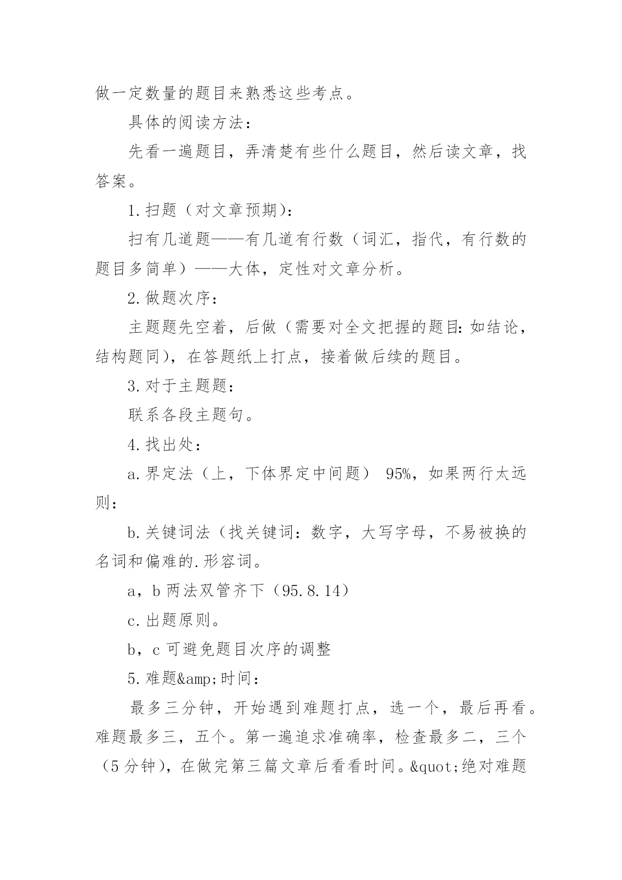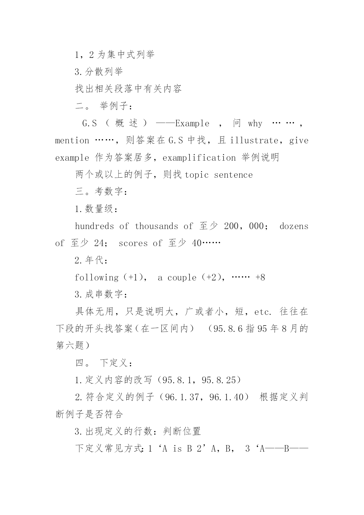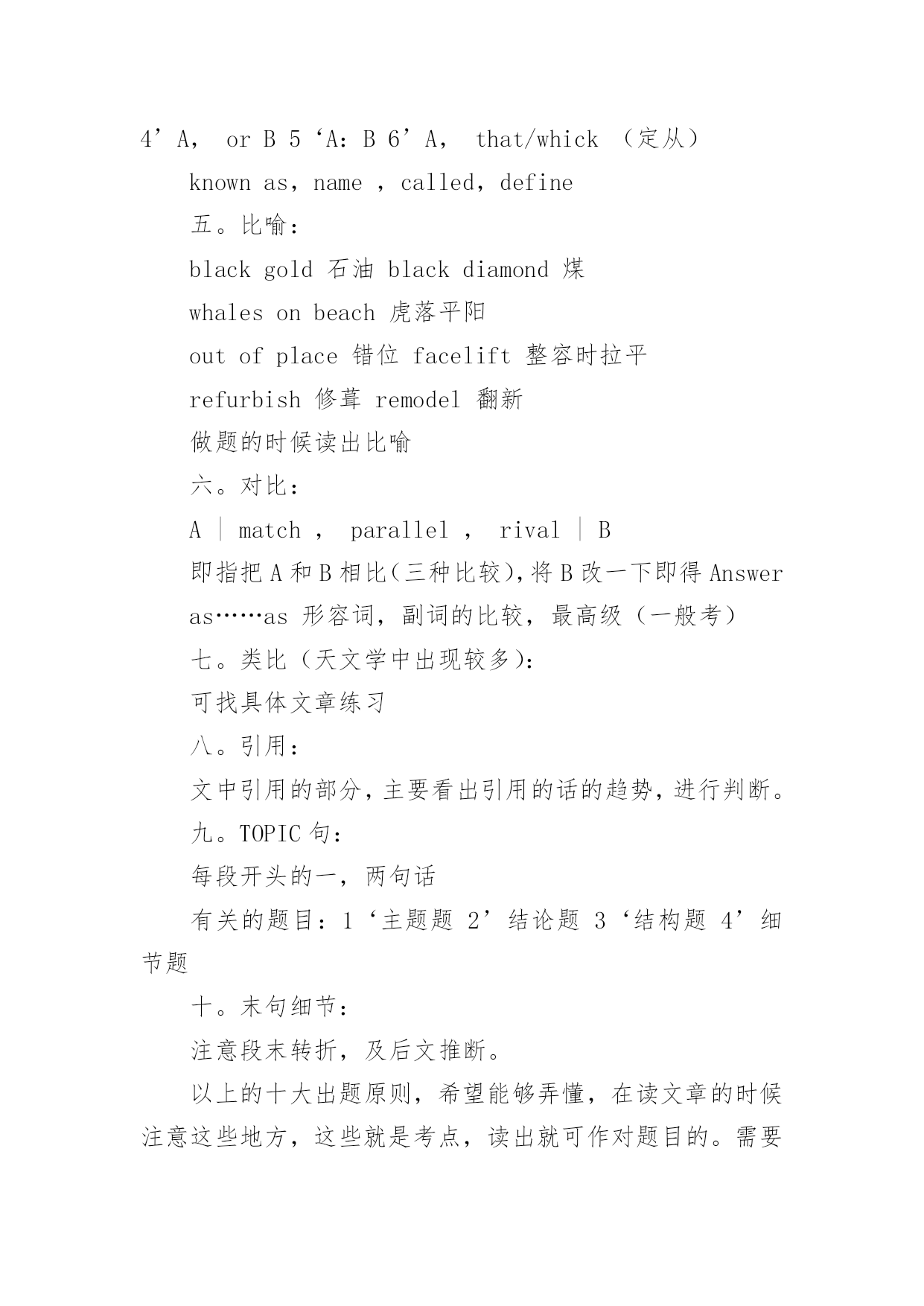 托福阅读的小技巧有哪些 托福阅读的小技巧有哪些如果词汇基础很好(比如说背过gre),读起托福阅读文章是享受的话,就不需要技巧了,只管去做题了。如果没有很强的词汇基础,可以看看。托福的阅读文章有五篇,共50道题,55分钟完成。题型共有如下几种,括号内是题目的数目:1.主题题(3——4)2.细节题(18——22)3.词汇题(16——17)4.推断题(3——6)5.指代归纳题(3——6)7.结构题8.态度题9.答问题10.图形题阅读方法:1.全文通读(词汇基础厚,否则不用);2.带着问题找出处(1‘出题目有次序性;2’一道题的答案不与太多信息联系);3.topic(主题句)+考点。我重点推荐第三种方法。ok,用第三种方法读阅读文章,有两点目的,第一读出文章大意,第二读出考点。读出各段主题句——topic,读出考点(了解出题原则)。十种重要的出题原则(***):一。列举:1.列举名词a,b,c,andd(逗号离得近算)插入语例外a,b,c,andd中谁特殊选谁2.列举sentence1,2为集中式列举3.分散列举找出相关段落中有关内容二。举例子:G.S(概述)——Example,问why……,mention……,则答案在G.S中找,且illustrate,giveexample作为答案居多,examplification举例说明两个或以上的例子,则找topicsentence三。考数字:1.数量级:hundredsofthousandsof至少200,000;dozensof至少24;scoresof至少40……2.年代:following(+1),acouple(+2),……+83.成串数字:具体无用,只是说明大,广或者小,短,etc.往往在下段的开头找答案(在一区间内)(95.8.6指95年8月的第六题)四。下定义:1.定义内容的改写(95.8.1,95.8.25)2.符合定义的例子(96.1.37,96.1.40)根据定义判断例子是否符合3.出现定义的行数:判断位置下定义常见方式:1‘AisB2’A,B,3‘A——B——4’A,orB5‘A:B6’A,that/whick(定从)knownas,name,called,define五。比喻:blackgold石油blackdiamond煤whalesonbeach虎落平阳outofplace错位facelift整容时拉平refurbish修葺remodel翻新做题的时候读出比喻六。对比:A|match,parallel,rival|B即指把A和B相比(三种比较),将B改一下即得Answeras……as形容词,副词的比较,最高级(一般考)七。类比(天文学中出现较多):可找具体文章练习八。引用:文中引用的部分,主要看出引用的话的趋势,进行判断。九。TOPIC句:每段开头的一,两句话有关的题目:1‘主题题2’结论题3‘结构题4’细节题十。末句细节:注意段末转折,及后文推断。以上的十大出题原则,希望能够弄懂,在读文章的时候注意这些地方,这些就是考点,读出就可作对题目的。需要做一定数量的题目来熟悉这些考点。具体的阅读方法:先看一遍题目,弄清楚有些什么题目,然后读文章,找答案。1.扫题(对文章预期):扫有几道题——有几道有行数(词汇,指代,有行数的题目多简单)——大体,定性对文章分析。2.做题次序:主题题先空着,后做(需要对全文把握的题目:如结论,结构题同),在答题纸上打点,接着做后续的题目。3.对于主题题:联系各段主题句。4.找出处:a.界定法(上,下体界定中间题)95%,如果两行太远则:b.关键词法(找关键词:数字,大写字母,不易被换的名词和偏难的.形容词。a,b两法双管齐下(95.8.14)c.出题原则。b,c可避免题目次序的调整5.难题&时间:最多三分钟,开始遇到难题打点,选一个,最后再看。难题最多三,五个。第一遍追求准确率,检查最多二,三个(5分钟),在做完第三篇文章后看看时间。"绝对难题"包括:很难的推断题,很难的词汇辨析题,首段结论题。各类题目解法:1.主题题:正面联系各段主题句总结,加上逆推从答案出发,假想自己怎么写(正常思维),排除体裁风格不同的选项;注意关键词(各段主题句均出现的词一定选)。2.细节题:找(出处)——改(写)——选(答案)注意本题行数可能稍在上题前;改写适当;选对>排除错的;不要乱想。3.推断题:(包括後文推断)找出处——推断(合理)——选答案4.指代题:找出处,译出指代内容(注意重心原则,接力棒现象)5.词汇题:背词,猜,辨析6.结构题:联系各段主题句,连接处(段间),连词7.结论题:(包括末端结论和首段结论)末段——首段——中间段主题句如果首末段很长,则均只看主题句。上面所说的技巧,需要结合真题练习,熟悉才好。如果到