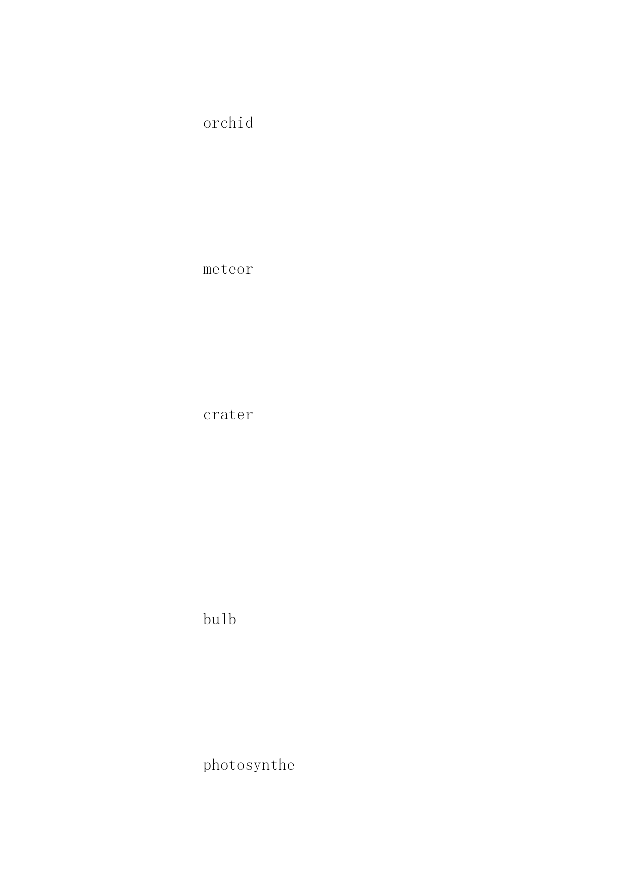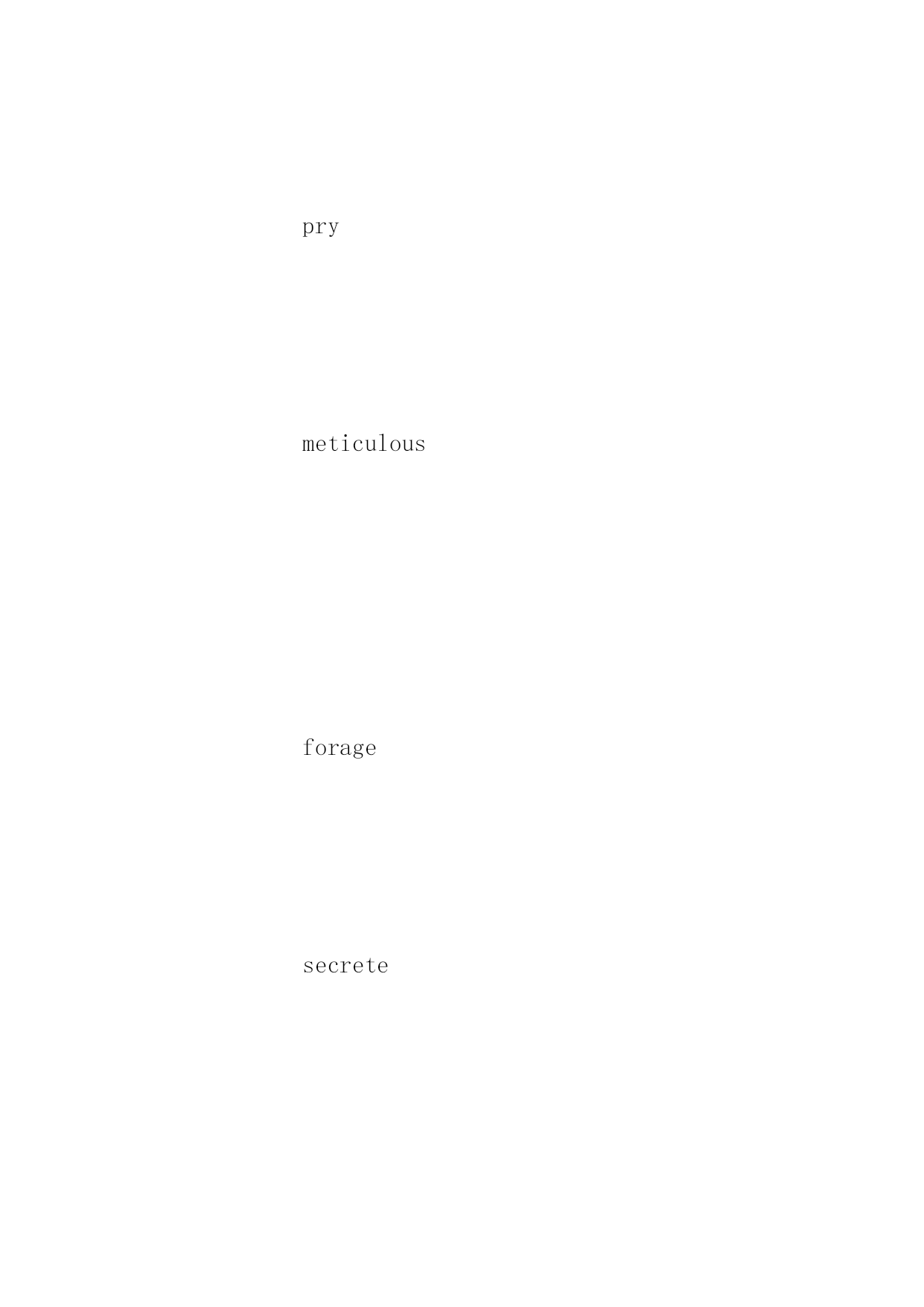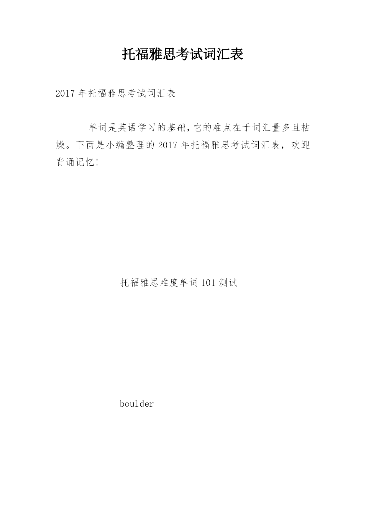 托福雅思考试词汇表 2017年托福雅思考试词汇表 单词是英语学习的基础,它的难点在于词汇量多且枯燥。下面是小编整理的2017年托福雅思考试词汇表,欢迎背诵记忆! 托福雅思难度单词101测试 boulder orchid meteor crater bulb photosynthe plaza earthenwar etch scavenger pry meticulous forage secrete sunlit motif genre spiky hijack oyster herb abhor aquatic predator snack embellish bipedal roam incentive gentle bumblebee devastate lathe incessant heritage facade mosaic pigment invertebrate influx nebula plummet jumble replenish nostalgia beacon precursor chunk funnel burrow acoustical intoxication hexagon delta chapel turnpike limestone disseminate silt yearn modem ion symbiosis adjunct saber rodent viable impervious sloth thorny celestial ledge stagecoach akin exuberant rhinoceros asteroid beak ichthyosaur mammalian baboon hypersensitive
