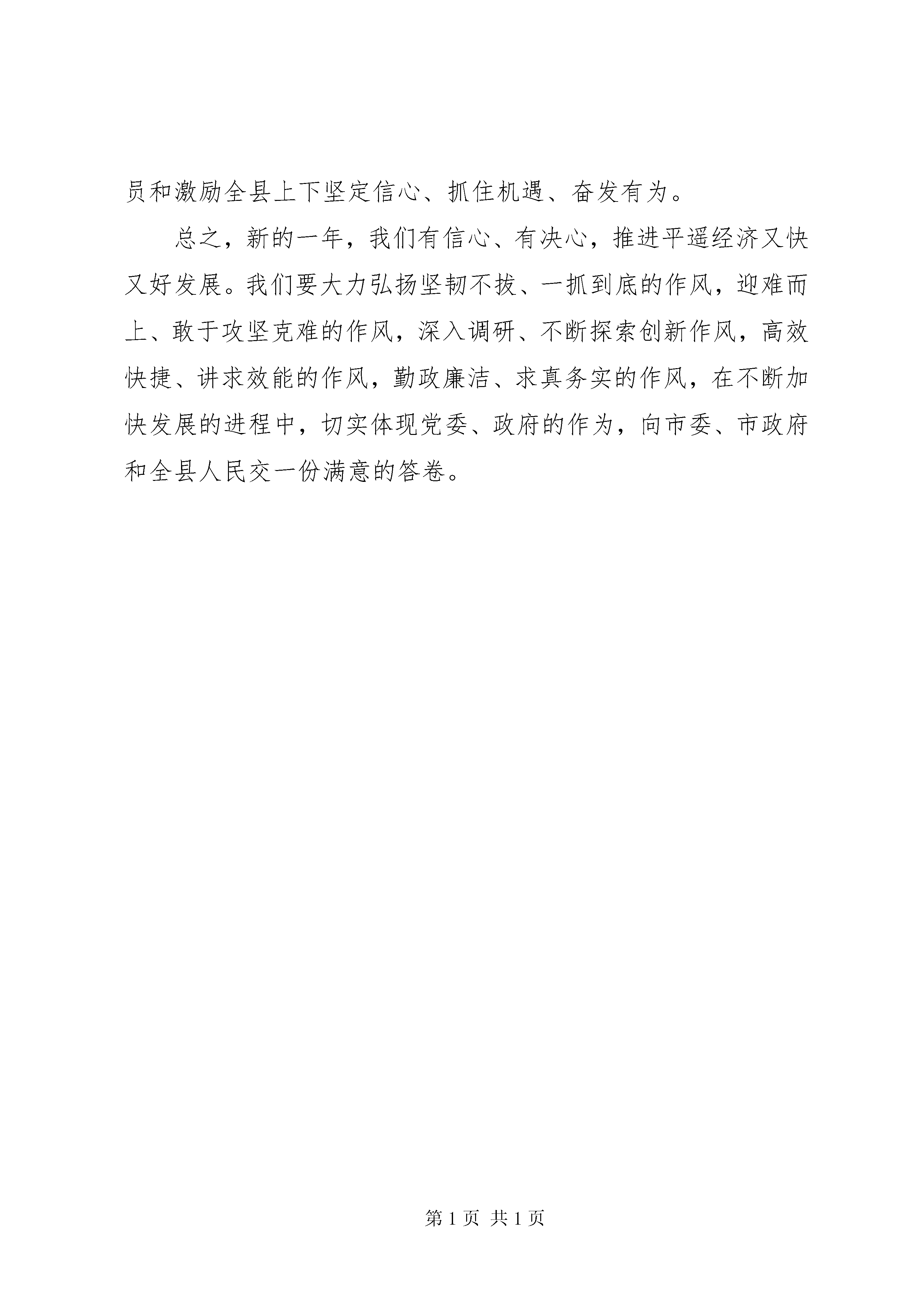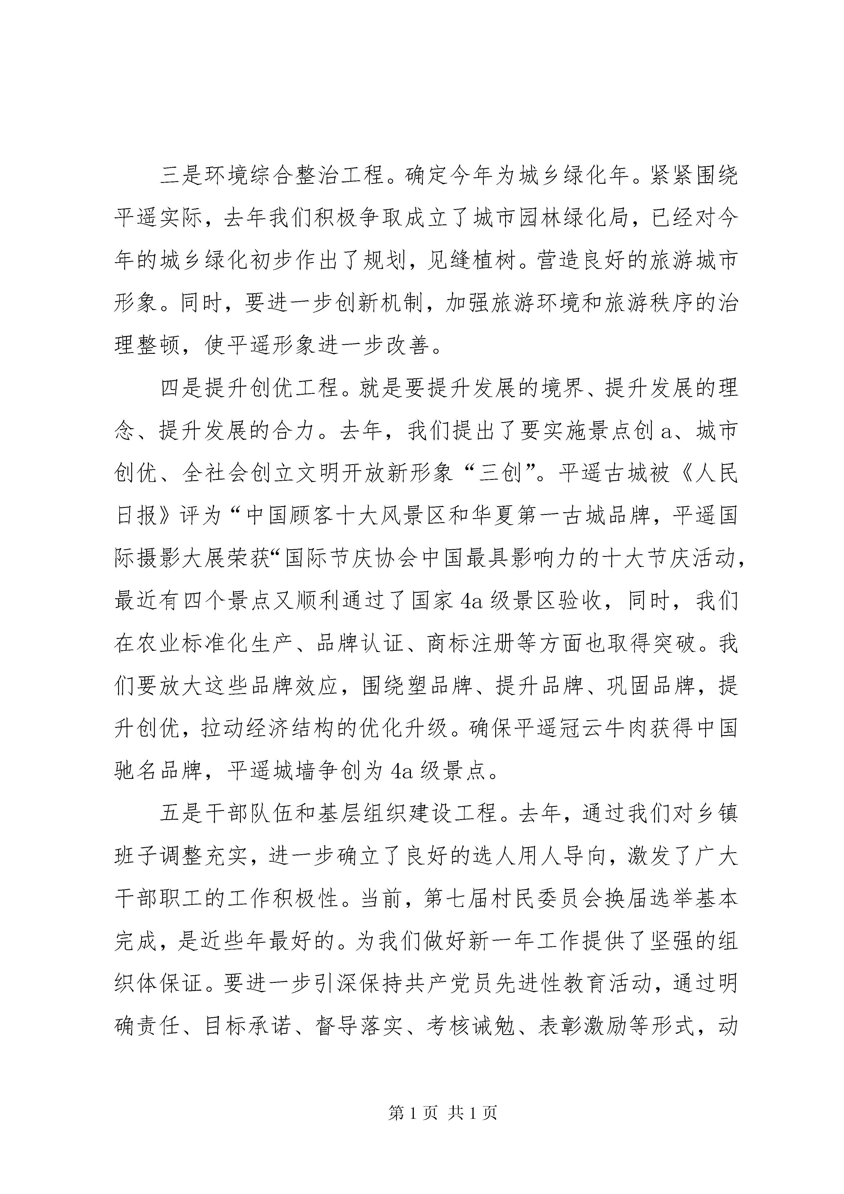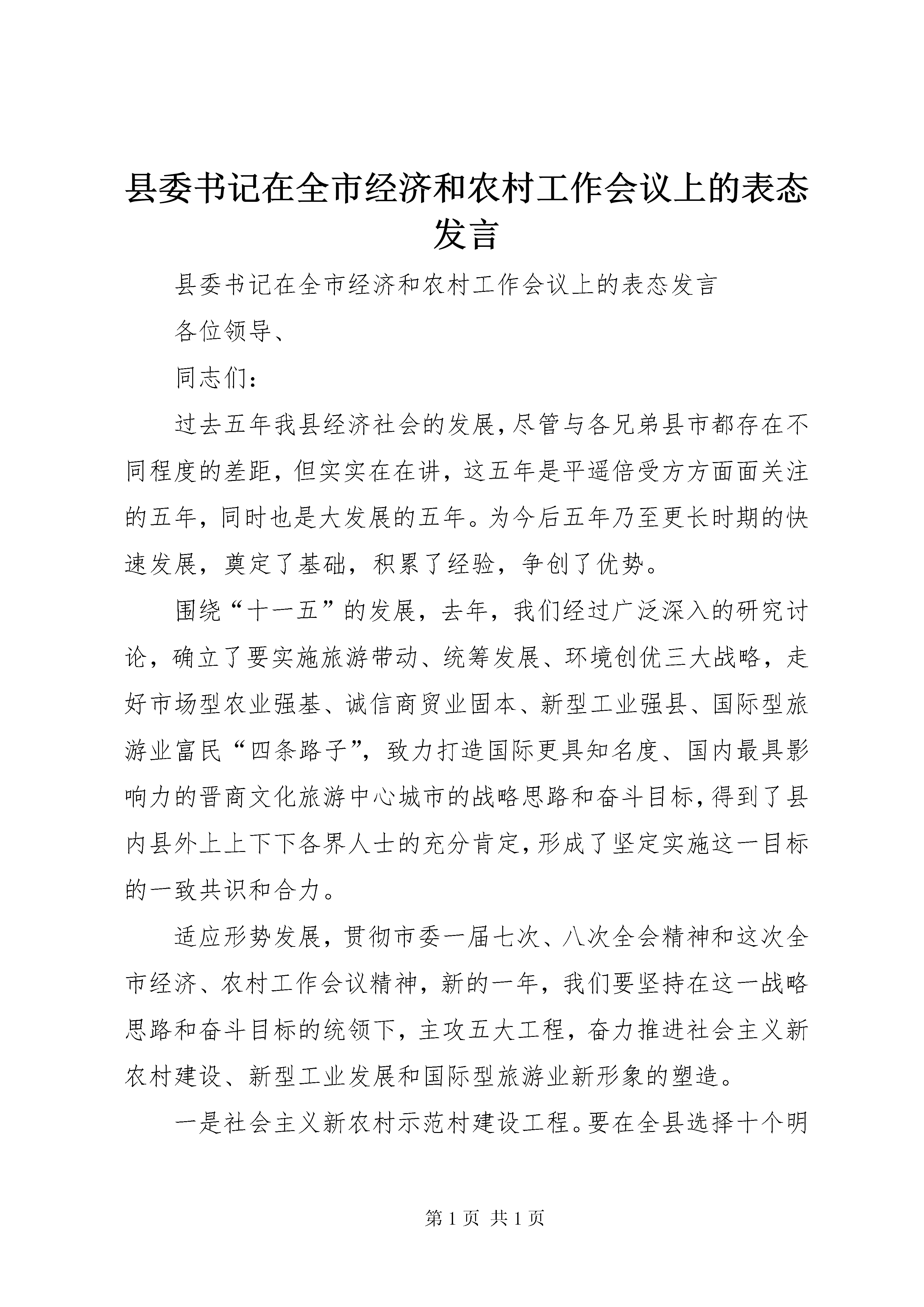 县委书记在全市经济和农村工作会议上的表态发言县委书记在全市经济和农村工作会议上的表态发言各位领导、同志们:过去五年我县经济社会的发展,尽管与各兄弟县市都存在不同程度的差距,但实实在在讲,这五年是平遥倍受方方面面关注的五年,同时也是大发展的五年。为今后五年乃至更长时期的快速发展,奠定了基础,积累了经验,争创了优势。围绕“十一五”的发展,去年,我们经过广泛深入的研究讨论,确立了要实施旅游带动、统筹发展、环境创优三大战略,走好市场型农业强基、诚信商贸业固本、新型工业强县、国际型旅游业富民“四条路子”,致力打造国际更具知名度、国内最具影响力的晋商文化旅游中心城市的战略思路和奋斗目标,得到了县内县外上上下下各界人士的充分肯定,形成了坚定实施这一目标的一致共识和合力。适应形势发展,贯彻市委一届七次、八次全会精神和这次全市经济、农村工作会议精神,新的一年,我们要坚持在这一战略思路和奋斗目标的统领下,主攻五大工程,奋力推进社会主义新农村建设、新型工业发展和国际型旅游业新形象的塑造。一是社会主义新农村示范村建设工程。要在全县选择十个明星农村,按照生产发展、生活富裕、乡风文明、村容整洁、管理民主的要求,集中培育和发展,树典型、作示范、立榜样,形成建设社(更多精彩文章来自“秘书不求人”)会主义新农村的浓厚氛围。通过“两个反哺”使农业得到一个持续发展的基础,稳步推进农村社会向和谐社会发展。二是项目攻坚工程。要在全县上下进一步强化项目意识,继续坚持工程统领、项目实施的工作方式。把项目的选择、实施、攻坚作为经济工作的重要着力点,作为衡量和考核各经济主管部门和各乡镇党委、政府的重要杠杆。我们已经明确确定了农业、工业、城建旅游业新一年的重点工程项目,要实行项目责任制、承诺制。农业方面,重点抓好尹回水库除险加固,农业综合开发,五阳面粉厂20万亩优质小麦生产基地,龙海实业2万吨熟肉制品生产线,牛肉集团2万吨肉制品生产线。工业方面,要抓好电厂项目、金昌60万吨机焦项目、澳大利亚9000吨非织造布生产线,同时按照煤焦业向化工发展,铸造业向机械制造业发展,橡胶业向环保型、绿色型发展,针织制鞋旅游工艺品要向规模化、集团化、品牌经营发展,明确要求每一户煤焦、铸造企业要确保新上一个新型化的项目。城建旅游业方面,要按照《建设国际一旅游目的地规划》,突出抓好古城保护和城市发展规划的修编,南城墙700亩旅游广场建设,古城电线电缆入地消防管网建设,古城墙逐步抢修,三坝温泉项目工程。三是环境综合整治工程。确定今年为城乡绿化年。紧紧围绕平遥实际,去年我们积极争取成立了城市园林绿化局,已经对今年的城乡绿化初步作出了规划,见缝植树。营造良好的旅游城市形象。同时,要进一步创新机制,加强旅游环境和旅游秩序的治理整顿,使平遥形象进一步改善。四是提升创优工程。就是要提升发展的境界、提升发展的理念、提升发展的合力。去年,我们提出了要实施景点创a、城市创优、全社会创立文明开放新形象“三创”。平遥古城被《人民日报》评为“中国顾客十大风景区和华夏第一古城品牌,平遥国际摄影大展荣获“国际节庆协会中国最具影响力的十大节庆活动,最近有四个景点又顺利通过了国家4a级景区验收,同时,我们在农业标准化生产、品牌认证、商标注册等方面也取得突破。我们要放大这些品牌效应,围绕塑品牌、提升品牌、巩固品牌,提升创优,拉动经济结构的优化升级。确保平遥冠云牛肉获得中国驰名品牌,平遥城墙争创为4a级景点。五是干部队伍和基层组织建设工程。去年,通过我们对乡镇班子调整充实,进一步确立了良好的选人用人导向,激发了广大干部职工的工作积极性。当前,第七届村民委员会换届选举基本完成,是近些年最好的。为我们做好新一年工作提供了坚强的组织体保证。要进一步引深保持共产党员先进性教育活动,通过明确责任、目标承诺、督导落实、考核诫勉、表彰激励等形式,动员和激励全县上下坚定信心、抓住机遇、奋发有为。总之,新的一年,我们有信心、有决心,推进平遥经济又快又好发展。我们要大力弘扬坚韧不拔、一抓到底的作风,迎难而上、敢于攻坚克难的作风,深入调研、不断探索创新作风,高效快捷、讲求效能的作风,勤政廉洁、求真务实的作风,在不断加快发展的进程中,切实体现党委、政府的作为,向市委、市政府和全县人民交一份满意的答卷。