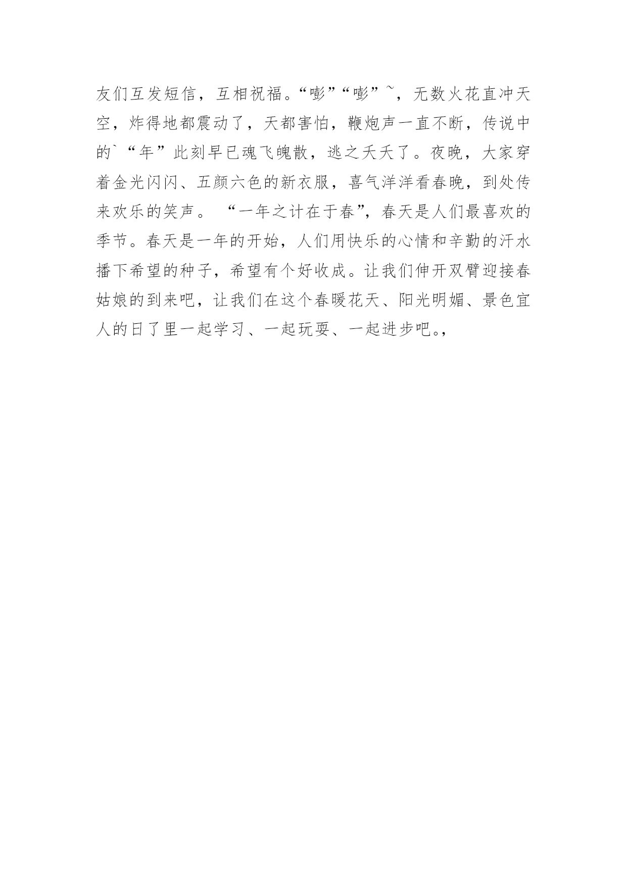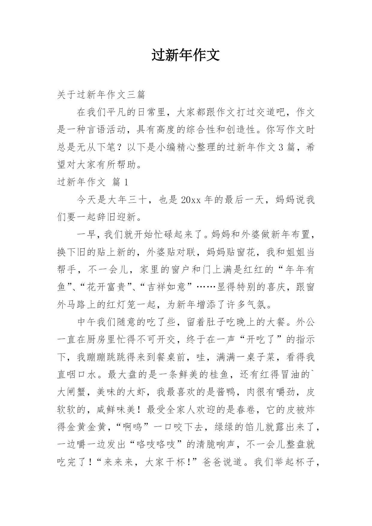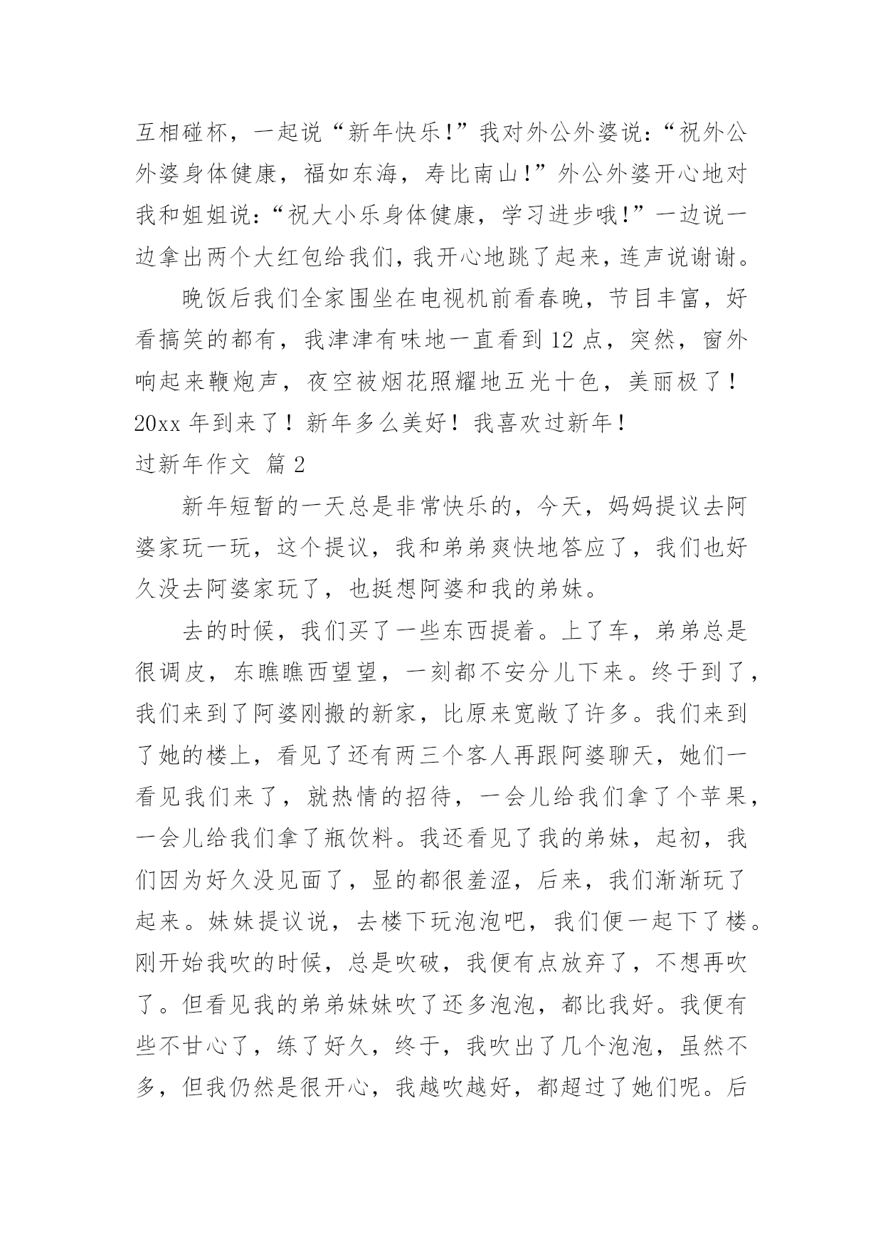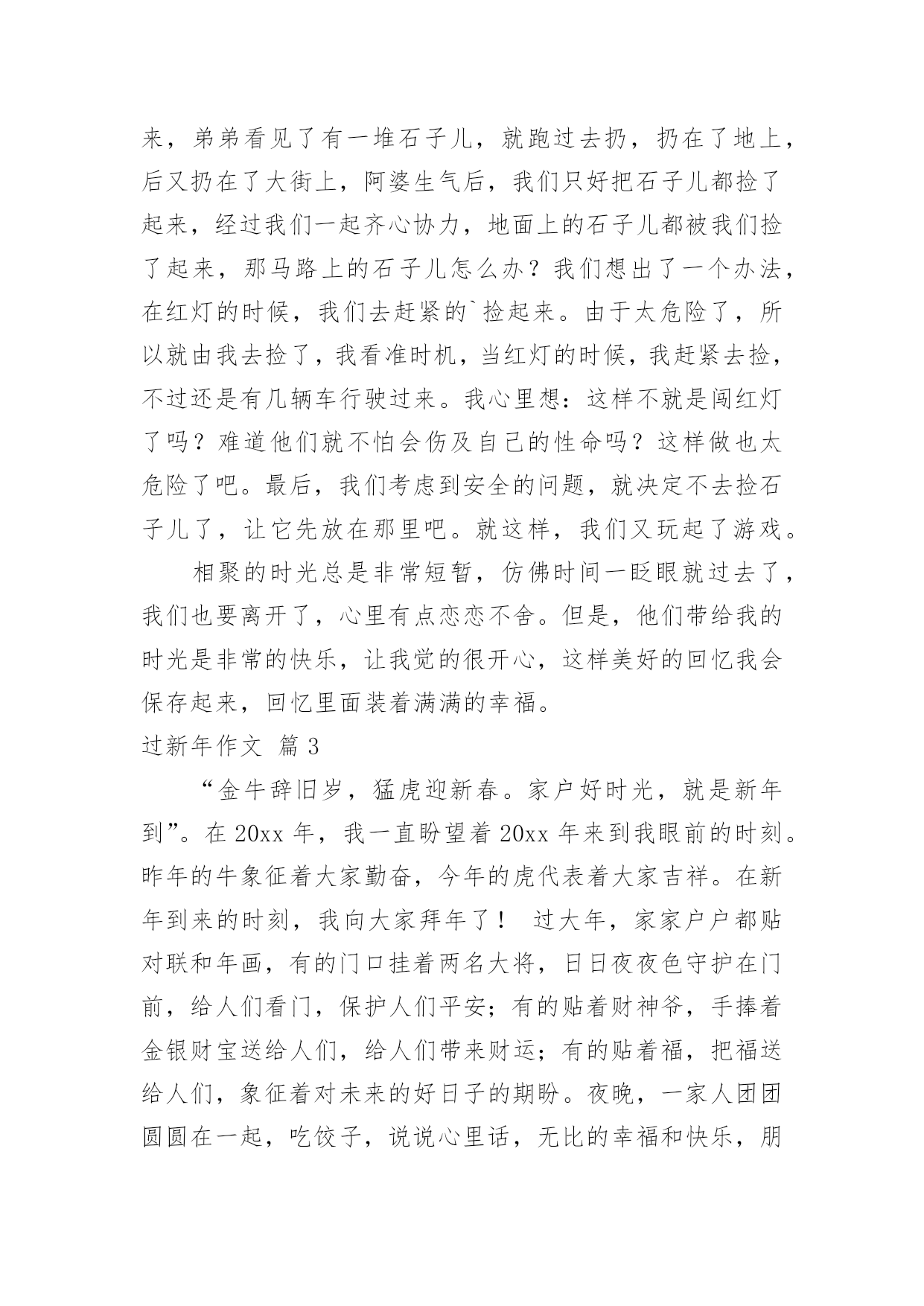 过新年作文 关于过新年作文三篇在我们平凡的日常里,大家都跟作文打过交道吧,作文是一种言语活动,具有高度的综合性和创造性。你写作文时总是无从下笔?以下是小编精心整理的过新年作文3篇,希望对大家有所帮助。过新年作文篇1今天是大年三十,也是20xx年的最后一天,妈妈说我们要一起辞旧迎新。一早,我们就开始忙碌起来了。妈妈和外婆做新年布置,换下旧的贴上新的,外婆贴对联,妈妈贴窗花,我和姐姐当帮手,不一会儿,家里的窗户和门上满是红红的“年年有鱼”、“花开富贵”、“吉祥如意”……显得特别的喜庆,跟窗外马路上的红灯笼一起,为新年增添了许多气氛。中午我们随意的吃了些,留着肚子吃晚上的大餐。外公一直在厨房里忙得不可开交,终于在一声“开吃了”的指示下,我蹦蹦跳跳得来到餐桌前,哇,满满一桌子菜,看得我直咽口水。最大盘的是一条鲜美的桂鱼,还有红得冒油的`大闸蟹,美味的大虾,我最喜欢的是酱鸭,肉很有嚼劲,皮软软的,咸鲜味美!最受全家人欢迎的是春卷,它的皮被炸得金黄金黄,“啊呜”一口咬下去,绿绿的馅儿就露出来了,一边嚼一边发出“咯吱咯吱”的清脆响声,不一会儿整盘就吃完了!“来来来,大家干杯!”爸爸说道。我们举起杯子,互相碰杯,一起说“新年快乐!”我对外公外婆说:“祝外公外婆身体健康,福如东海,寿比南山!”外公外婆开心地对我和姐姐说:“祝大小乐身体健康,学习进步哦!”一边说一边拿出两个大红包给我们,我开心地跳了起来,连声说谢谢。晚饭后我们全家围坐在电视机前看春晚,节目丰富,好看搞笑的都有,我津津有味地一直看到12点,突然,窗外响起来鞭炮声,夜空被烟花照耀地五光十色,美丽极了!20xx年到来了!新年多么美好!我喜欢过新年!过新年作文篇2新年短暂的一天总是非常快乐的,今天,妈妈提议去阿婆家玩一玩,这个提议,我和弟弟爽快地答应了,我们也好久没去阿婆家玩了,也挺想阿婆和我的弟妹。去的时候,我们买了一些东西提着。上了车,弟弟总是很调皮,东瞧瞧西望望,一刻都不安分儿下来。终于到了,我们来到了阿婆刚搬的新家,比原来宽敞了许多。我们来到了她的楼上,看见了还有两三个客人再跟阿婆聊天,她们一看见我们来了,就热情的招待,一会儿给我们拿了个苹果,一会儿给我们拿了瓶饮料。我还看见了我的弟妹,起初,我们因为好久没见面了,显的都很羞涩,后来,我们渐渐玩了起来。妹妹提议说,去楼下玩泡泡吧,我们便一起下了楼。刚开始我吹的时候,总是吹破,我便有点放弃了,不想再吹了。但看见我的弟弟妹妹吹了还多泡泡,都比我好。我便有些不甘心了,练了好久,终于,我吹出了几个泡泡,虽然不多,但我仍然是很开心,我越吹越好,都超过了她们呢。后来,弟弟看见了有一堆石子儿,就跑过去扔,扔在了地上,后又扔在了大街上,阿婆生气后,我们只好把石子儿都捡了起来,经过我们一起齐心协力,地面上的石子儿都被我们捡了起来,那马路上的石子儿怎么办?我们想出了一个办法,在红灯的时候,我们去赶紧的`捡起来。由于太危险了,所以就由我去捡了,我看准时机,当红灯的时候,我赶紧去捡,不过还是有几辆车行驶过来。我心里想:这样不就是闯红灯了吗?难道他们就不怕会伤及自己的性命吗?这样做也太危险了吧。最后,我们考虑到安全的问题,就决定不去捡石子儿了,让它先放在那里吧。就这样,我们又玩起了游戏。相聚的时光总是非常短暂,仿佛时间一眨眼就过去了,我们也要离开了,心里有点恋恋不舍。但是,他们带给我的时光是非常的快乐,让我觉的很开心,这样美好的回忆我会保存起来,回忆里面装着满满的幸福。过新年作文篇3“金牛辞旧岁,猛虎迎新春。家户好时光,就是新年到”。在20xx年,我一直盼望着20xx年来到我眼前的时刻。昨年的牛象征着大家勤奋,今年的虎代表着大家吉祥。在新年到来的时刻,我向大家拜年了!过大年,家家户户都贴对联和年画,有的门口挂着两名大将,日日夜夜色守护在门前,给人们看门,保护人们平安;有的贴着财神爷,手捧着金银财宝送给人们,给人们带来财运;有的贴着福,把福送给人们,象征着对未来的好日子的期盼。夜晚,一家人团团圆圆在一起,吃饺子,说说心里话,无比的幸福和快乐,朋友们互发短信,互相祝福。“嘭”“嘭”~,无数火花直冲天空,炸得地都震动了,天都害怕,鞭炮声一直不断,传说中的`“年”此刻早已魂飞魄散,逃之夭夭了。夜晚,大家穿着金光闪闪、五颜六色的新衣服,喜气洋洋看春晚,到处传来欢乐的笑声。“一年之计在于春”,春天是人们最喜欢的季节。春天是一年的开始,人们用快乐的心情和辛勤的汗水播下希望的种子,希望有个好收成。让我们伸开双臂迎接春姑娘的到来吧,让我们在这个春暖花天、阳光明媚、景色宜人的日了里一起学习、一起玩耍、一起进步吧。,