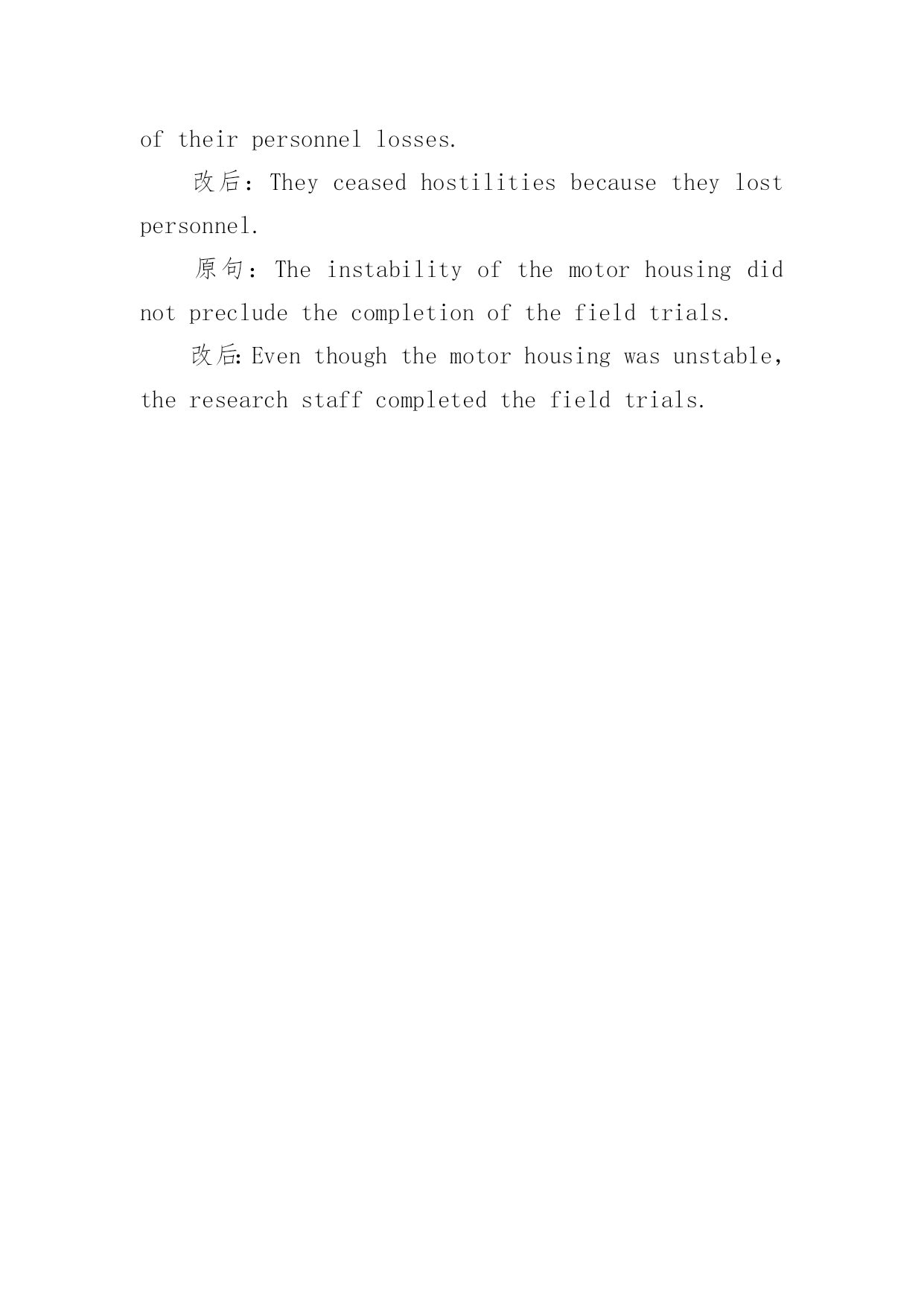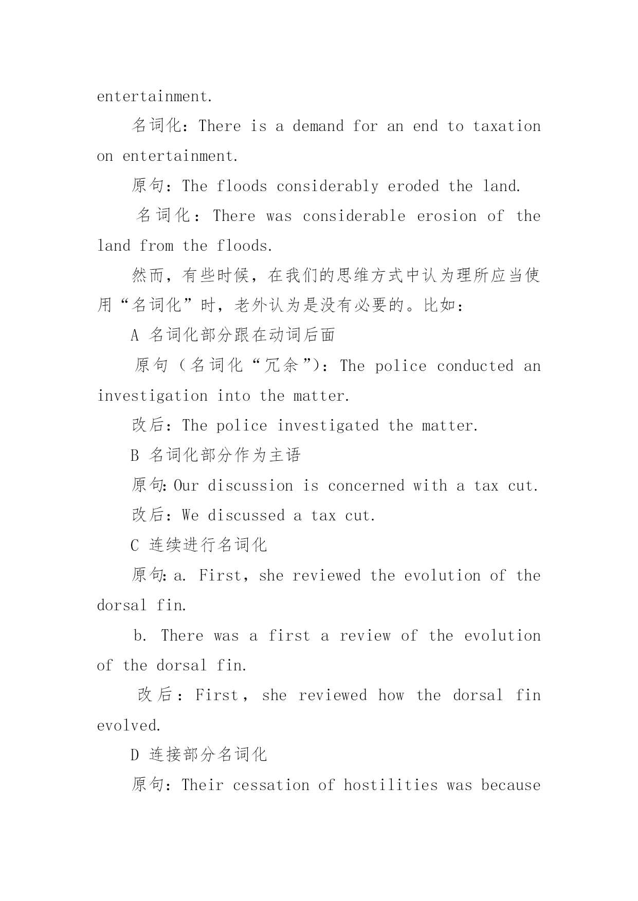 托福写作擅用名词化小诀窍 托福写作擅用名词化小诀窍A谓语动词的宾语部分。原句:Idonotknoweitherwhatshemeantorwhatheintends.名词化:Idonotknoweitherhermeaningorhisintentions.B结合被动形式原句:Ifpeopledecidewithoutenoughpersuasiveinformation,...名词化:Ifadecisionismadewithoutenoughpersuasiveinformation,...C取代诸如从句中“thefactthat”的用法原句:ThefactthatIdeniedwhatheaccusedmeofimpressedthejury.名词化:Mydenialofhisaccusationsimpressedthejury.更好的.名词化:a.WhenIdeniedhisaccusations,Iimpressedthejury.b.Indenyinghisaccusations,Iimpressedthejury.D名词化部分用在thereis/are的后面原句:Wedemandthatthegovernmentstoptaxingentertainment.名词化:Thereisademandforanendtotaxationonentertainment.原句:Thefloodsconsiderablyerodedtheland.名词化:Therewasconsiderableerosionofthelandfromthefloods.然而,有些时候,在我们的思维方式中认为理所应当使用“名词化”时,老外认为是没有必要的。比如:A名词化部分跟在动词后面原句(名词化“冗余”):Thepoliceconductedaninvestigationintothematter.改后:Thepoliceinvestigatedthematter.B名词化部分作为主语原句:Ourdiscussionisconcernedwithataxcut.改后:Wediscussedataxcut.C连续进行名词化原句:a.First,shereviewedtheevolutionofthedorsalfin.b.Therewasafirstareviewoftheevolutionofthedorsalfin.改后:First,shereviewedhowthedorsalfinevolved.D连接部分名词化原句:Theircessationofhostilitieswasbecauseoftheirpersonnellosses.改后:Theyceasedhostilitiesbecausetheylostpersonnel.原句:Theinstabilityofthemotorhousingdidnotprecludethecompletionofthefieldtrials.改后:Eventhoughthemotorhousingwasunstable,theresearchstaffcompletedthefieldtrials.