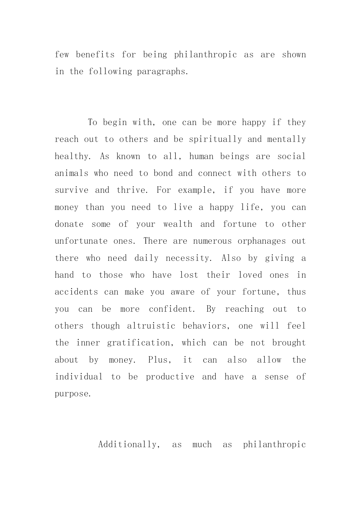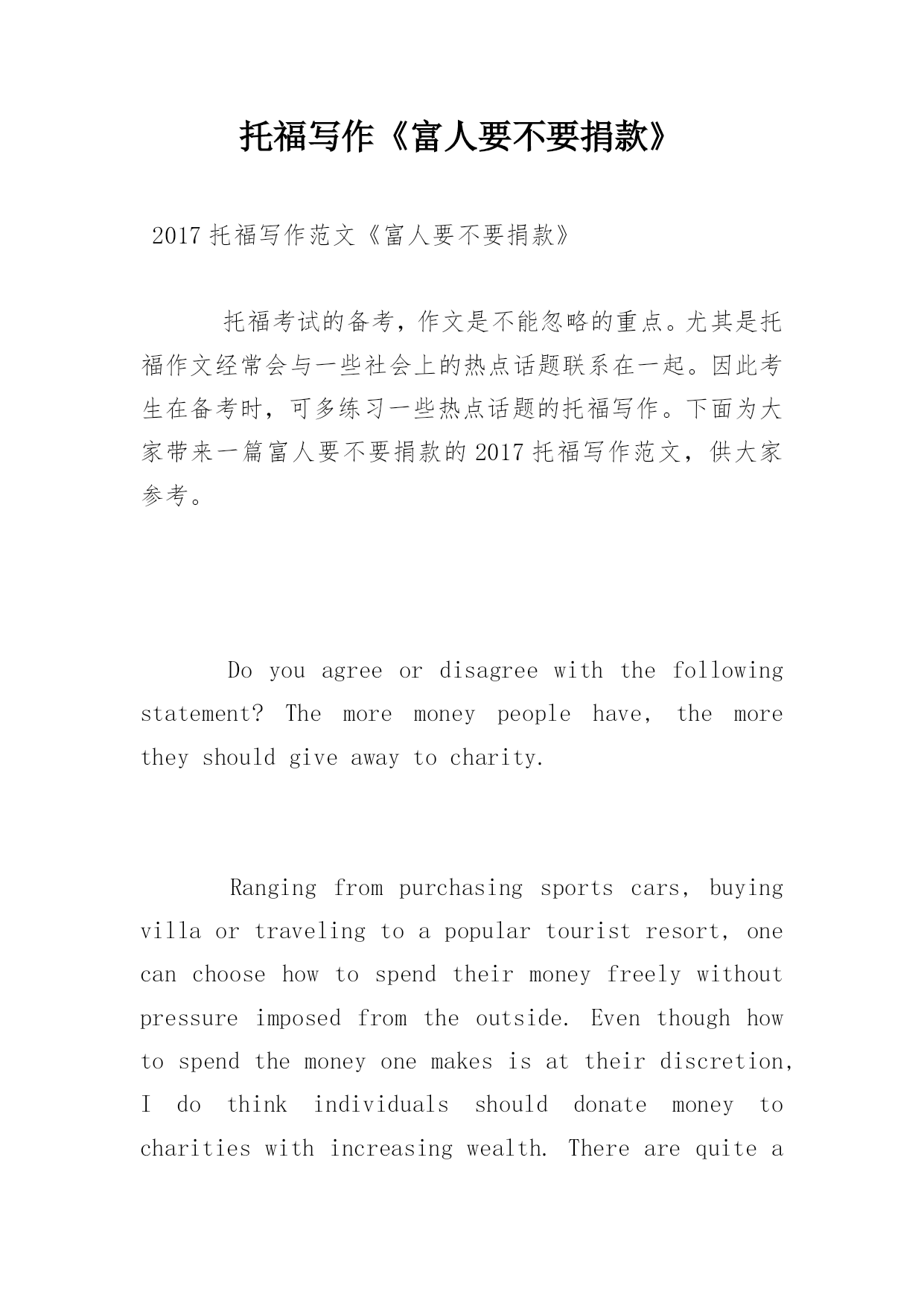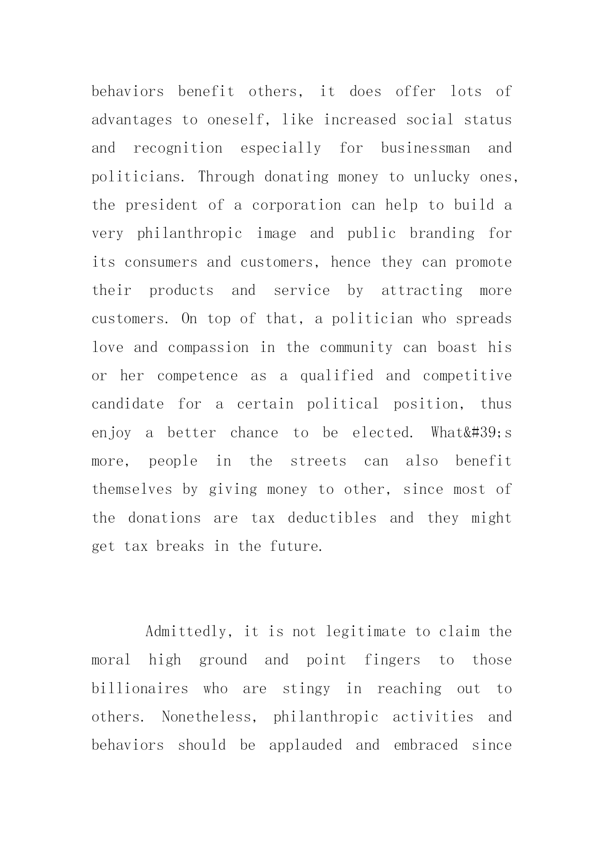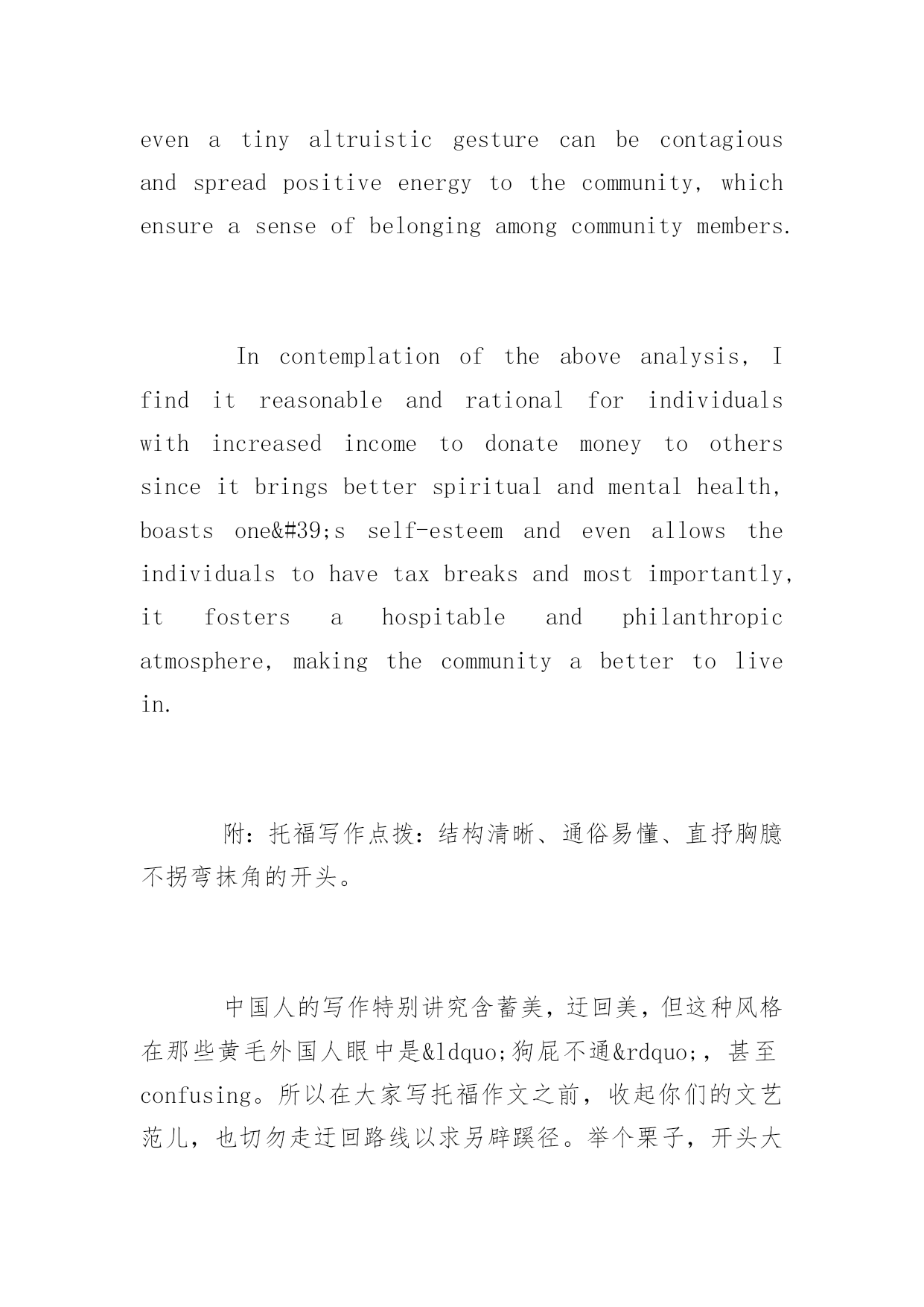 托福写作《富人要不要捐款》 2017托福写作范文《富人要不要捐款》 托福考试的备考,作文是不能忽略的重点。尤其是托福作文经常会与一些社会上的热点话题联系在一起。因此考生在备考时,可多练习一些热点话题的托福写作。下面为大家带来一篇富人要不要捐款的2017托福写作范文,供大家参考。 Doyouagreeordisagreewiththefollowingstatement?Themoremoneypeoplehave,themoretheyshouldgiveawaytocharity. Rangingfrompurchasingsportscars,buyingvillaortravelingtoapopulartouristresort,onecanchoosehowtospendtheirmoneyfreelywithoutpressureimposedfromtheoutside.Eventhoughhowtospendthemoneyonemakesisattheirdiscretion,Idothinkindividualsshoulddonatemoneytocharitieswithincreasingwealth.Therearequiteafewbenefitsforbeingphilanthropicasareshowninthefollowingparagraphs. Tobeginwith,onecanbemorehappyiftheyreachouttoothersandbespirituallyandmentallyhealthy.Asknowntoall,humanbeingsaresocialanimalswhoneedtobondandconnectwithotherstosurviveandthrive.Forexample,ifyouhavemoremoneythanyouneedtoliveahappylife,youcandonatesomeofyourwealthandfortunetootherunfortunateones.Therearenumerousorphanagesouttherewhoneeddailynecessity.Alsobygivingahandtothosewhohavelosttheirlovedonesinaccidentscanmakeyouawareofyourfortune,thusyoucanbemoreconfident.Byreachingouttoothersthoughaltruisticbehaviors,onewillfeeltheinnergratification,whichcanbenotbroughtaboutbymoney.Plus,itcanalsoallowtheindividualtobeproductiveandhaveasenseofpurpose. Additionally,asmuchasphilanthropicbehaviorsbenefitothers,itdoesofferlotsofadvantagestooneself,likeincreasedsocialstatusandrecognitionespeciallyforbusinessmanandpoliticians.Throughdonatingmoneytounluckyones,thepresidentofacorporationcanhelptobuildaveryphilanthropicimageandpublicbrandingforitsconsumersandcustomers,hencetheycanpromotetheirproductsandservicebyattractingmorecustomers.Ontopofthat,apoliticianwhospreadsloveandcompassioninthecommunitycanboasthisorhercompetenceasaqualifiedandcompetitivecandidateforacertainpoliticalposition,thusenjoyabetterchancetobeelected.What'smore,peopleinthestreetscanalsobenefitthemselvesbygivingmoneytoother,sincemostofthedonationsaretaxdeductiblesandtheymightgettaxbreaksinthefuture. Admittedly,itisnotle