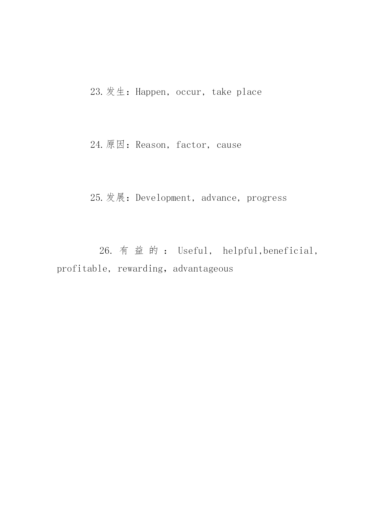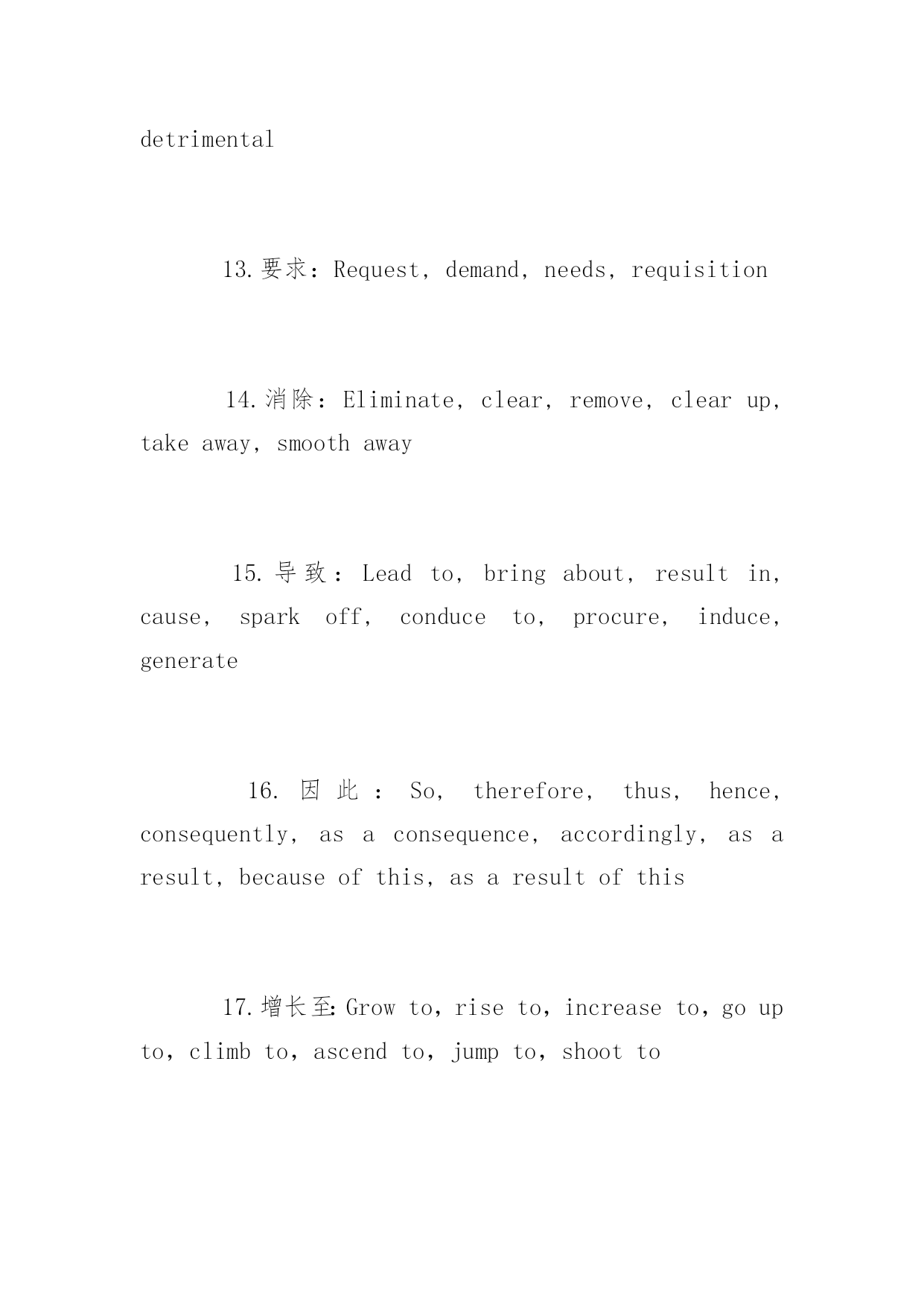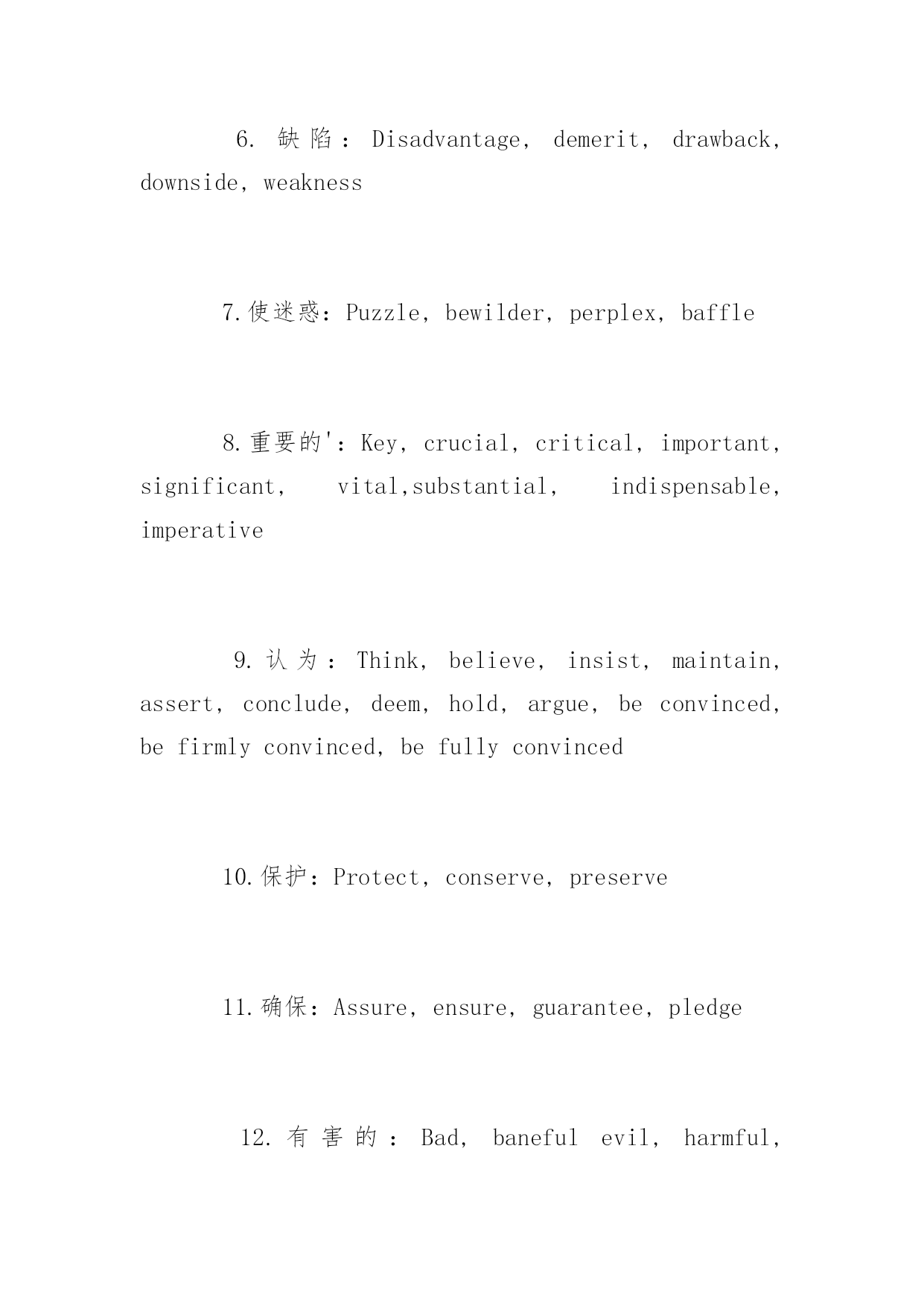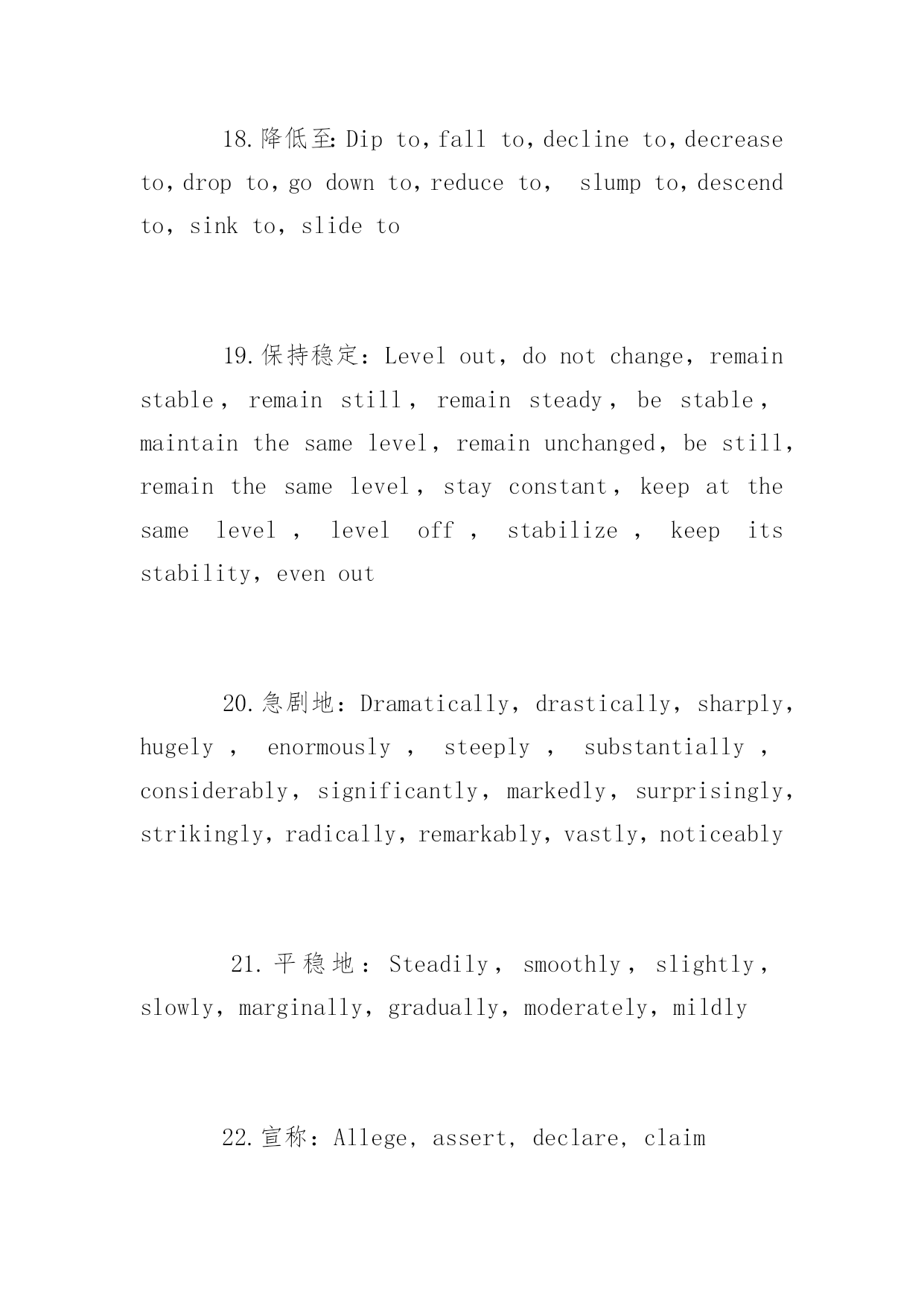 托福口语经典词汇 托福口语经典词汇2015精选 1.解决:Solve,dealwith,copewith,handle,resolve,address,tackle 2.损害:Damage,hurt,injure,harm,impair,undermine,jeopardize 3.给与:Give,offer,render,impart,provide,supply,afford 4.培养:Develop,cultivate,foster 5.优势:Advantage,merit,virtue,benefit,upside,strength 6.缺陷:Disadvantage,demerit,drawback,downside,weakness 7.使迷惑:Puzzle,bewilder,perplex,baffle 8.重要的':Key,crucial,critical,important,significant,vital,substantial,indispensable,imperative 9.认为:Think,believe,insist,maintain,assert,conclude,deem,hold,argue,beconvinced,befirmlyconvinced,befullyconvinced 10.保护:Protect,conserve,preserve 11.确保:Assure,ensure,guarantee,pledge 12.有害的:Bad,banefulevil,harmful,detrimental 13.要求:Request,demand,needs,requisition 14.消除:Eliminate,clear,remove,clearup,takeaway,smoothaway 15.导致:Leadto,bringabout,resultin,cause,sparkoff,conduceto,procure,induce,generate 16.因此:So,therefore,thus,hence,consequently,asaconsequence,accordingly,asaresult,becauseofthis,asaresultofthis 17.增长至:Growto,riseto,increaseto,goupto,climbto,ascendto,jumpto,shootto 18.降低至:Dipto,fallto,declineto,decreaseto,dropto,godownto,reduceto,slumpto,descendto,sinkto,slideto 19.保持稳定:Levelout,donotchange,remainstable,remainstill,remainsteady,bestable,maintainthesamelevel,remainunchanged,bestill,remainthesamelevel,stayconstant,keepatthesamelevel,leveloff,stabilize,keepitsstability,evenout 20.急剧地:Dramatically,drastically,sharply,hugely,enormously,steeply,substantially,considerably,significantly,markedly,surprisingly,strikingly,radically,remarkably,vastly,noticeably 21.平稳地:Steadily,smoothly,slightly,slowly,marginally,gradually,moderately,mildly 22.宣称:Allege,assert,declare,claim 23.发生:Happen,occur,takeplace 24.原因:Reason,factor,cause 25.发展:Development,advance,progress 26.有益的:Useful,helpful,beneficial,profitable,rewarding,advantageous
