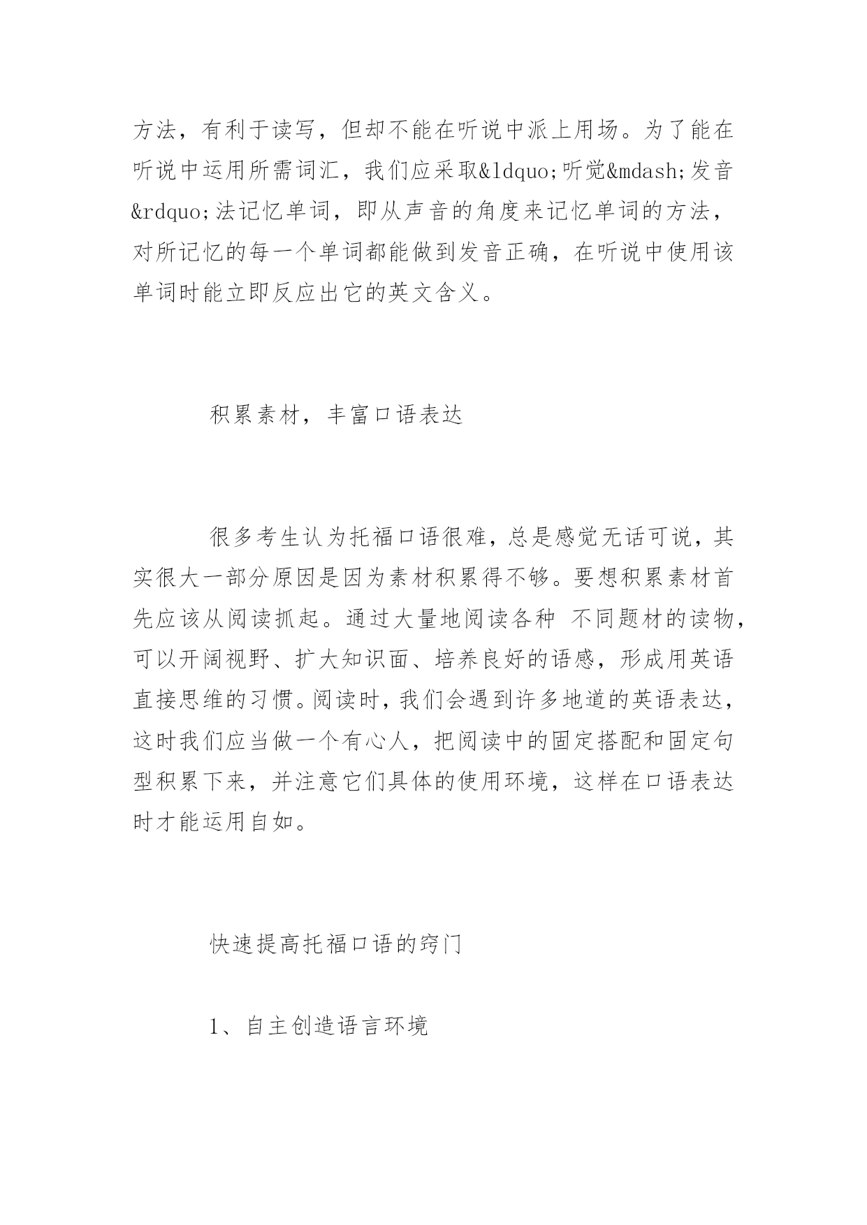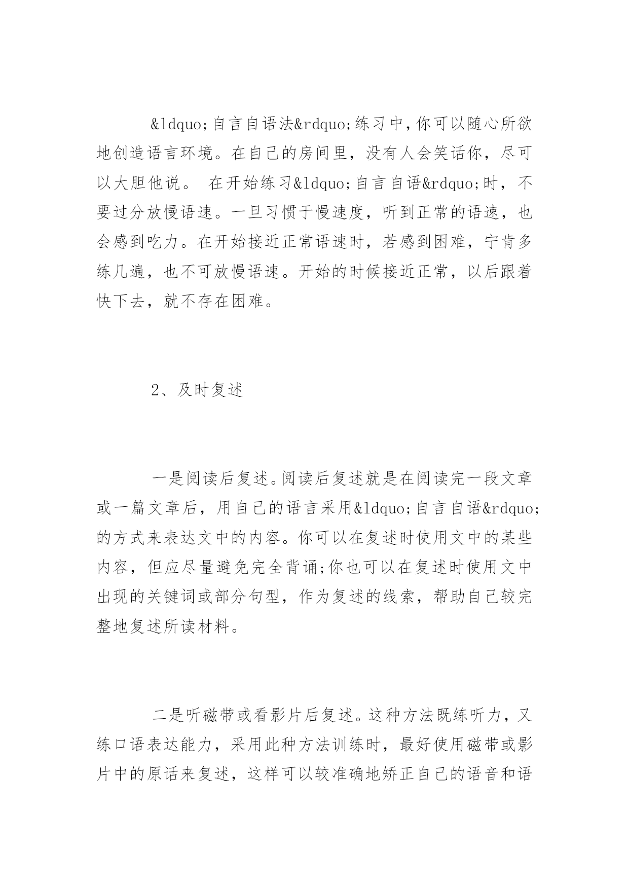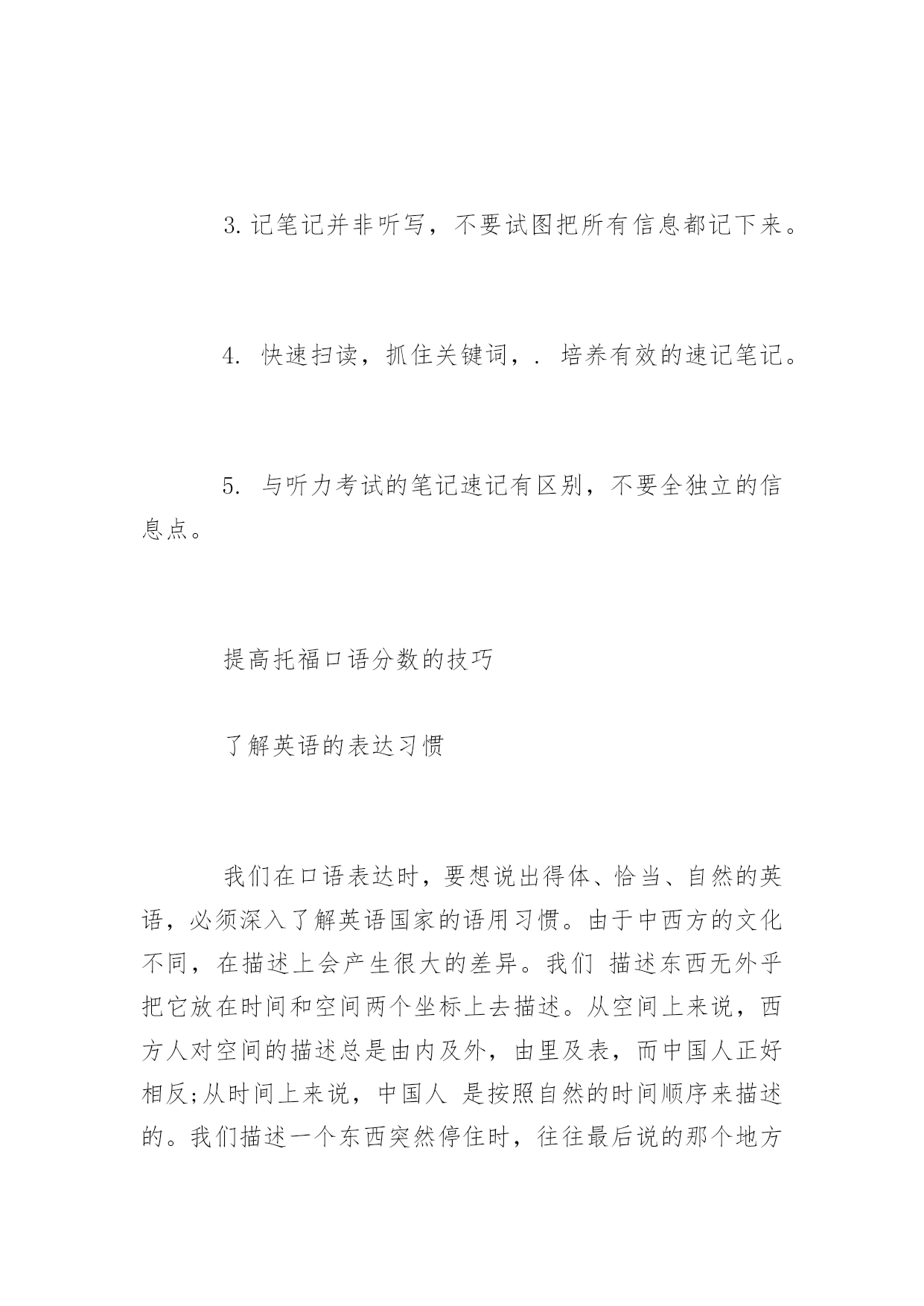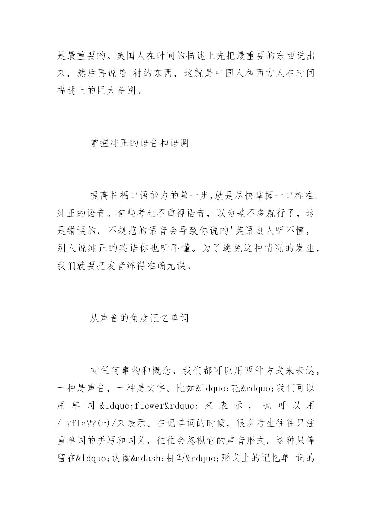 托福口语怎么做笔记有什么方法 托福口语怎么做笔记有什么方法 在托福口语的考试中,学会做笔记是一个很重要的点,希望大家在听托福口语的时候做好笔记。下面是百分网小编整理的托福口语做笔记的方法,希望对你有帮助。 托福口语做笔记的方法 1.笔记要适量,记得过少会没话可说,记得过多,容易念笔记,在实际考试中不现实,所以要精准,不应把所有细枝末节的东西都记录下来,只要记下每道题目的采分点,即关键词。 2以倾听、想象、理解为主、以记笔记为辅。例如:Task4的lecture,教授会讲1-2个例子进一步阐述名词短语,一般以叙述的形式呈现,所以要求学生具备空间的想象能力,要理解性的 3.记笔记并非听写,不要试图把所有信息都记下来。 4.快速扫读,抓住关键词,.培养有效的速记笔记。 5.与听力考试的笔记速记有区别,不要全独立的信息点。 提高托福口语分数的技巧 了解英语的表达习惯 我们在口语表达时,要想说出得体、恰当、自然的英语,必须深入了解英语国家的语用习惯。由于中西方的文化不同,在描述上会产生很大的差异。我们描述东西无外乎把它放在时间和空间两个坐标上去描述。从空间上来说,西方人对空间的描述总是由内及外,由里及表,而中国人正好相反;从时间上来说,中国人是按照自然的时间顺序来描述的。我们描述一个东西突然停住时,往往最后说的那个地方是最重要的。美国人在时间的描述上先把最重要的东西说出来,然后再说陪衬的东西,这就是中国人和西方人在时间描述上的巨大差别。 掌握纯正的语音和语调 提高托福口语能力的第一步,就是尽快掌握一口标准、纯正的语音。有些考生不重视语音,以为差不多就行了,这是错误的。不规范的语音会导致你说的'英语别人听不懂,别人说纯正的英语你也听不懂。为了避免这种情况的发生,我们就要把发音练得准确无误。 从声音的角度记忆单词 对任何事物和概念,我们都可以用两种方式来表达,一种是声音,一种是文字。比如“花”我们可以用单词“flower”来表示,也可以用/?fla??(r)/来表示。在记单词的时候,很多考生往往只注重单词的拼写和词义,往往会忽视它的声音形式。这种只停留在“认读—拼写”形式上的记忆单词的方法,有利于读写,但却不能在听说中派上用场。为了能在听说中运用所需词汇,我们应采取“听觉—发音”法记忆单词,即从声音的角度来记忆单词的方法,对所记忆的每一个单词都能做到发音正确,在听说中使用该单词时能立即反应出它的英文含义。 积累素材,丰富口语表达 很多考生认为托福口语很难,总是感觉无话可说,其实很大一部分原因是因为素材积累得不够。要想积累素材首先应该从阅读抓起。通过大量地阅读各种不同题材的读物,可以开阔视野、扩大知识面、培养良好的语感,形成用英语直接思维的习惯。阅读时,我们会遇到许多地道的英语表达,这时我们应当做一个有心人,把阅读中的固定搭配和固定句型积累下来,并注意它们具体的使用环境,这样在口语表达时才能运用自如。 快速提高托福口语的窍门 1、自主创造语言环境 “自言自语法”练习中,你可以随心所欲地创造语言环境。在自己的房间里,没有人会笑话你,尽可以大胆他说。在开始练习“自言自语”时,不要过分放慢语速。一旦习惯于慢速度,听到正常的语速,也会感到吃力。在开始接近正常语速时,若感到困难,宁肯多练几遍,也不可放慢语速。开始的时候接近正常,以后跟着快下去,就不存在困难。 2、及时复述 一是阅读后复述。阅读后复述就是在阅读完一段文章或一篇文章后,用自己的语言采用“自言自语”的方式来表达文中的内容。你可以在复述时使用文中的某些内容,但应尽量避免完全背诵;你也可以在复述时使用文中出现的关键词或部分句型,作为复述的线索,帮助自己较完整地复述所读材料。 二是听磁带或看影片后复述。这种方法既练听力,又练口语表达能力,采用此种方法训练时,最好使用磁带或影片中的原话来复述,这样可以较准确地矫正自己的语音和语调,体味地道的英语口语。 3、有目的地去选择说的材料 开始练习“自言自语法”时,笔者建议你认真选择所说材料。开始时,你可以练习复述小故事,语言应尽量生动、的简练,有明确的情节,这样可以帮助你更好地把握语言的连贯性。 4、狠抓句型训练 句子是说话的应用单位,所以培养口语能力就要狠抓句型操练。采用“自言自语”法训练英语口语亦要求如此。你可以使用自己在课堂上所学的句型练习“自言自语”,这样可以加深对所学知识的理解和运用,达到学用结合。