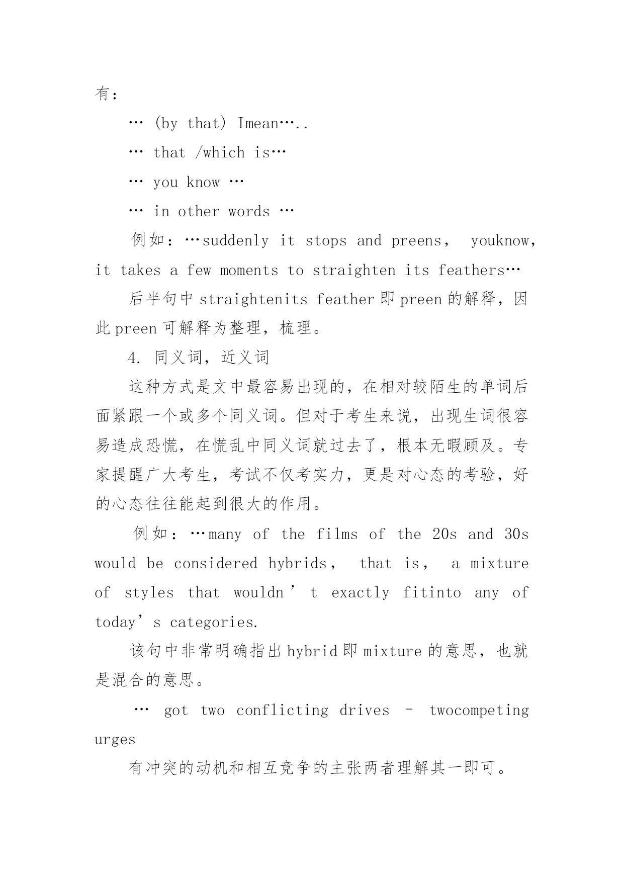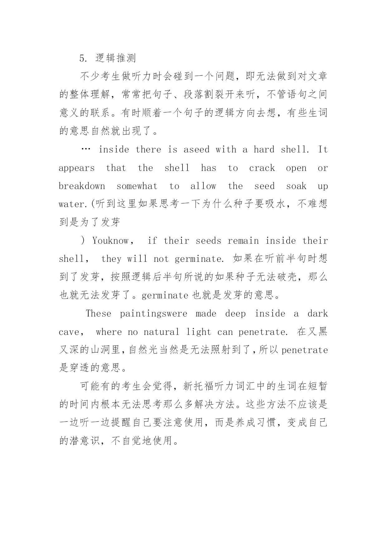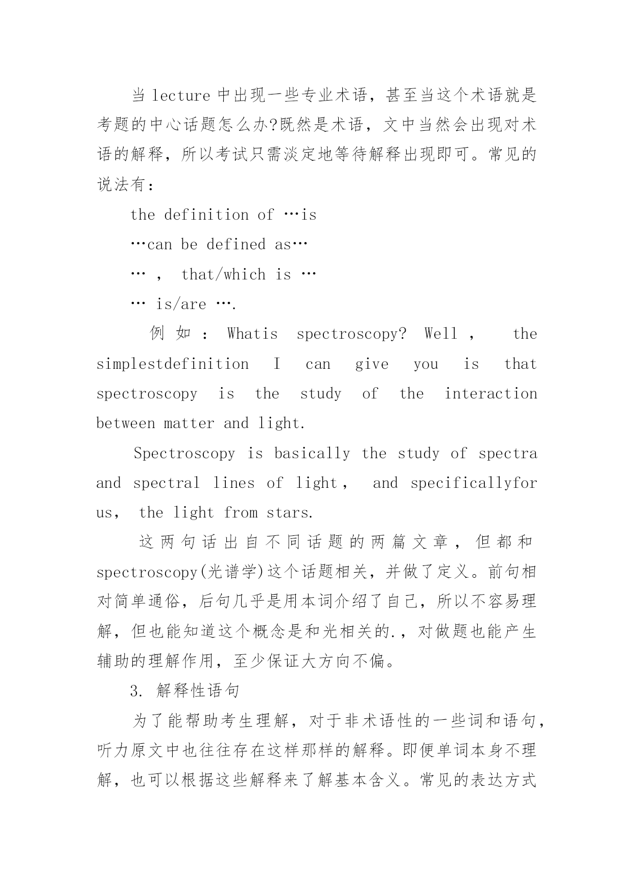 托福听力中的重要词汇解决方法 托福听力中的重要词汇解决方法词汇是托福考试各个部分的基础,如果解决不了词汇问题,那么在备考托福的道路上你就会步履维艰,以下是小编为大家搜索整理的托福听力中的重要词汇,希望对大家有所帮助!首先考生对自己的新托福听力词汇量应该有个基本的了解。考生可以翻看一下TPO练习的问题部分,如果连审题都有困难,那么建议先别急着考试,好好从最基础的词汇开始背诵。如果问题理解都非常顺利,那么可以做几道题目感受一下听的部分。在新托福听力词汇中,生词的出现主要有这么几种解决方法:1.专有名词在文中出现的人名、地名等专有名词通常对考试没有多大影响。只要考生能够意识到在说的是某个人或者某个地点就行,笔记中的体现可以以大写首字母代替。甚至有的词在考试界面上会出现,考生只需混个眼熟,之后在做题时能认出来就行。2.话题类单词,术语托福英语听力的lecture话题非常广泛,虽然官方指南给出了艺术、生命科学、自然科学和社会科学四大类话题,但事实上这四个话题已经能囊括任何专业知识点了,知识面再广的学生也不可能面面俱到。当lecture中出现一些专业术语,甚至当这个术语就是考题的中心话题怎么办?既然是术语,文中当然会出现对术语的解释,所以考试只需淡定地等待解释出现即可。常见的说法有:thedefinitionof…is…canbedefinedas……,that/whichis……is/are….例如:Whatisspectroscopy?Well,thesimplestdefinitionIcangiveyouisthatspectroscopyisthestudyoftheinteractionbetweenmatterandlight.Spectroscopyisbasicallythestudyofspectraandspectrallinesoflight,andspecificallyforus,thelightfromstars.这两句话出自不同话题的两篇文章,但都和spectroscopy(光谱学)这个话题相关,并做了定义。前句相对简单通俗,后句几乎是用本词介绍了自己,所以不容易理解,但也能知道这个概念是和光相关的.,对做题也能产生辅助的理解作用,至少保证大方向不偏。3.解释性语句为了能帮助考生理解,对于非术语性的一些词和语句,听力原文中也往往存在这样那样的解释。即便单词本身不理解,也可以根据这些解释来了解基本含义。常见的表达方式有:…(bythat)Imean…..…that/whichis……youknow……inotherwords…例如:…suddenlyitstopsandpreens,youknow,ittakesafewmomentstostraightenitsfeathers…后半句中straightenitsfeather即preen的解释,因此preen可解释为整理,梳理。4.同义词,近义词这种方式是文中最容易出现的,在相对较陌生的单词后面紧跟一个或多个同义词。但对于考生来说,出现生词很容易造成恐慌,在慌乱中同义词就过去了,根本无暇顾及。专家提醒广大考生,考试不仅考实力,更是对心态的考验,好的心态往往能起到很大的作用。例如:…manyofthefilmsofthe20sand30swouldbeconsideredhybrids,thatis,amixtureofstylesthatwouldn’texactlyfitintoanyoftoday’scategories.该句中非常明确指出hybrid即mixture的意思,也就是混合的意思。…gottwoconflictingdrives–twocompetingurges有冲突的动机和相互竞争的主张两者理解其一即可。5.逻辑推测不少考生做听力时会碰到一个问题,即无法做到对文章的整体理解,常常把句子、段落割裂开来听,不管语句之间意义的联系。有时顺着一个句子的逻辑方向去想,有些生词的意思自然就出现了。…insidethereisaseedwithahardshell.Itappearsthattheshellhastocrackopenorbreakdownsomewhattoallowtheseedsoakupwater.(听到这里如果思考一下为什么种子要吸水,不难想到是为了发芽)Youknow,iftheirseedsremaininsidetheirshell,theywillnotgerminate.如果在听前半句时想到了发芽,按照逻辑后半句所说的如果种子无法破壳,那么也就无法发芽了。germinate也就是发芽的意思。Thesepaintingsweremadedeepinsideadarkcave,wherenonaturallightc