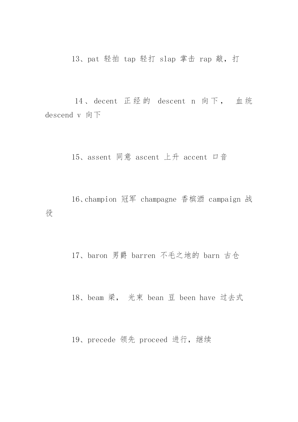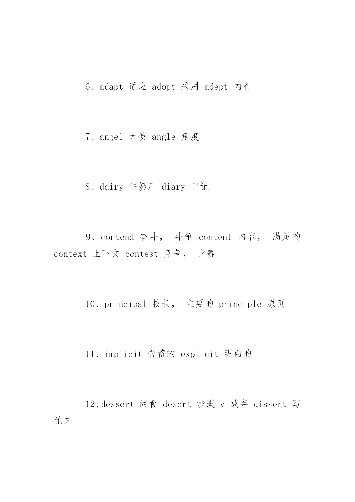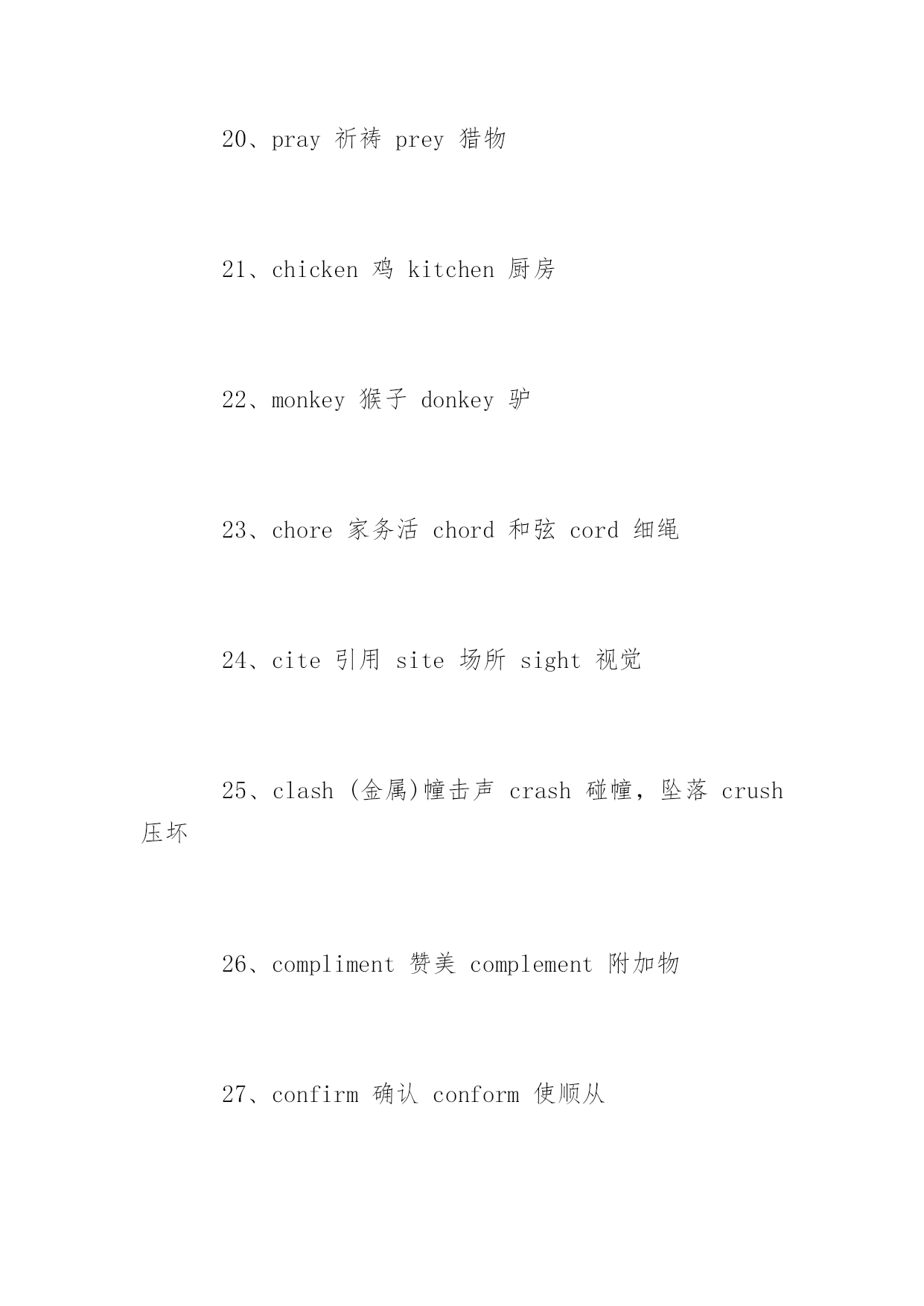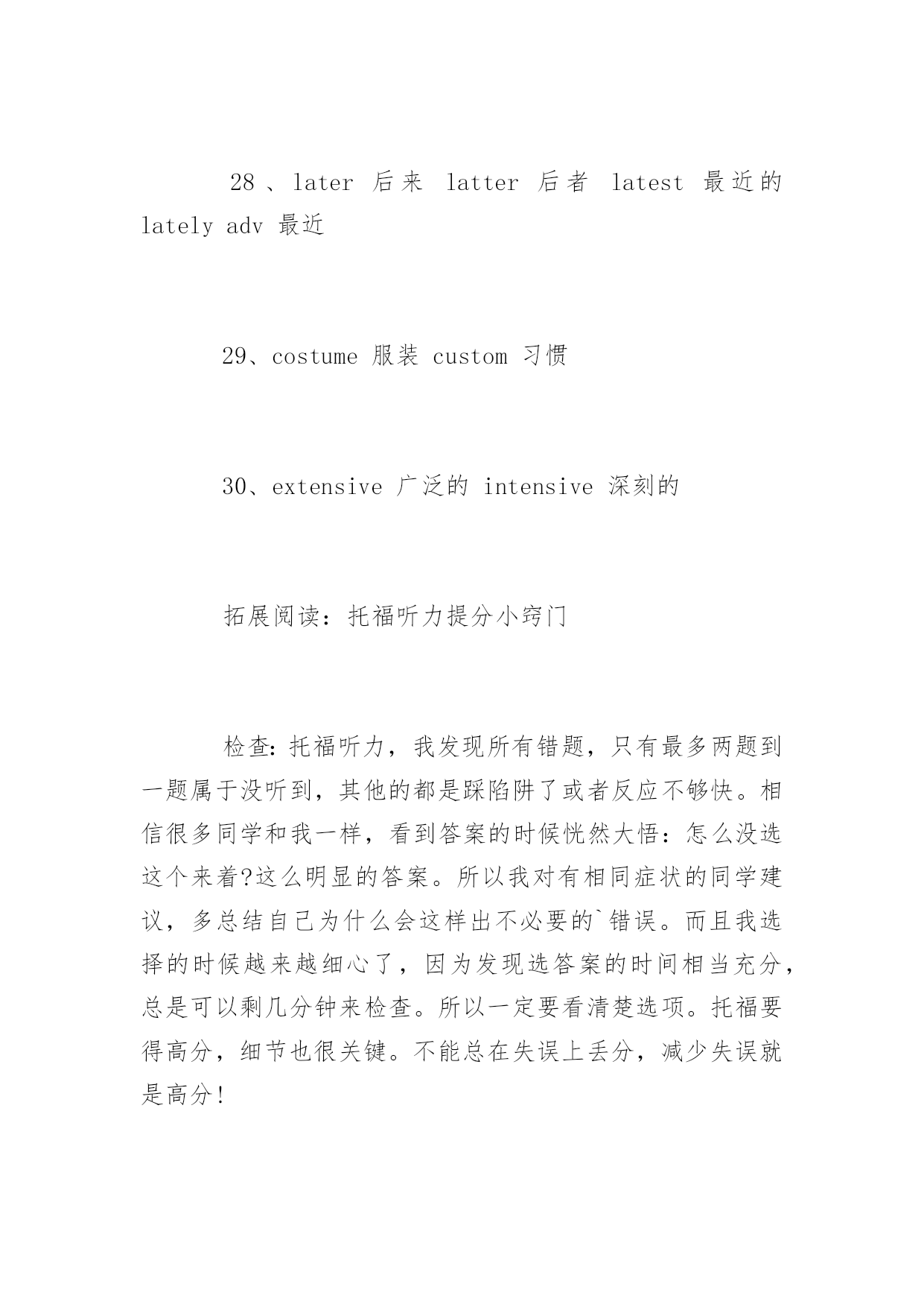 托福听力常见词汇素材 2016托福听力常见词汇素材 词汇的积累是托福考试中最基础也是最重要的一部分,为了帮助考生们更加有效的备考托福,下面是yjbys网小编提供给大家关于托福听力常见词汇素材,希望对大家的备考有所帮助。 1、crow乌鸦crown王冠clown小丑cow牛 2、dose一剂药doze打盹 3、drawndraw过去分词drown溺水 4、quite相当quiet安静地 5、affectv影响,假装effectn结果,影响 6、adapt适应adopt采用adept内行 7、angel天使angle角度 8、dairy牛奶厂diary日记 9、contend奋斗,斗争content内容,满足的context上下文contest竞争,比赛 10、principal校长,主要的principle原则 11、implicit含蓄的explicit明白的 12、dessert甜食desert沙漠v放弃dissert写论文 13、pat轻拍tap轻打slap掌击rap敲,打 14、decent正经的descentn向下,血统descendv向下 15、assent同意ascent上升accent口音 16、champion冠军champagne香槟酒campaign战役 17、baron男爵barren不毛之地的barn古仓 18、beam梁,光束bean豆beenhave过去式 19、precede领先proceed进行,继续 20、pray祈祷prey猎物 21、chicken鸡kitchen厨房 22、monkey猴子donkey驴 23、chore家务活chord和弦cord细绳 24、cite引用site场所sight视觉 25、clash(金属)幢击声crash碰幢,坠落crush压坏 26、compliment赞美complement附加物 27、confirm确认conform使顺从 28、later后来latter后者latest最近的latelyadv最近 29、costume服装custom习惯 30、extensive广泛的intensive深刻的 拓展阅读:托福听力提分小窍门 检查:托福听力,我发现所有错题,只有最多两题到一题属于没听到,其他的都是踩陷阱了或者反应不够快。相信很多同学和我一样,看到答案的时候恍然大悟:怎么没选这个来着?这么明显的答案。所以我对有相同症状的同学建议,多总结自己为什么会这样出不必要的`错误。而且我选择的时候越来越细心了,因为发现选答案的时间相当充分,总是可以剩几分钟来检查。所以一定要看清楚选项。托福要得高分,细节也很关键。不能总在失误上丢分,减少失误就是高分! 看美剧:托福听力不一定一上来就开始做题。刚开始应该着重于提高整体听力水平,等到听力水平到一定程度之后,再开始加大听力做题量,事半功倍。首先当然也是要总体提高听力水平,我比较推荐看经典的、较为简单美剧或者电影,寓教于乐。对于美剧来说,《Friends》是不二之选。当听力水整体平提高之后,就可以开始着手对付托福听力。其实我认为托福听力最难的一点就是内容单调乏味,尤其是lecture,很容易引起走神。对于这一点,我建议在做听力时,不要把自己想成是在做题目,而是把自己想成是lecture中的一个学生,也就是说要参与到听力材料当中,这对集中注意力有很大帮助。